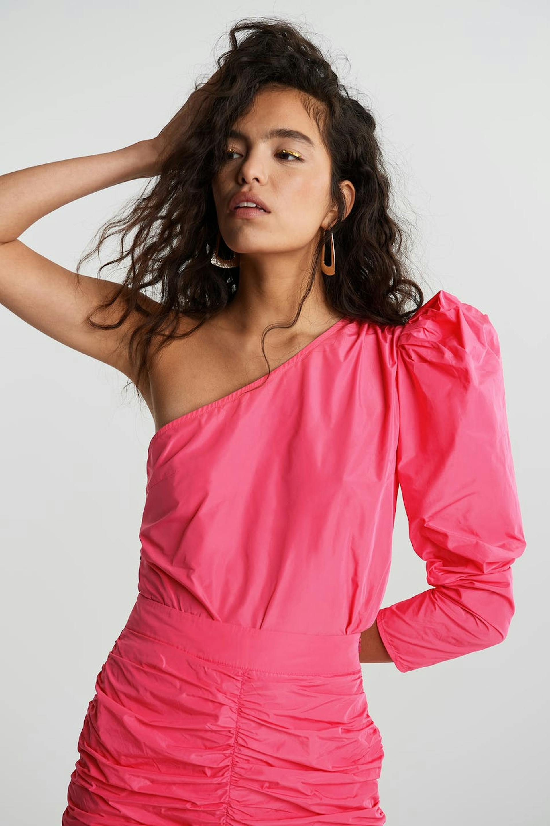 One shoulder top with a long puff sleeve. The top is perfect for the party and pink and has ruching on one shoulder.