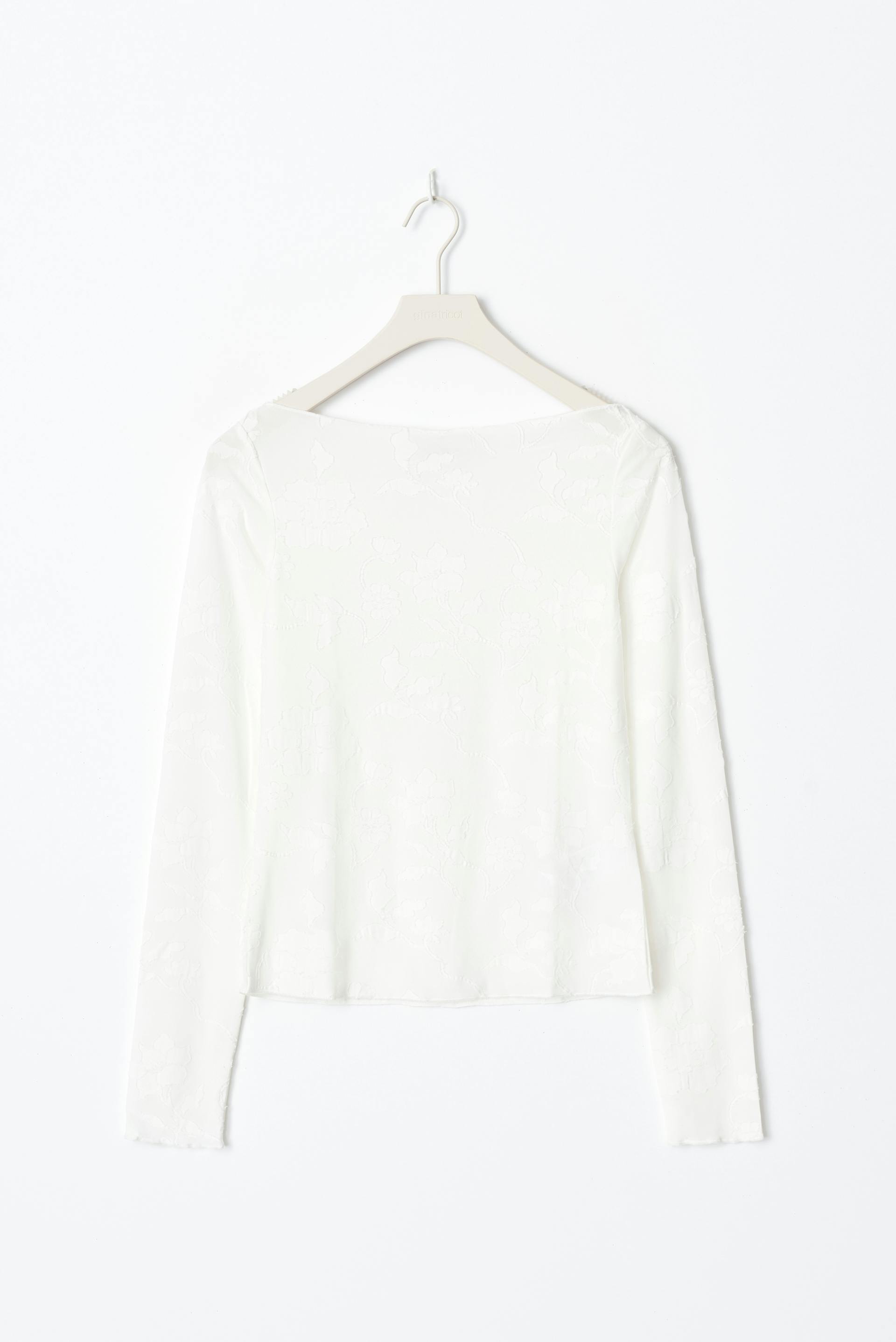 Long-sleeved top with floral pattern. The top is white and has regular fit. It has boat neckline and regular length.