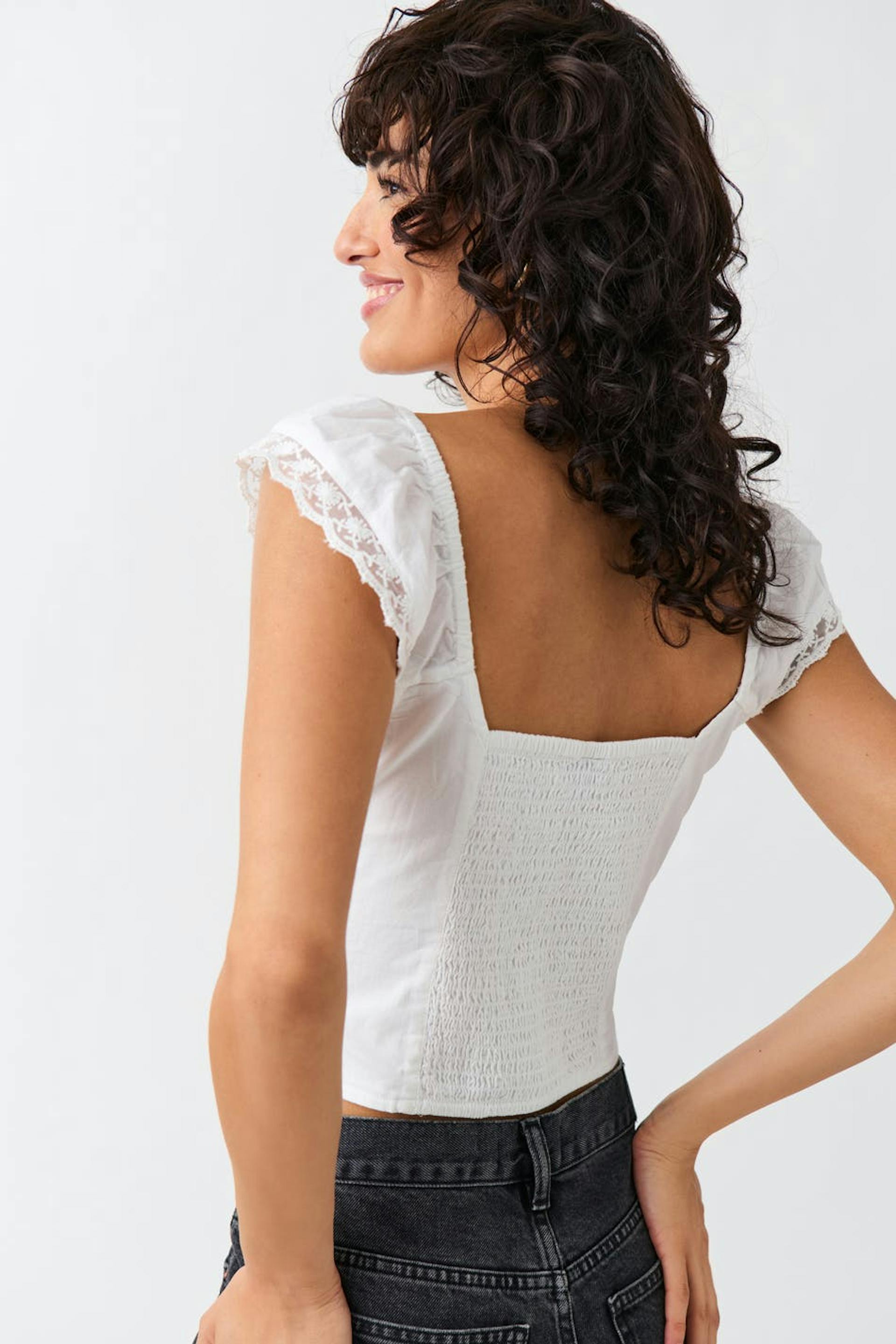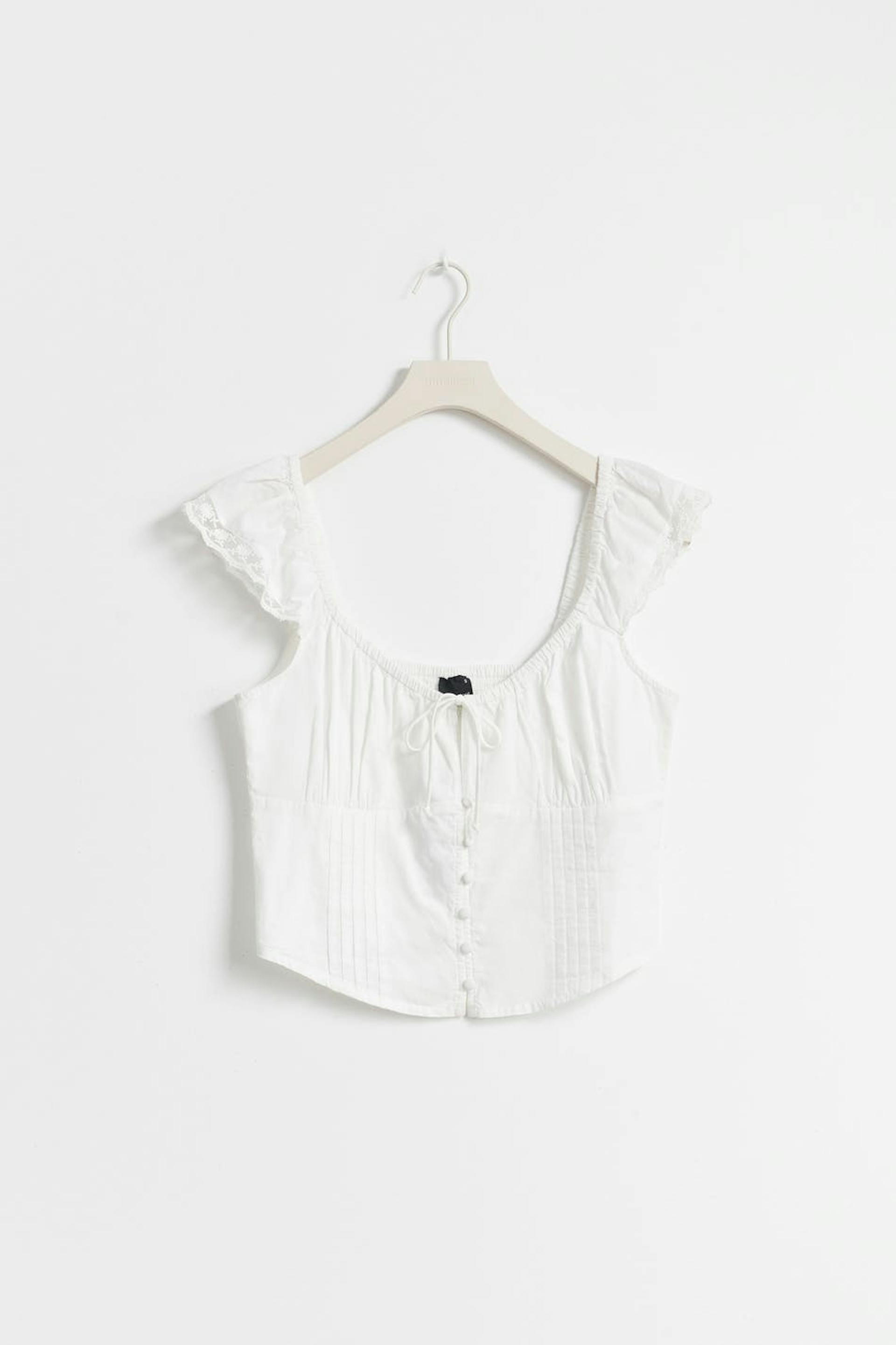Top with buttons at the front. The top is white and has short flounce sleeves with lace. It has slim fit, smocking in the back, ruched bust, elastic around the shoulders and tie detail at the front.