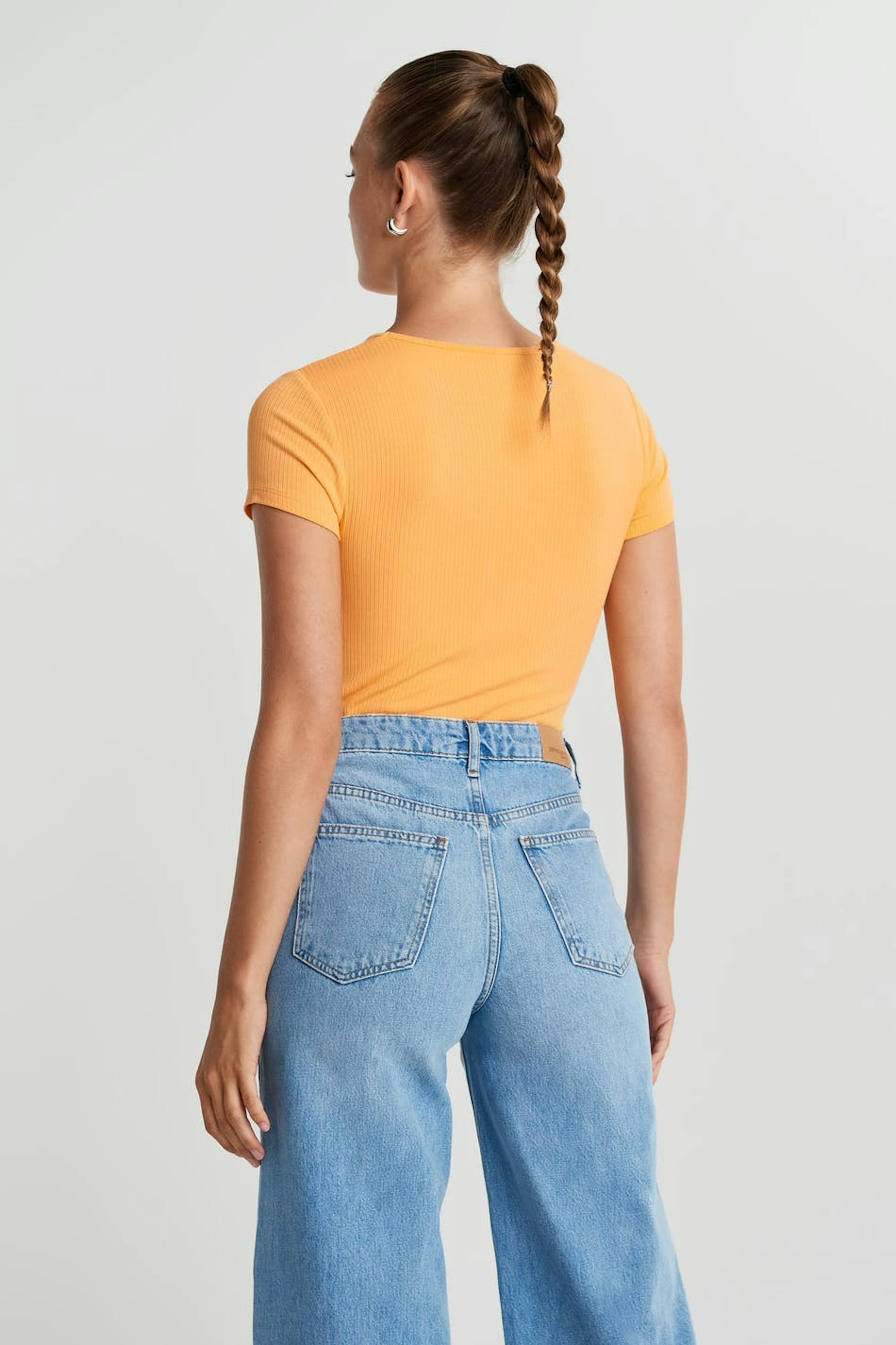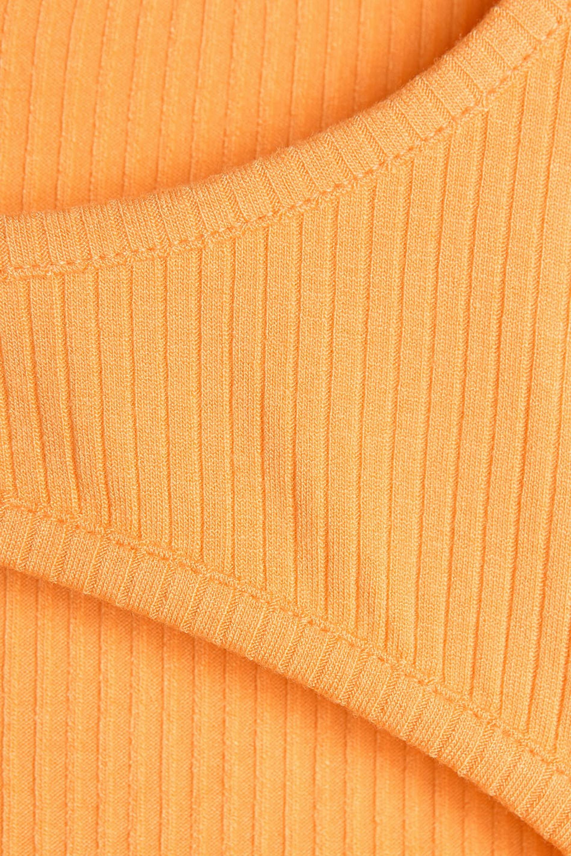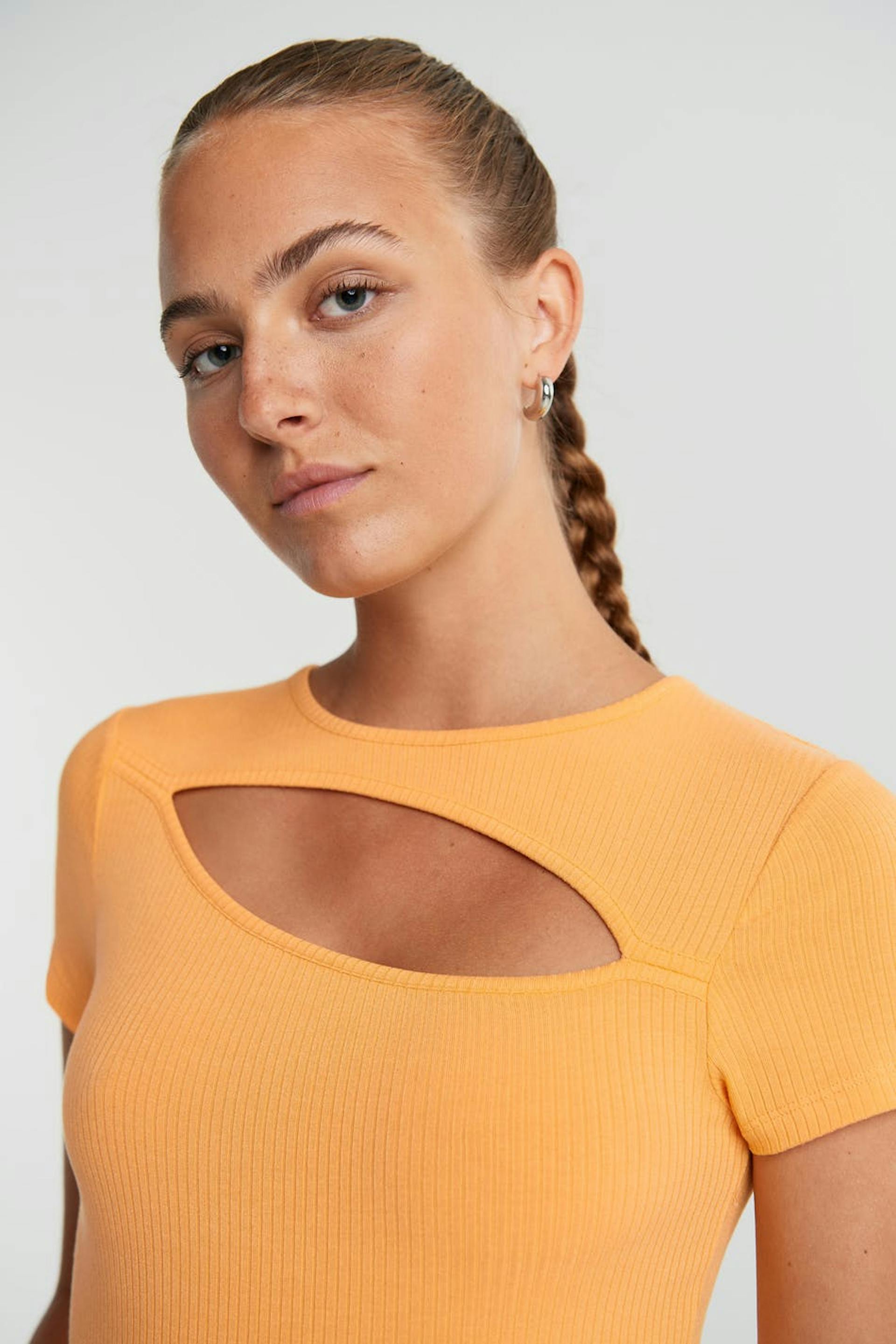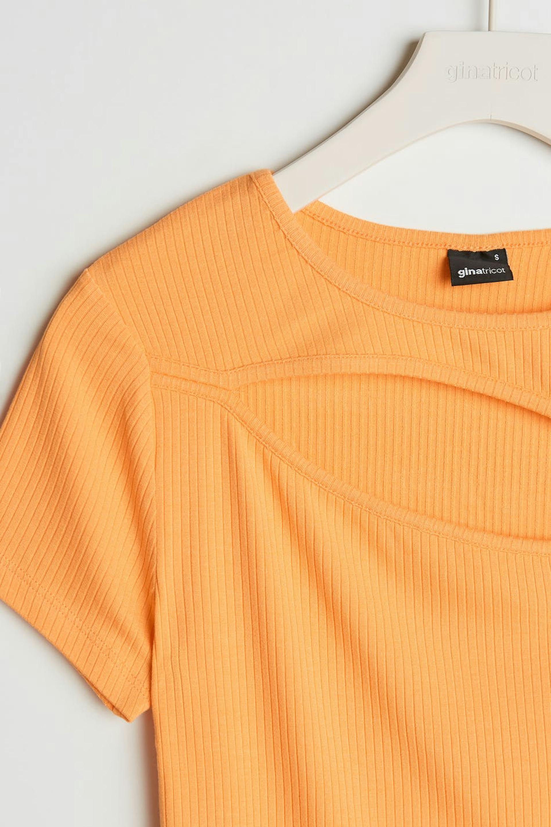 Short top with a fitted fit. The top is orange, short-sleeved and ribbed. It has a cutout detail above the bust.
