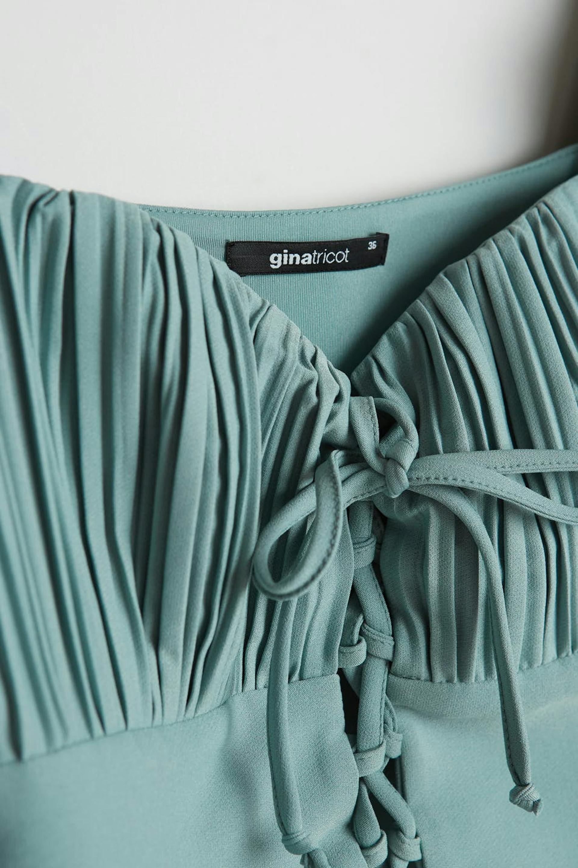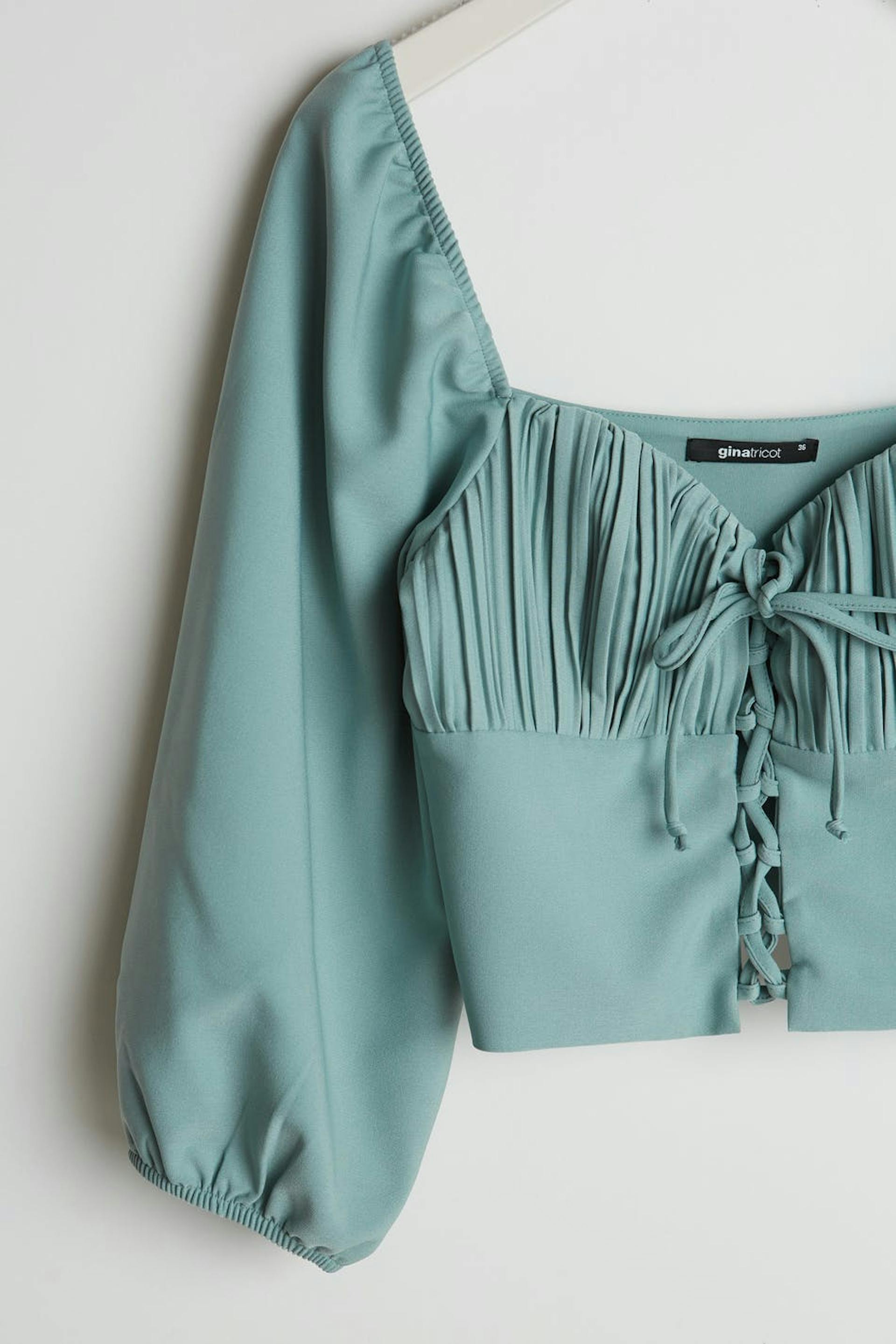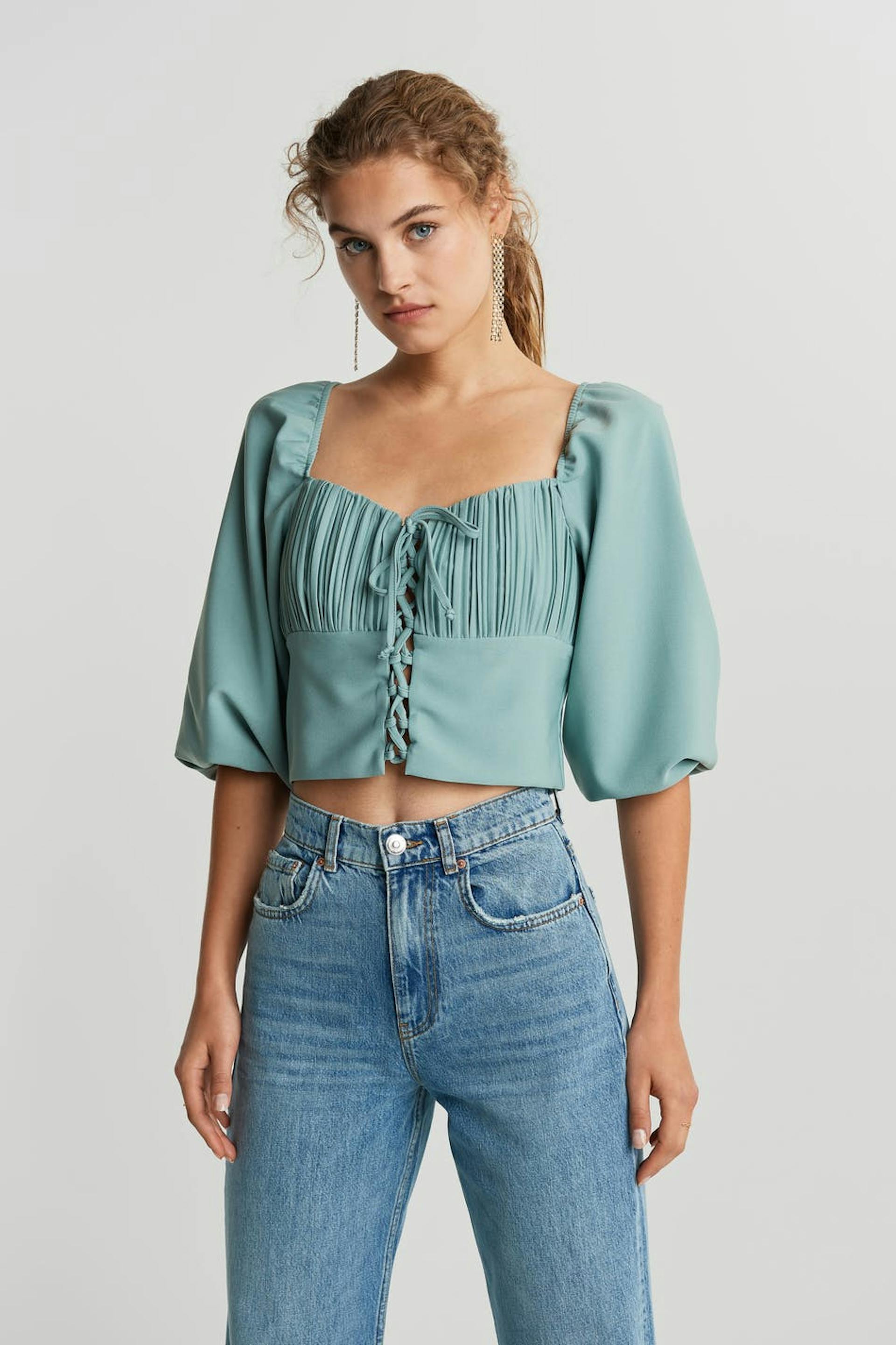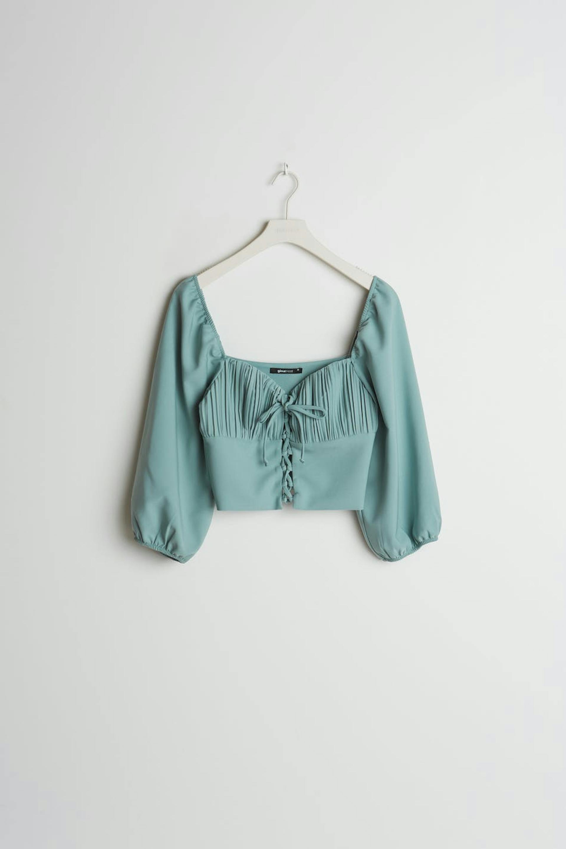 Short crop top with a fitted fit. The top is perfect for the party and blue and has ruching over the bust. It has a knot detail in the middle and half sleeves.