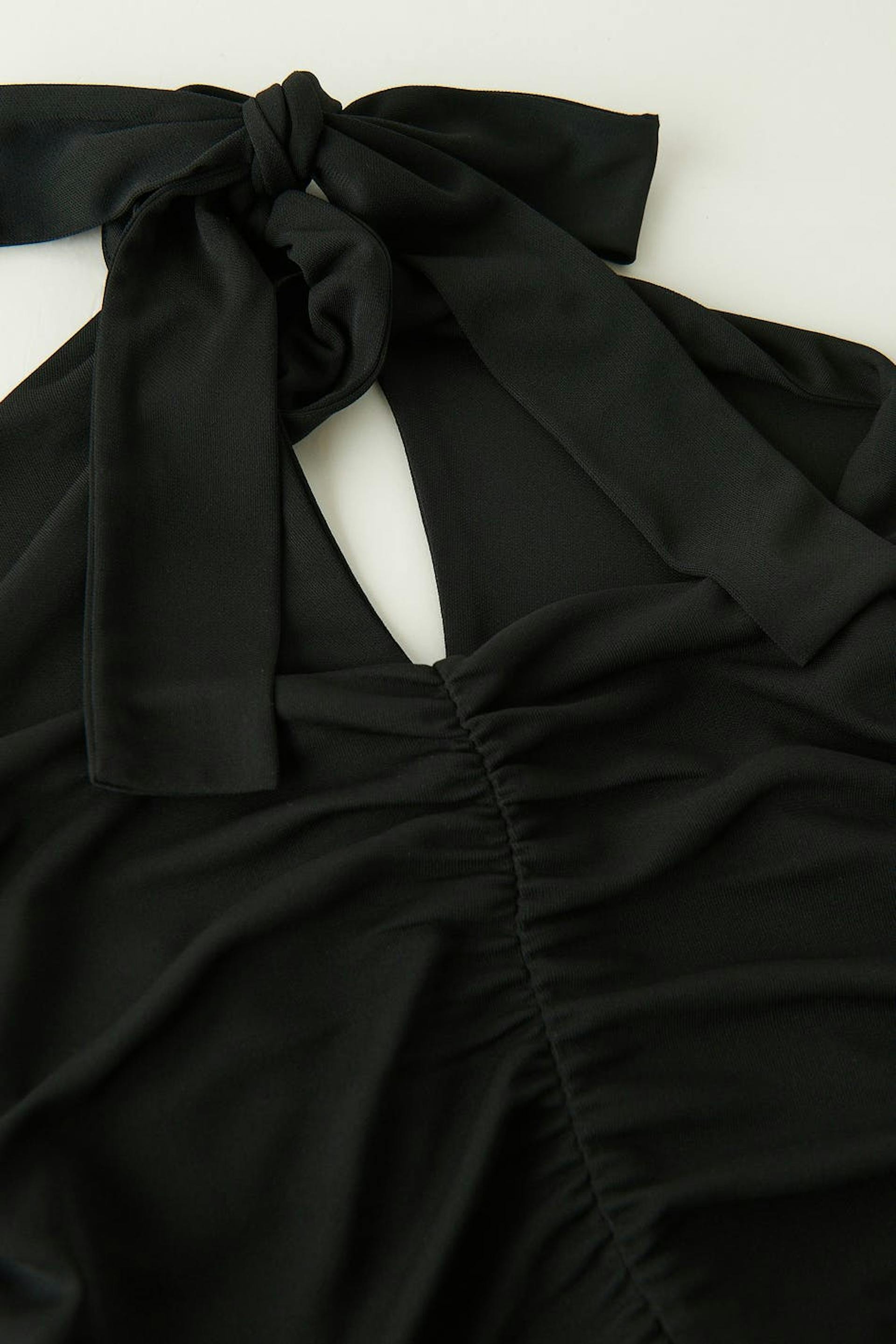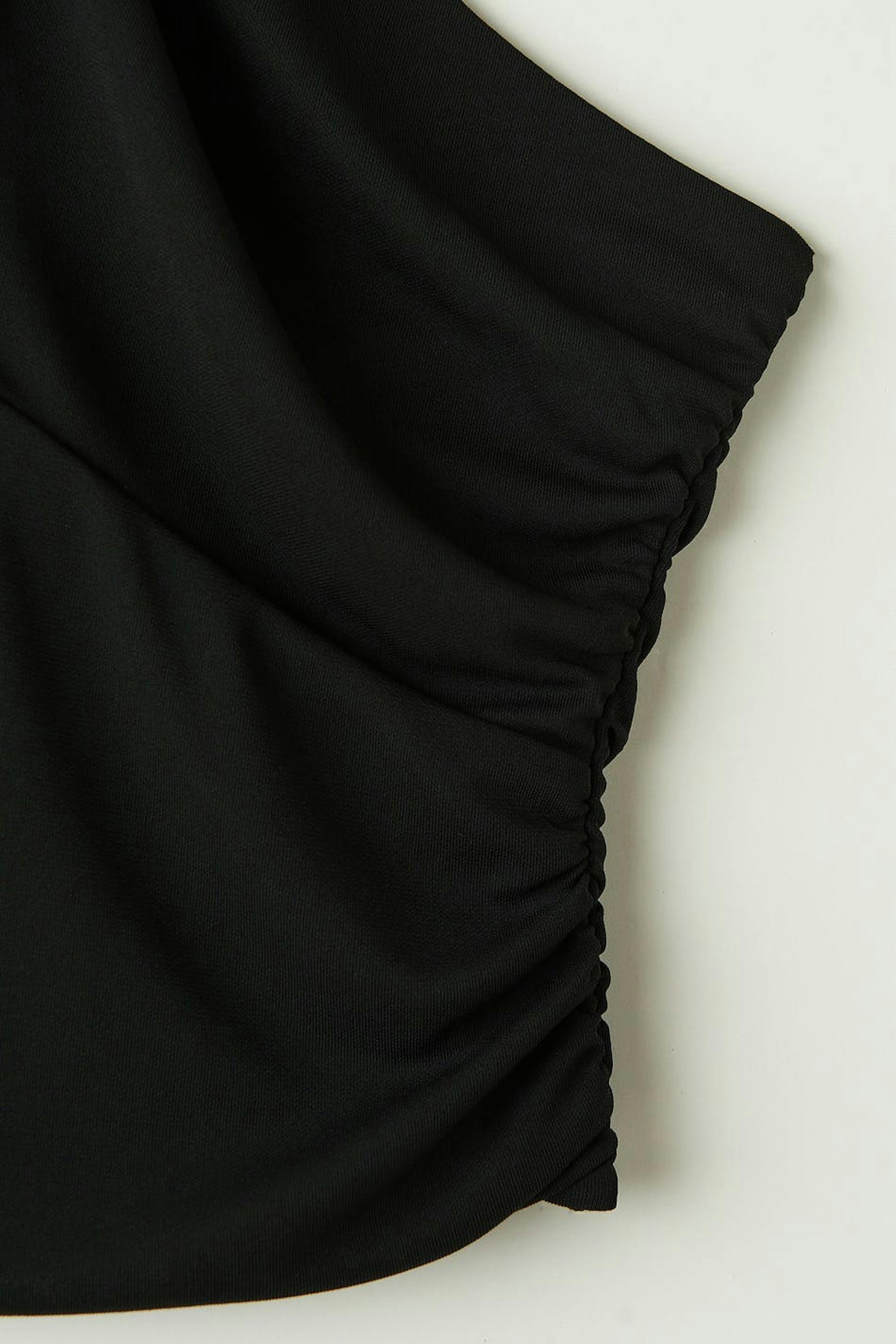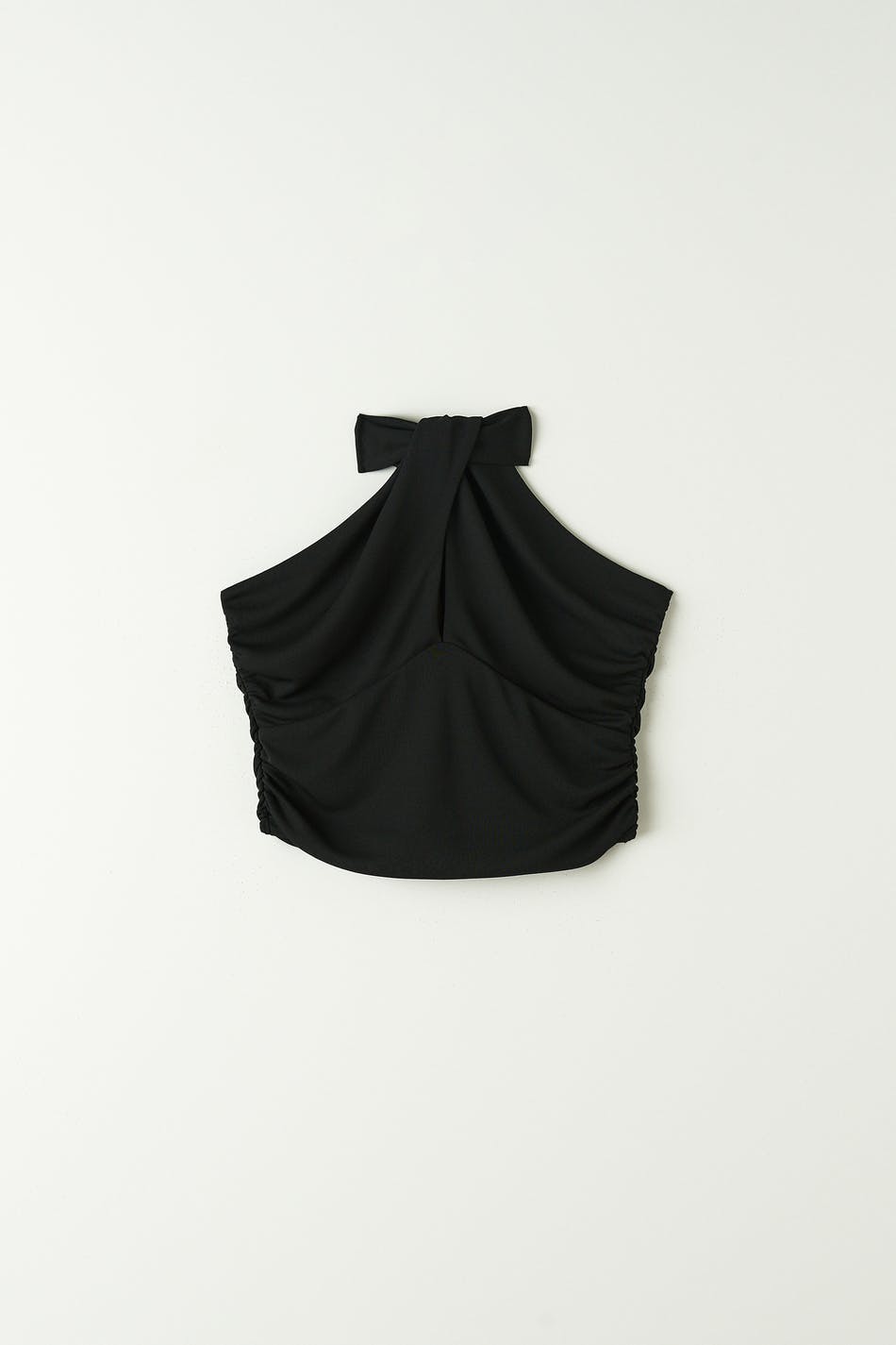 Cropped party top with halterneck design. The top is black and has a gathered effect in the sides. It has keyhole opening at the front and open back.