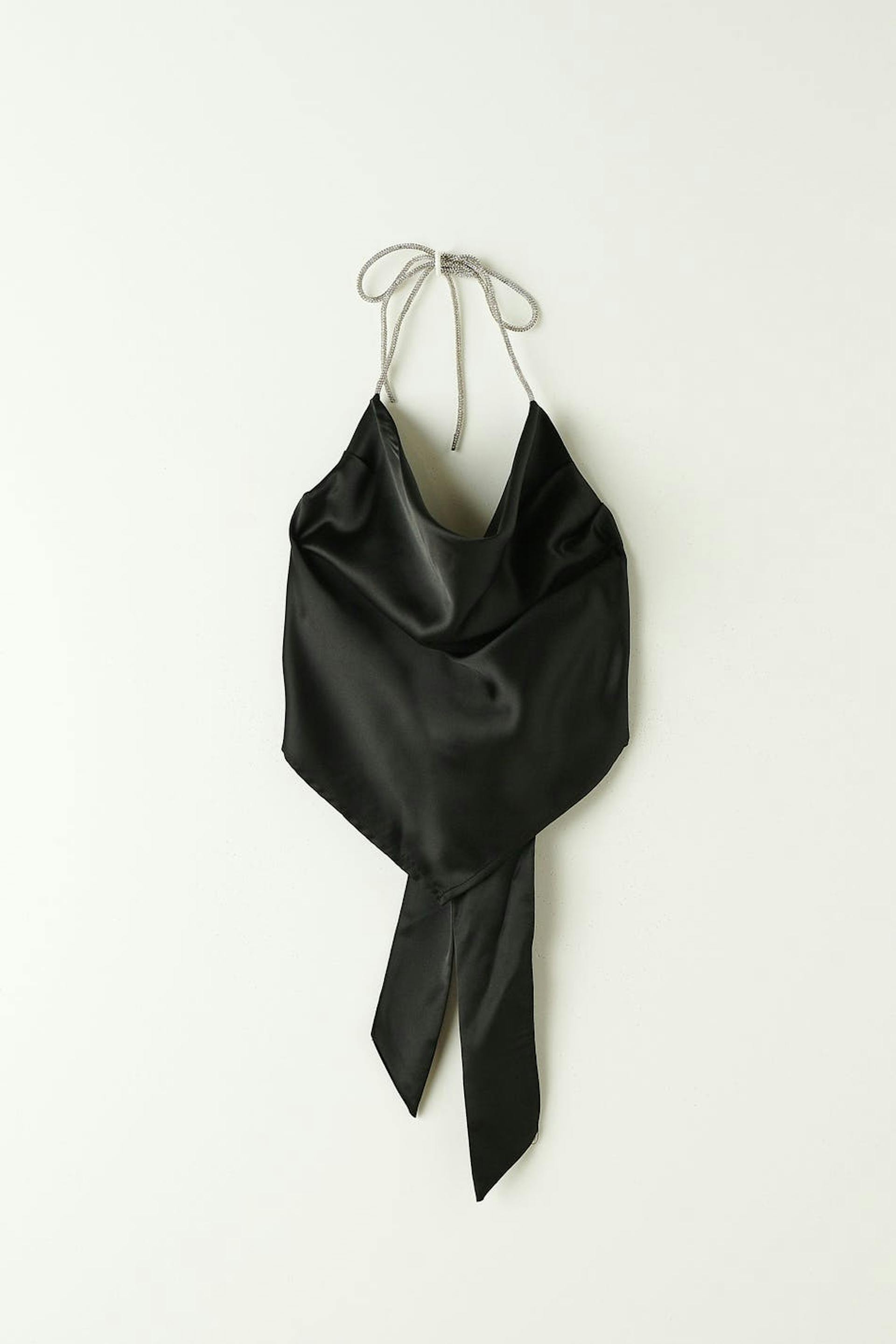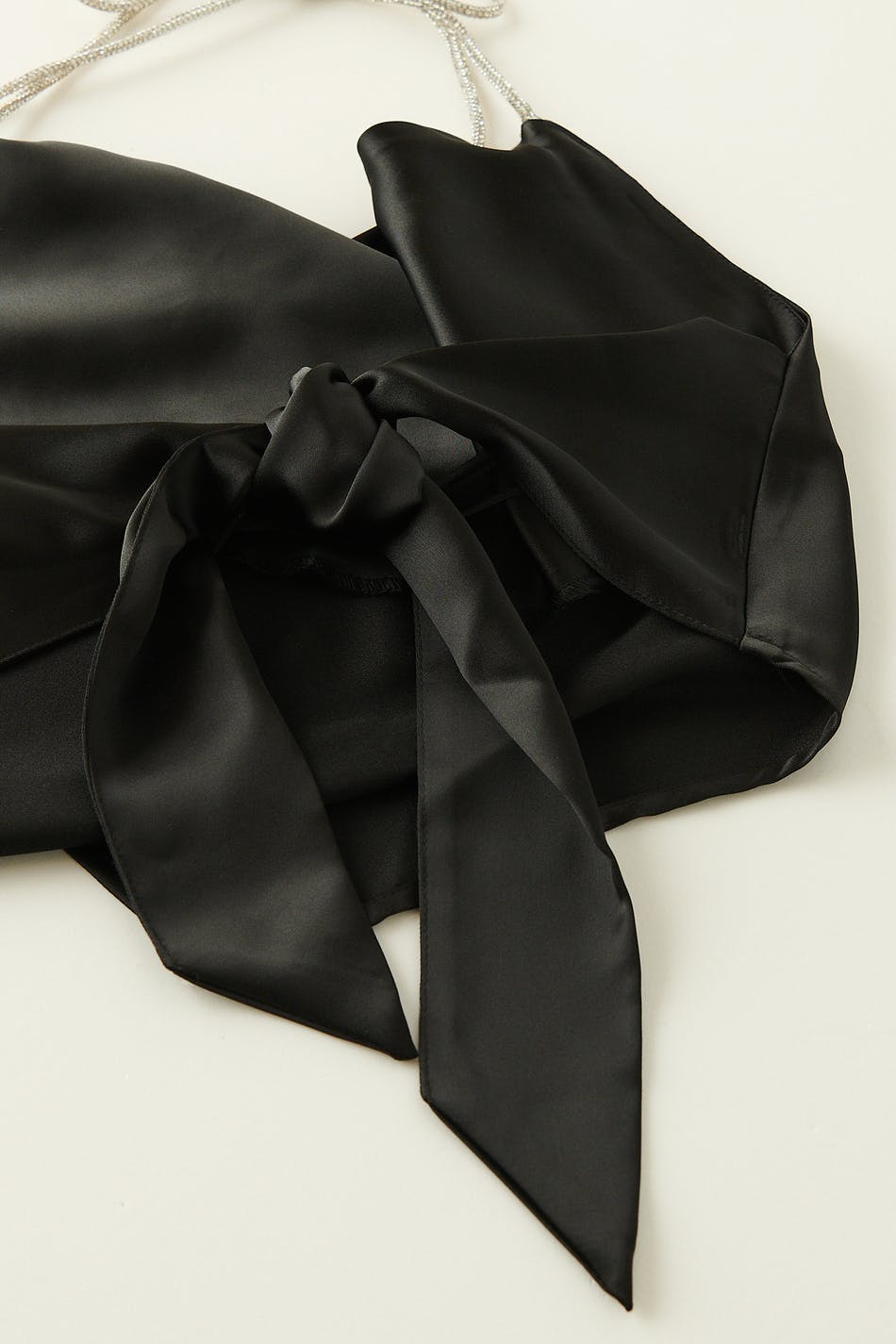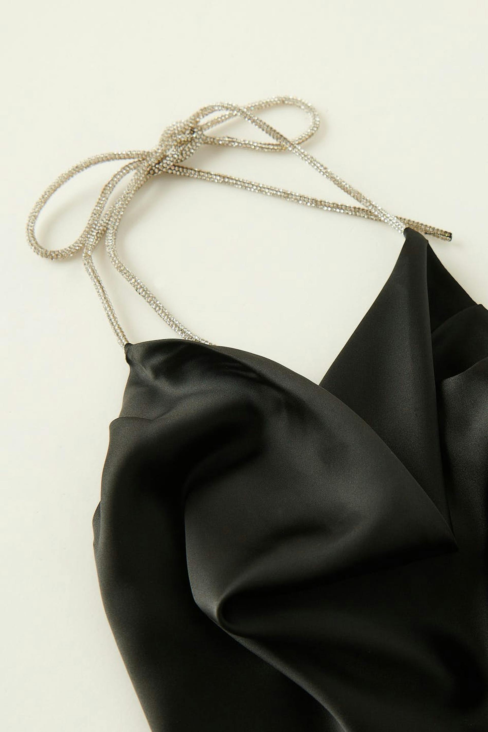 Cropped tank in satin with open back. The tank is black and has thin, narrow shoulder straps with rhinestone. It has self-tie in the back and cowl neck.