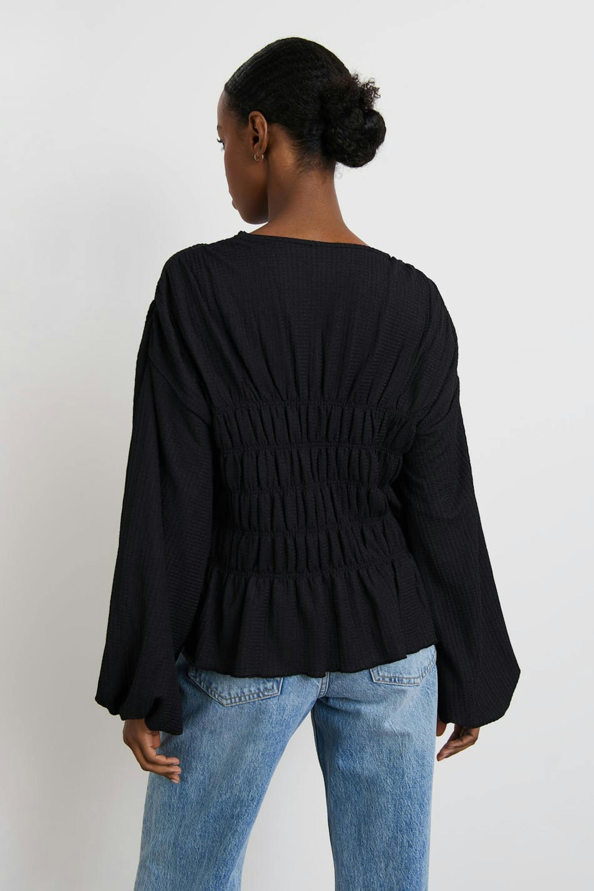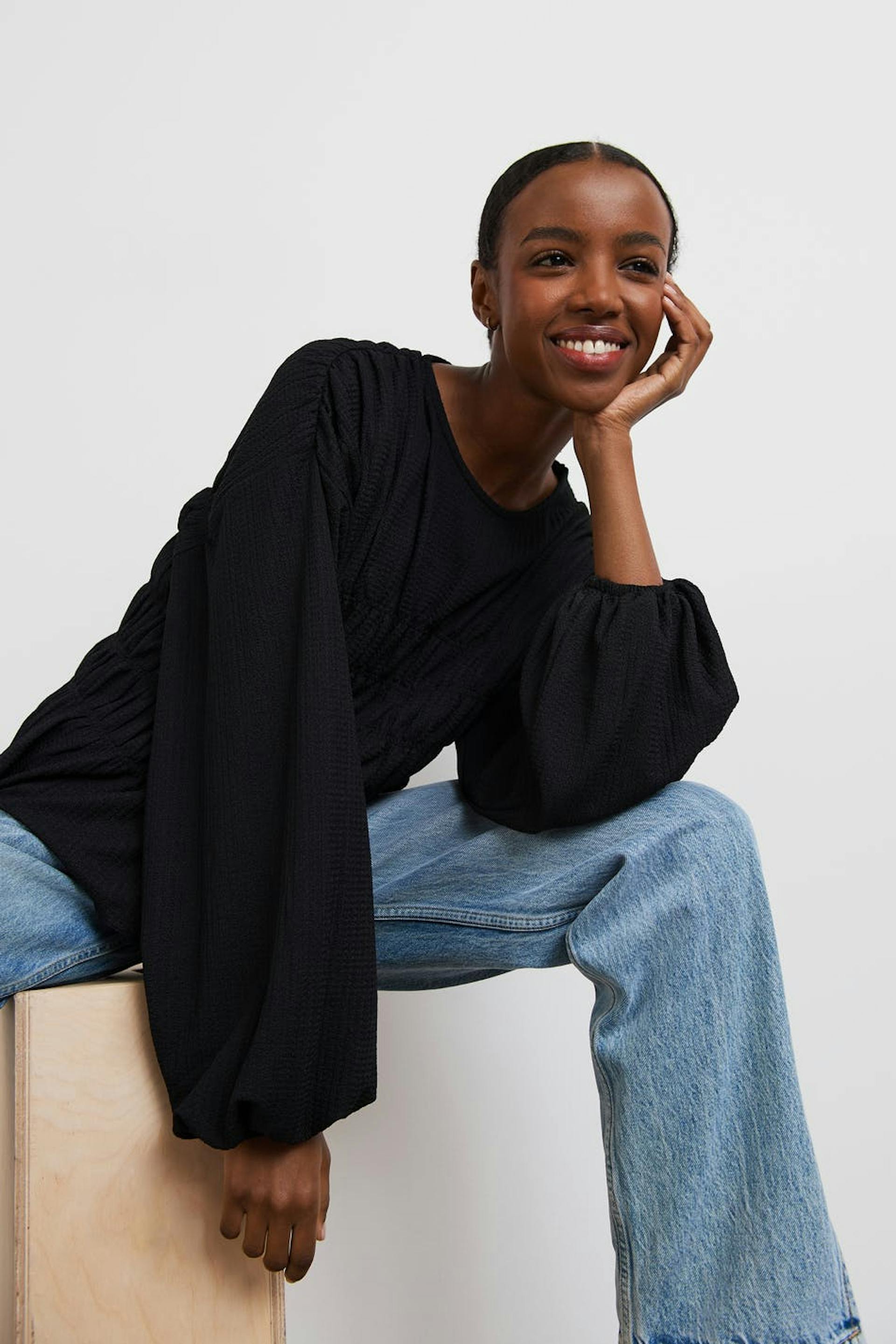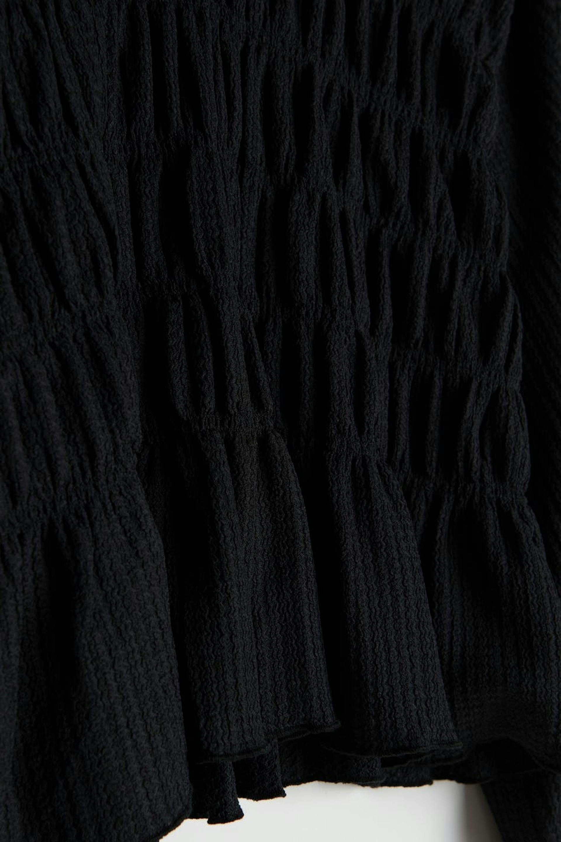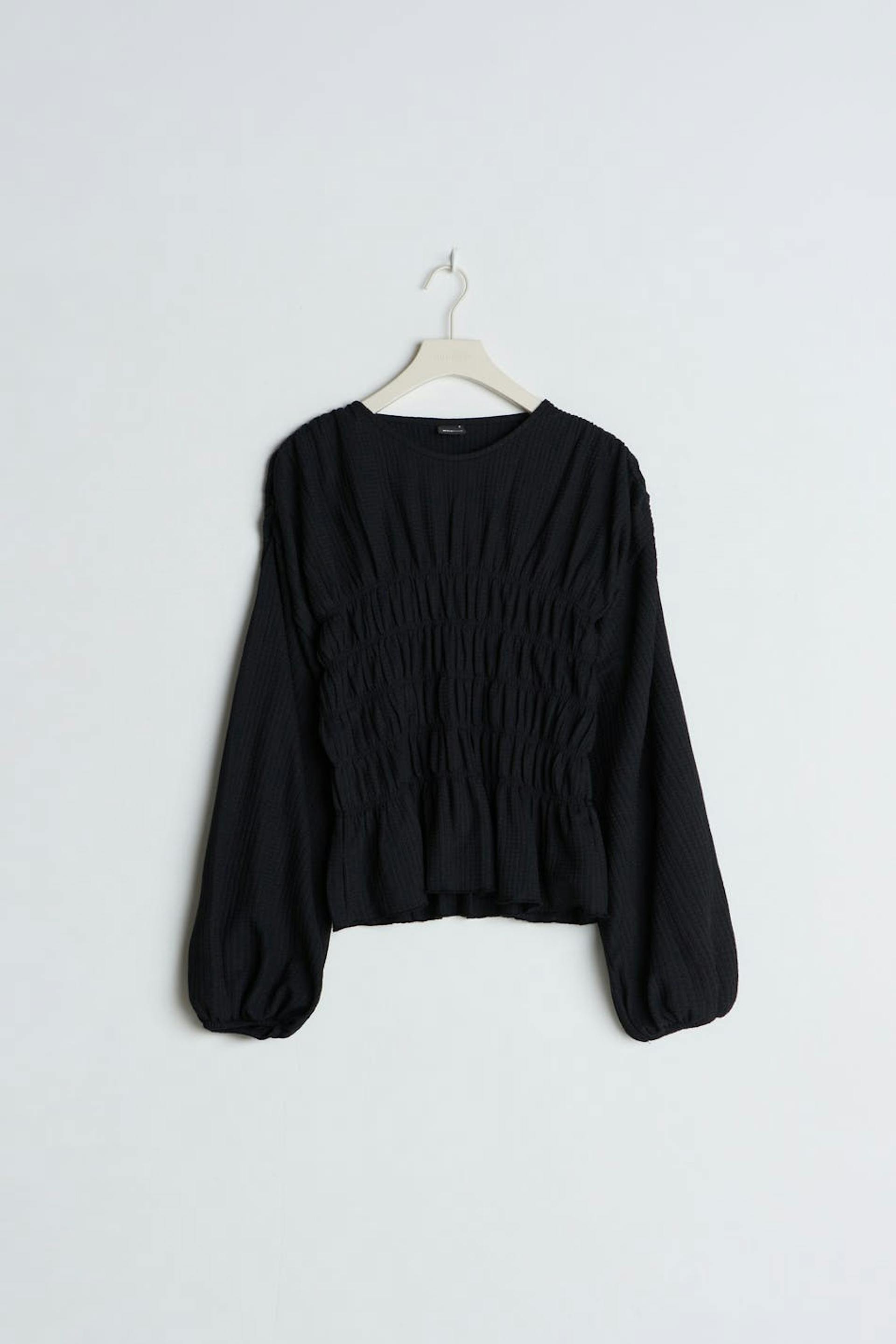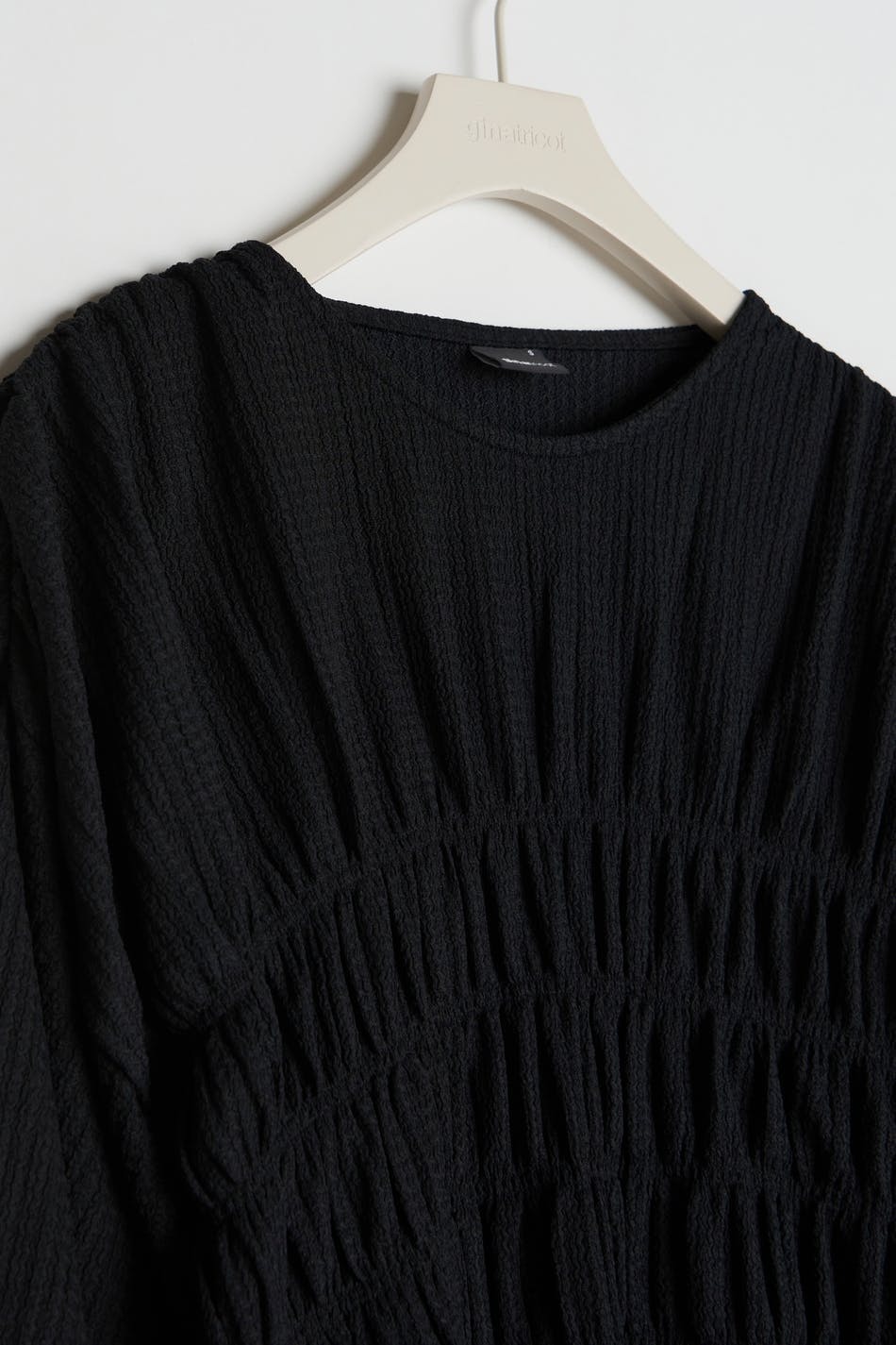 Pleated top with a regular fit. The top is black and has kimono style sleeves. It has decorative ruching and a rounded neckline.