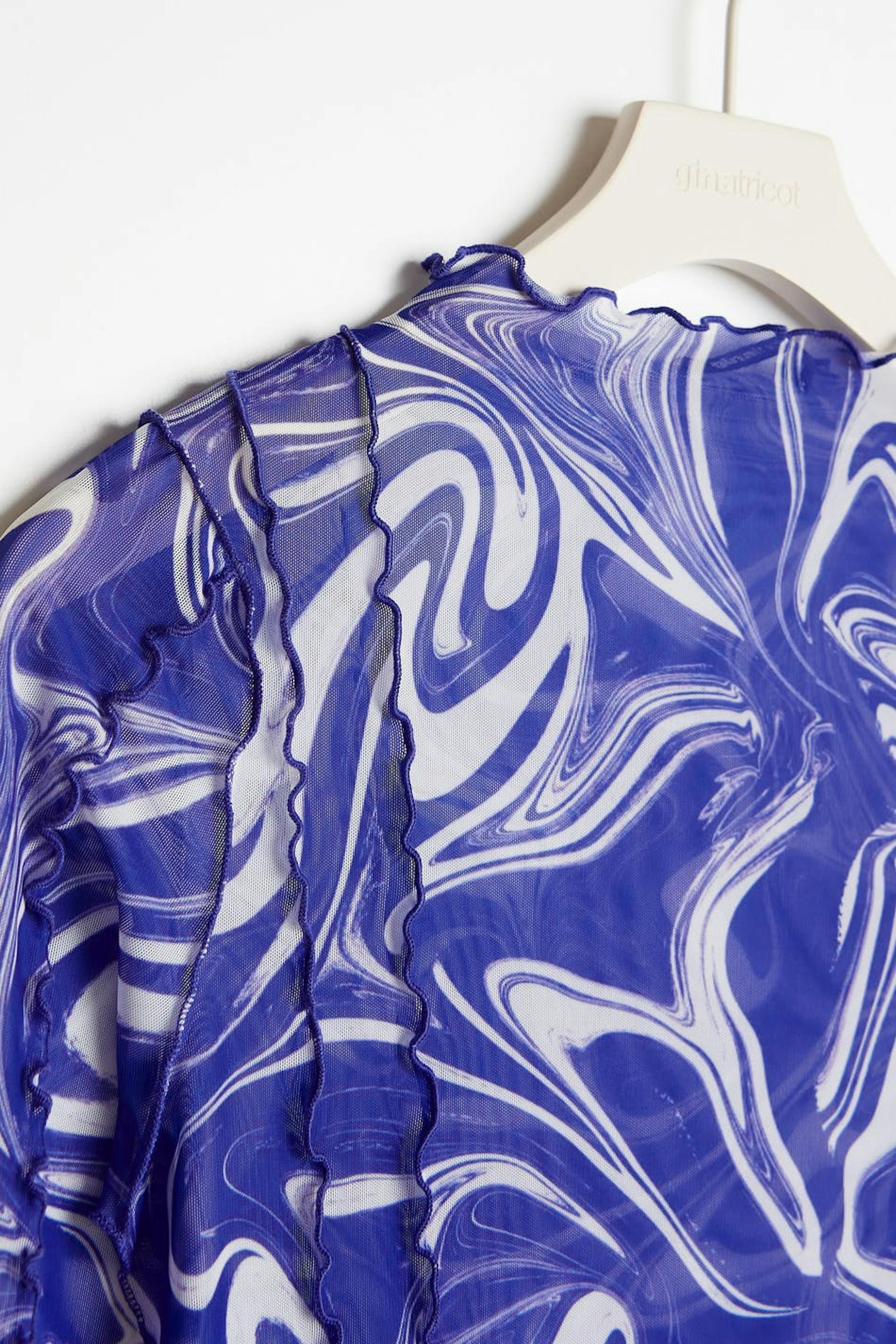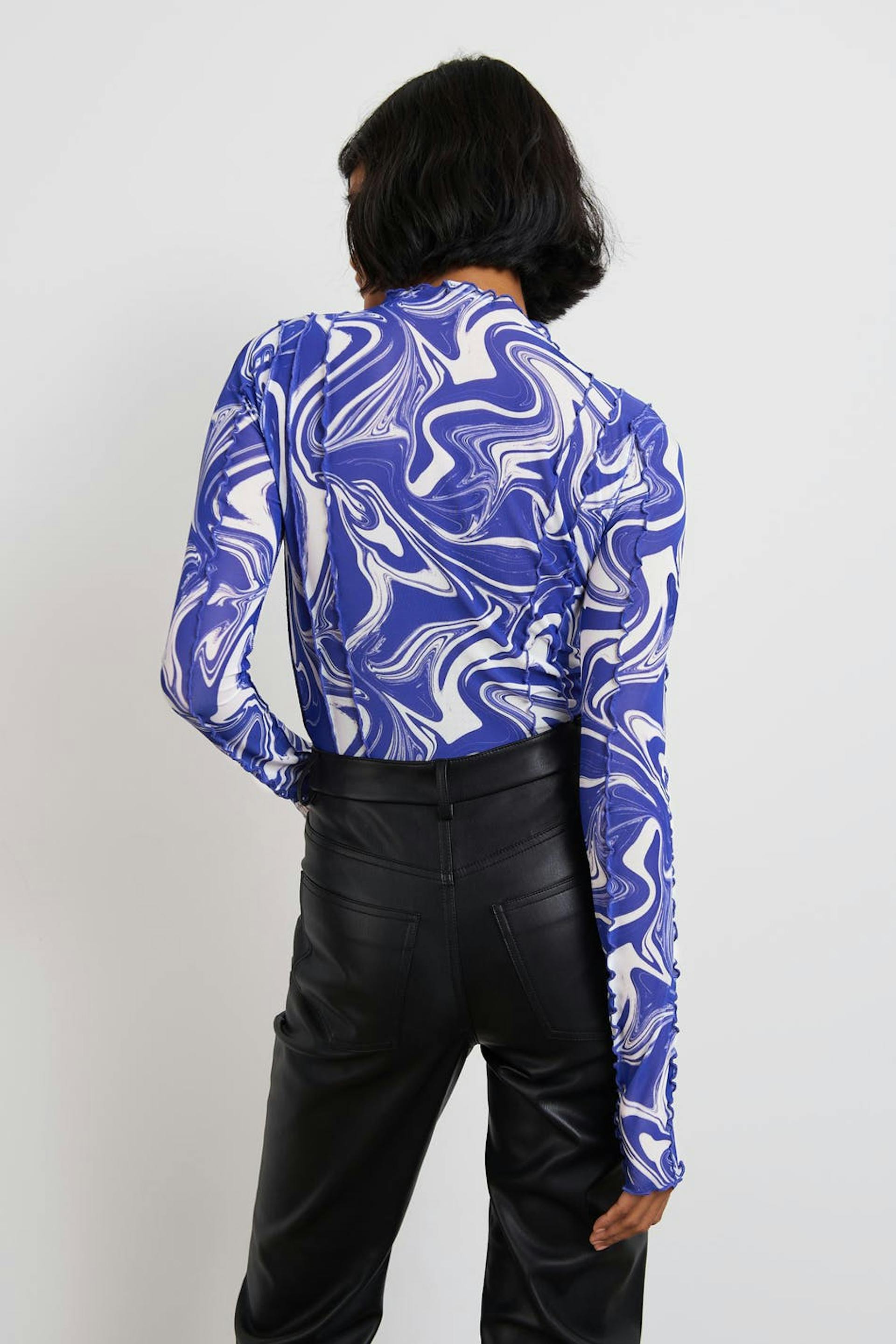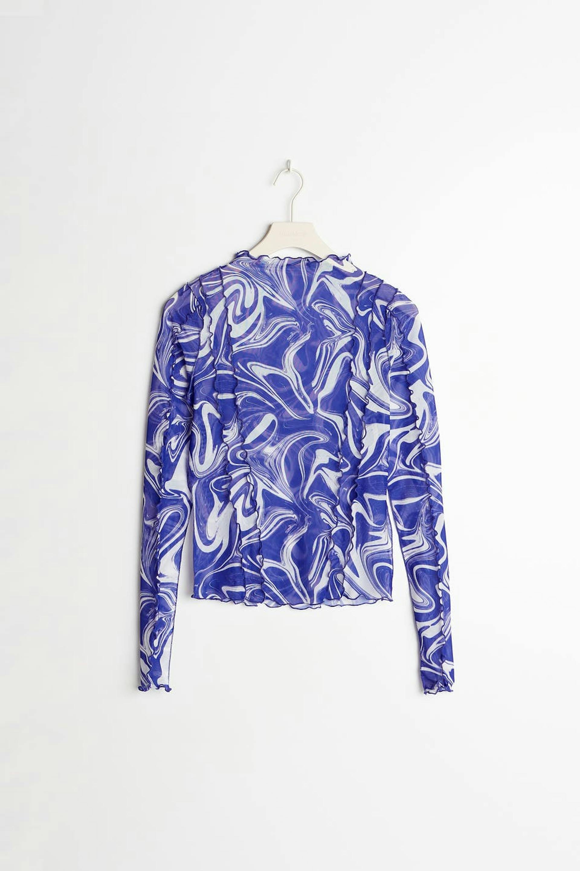 Swirl patterned top with a fitted fit. The top is blue and has ruffle details. It has a fitted fit, a high neckline and long sleeves.