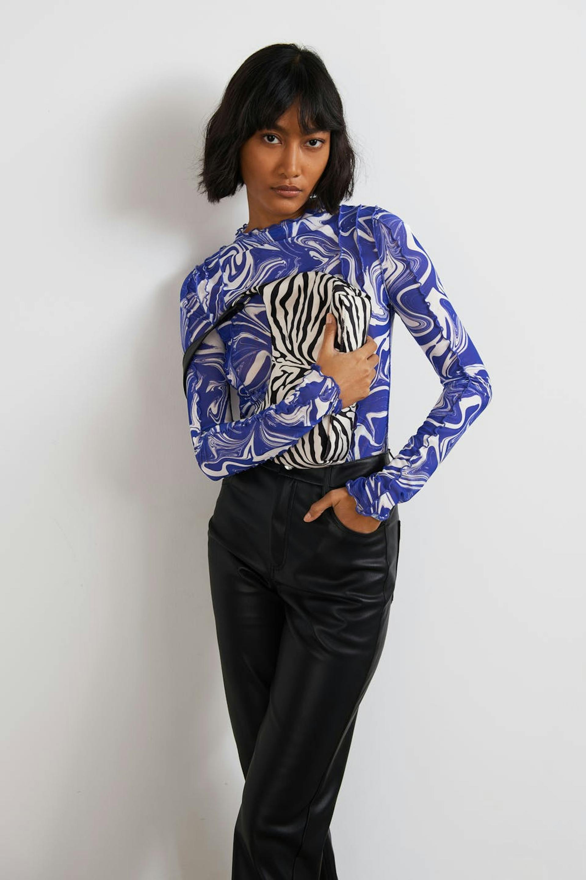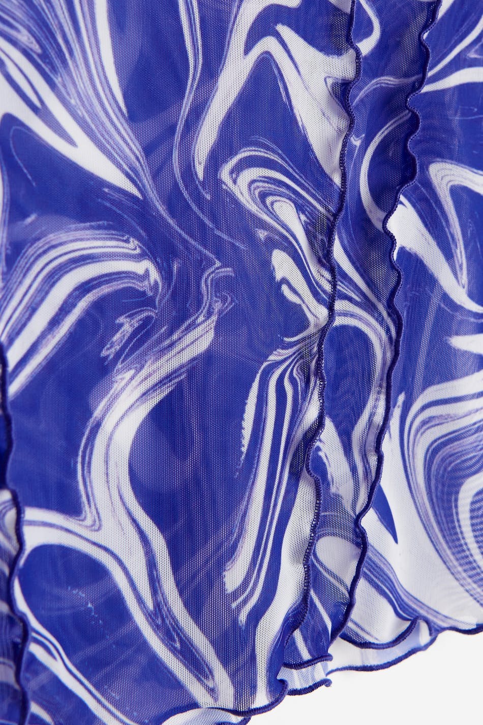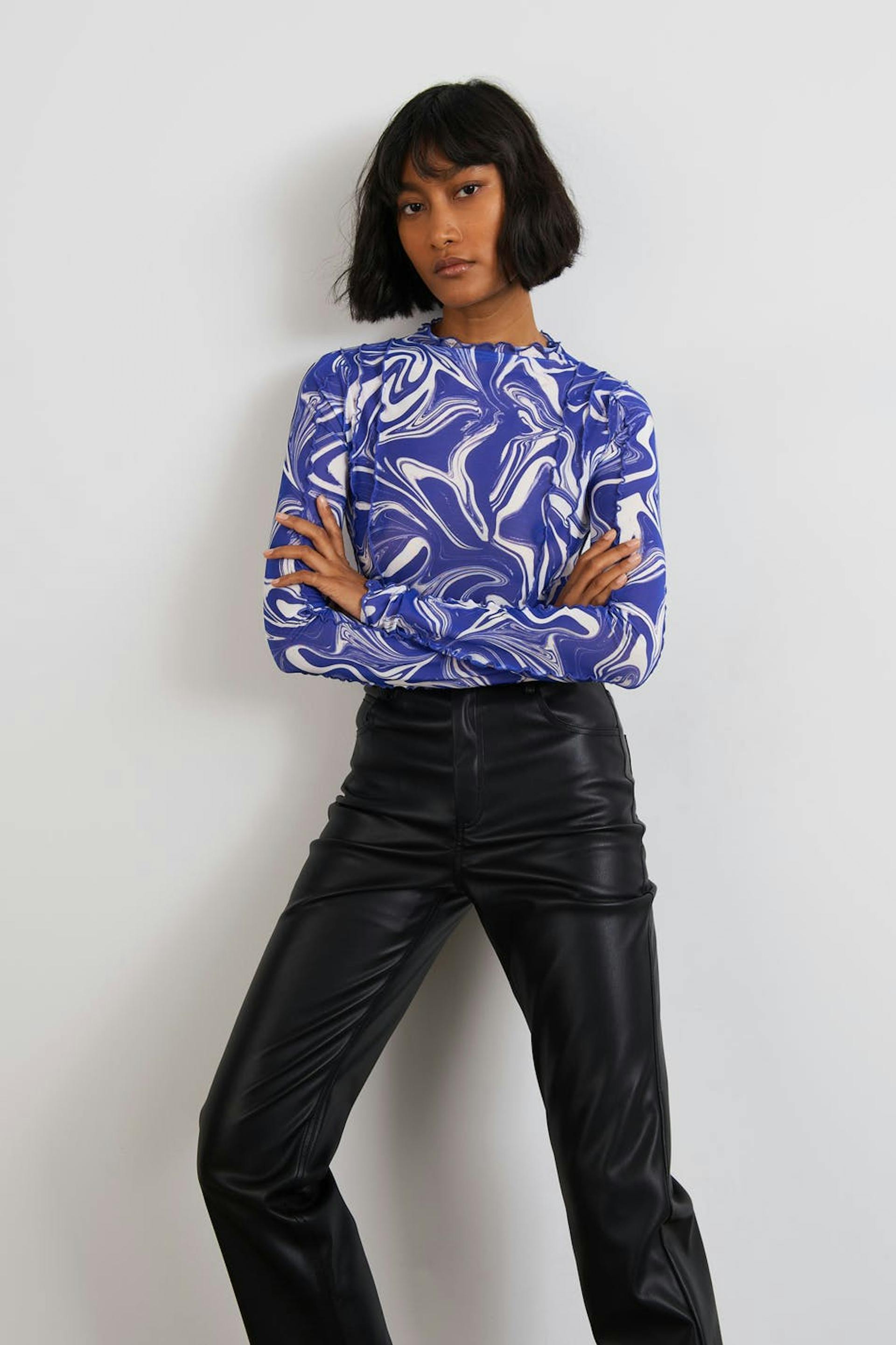 Swirl patterned top with a fitted fit. The top is blue and has ruffle details. It has a fitted fit, a high neckline and long sleeves.
