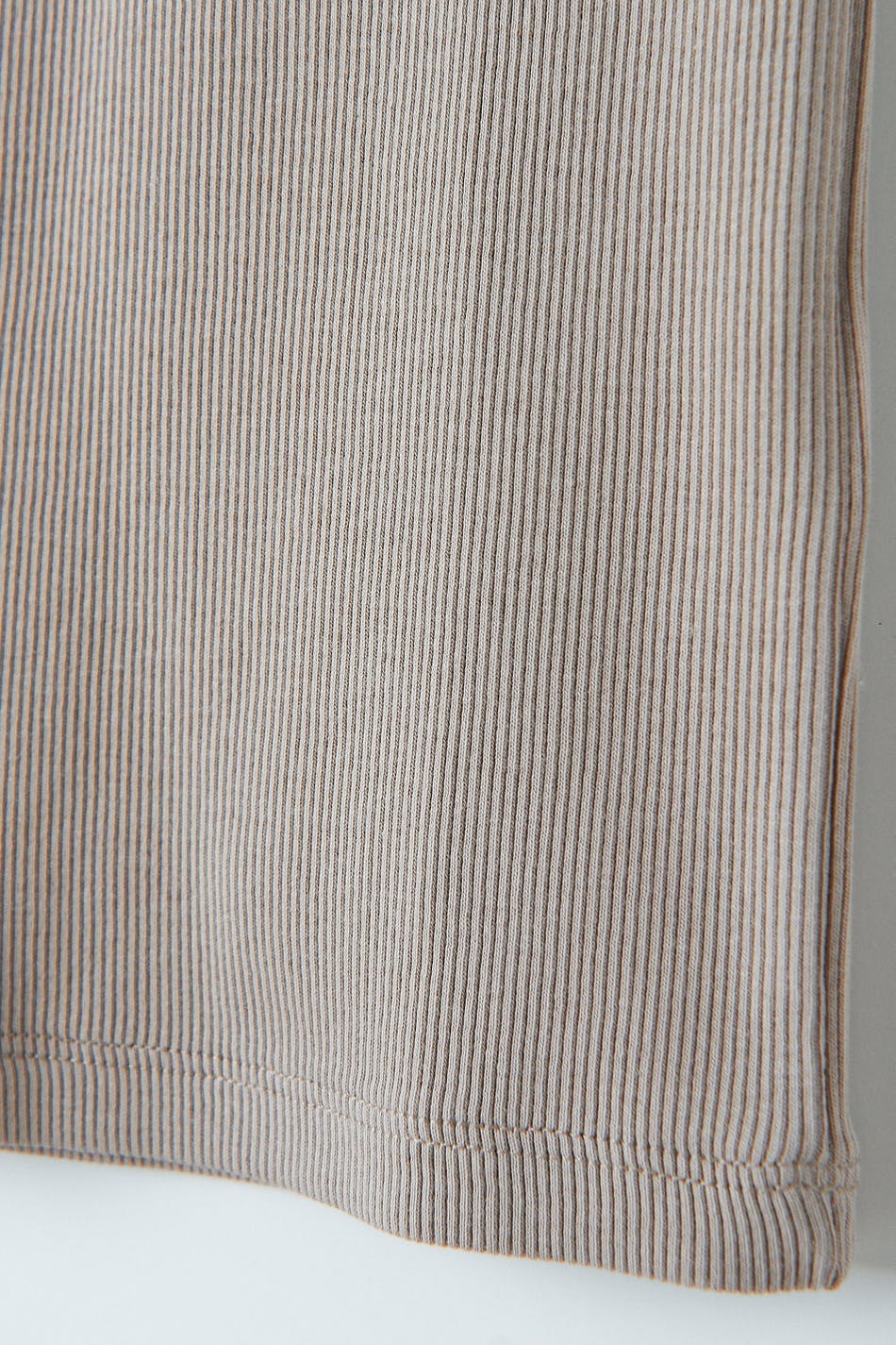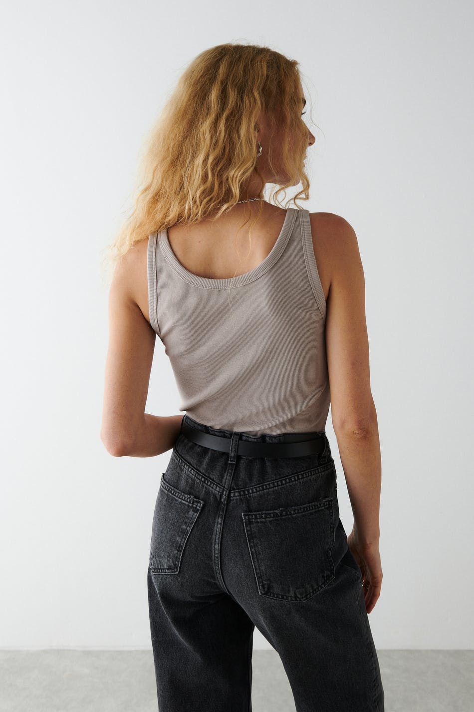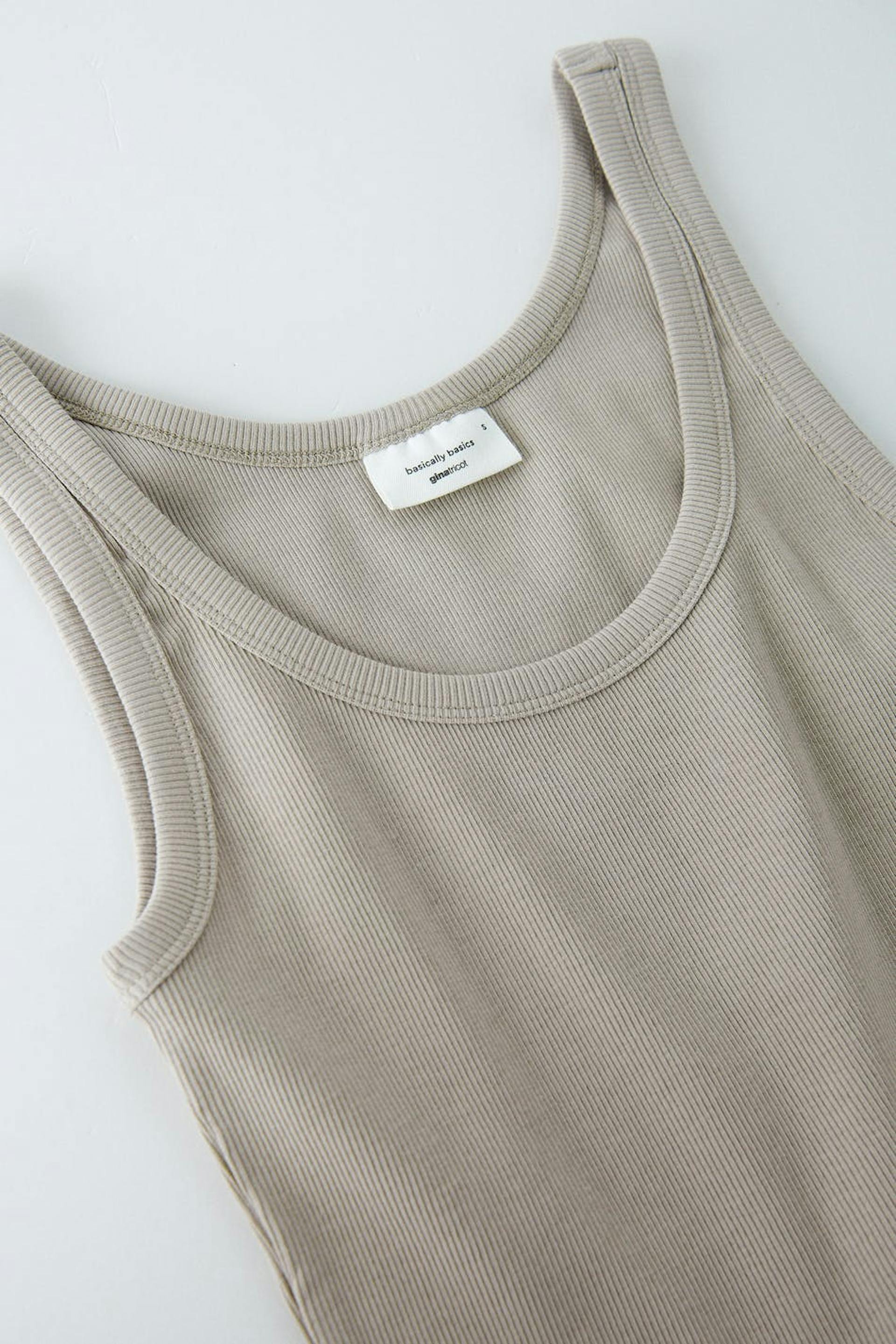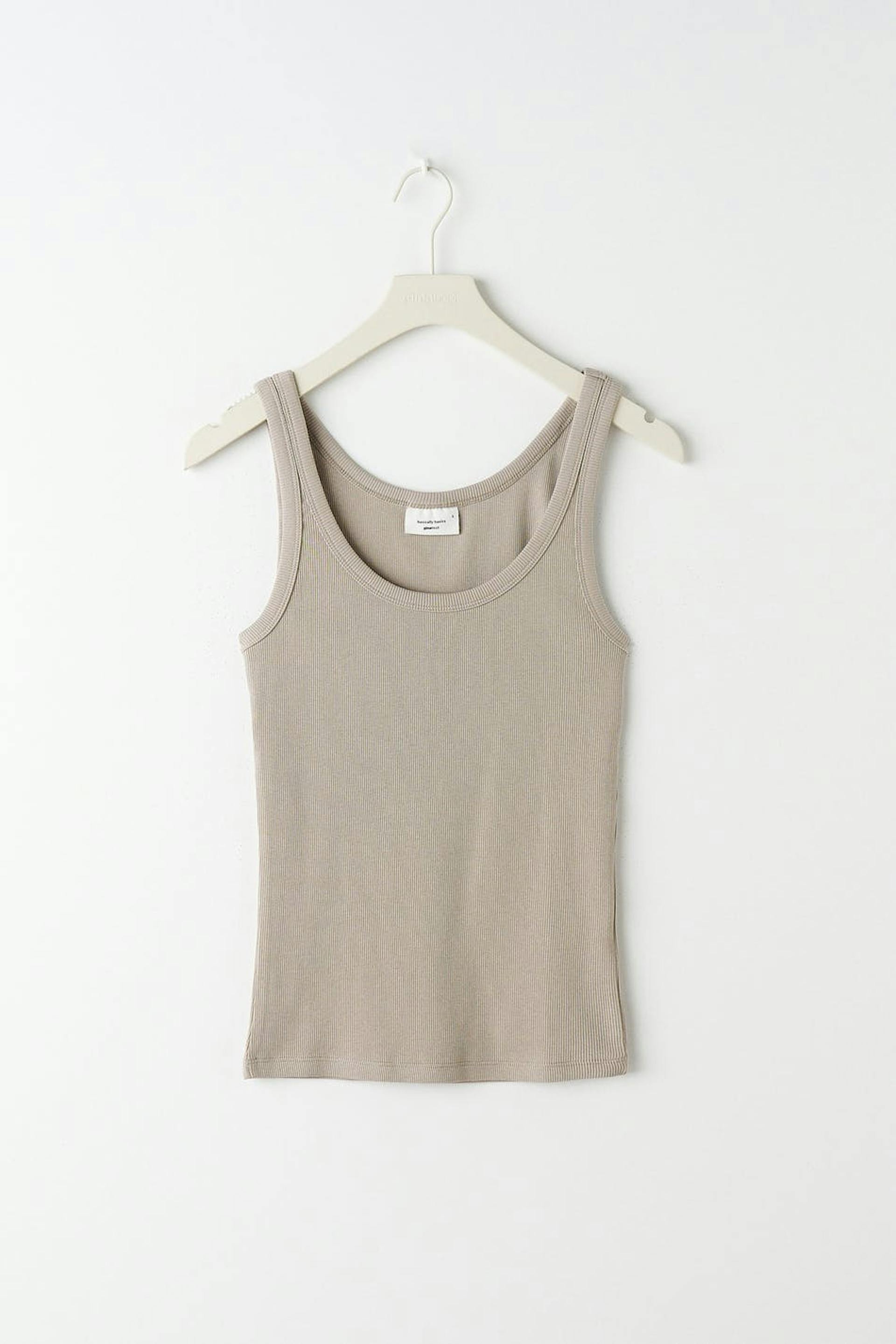 Ribbed tank with a fitted fit. The tank is beige and has a normal length.