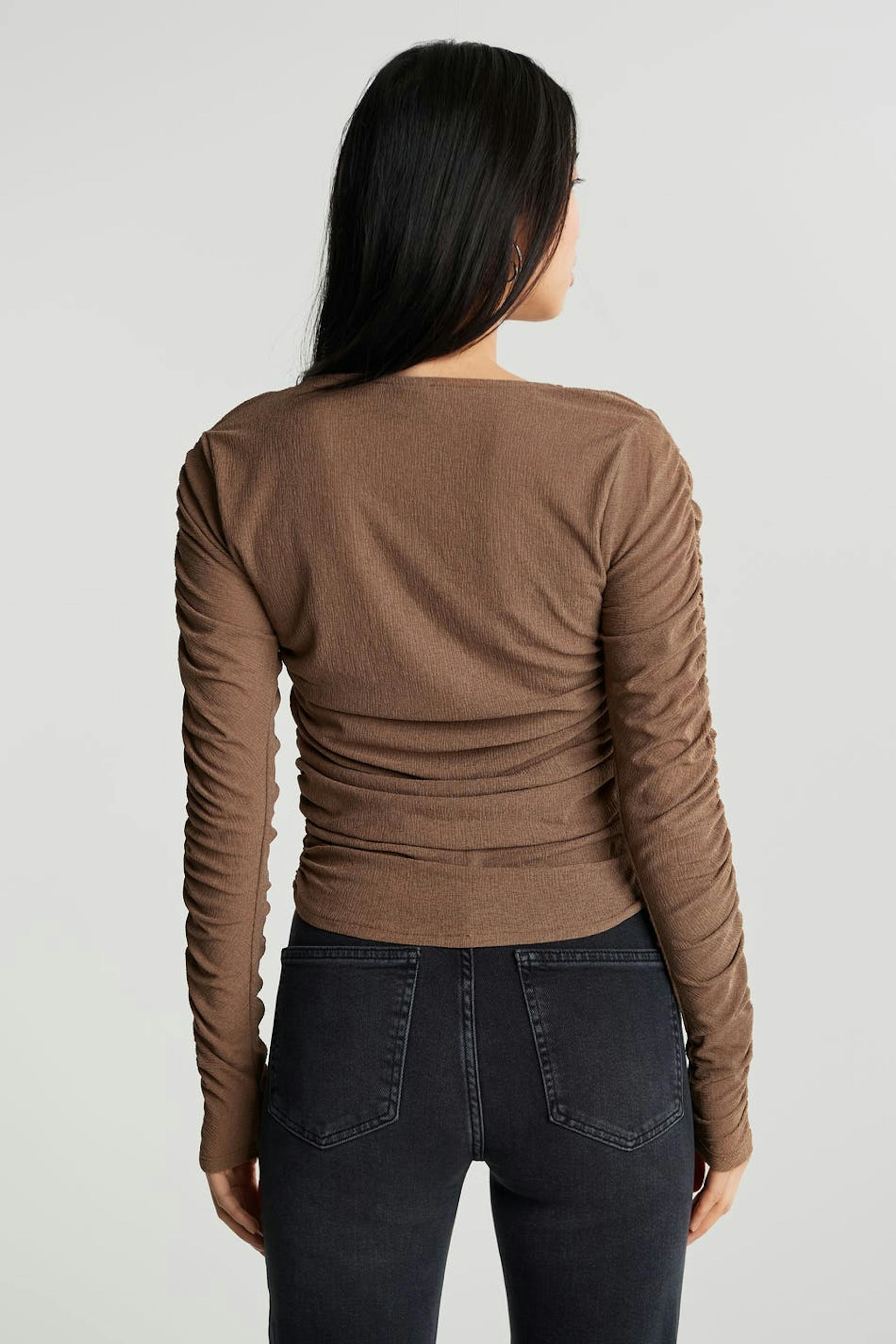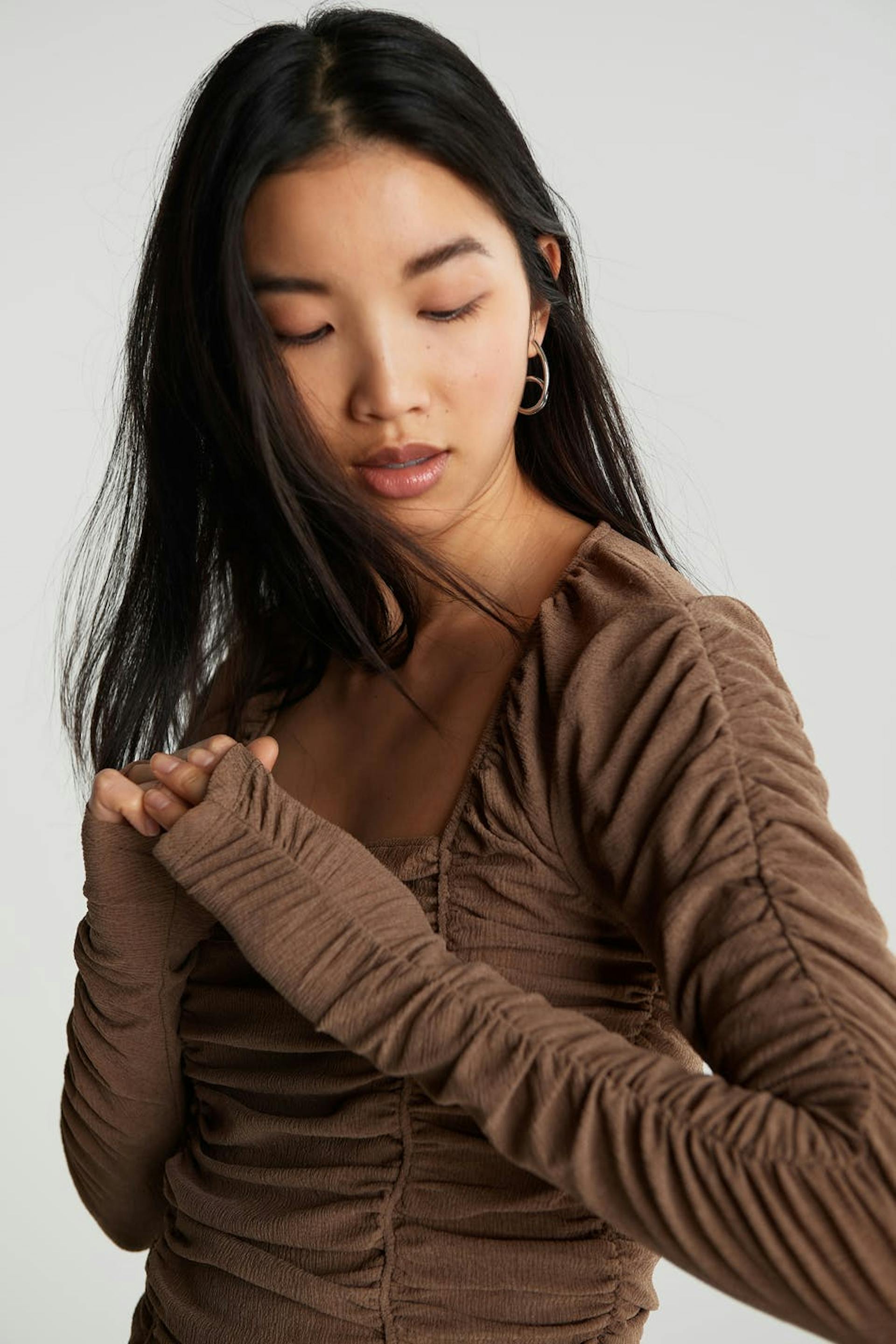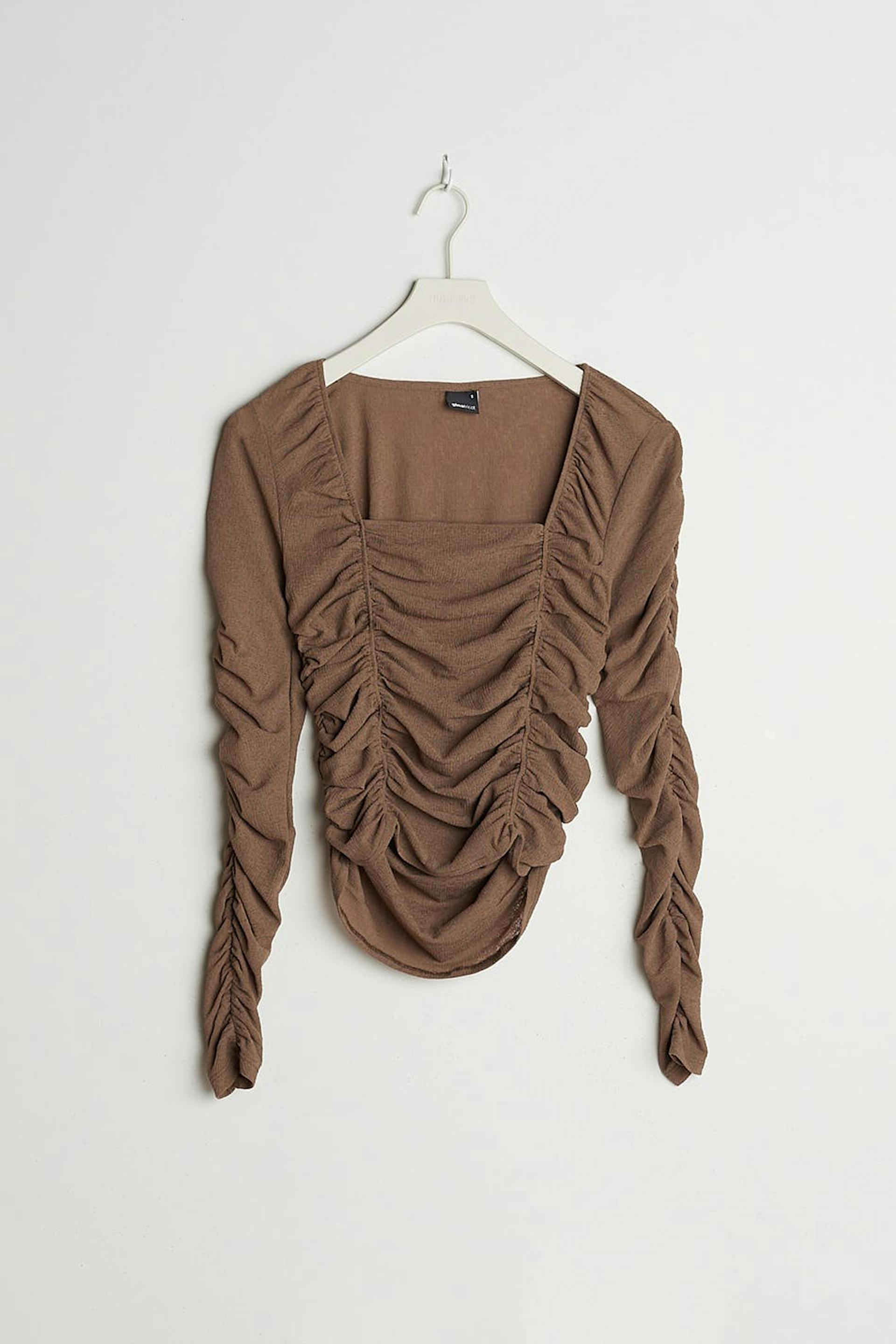 Long-sleeved top with a fitted fit. The top is brown and has a square neckline. It has ruching at the torso and on the sleeves.