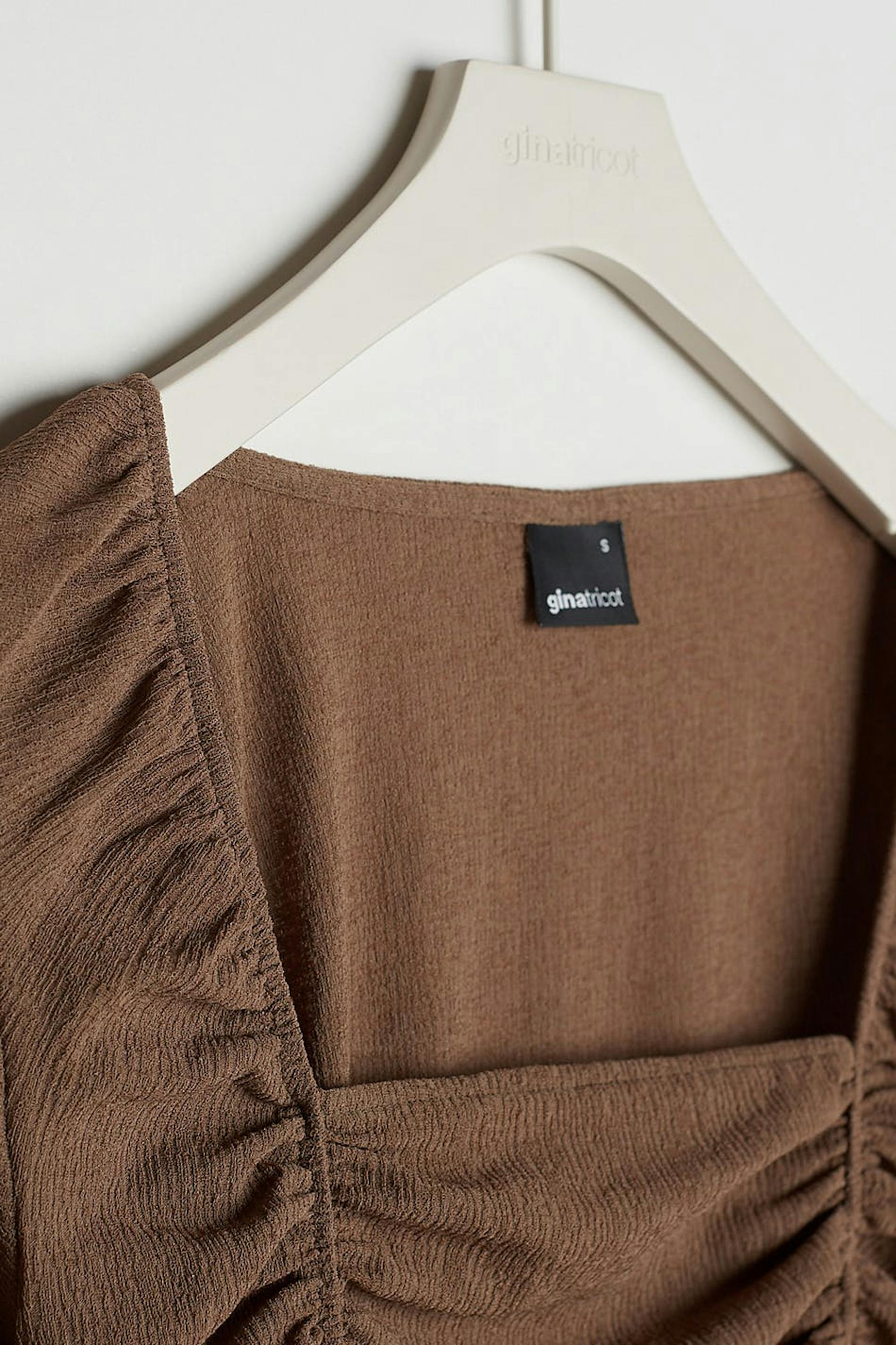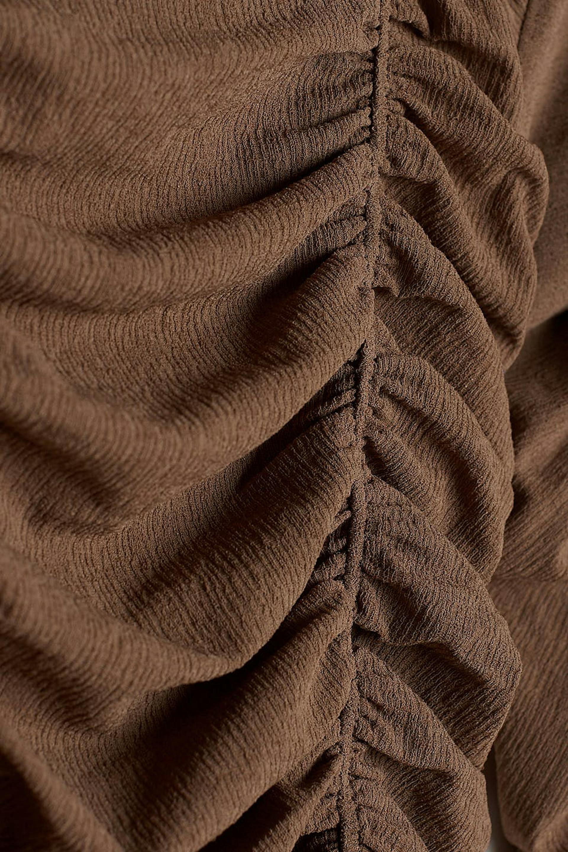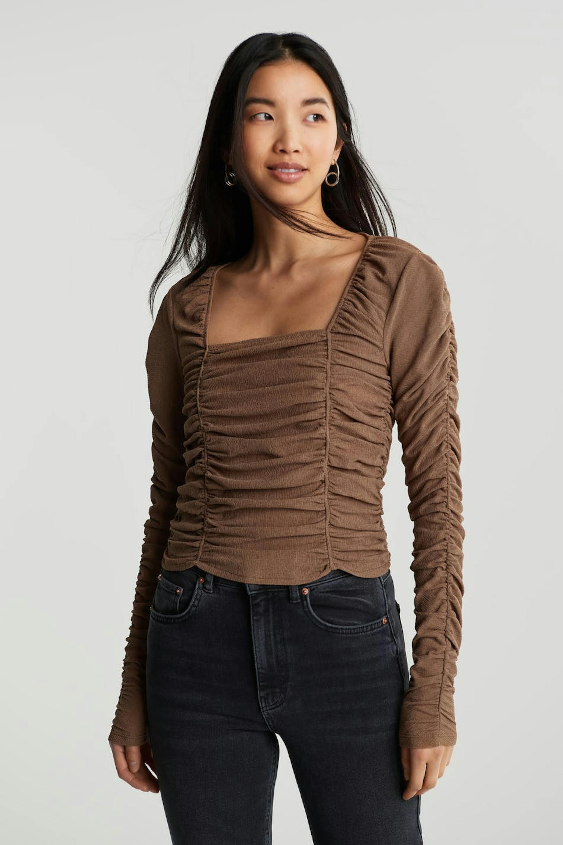 Long-sleeved top with a fitted fit. The top is brown and has a square neckline. It has ruching at the torso and on the sleeves.