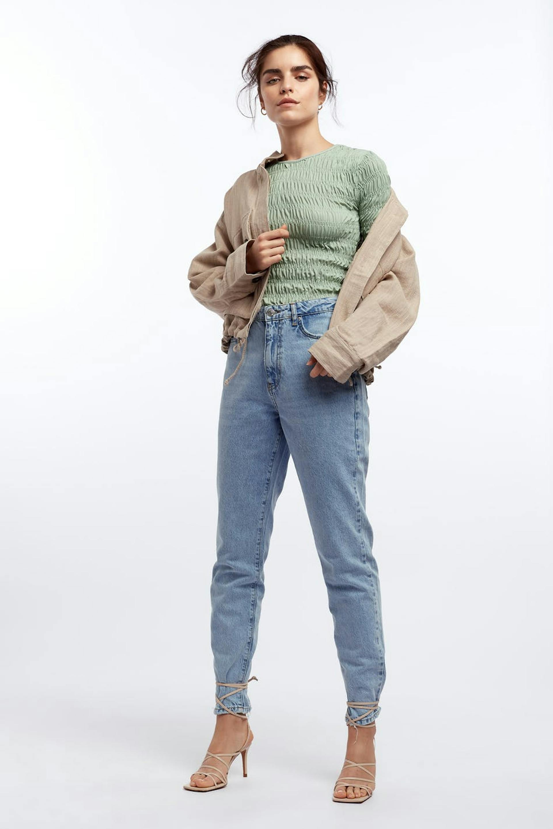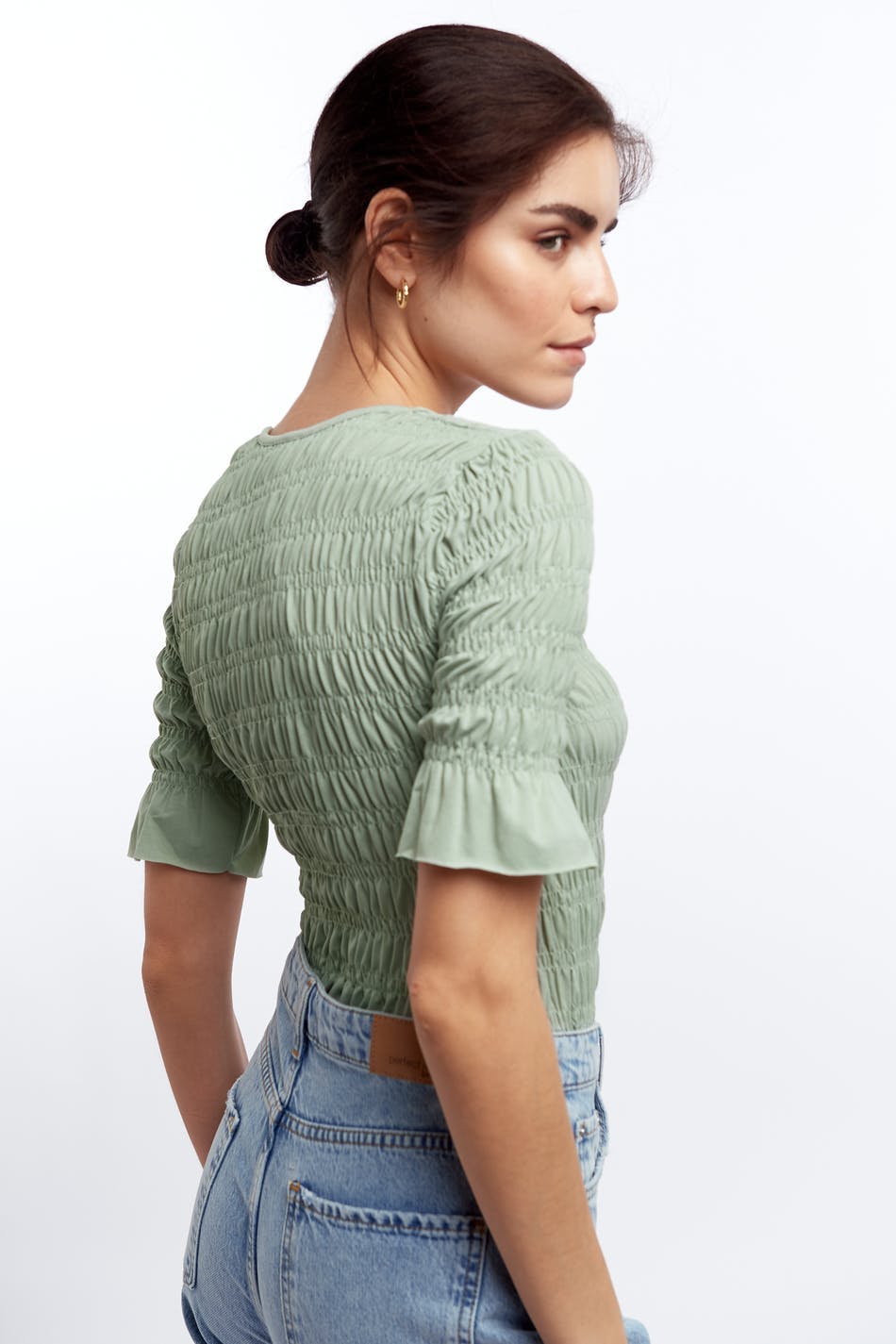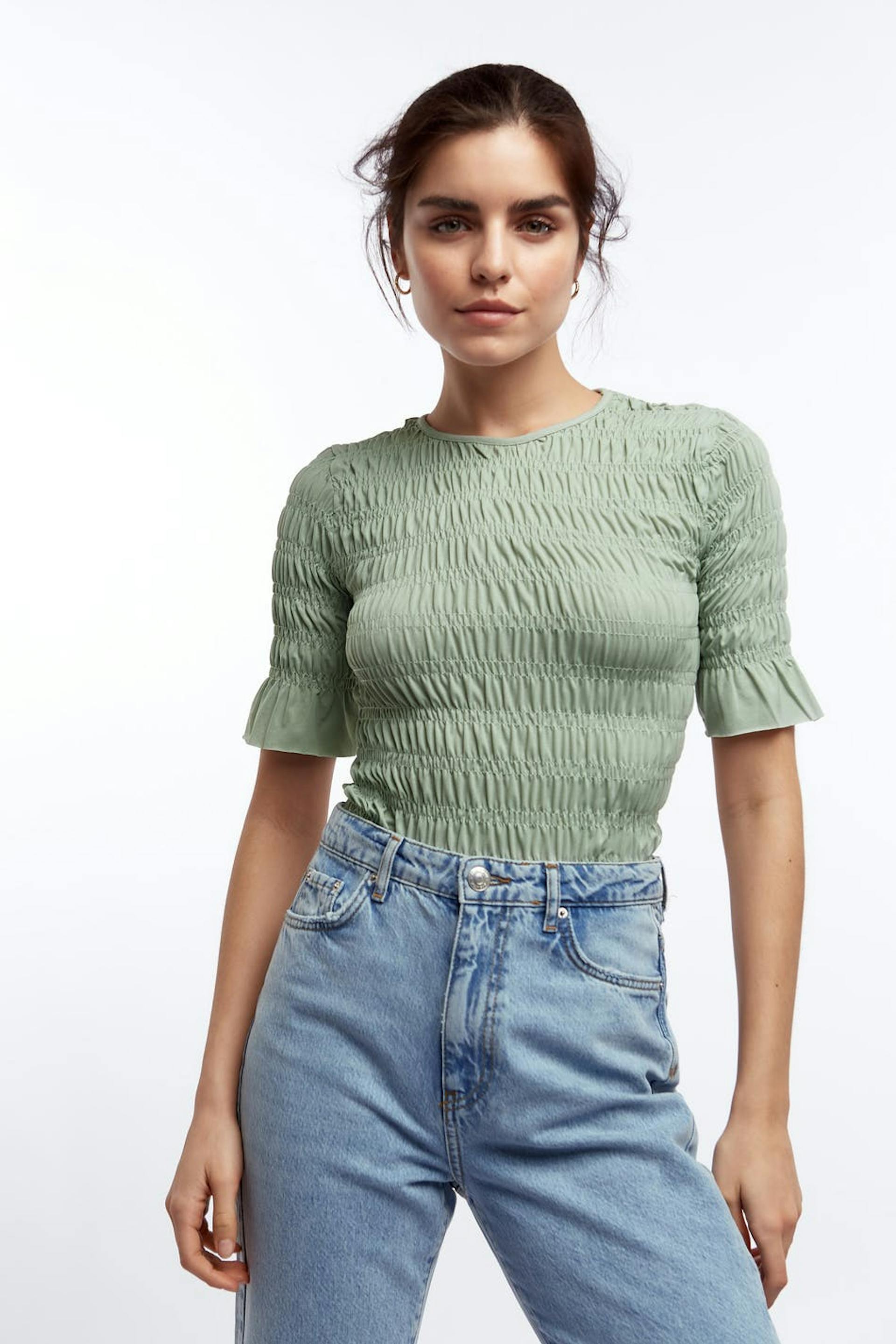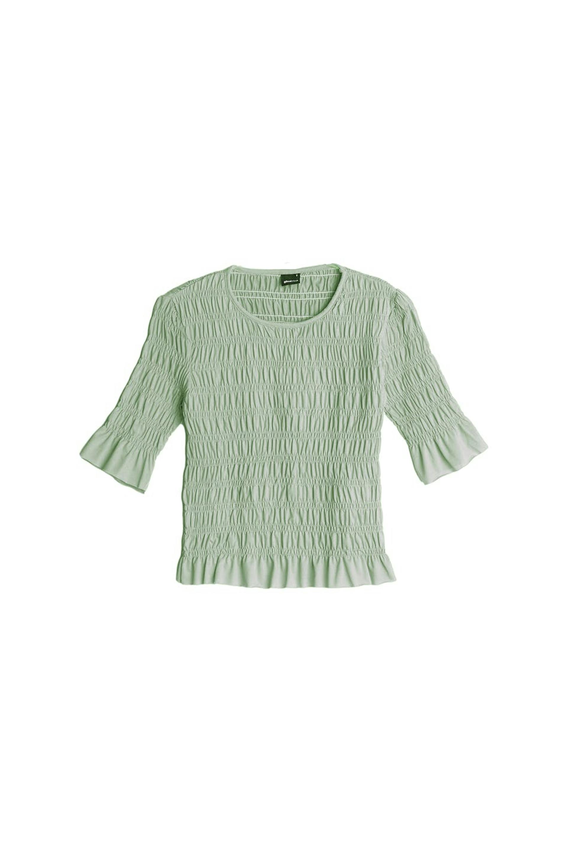 Short-sleeved top with a regular fit. The top is green and has smocked details all-around.
