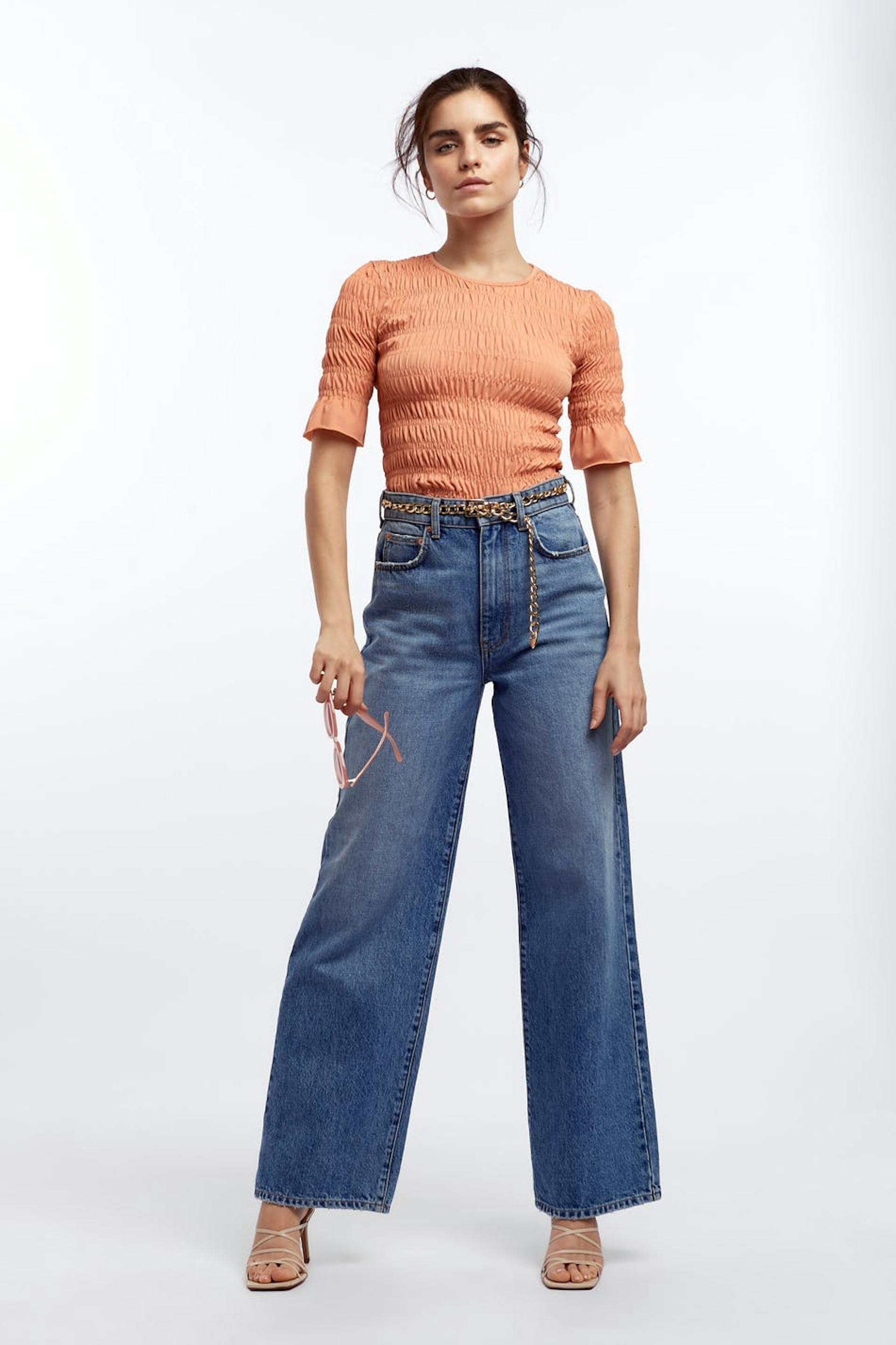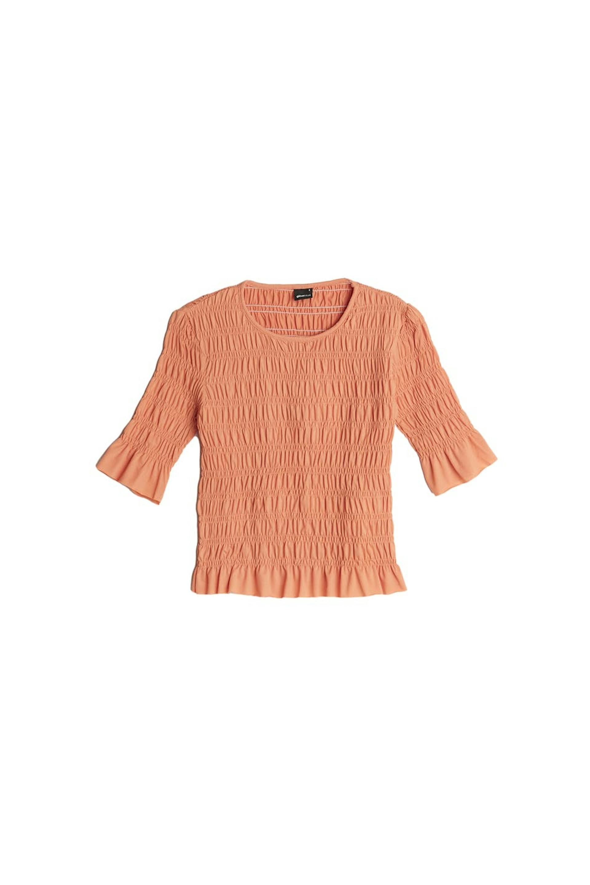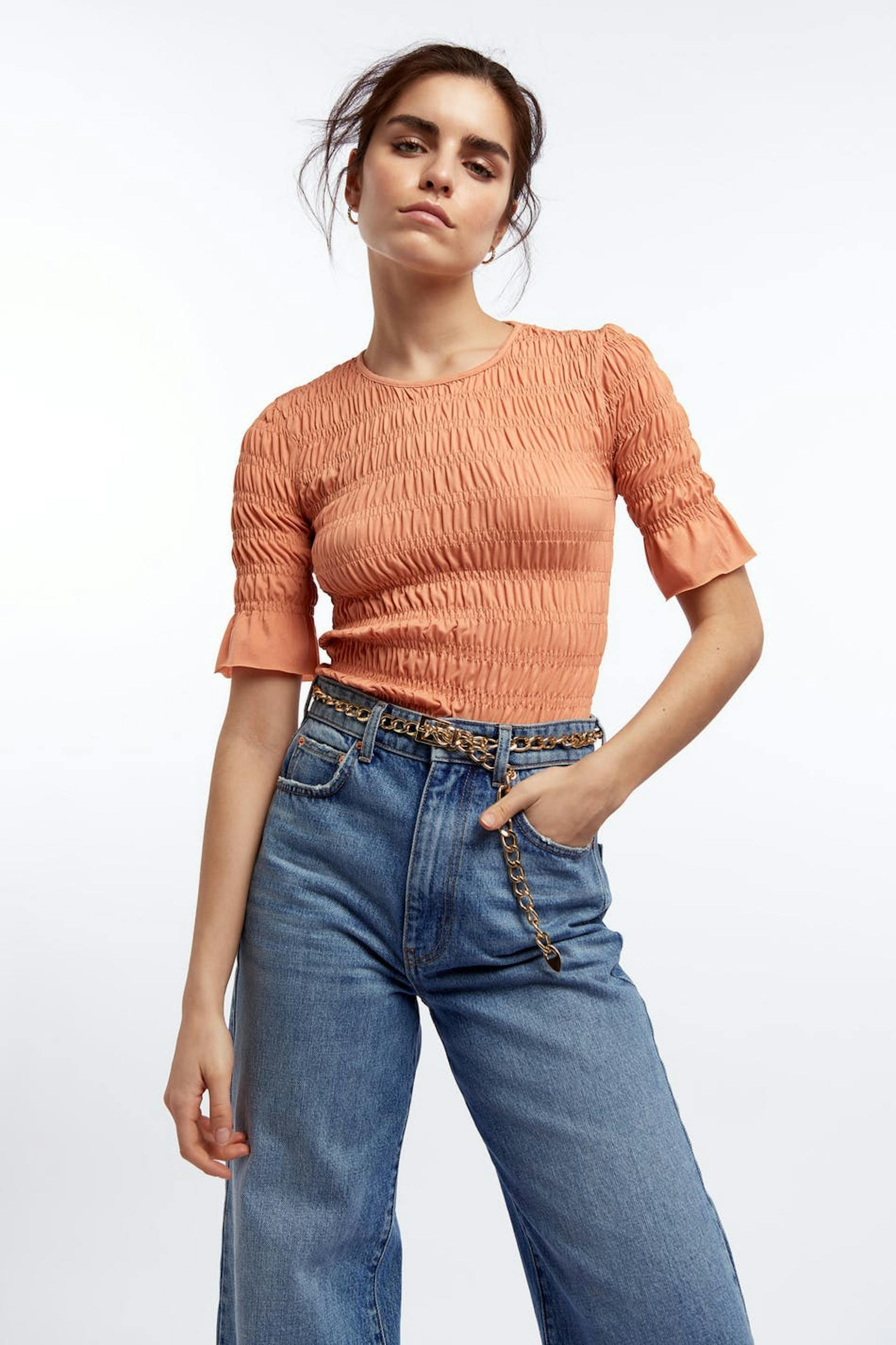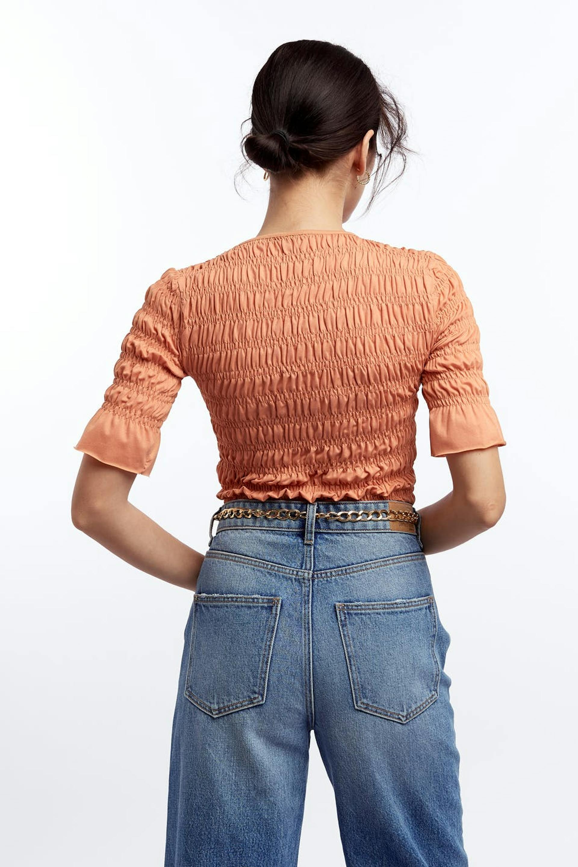 Short-sleeved top with a regular fit. The top is beige and has smocked details all-around.