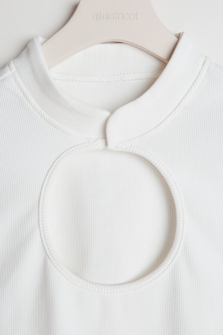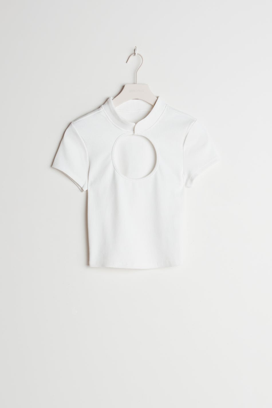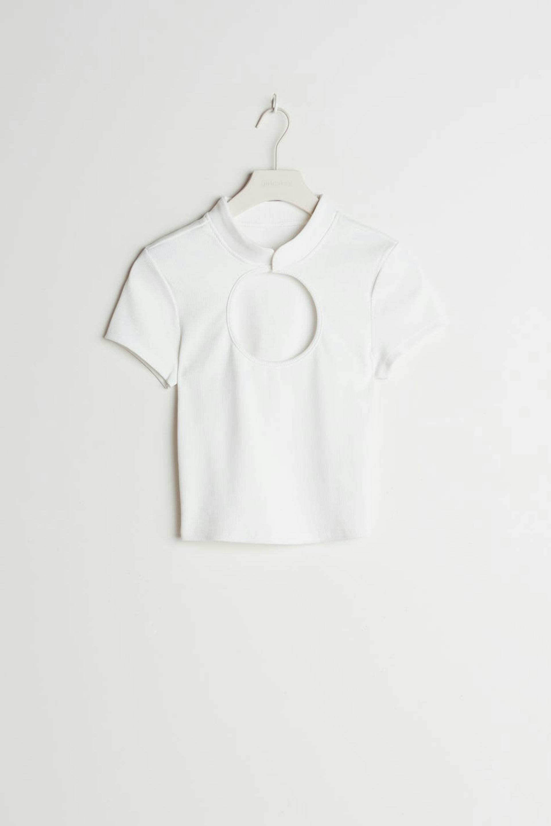 Short top with a fitted fit. The top is white and has a round cutout detail above the bust. It has a collar with a closure to the neck.