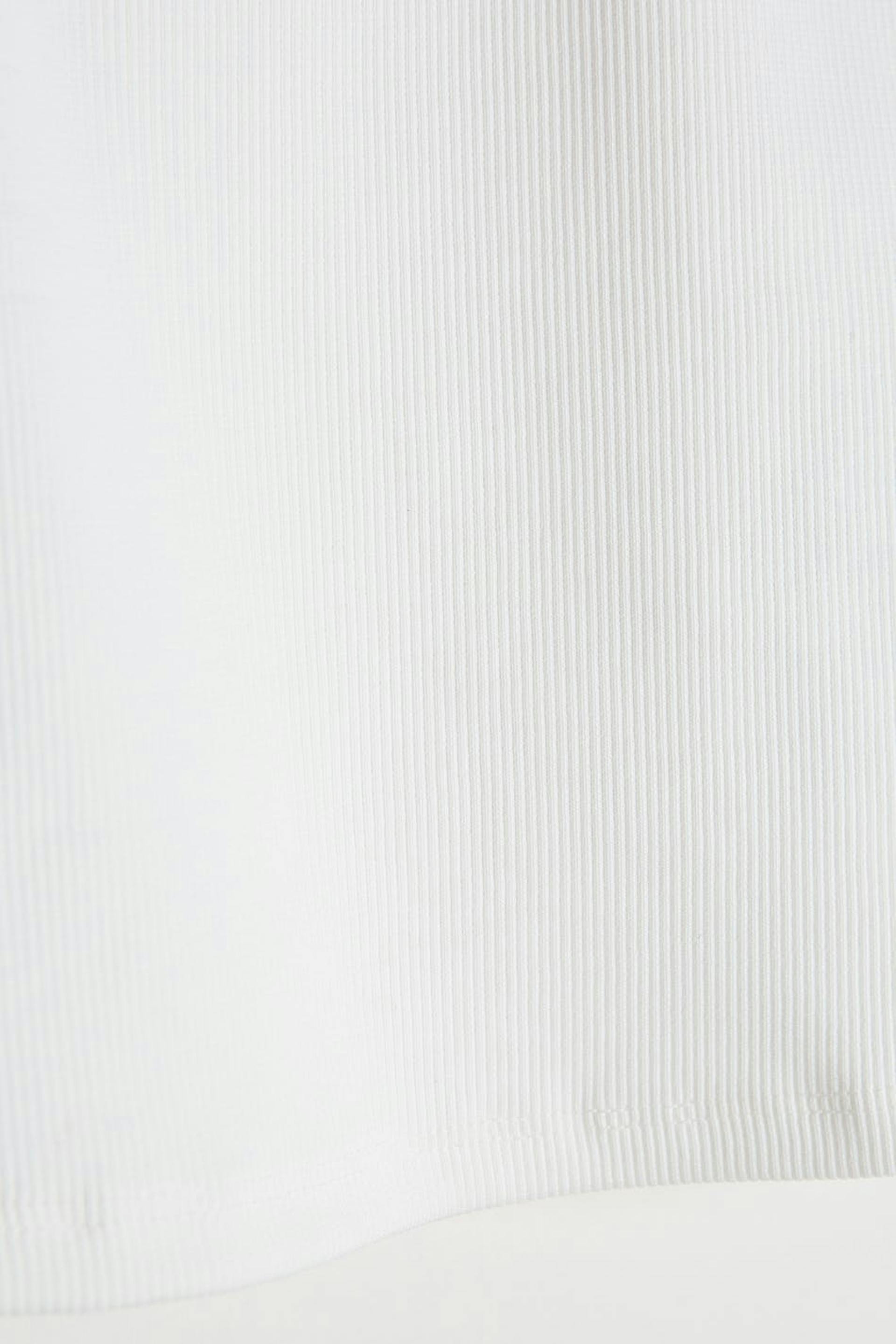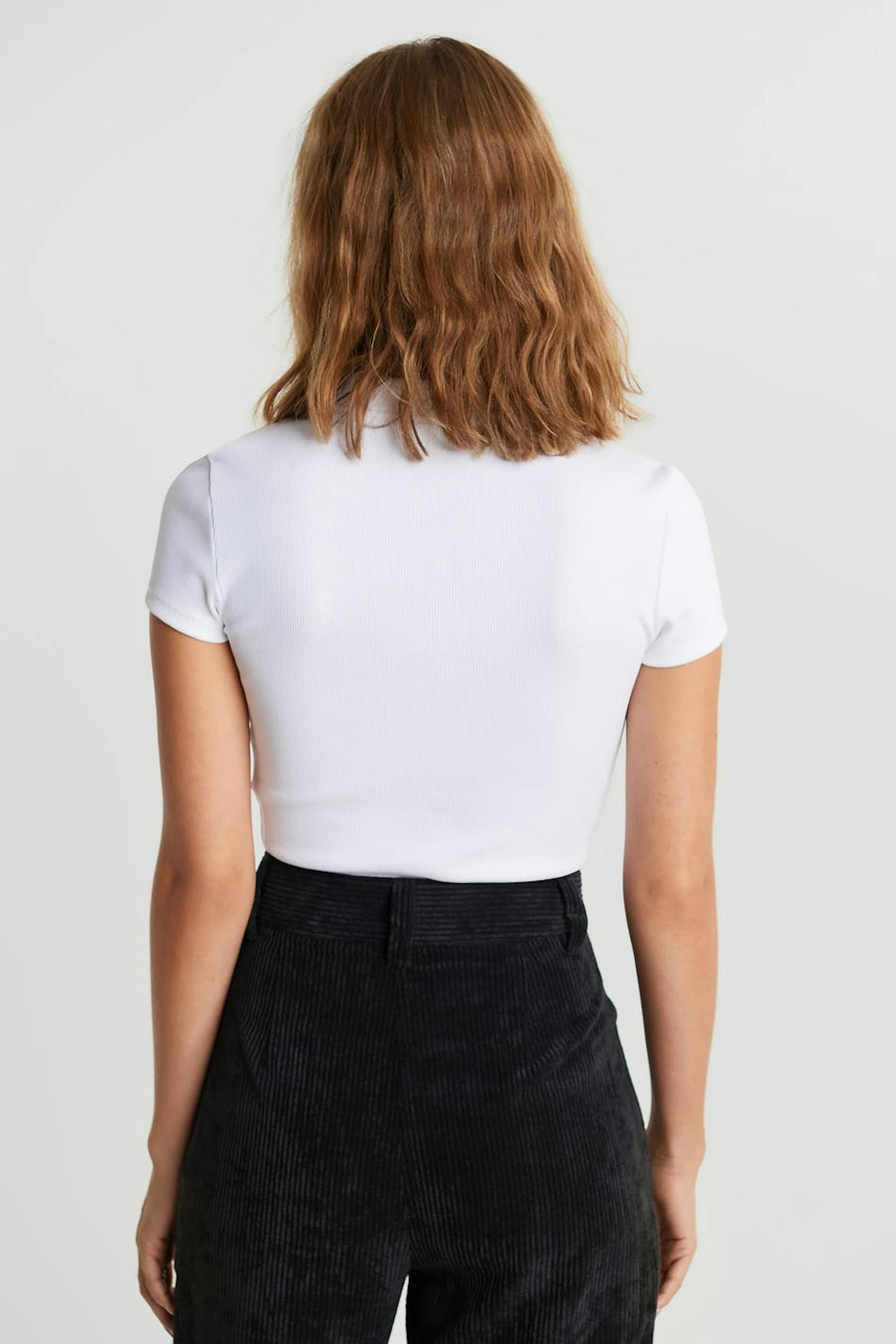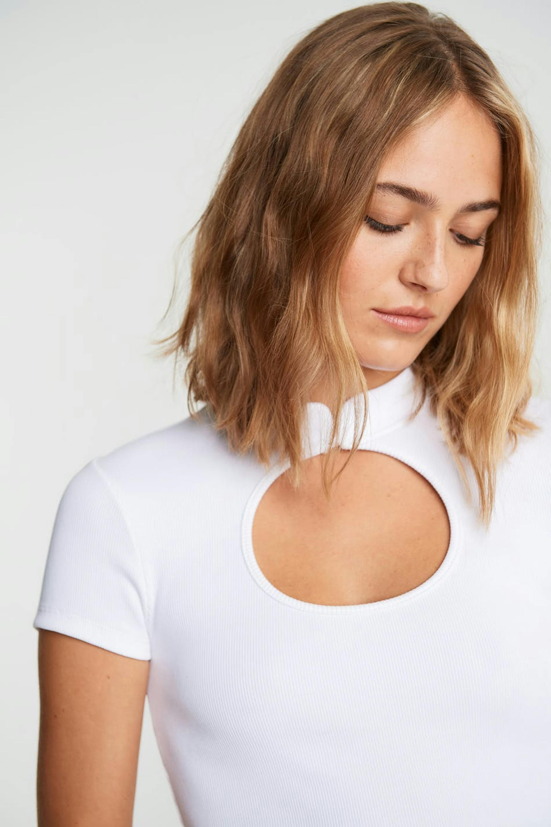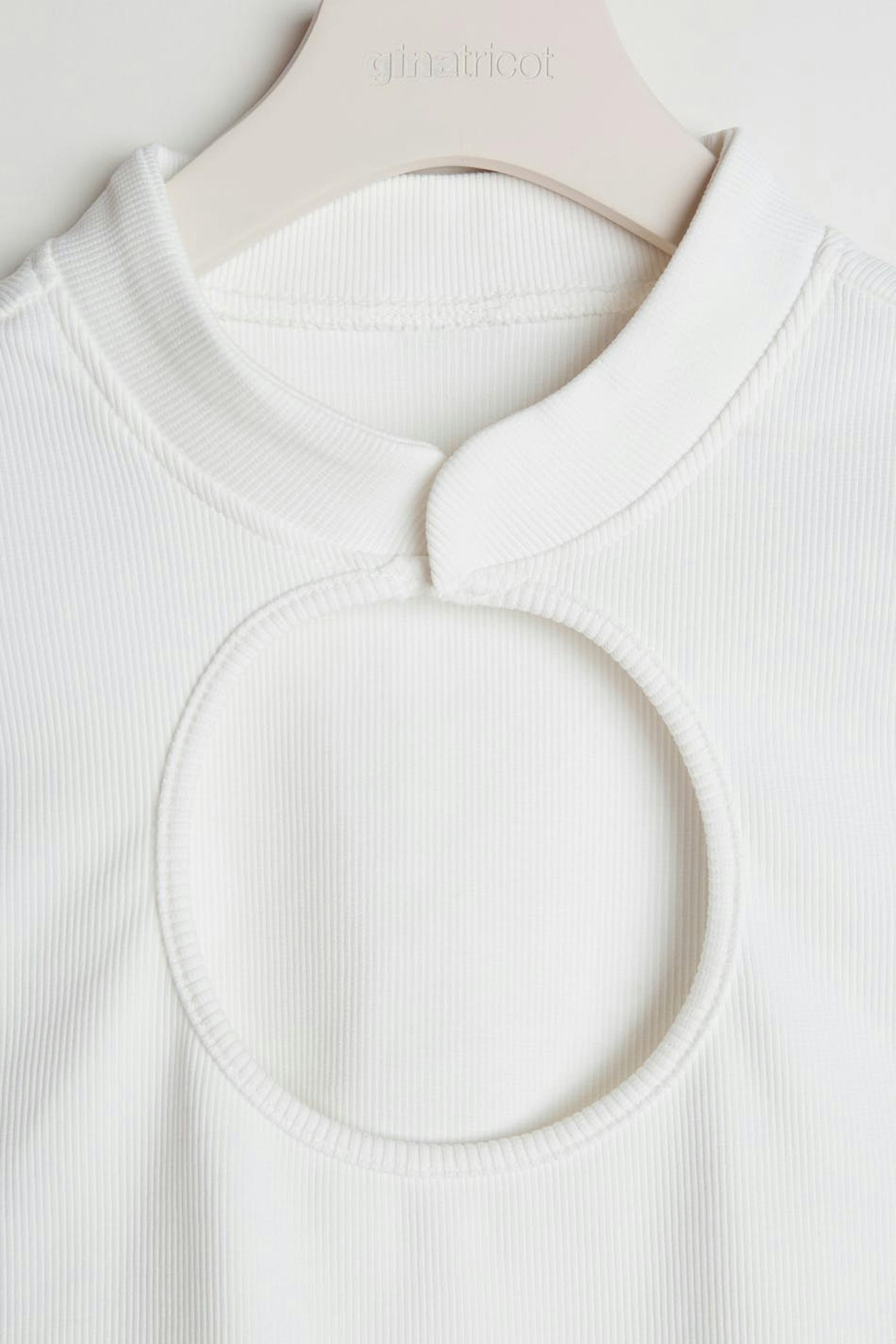 Short top with a fitted fit. The top is white and has a round cutout detail above the bust. It has a collar with a closure to the neck.