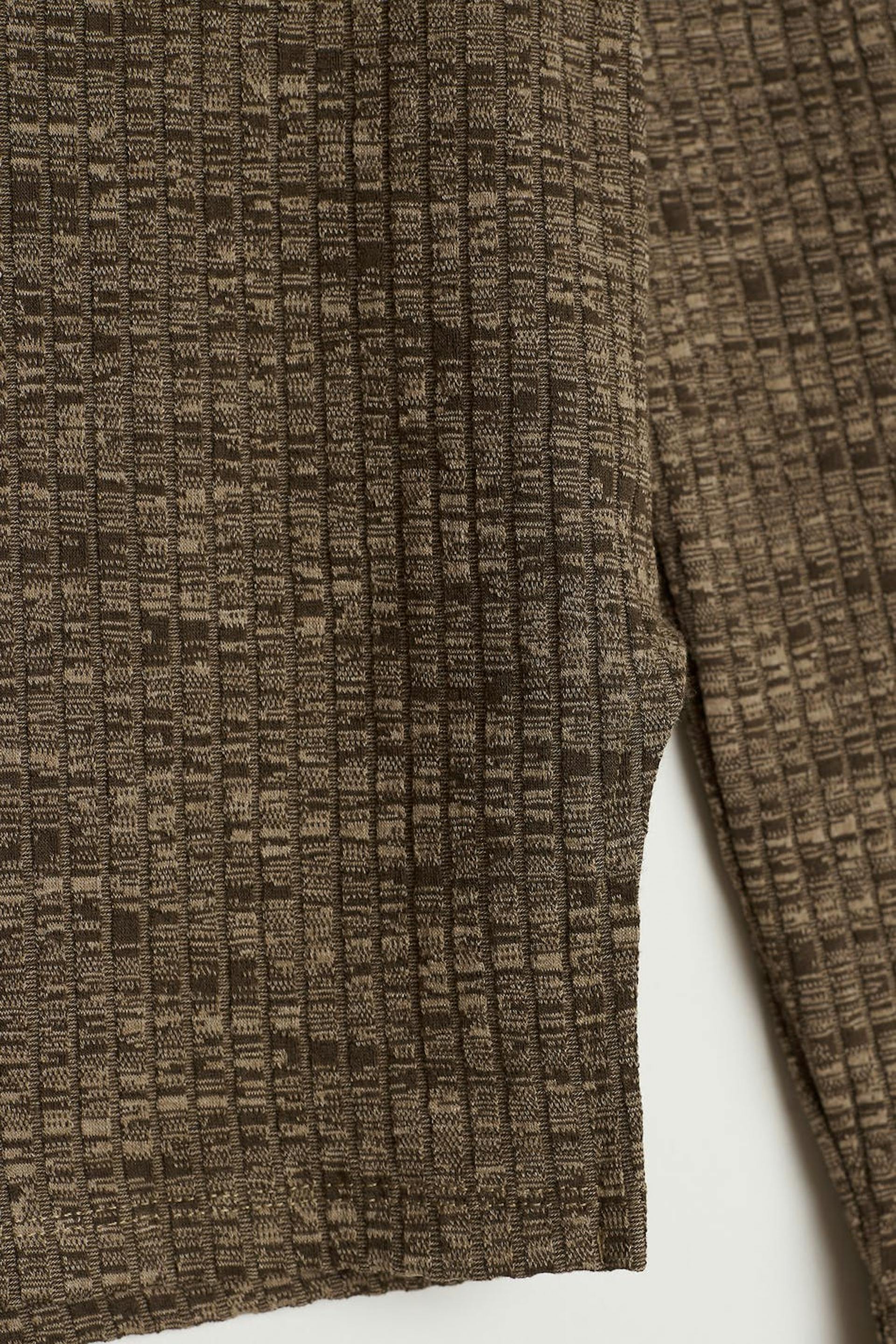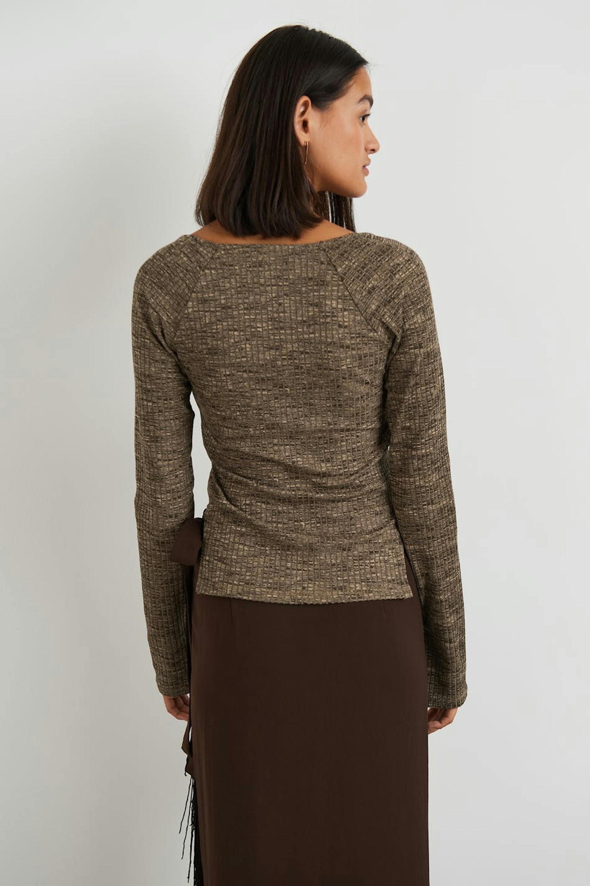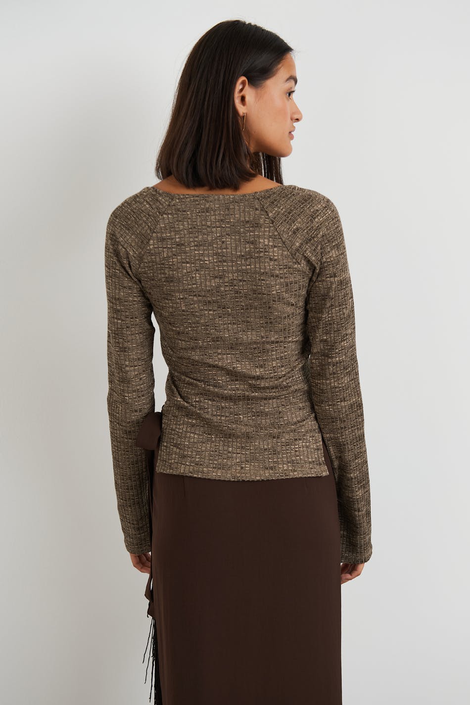 Ribbed top with a fitted fit. The top is brown and has a slit on the sides. It has long sleeves with slit on the sleeve ends.