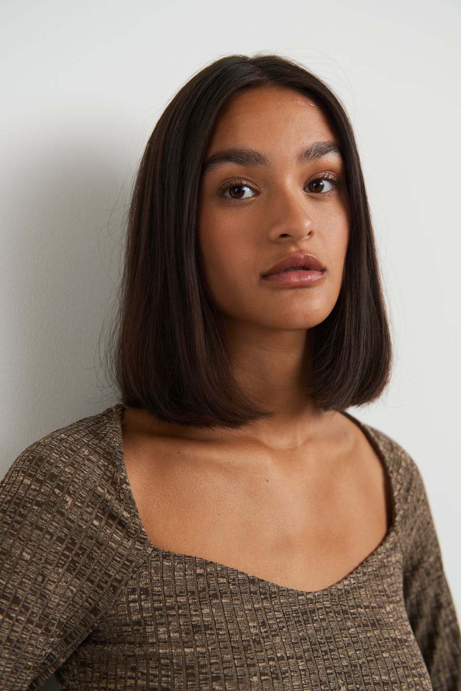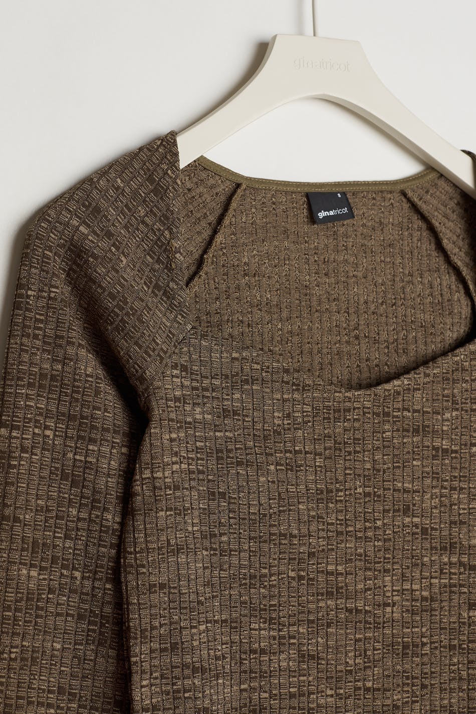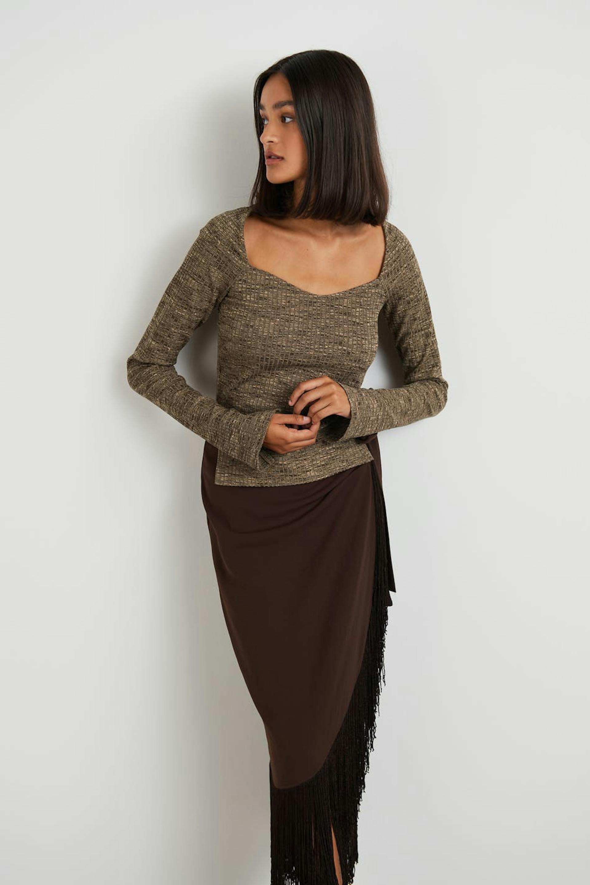 Ribbed top with a fitted fit. The top is brown and has a slit on the sides. It has long sleeves with slit on the sleeve ends.