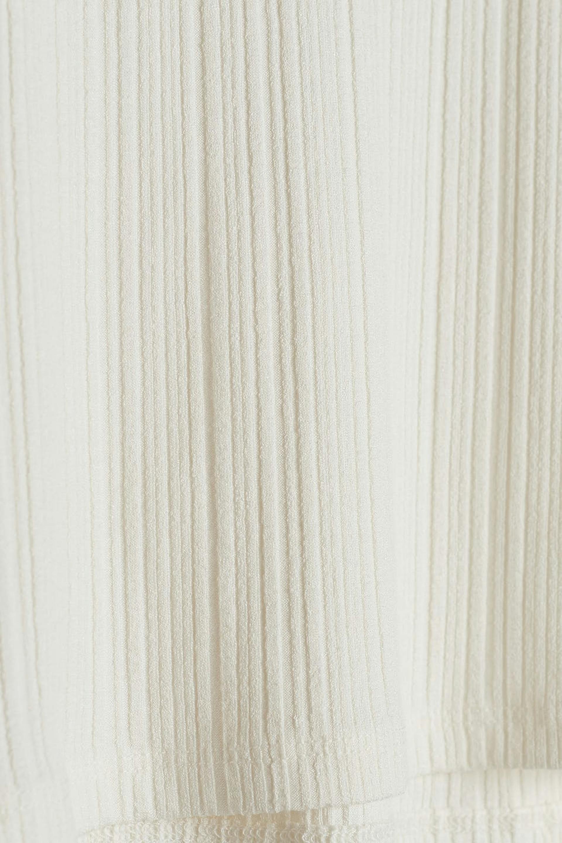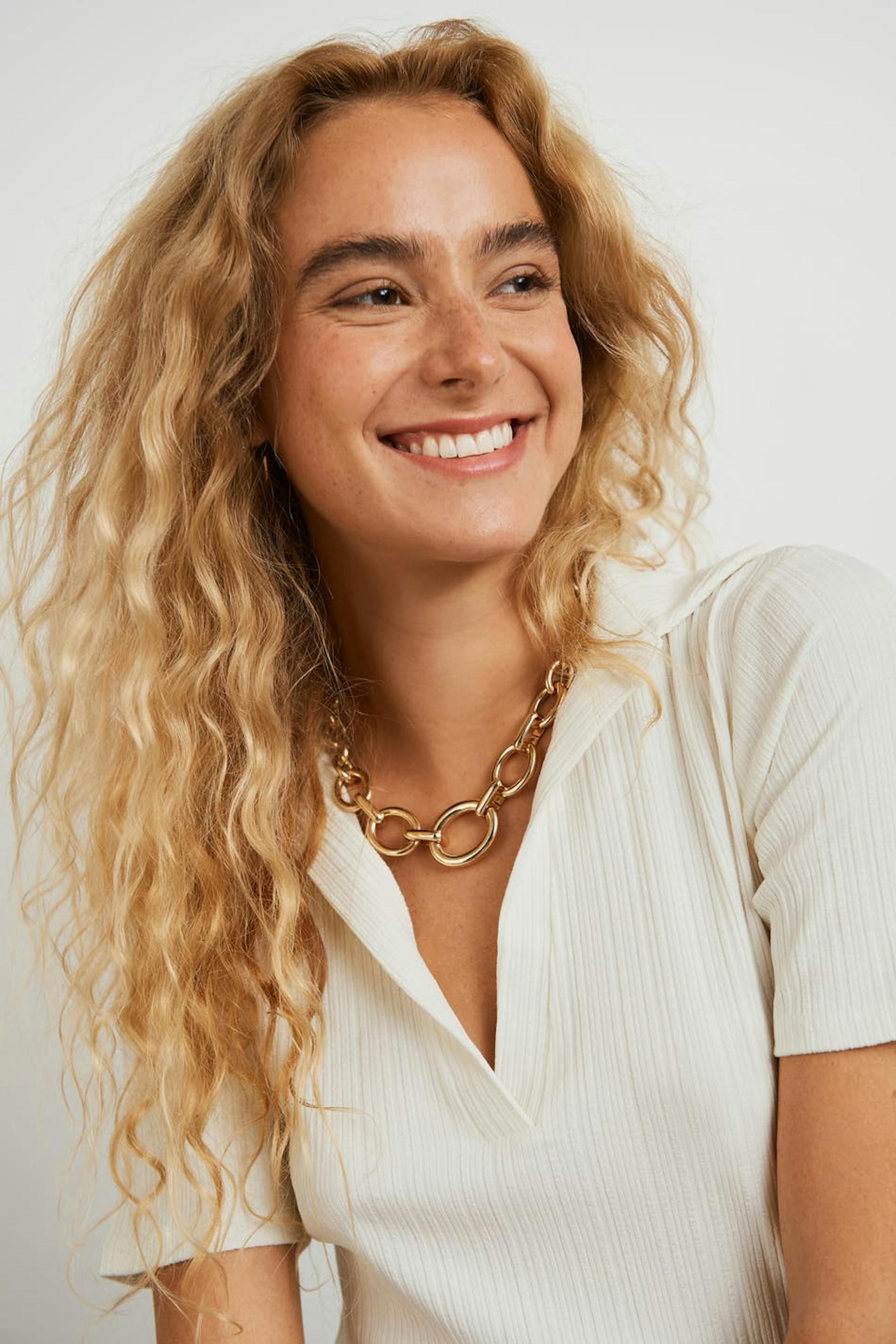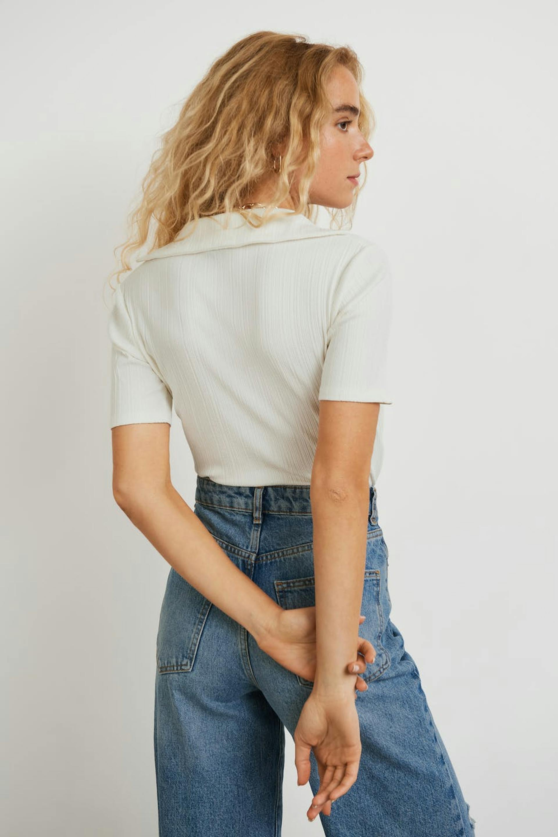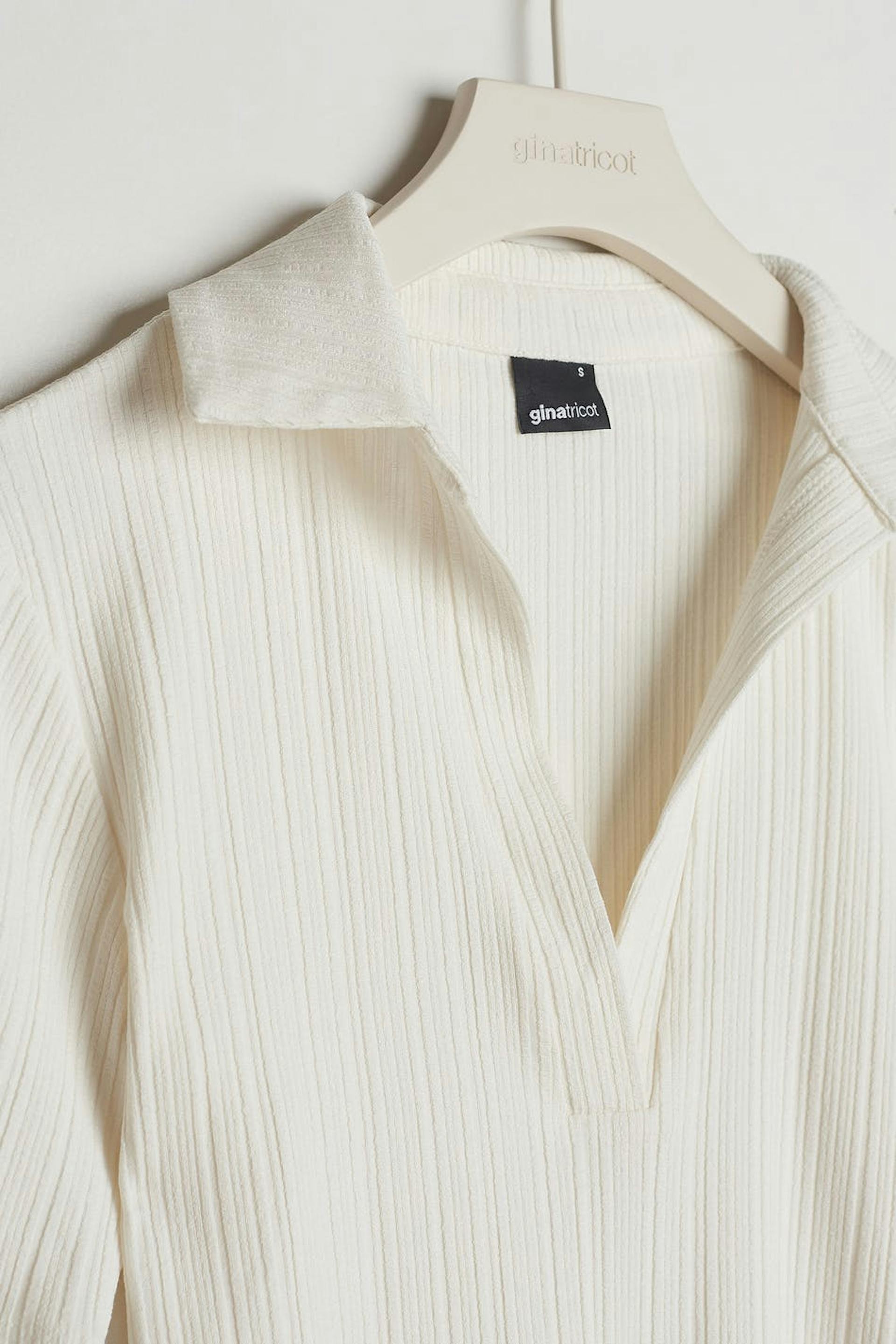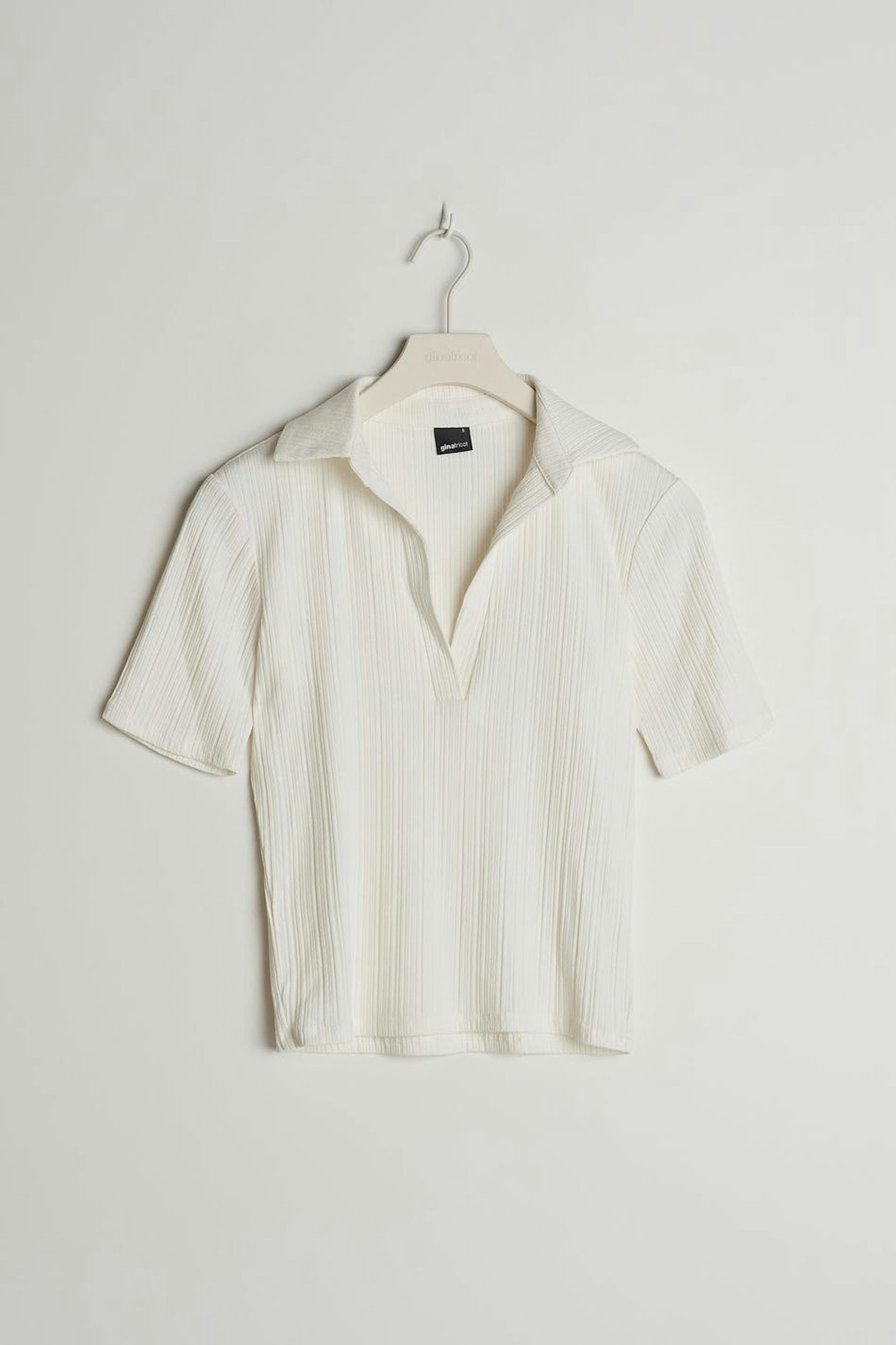 Top with a fitted fit. The top is white and has a V-neck. It has a collar and long t-shirt sleeves.