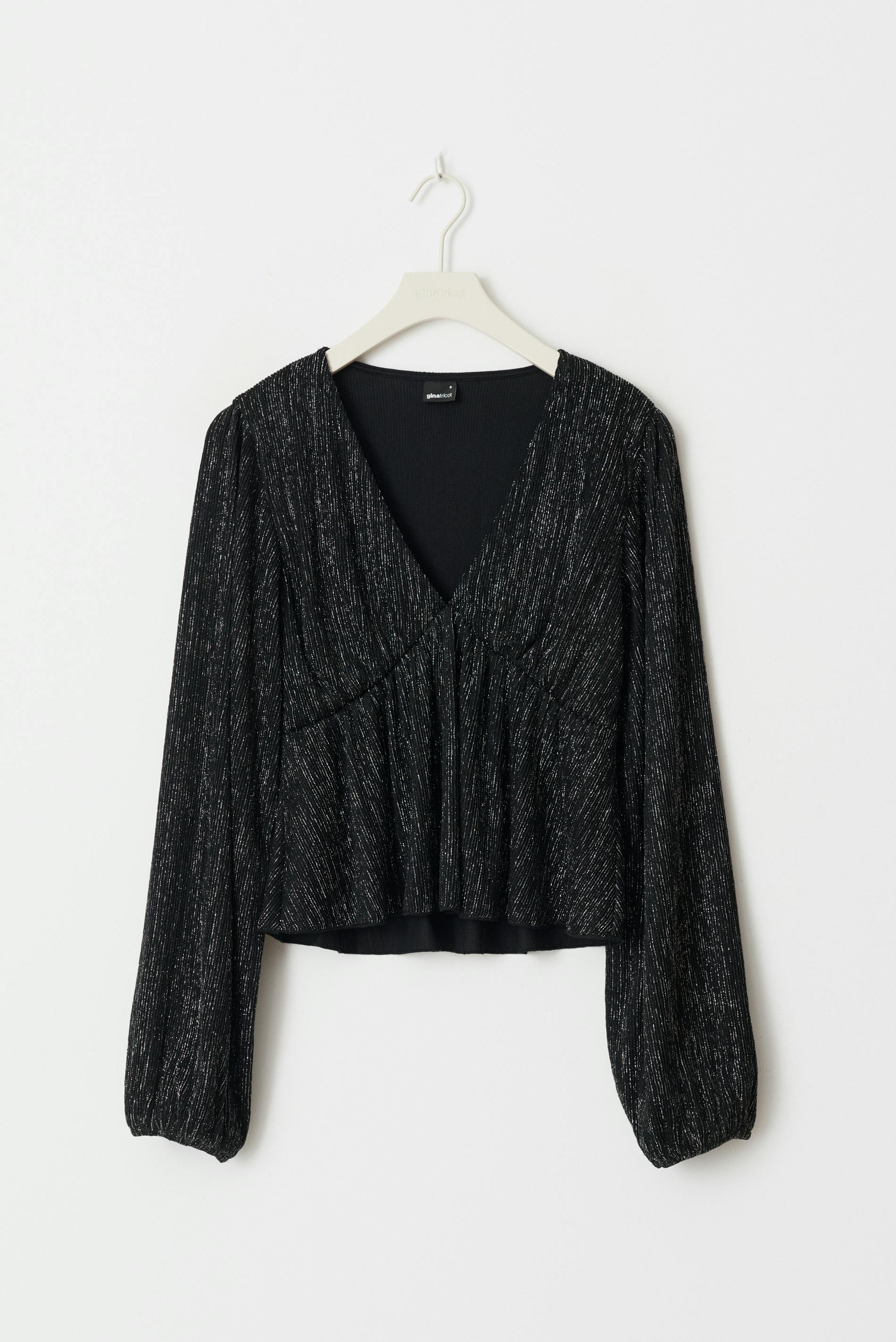 Glittery top with v-neck. The top is black and has balloon sleeves. It has elastic at the waist, pleated design, elasticized cuffs and regular length.