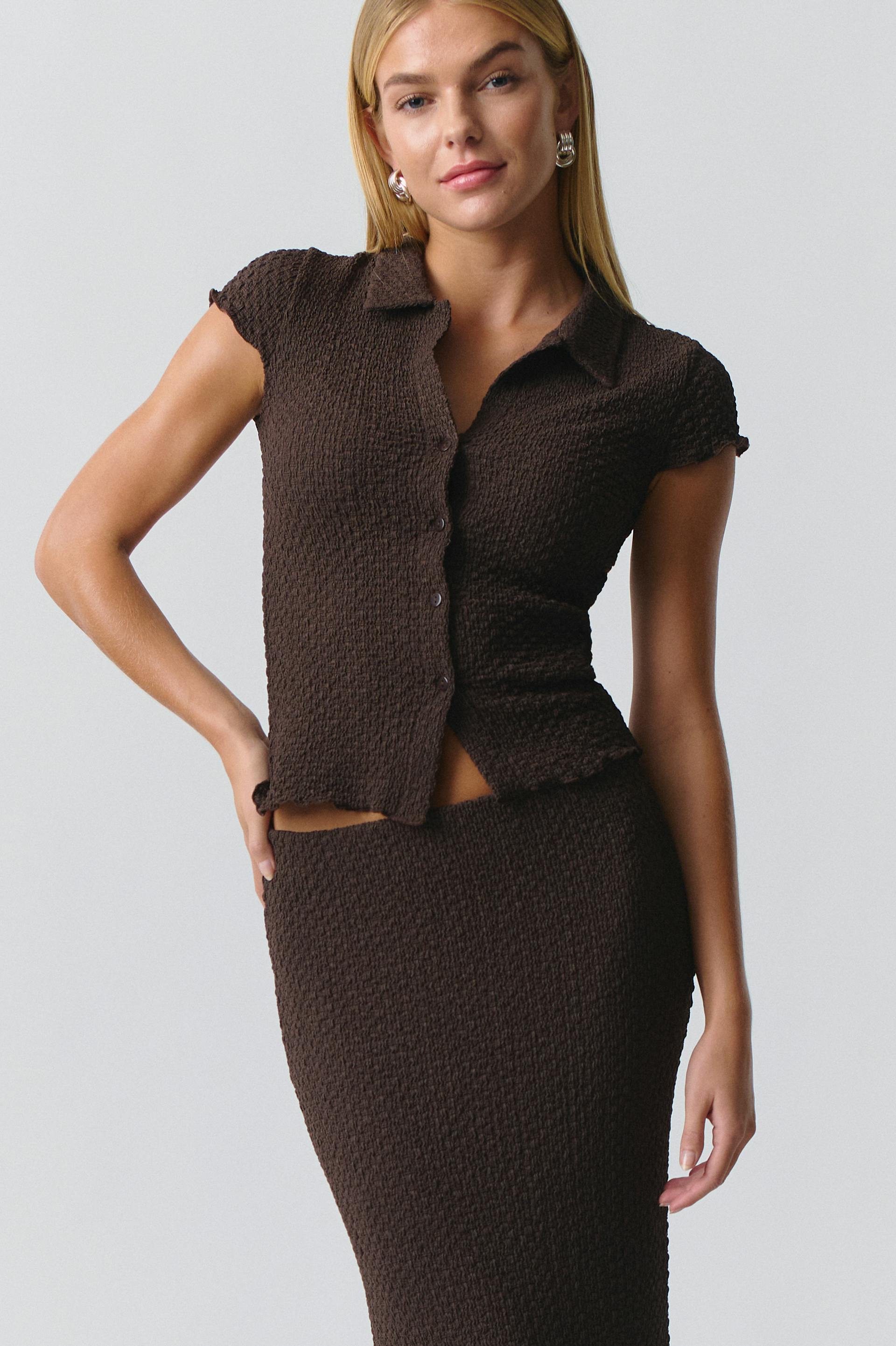 Short-sleeved top with buttons at the front. The top is brown and has structured material. It has regular fit, collar, v-neck, cap sleeve and overlocked hem.
