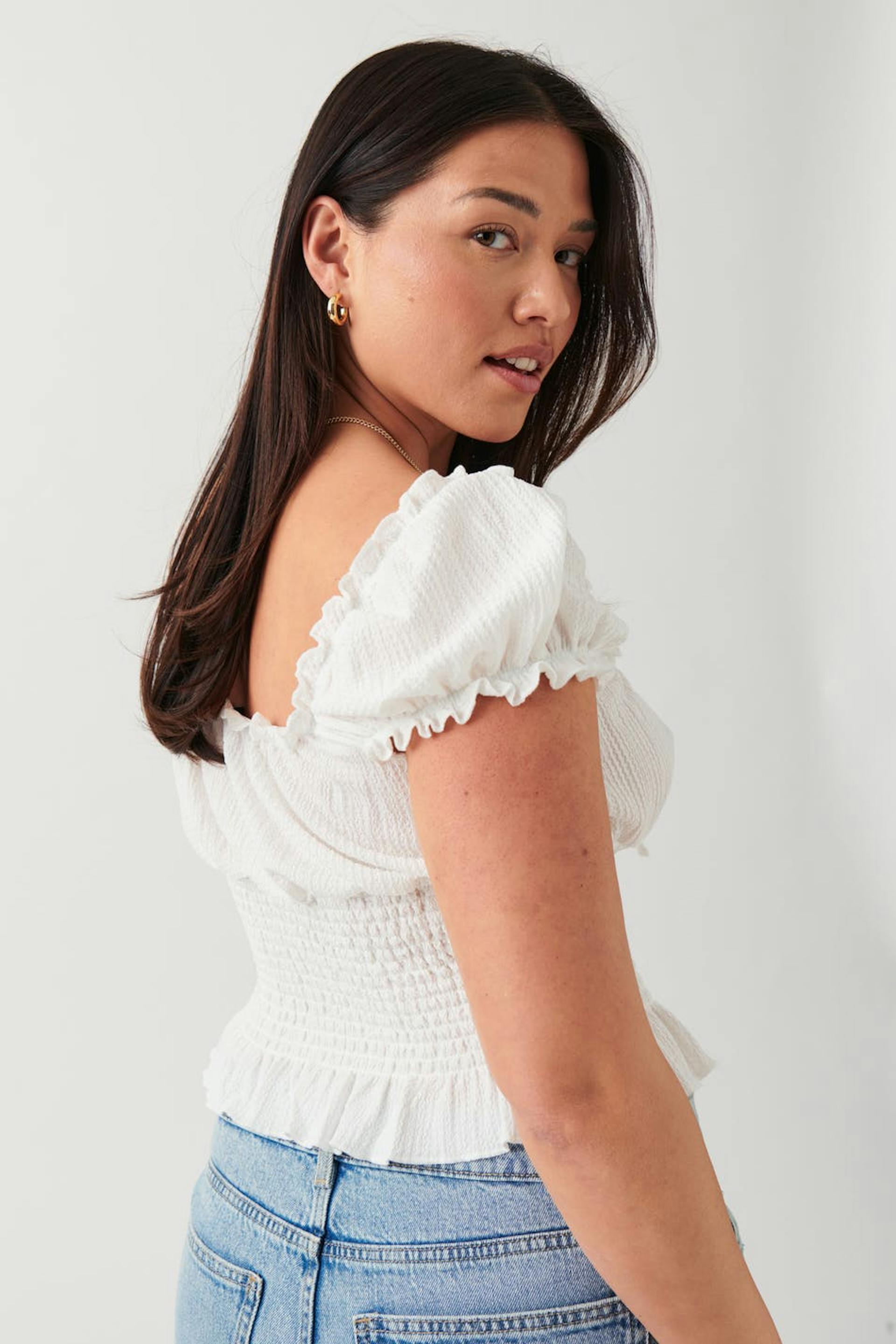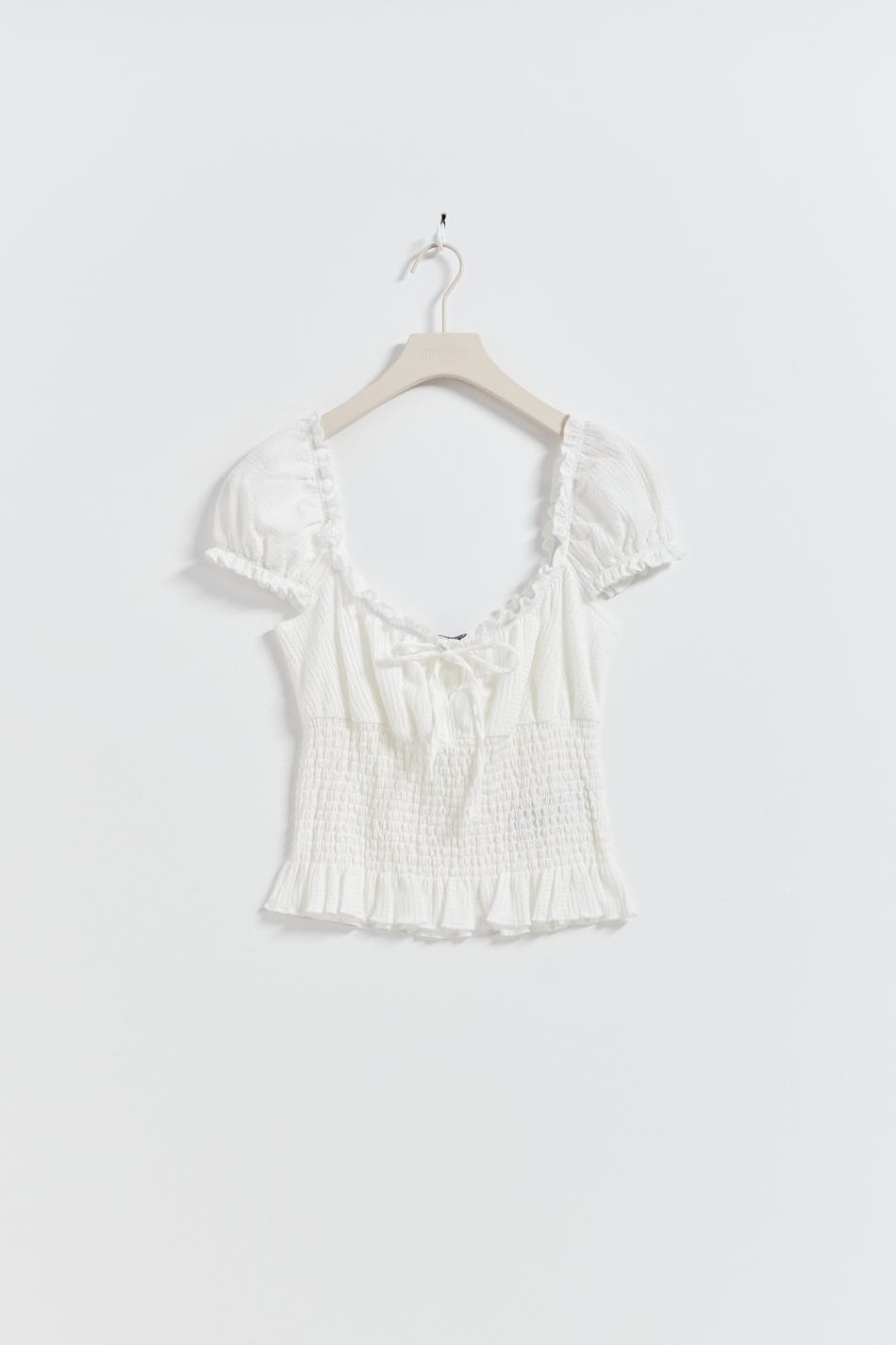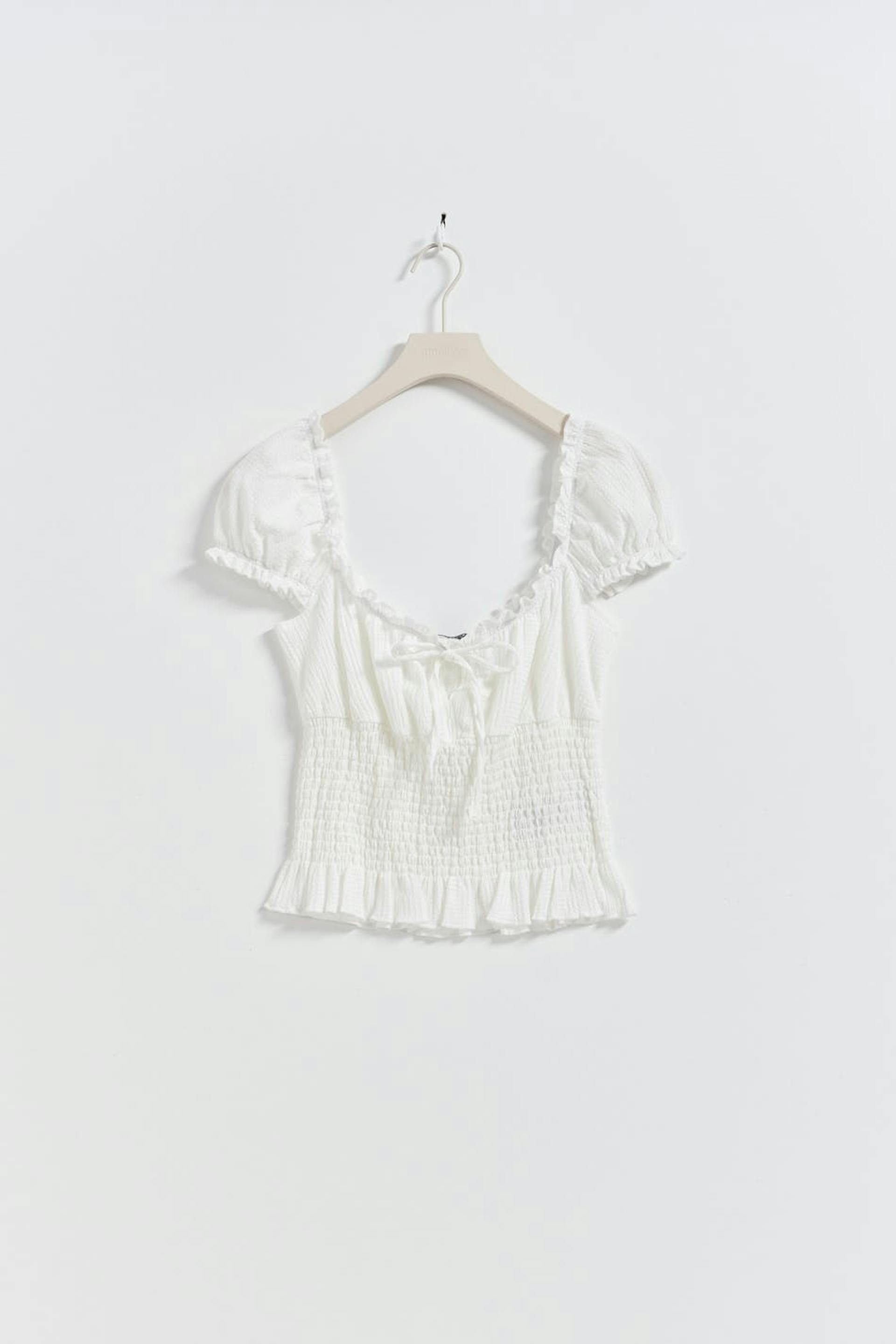 Top with a regular fit. The top is white and has puff sleeves with an off shoulder look and a slit at the front with a self-tie. It has a smocking at the waist with ruffled edges.