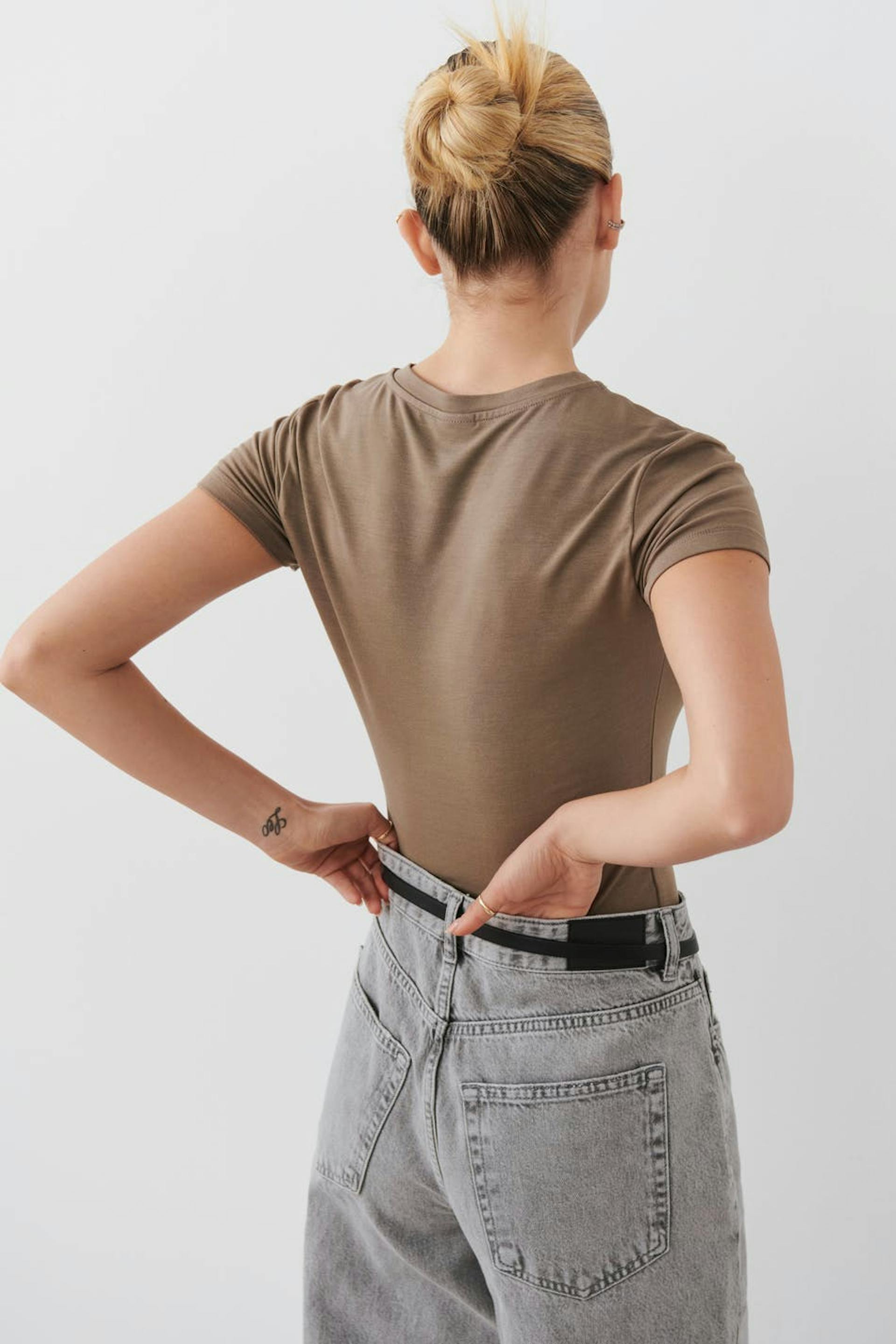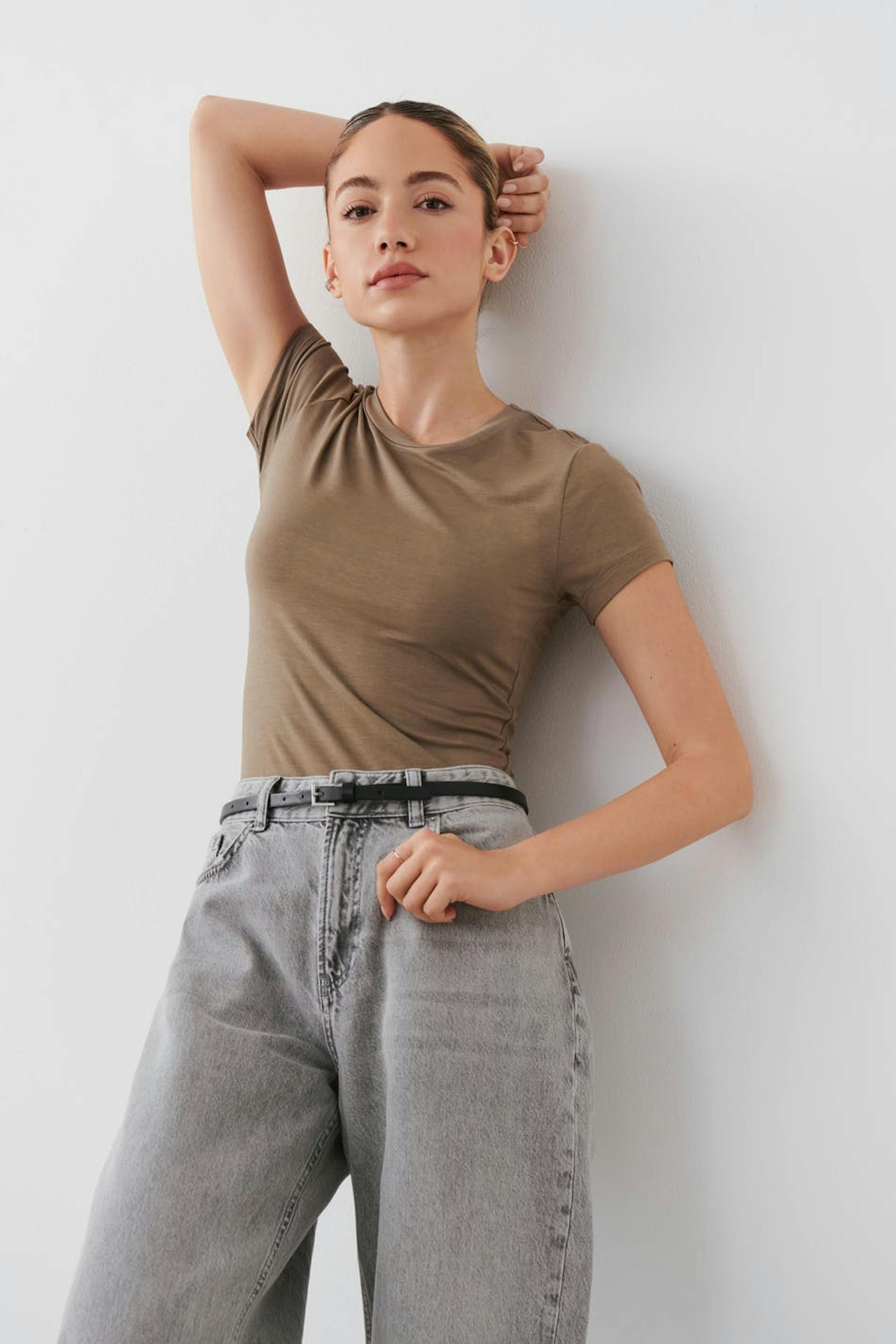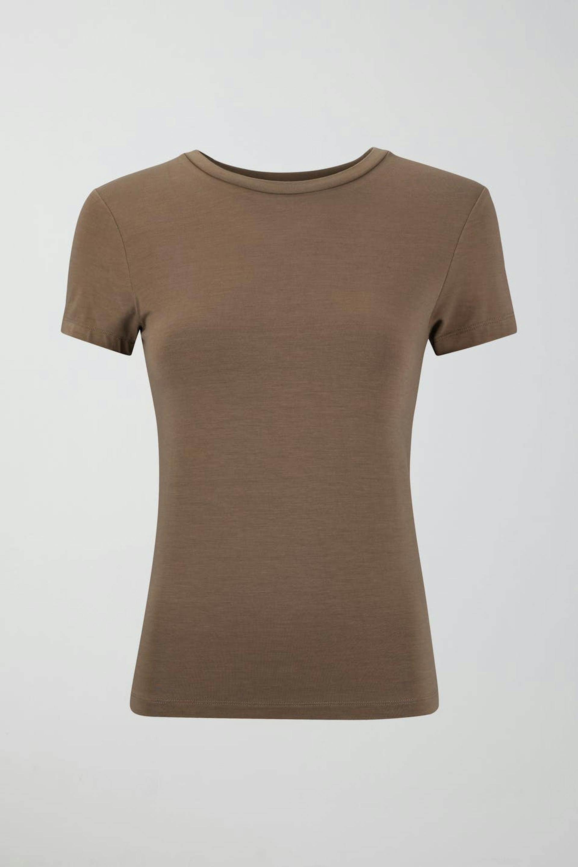 Soft touch – second skin comfort. Figure-fit top with crew-neck. The top is brown and has short sleeves.