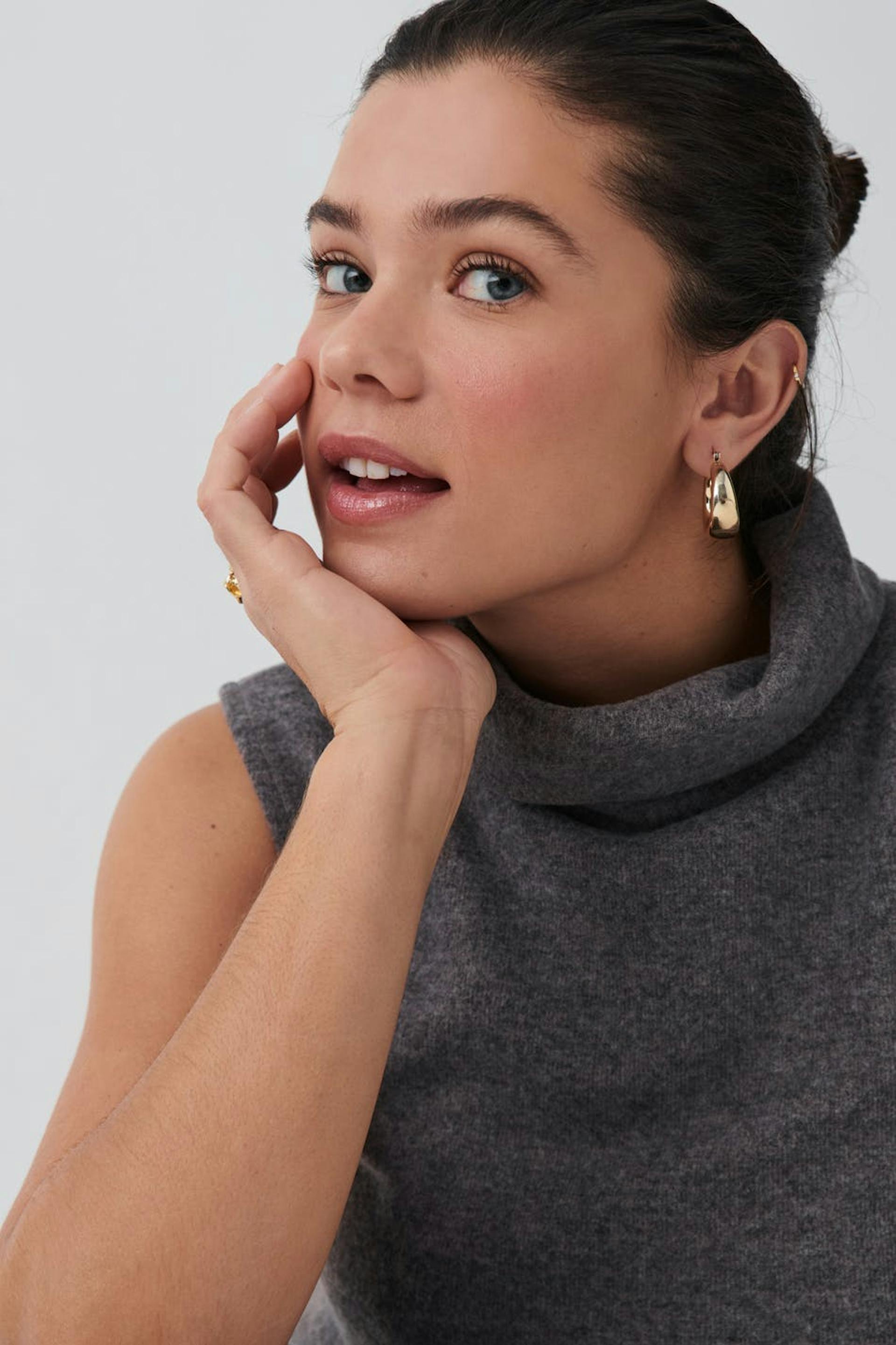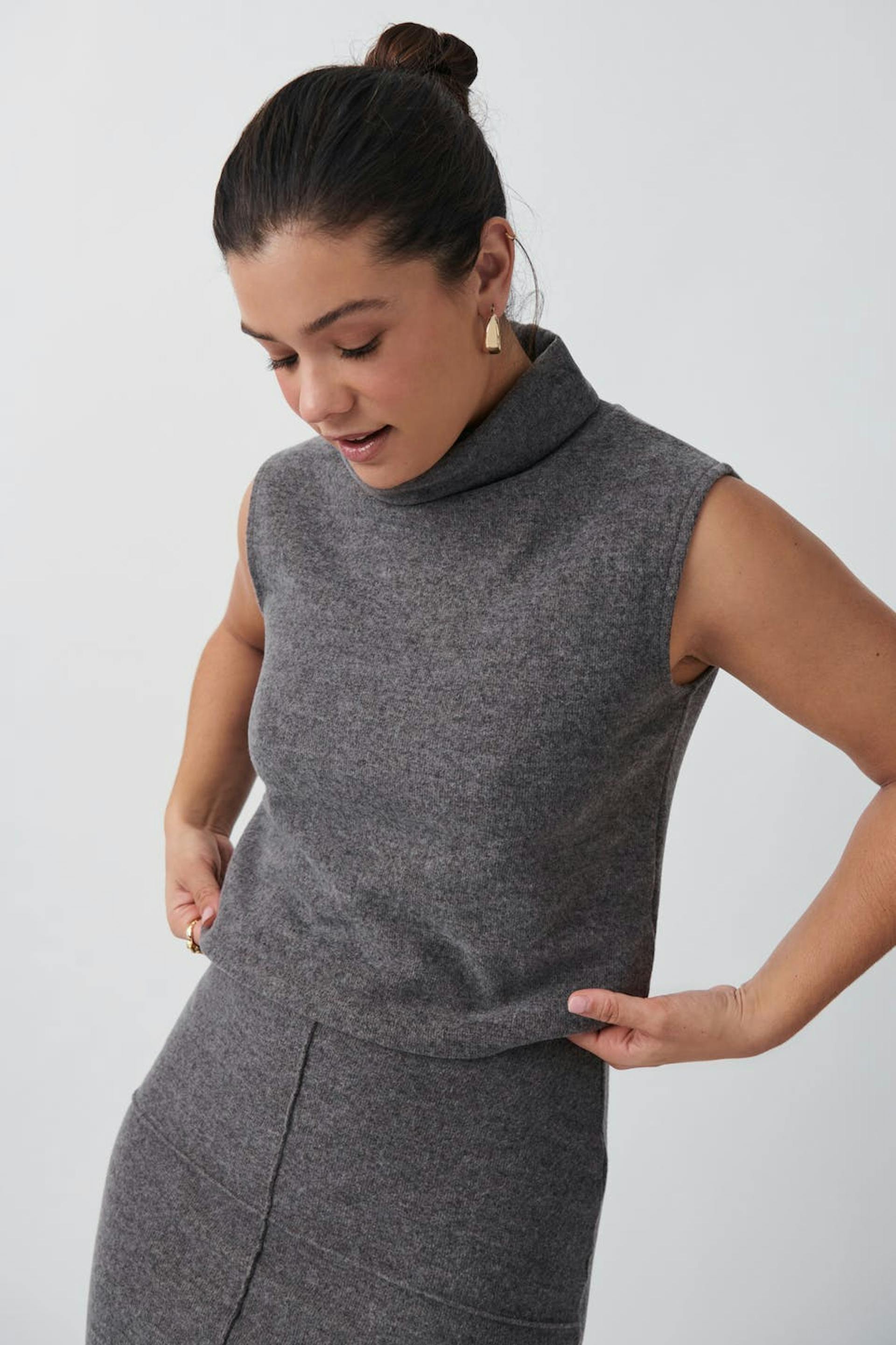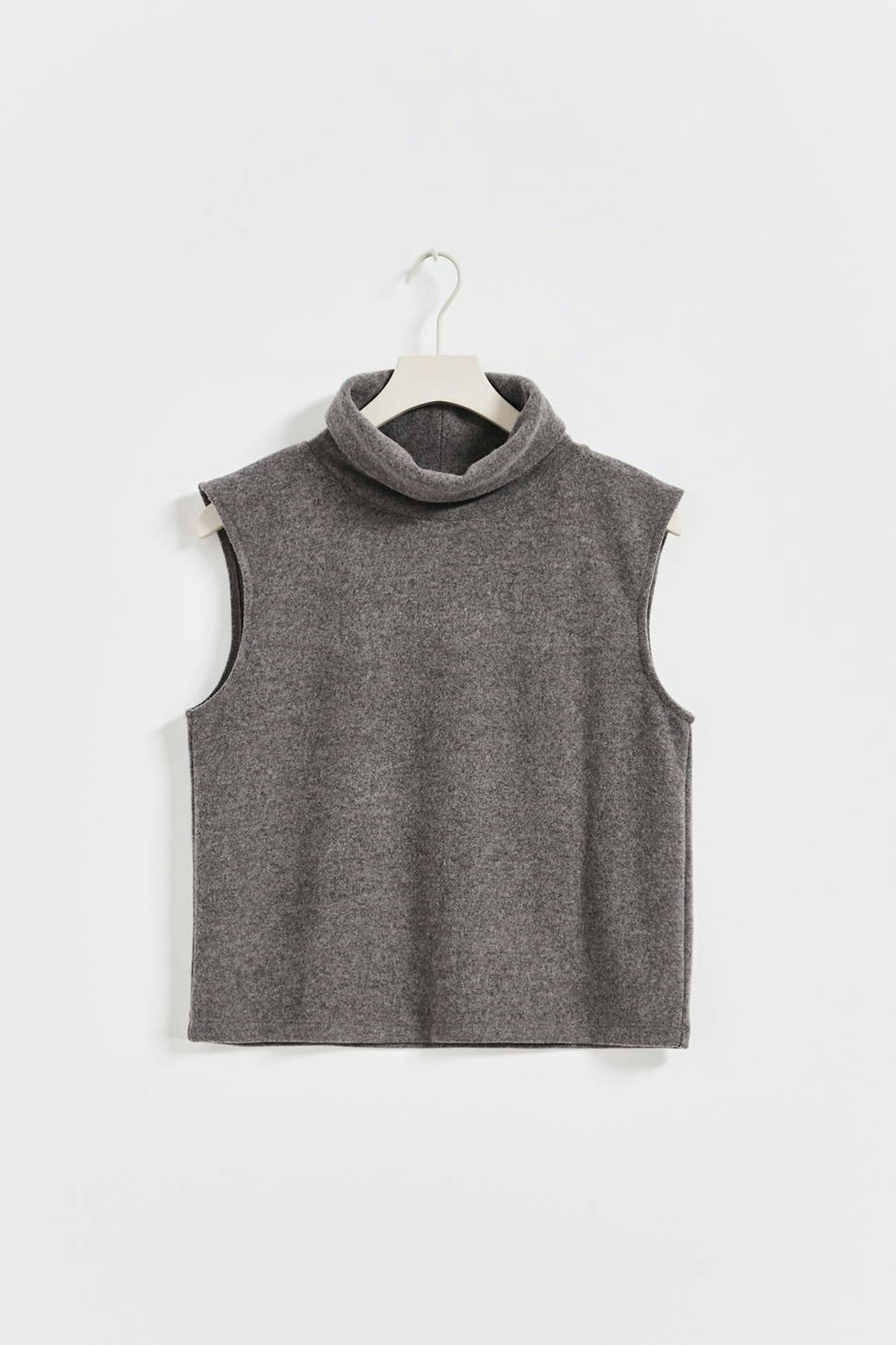Sleeveless top with polo-neck. The top is grey and has loose-fitting style. It has soft, ribbed quality and short length.