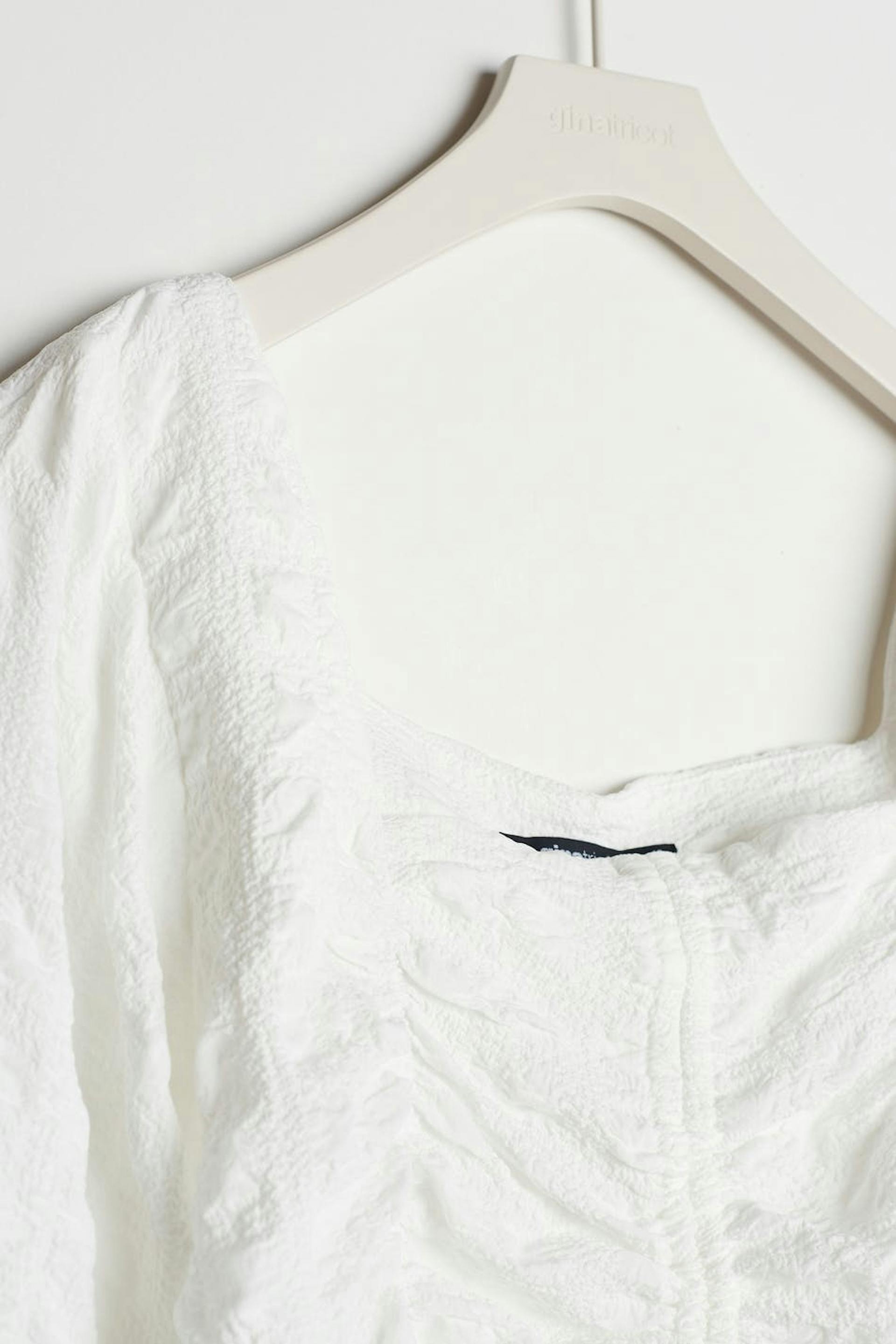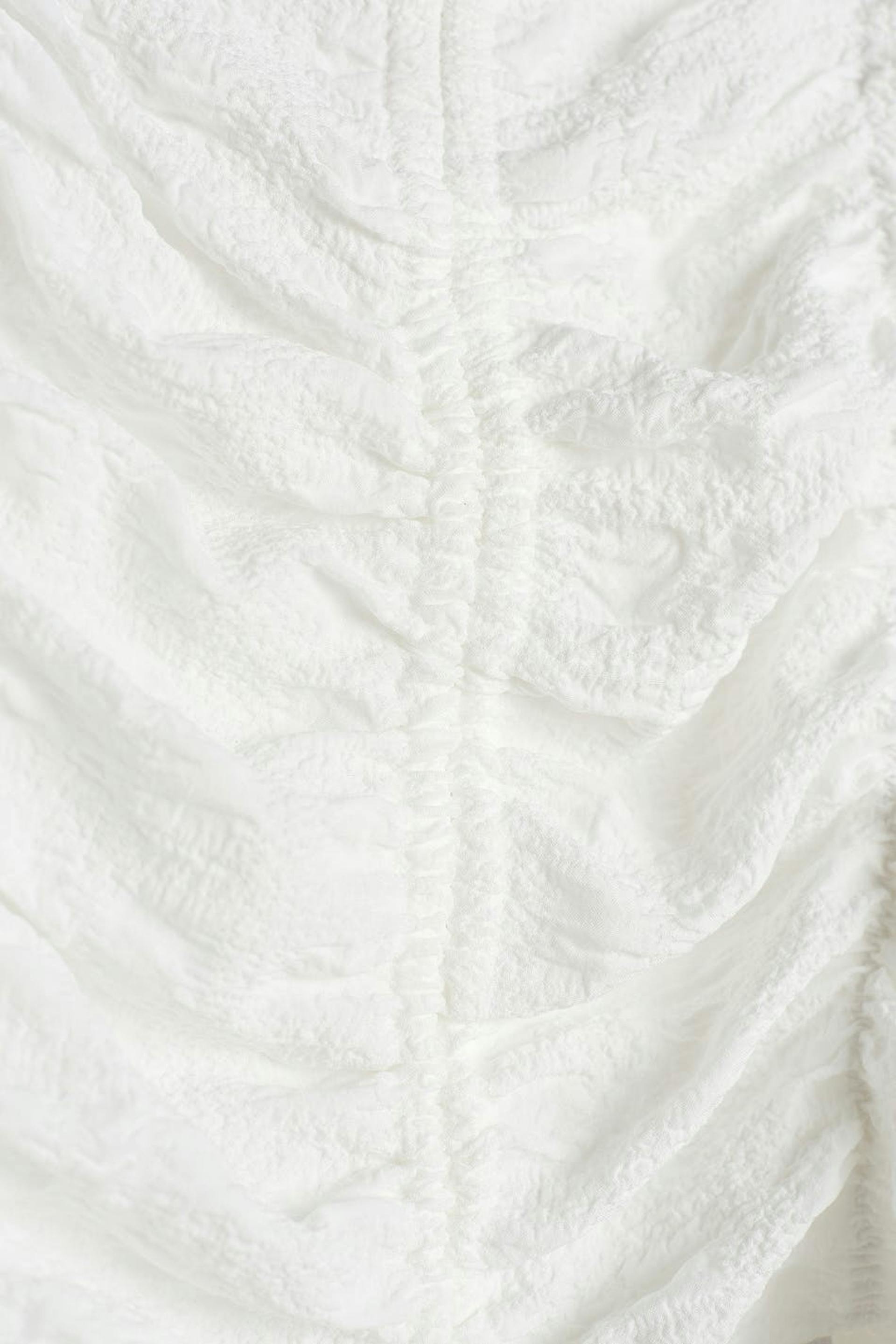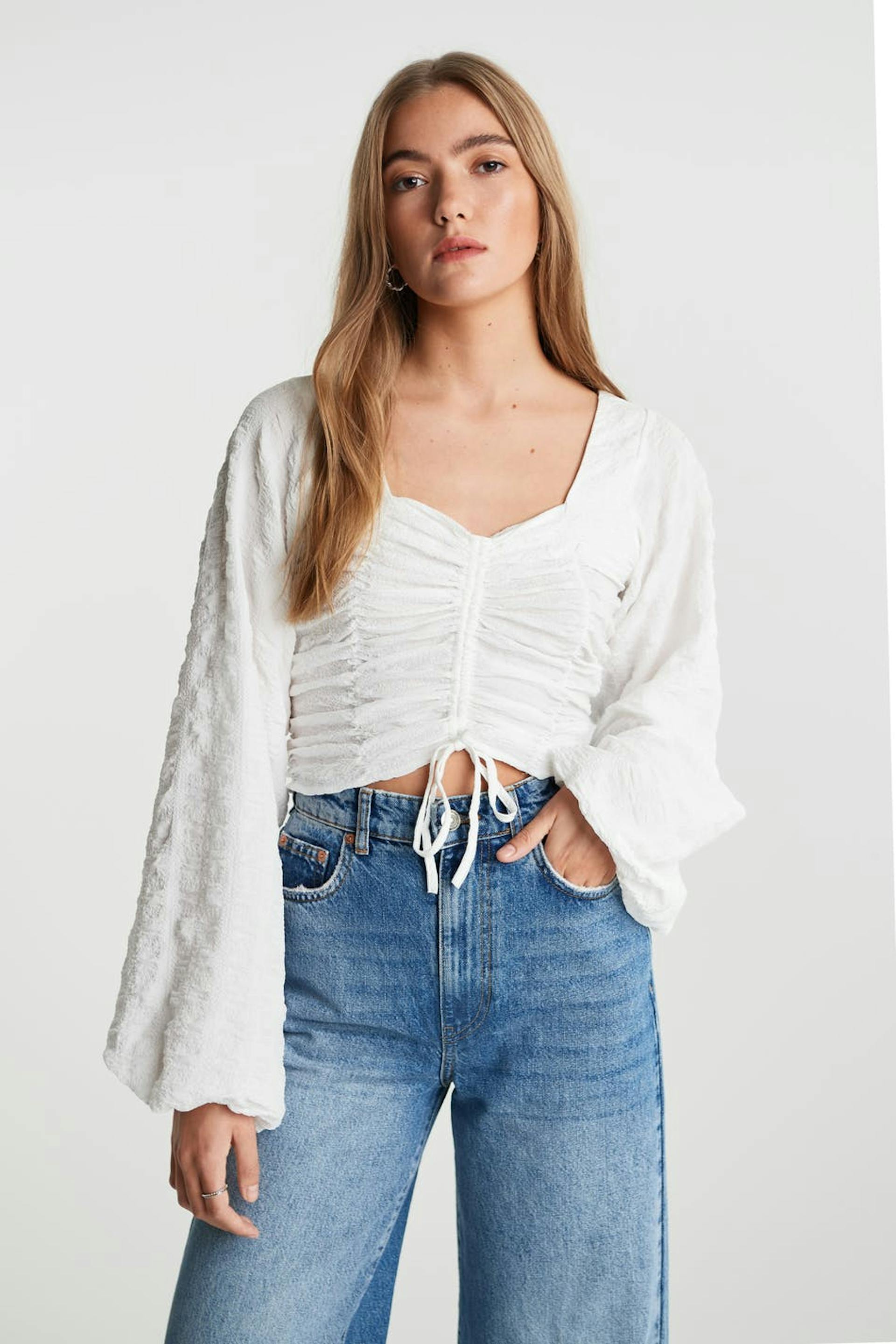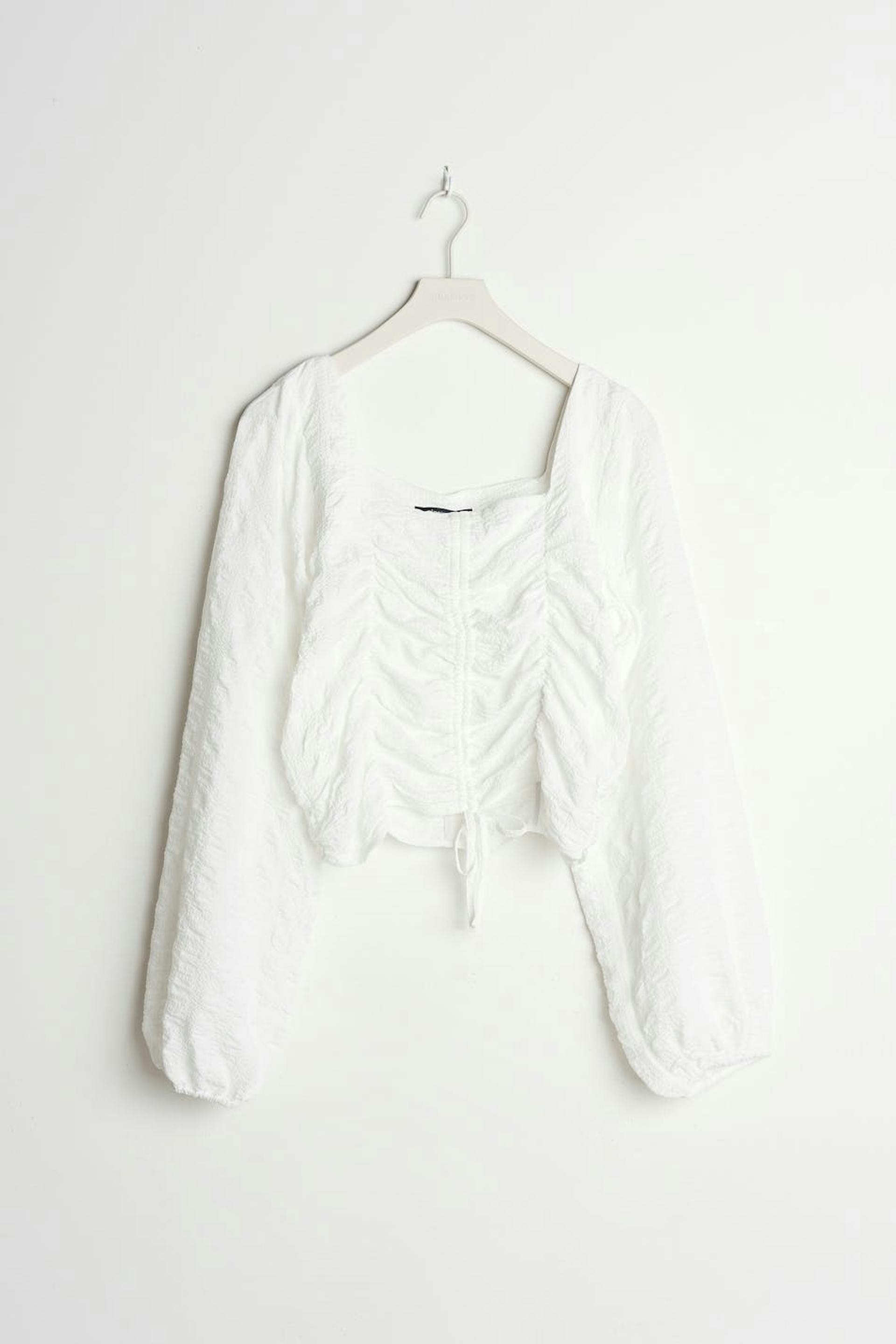 Short top with ruching at the torso. The top is white and has a drawstring at the front. It has a textured material, a sweetheart neckline and long, voluminous sleeves.