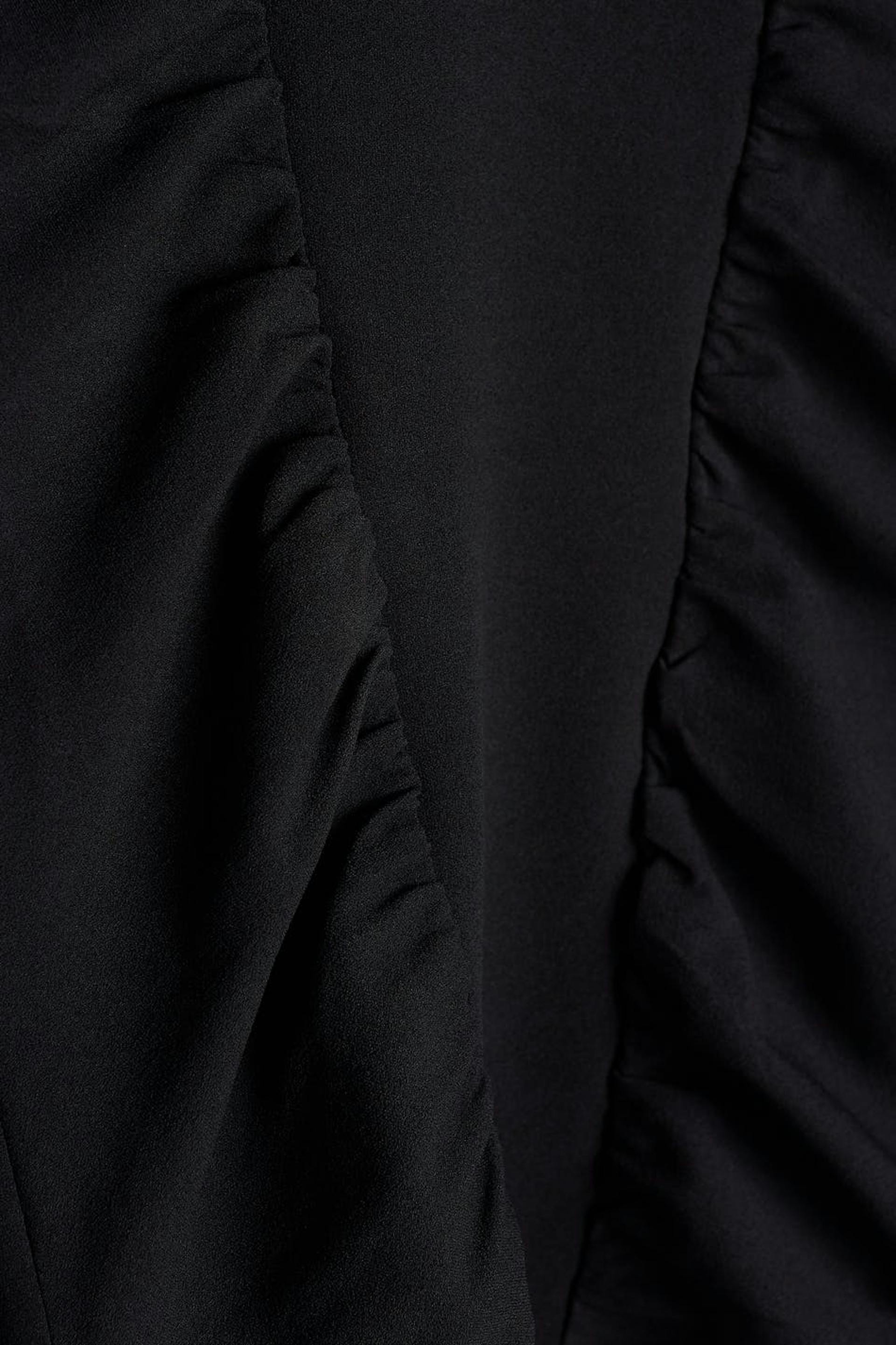 Long-sleeved top with a fitted fit. The top is black and has a crew neckline. It has ruching on the sides and along both sleeves.