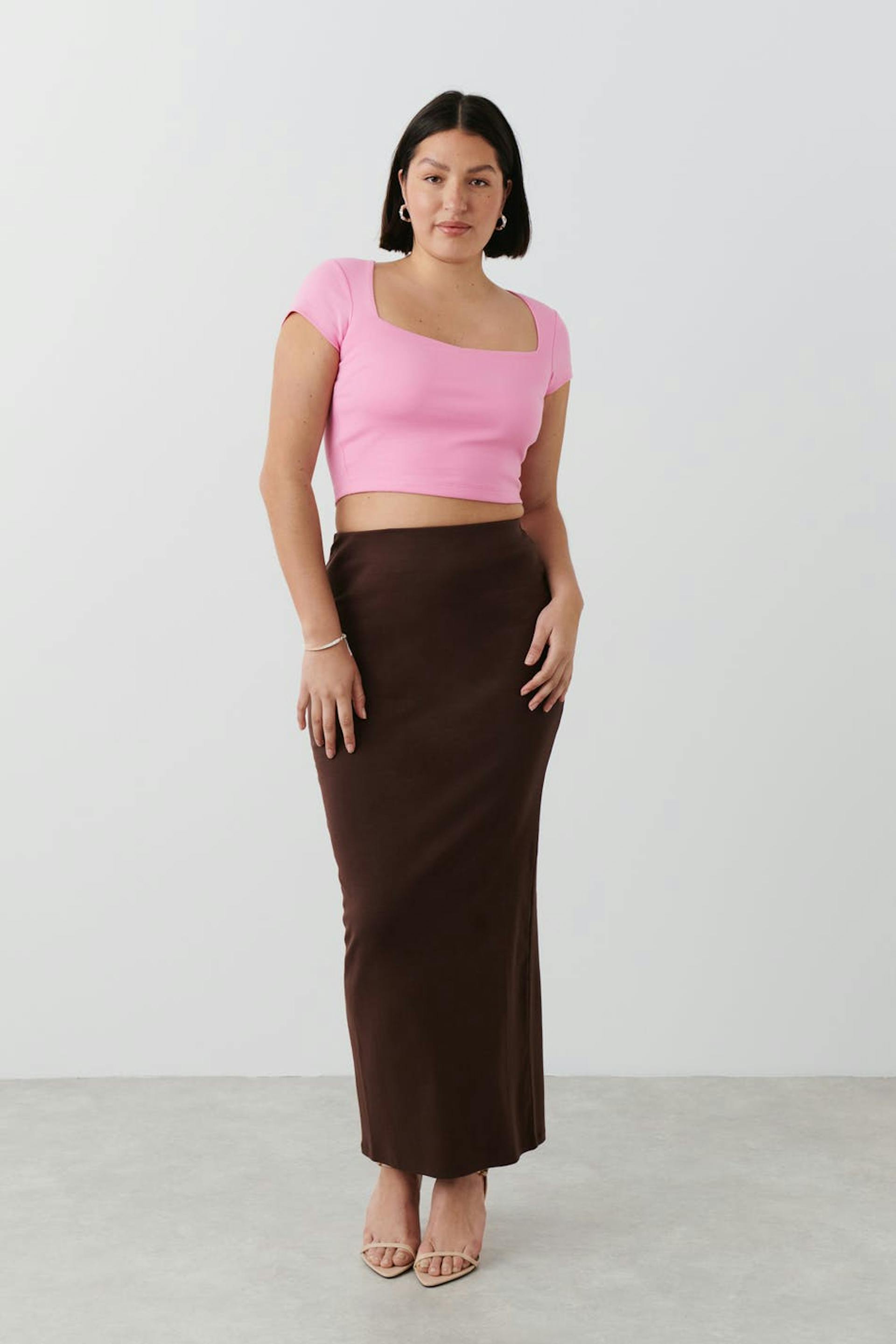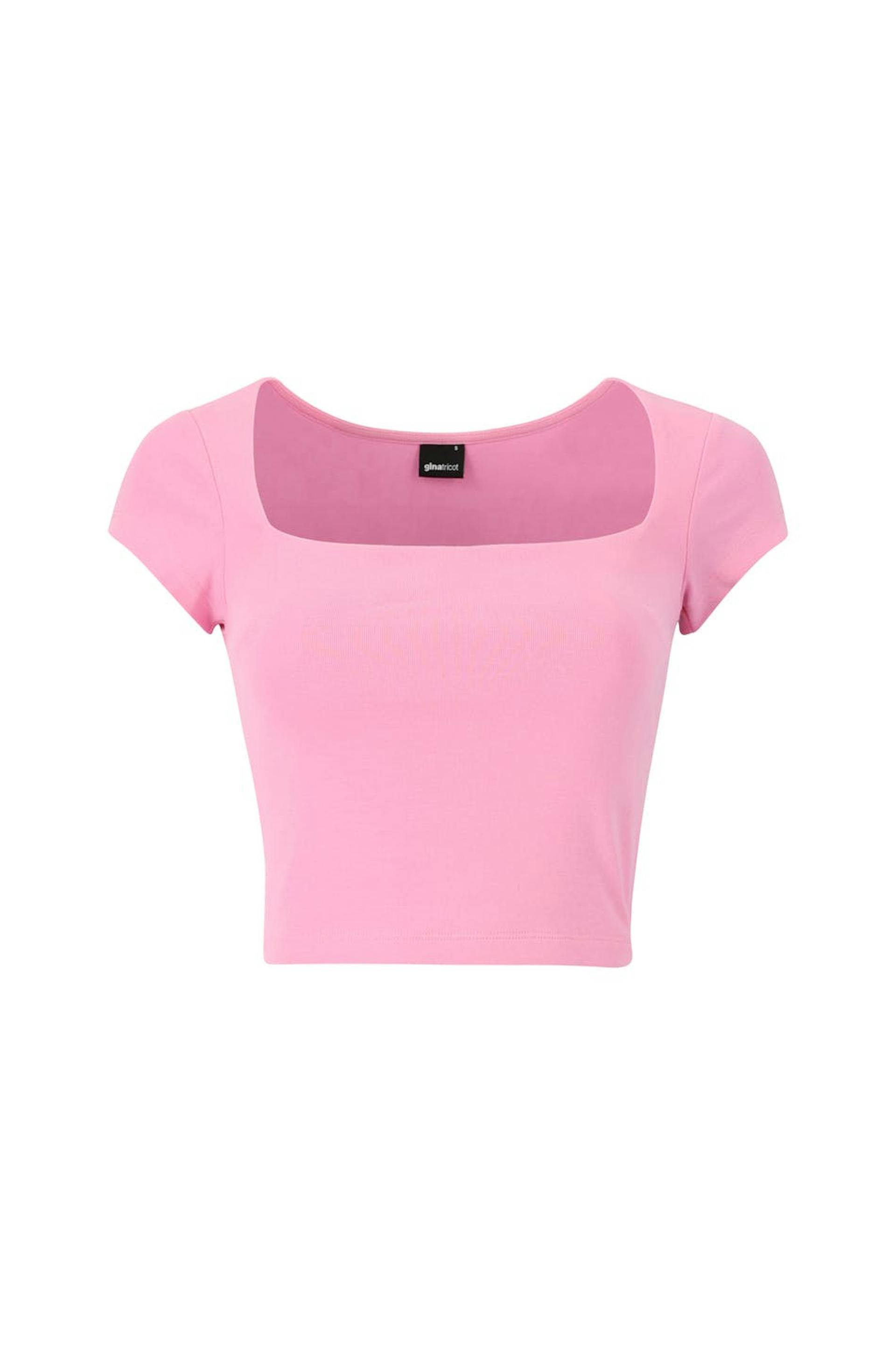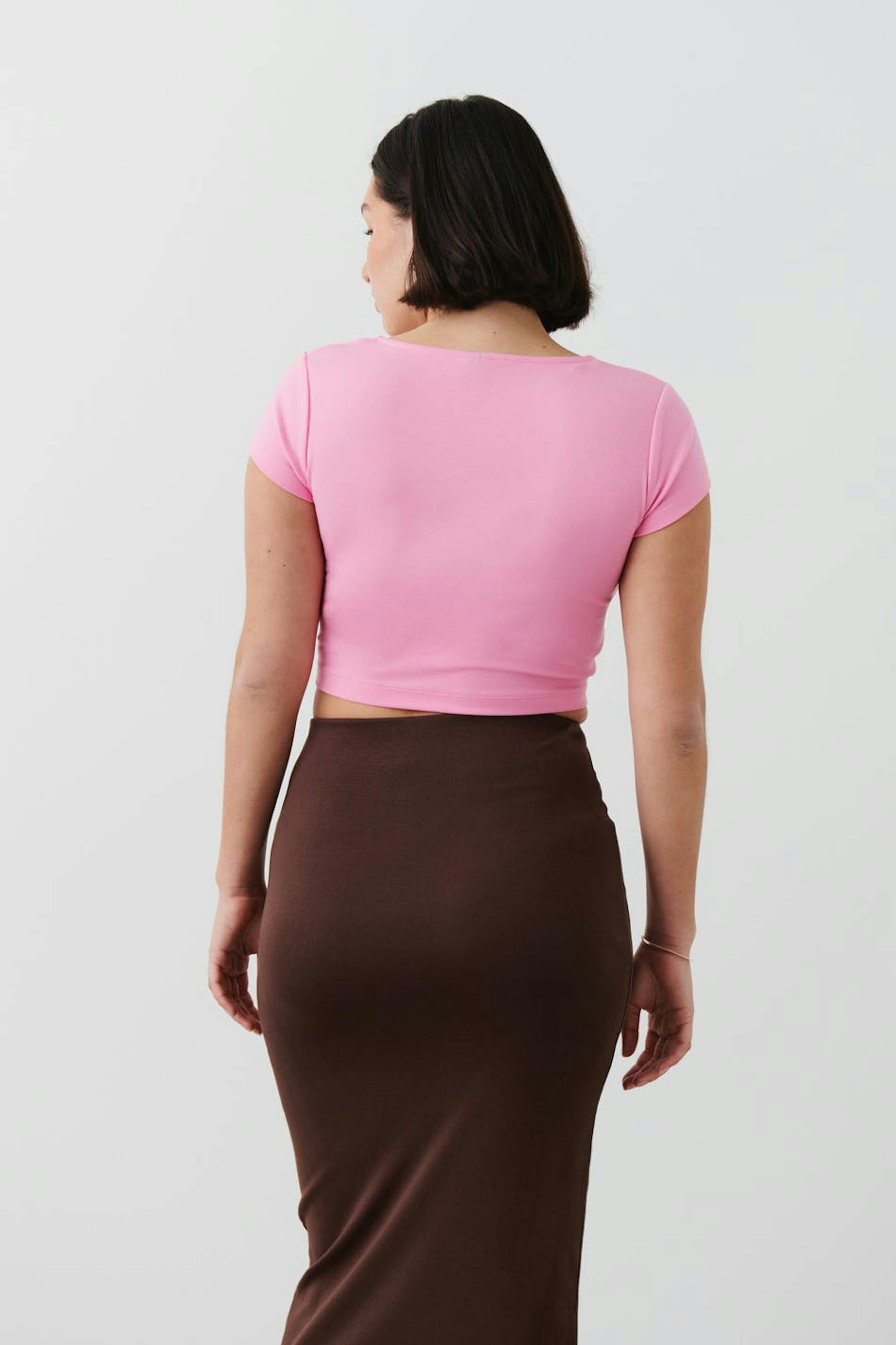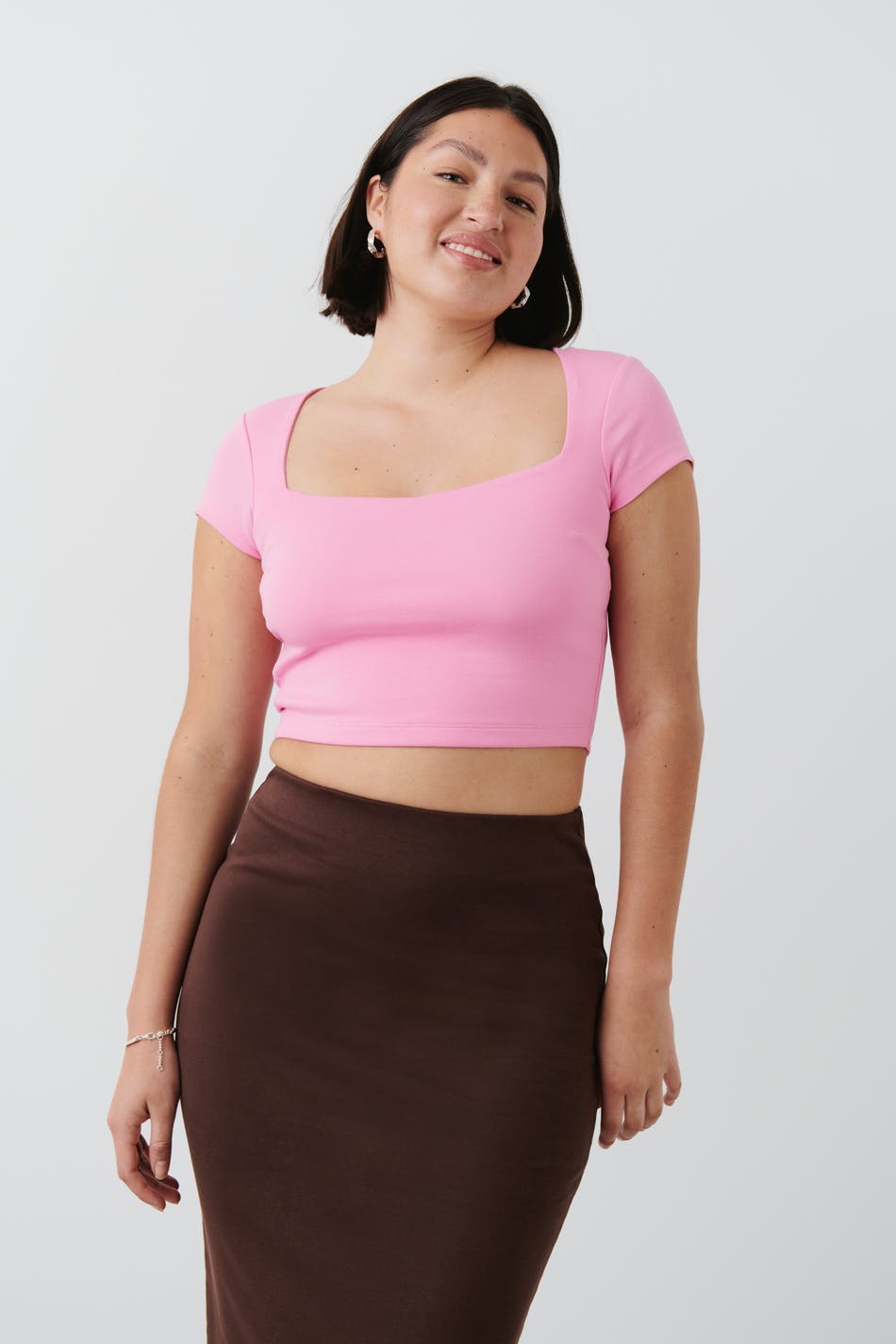Short-sleeved top in jersey with square neckline. The top is pink and has figure-hugging fit. It has cropped length and lining at the front.