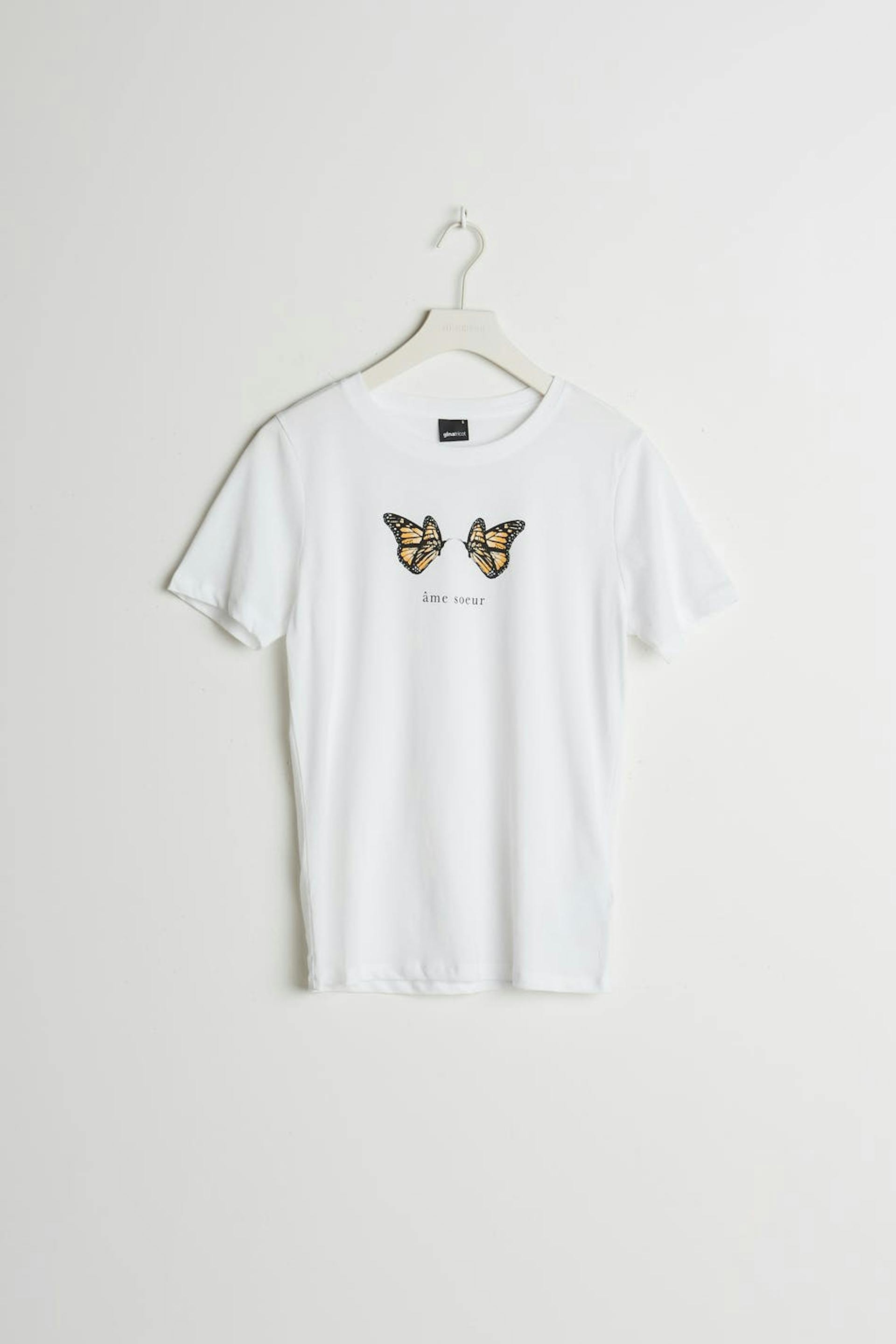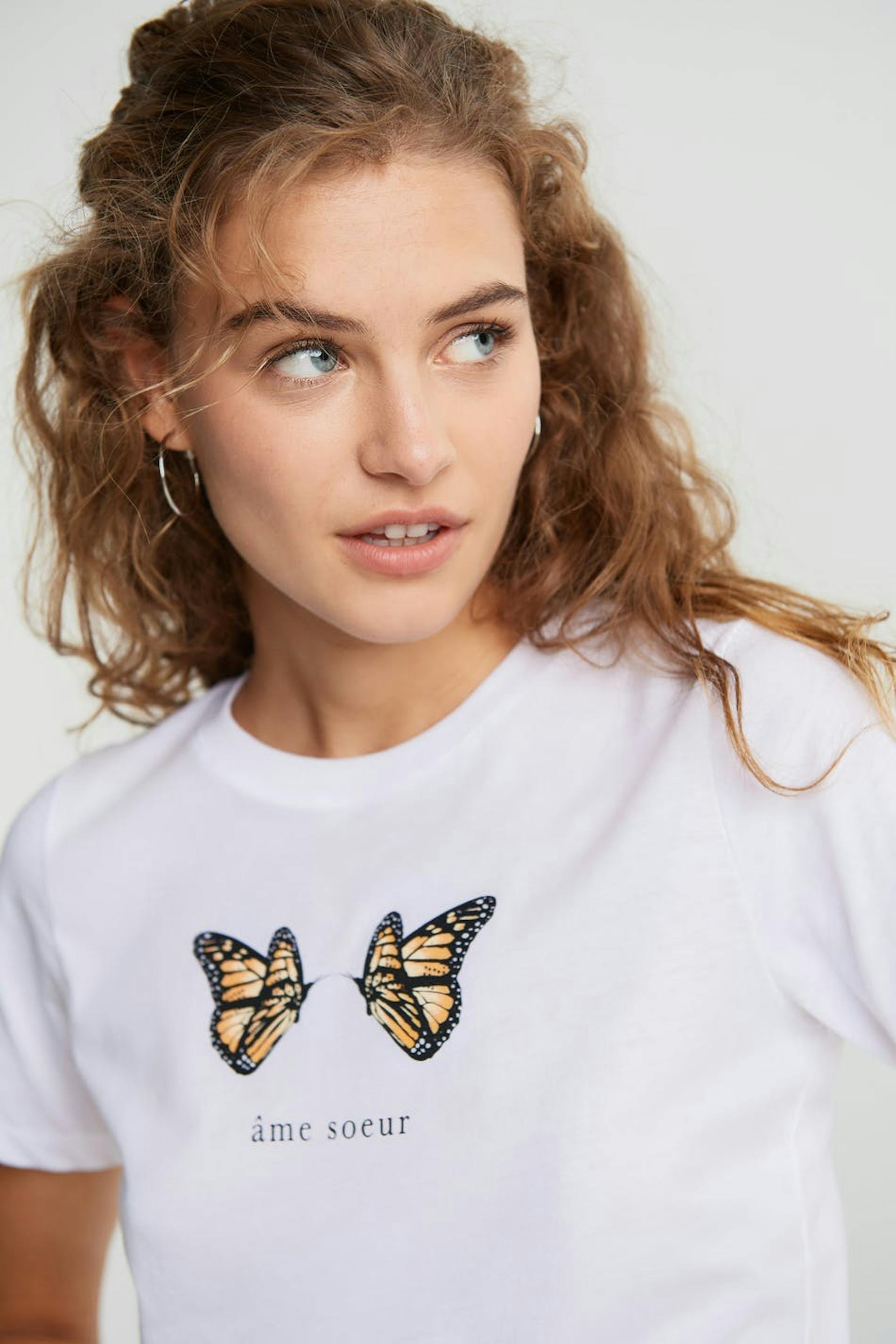 Top with a regular fit. The top is white and has a crew neckline. It has a slim ribbed cuff.