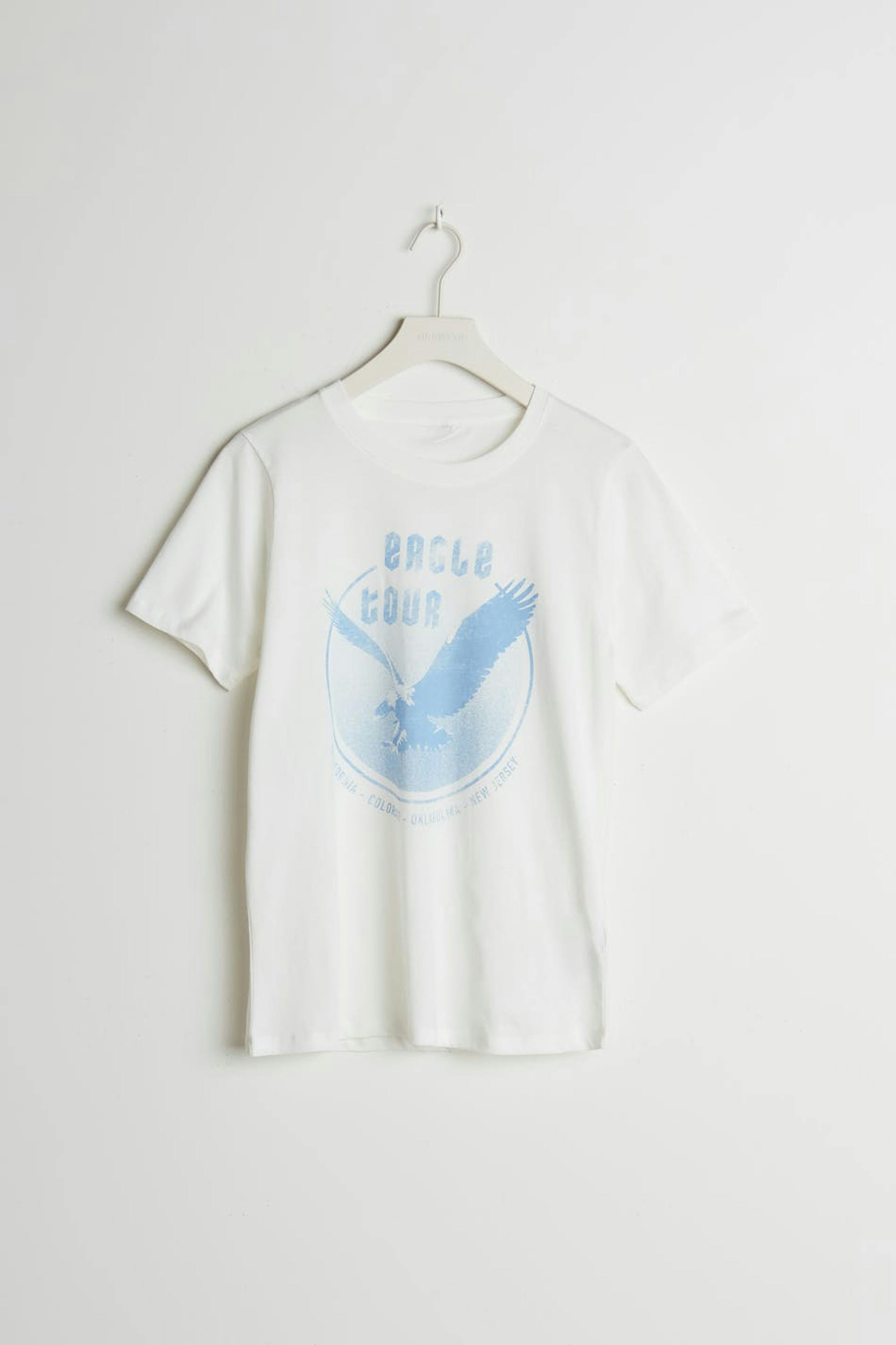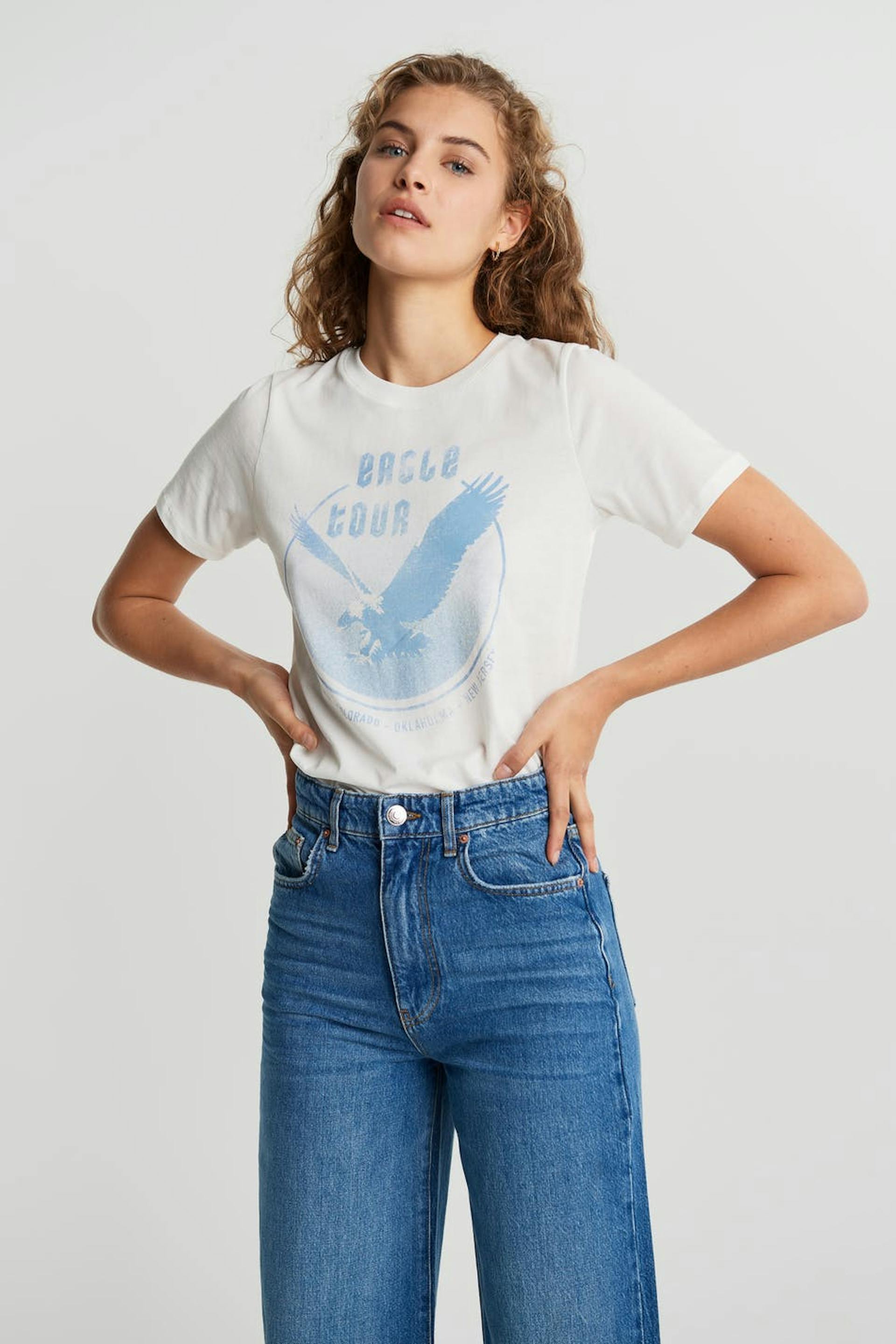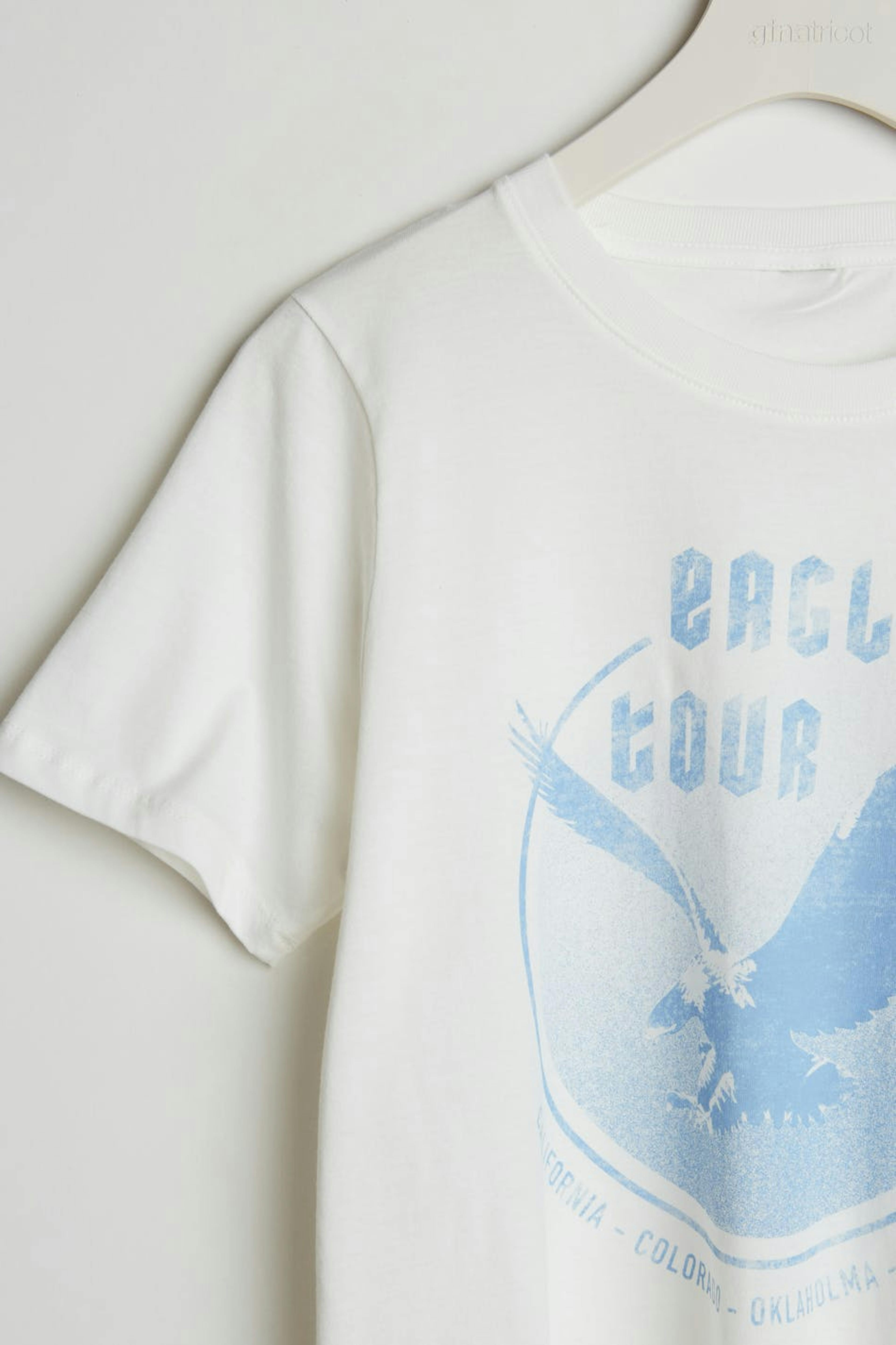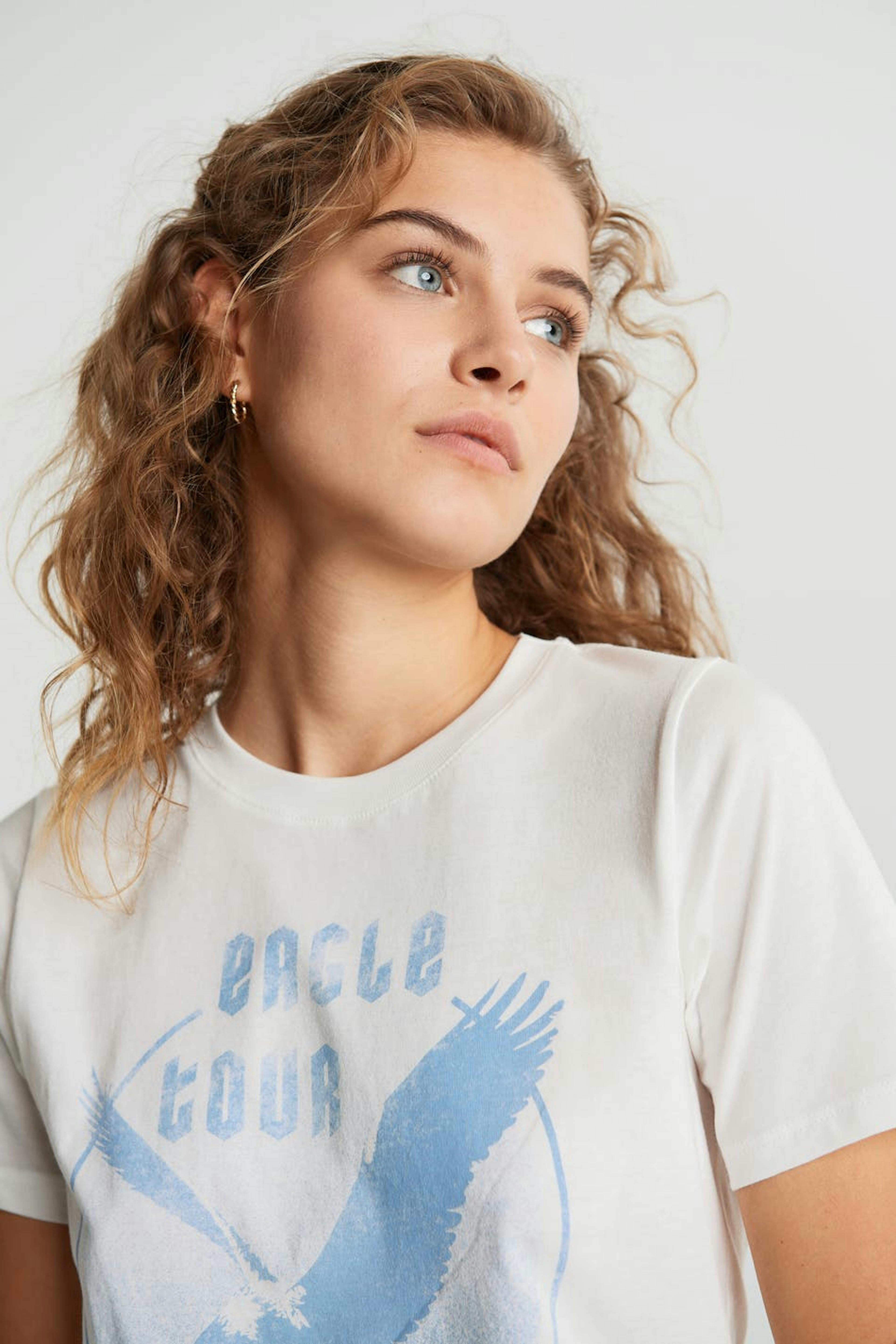 Top with a regular fit. The top is white and has a crew neckline. It has a slim ribbed cuff.