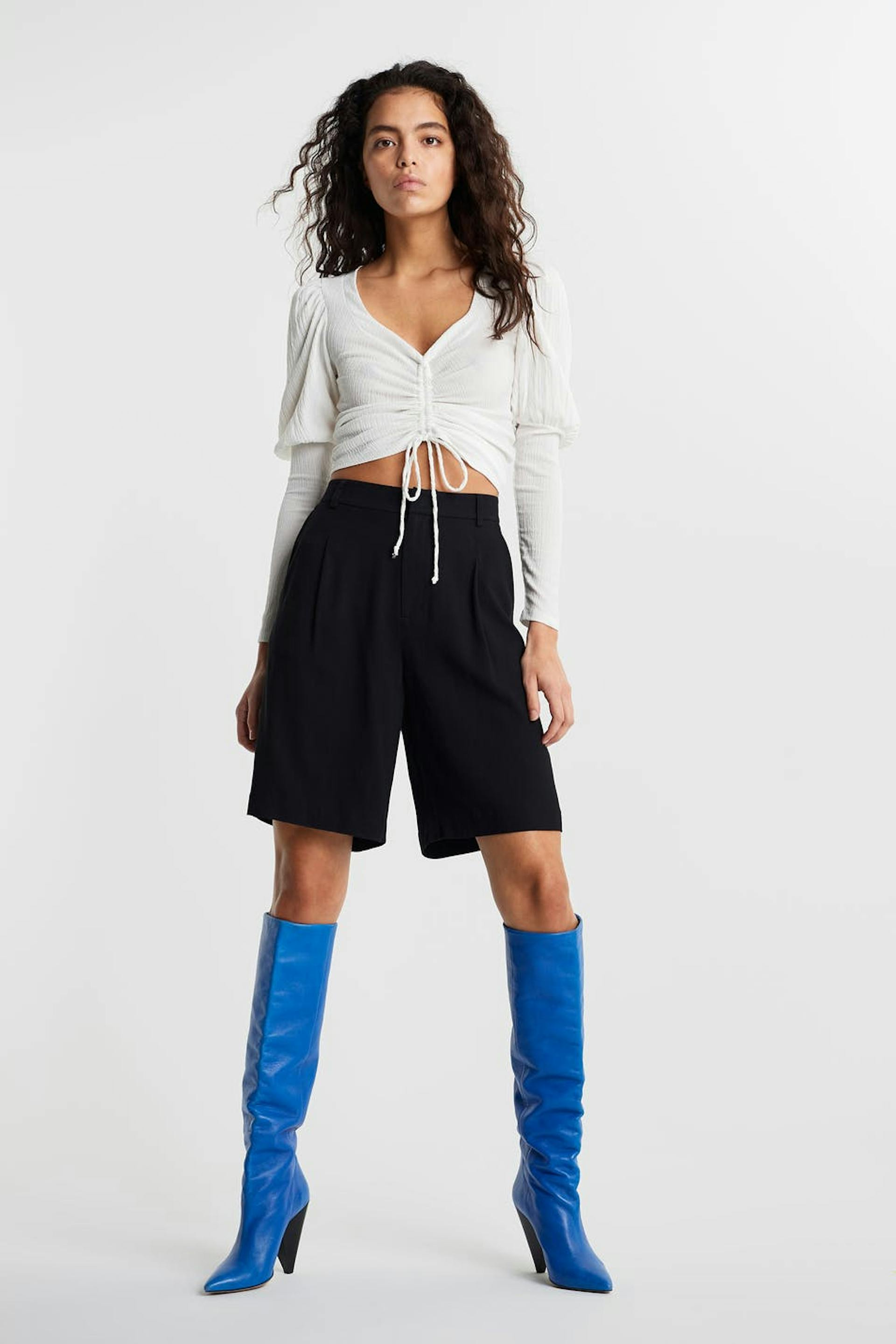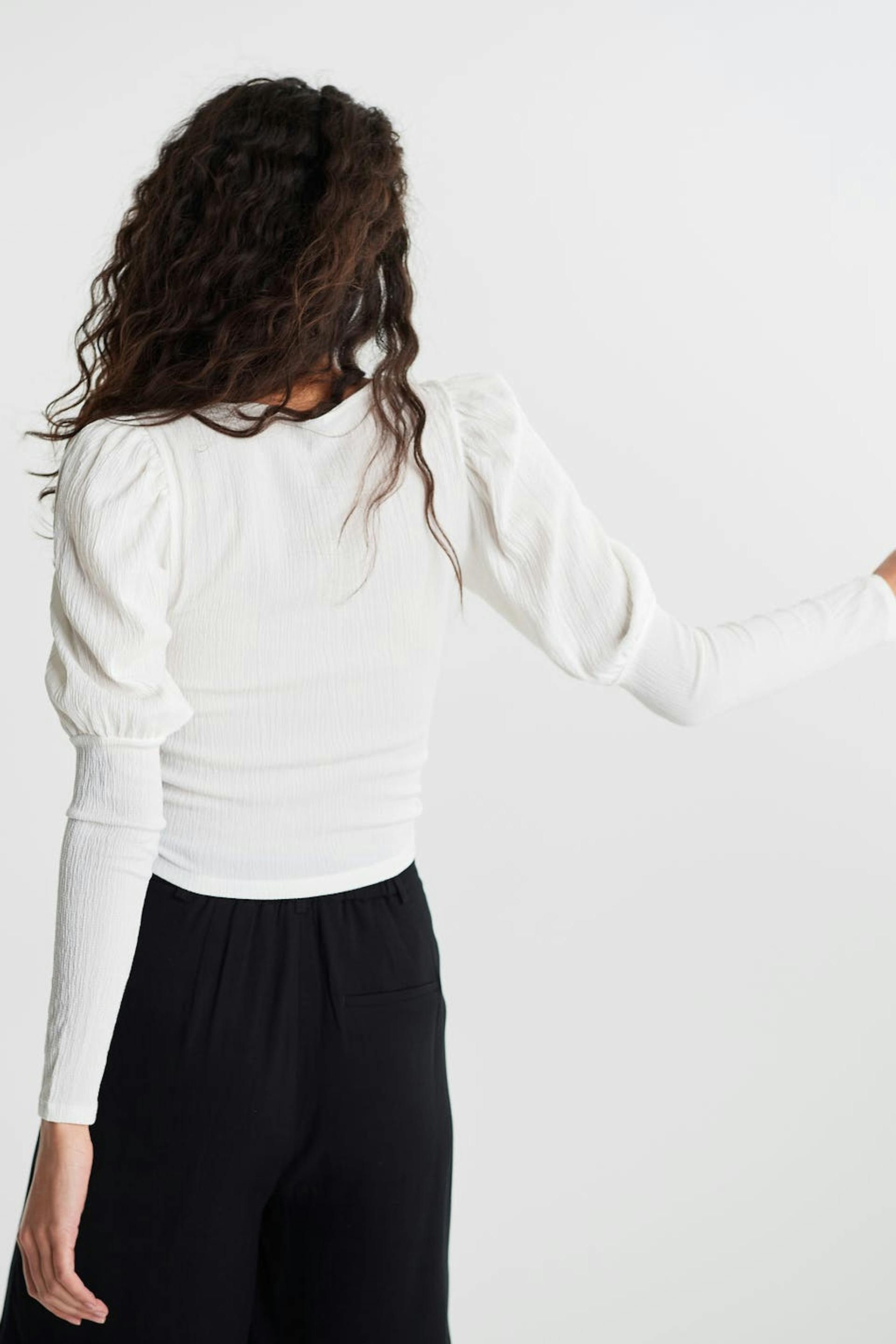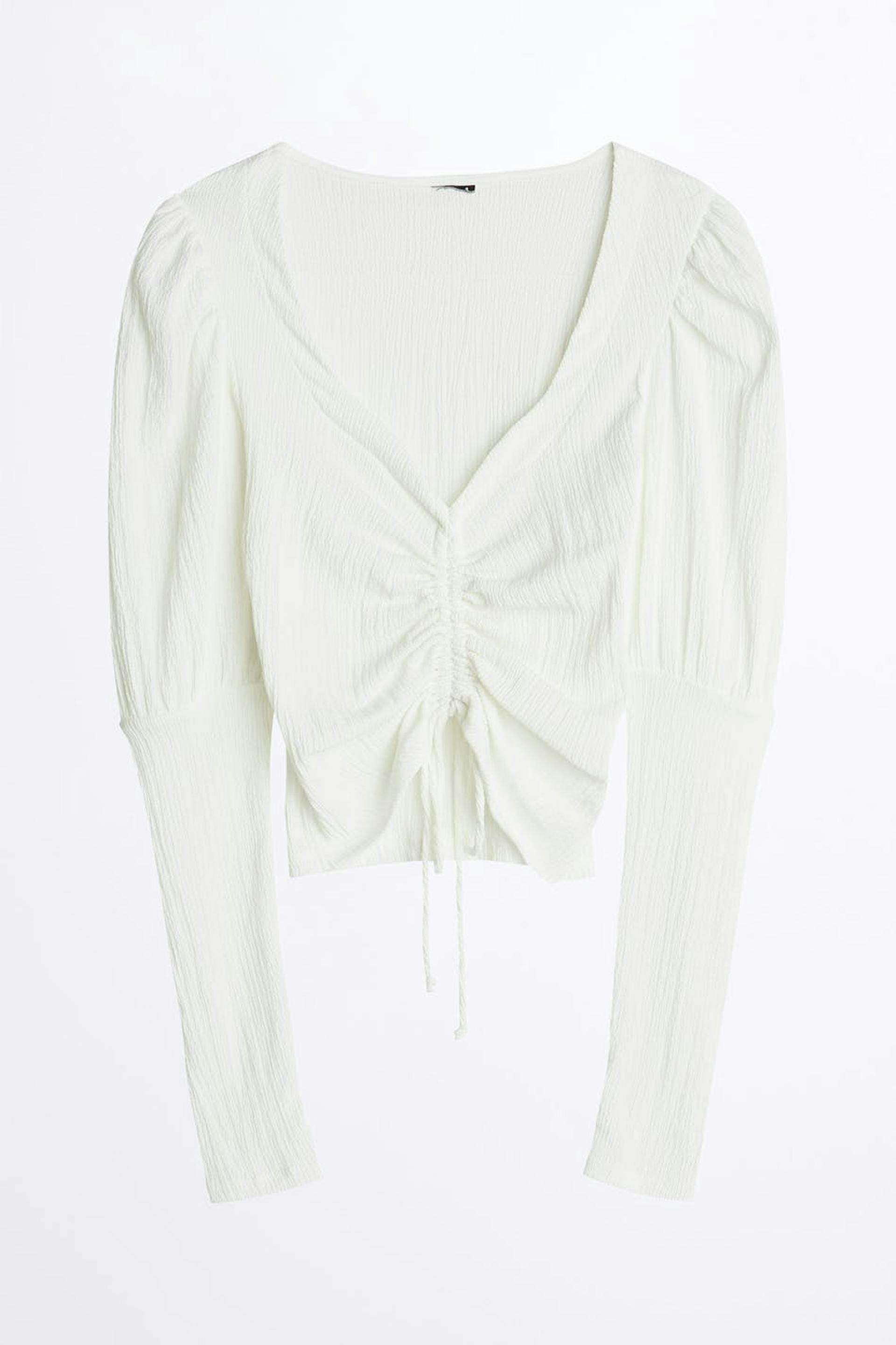 Top with a fitted fit. The top is white and has long puff sleeves. It has a drawstring with a self-tie at the front and ruching on the front.