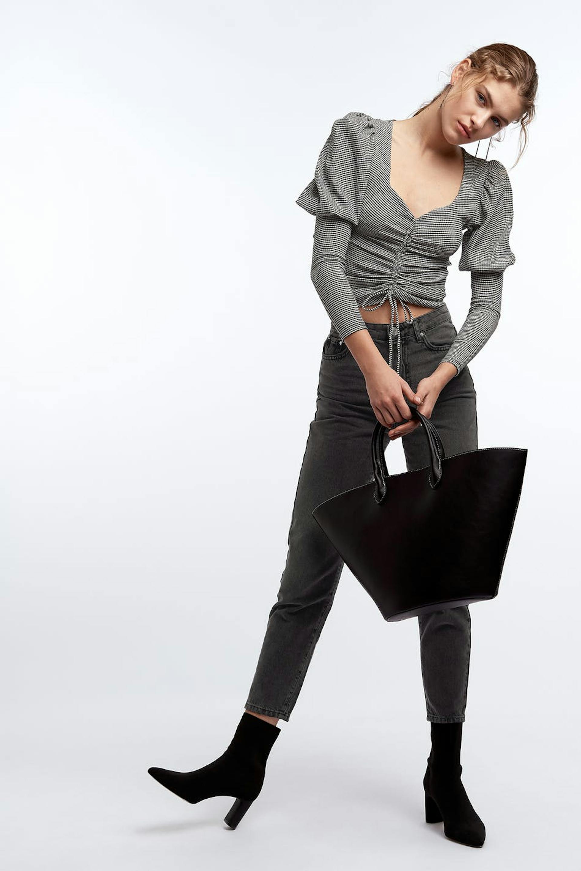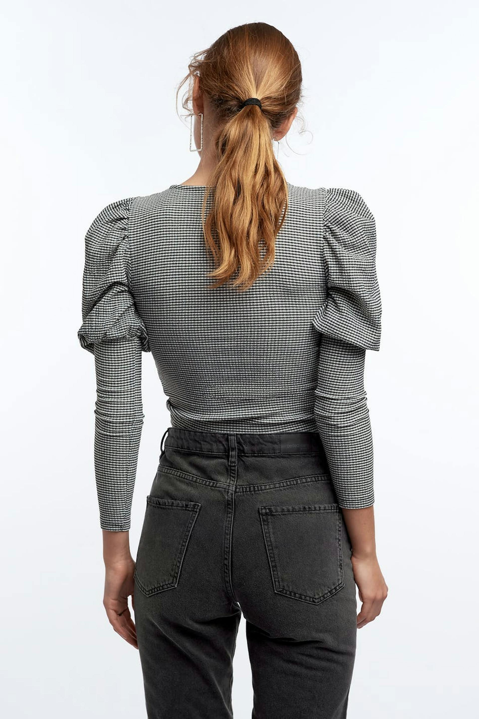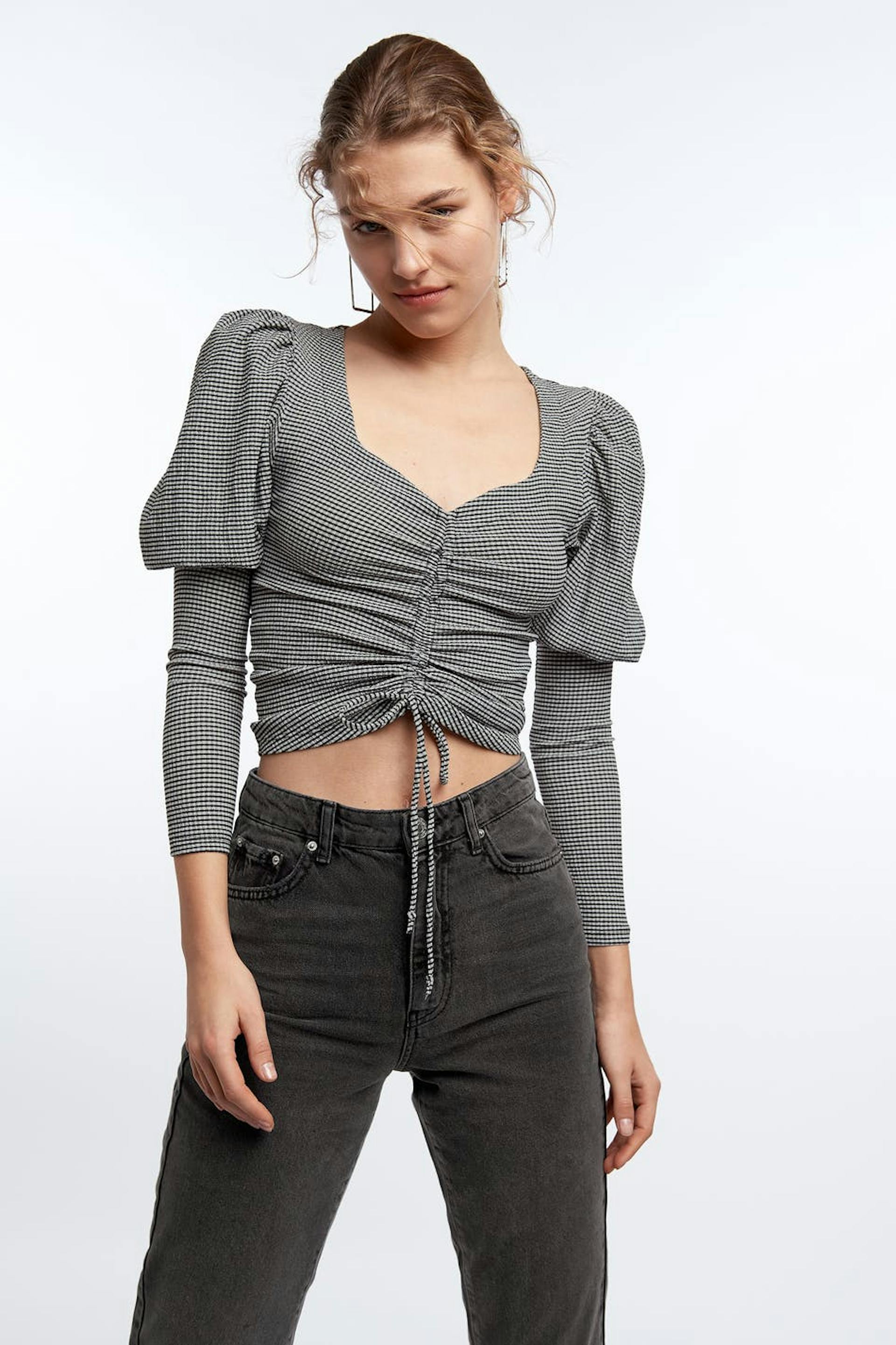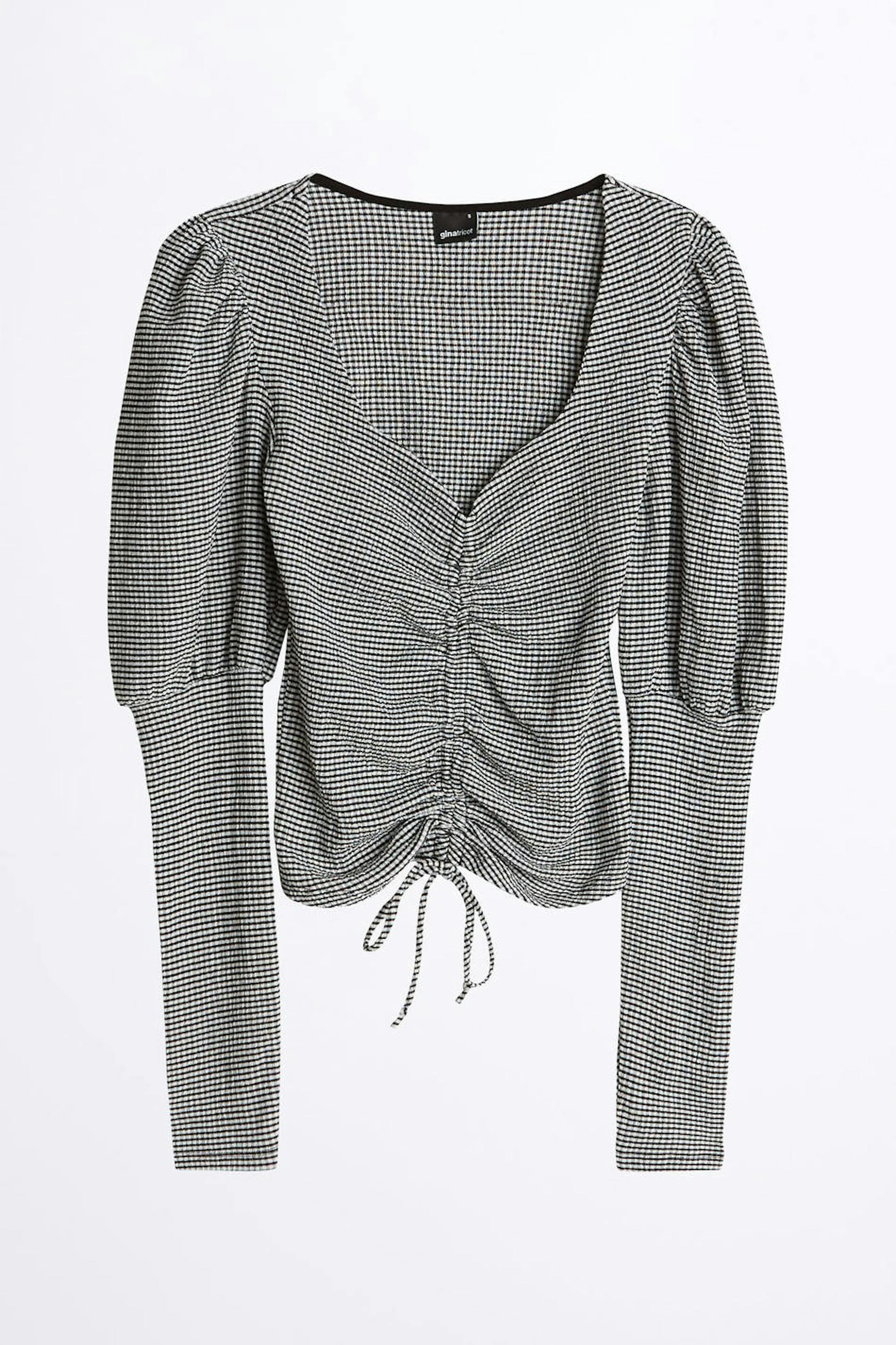 Top with a fitted fit. The top is black and has long puff sleeves. It has a drawstring with a self-tie at the front and ruching on the front.