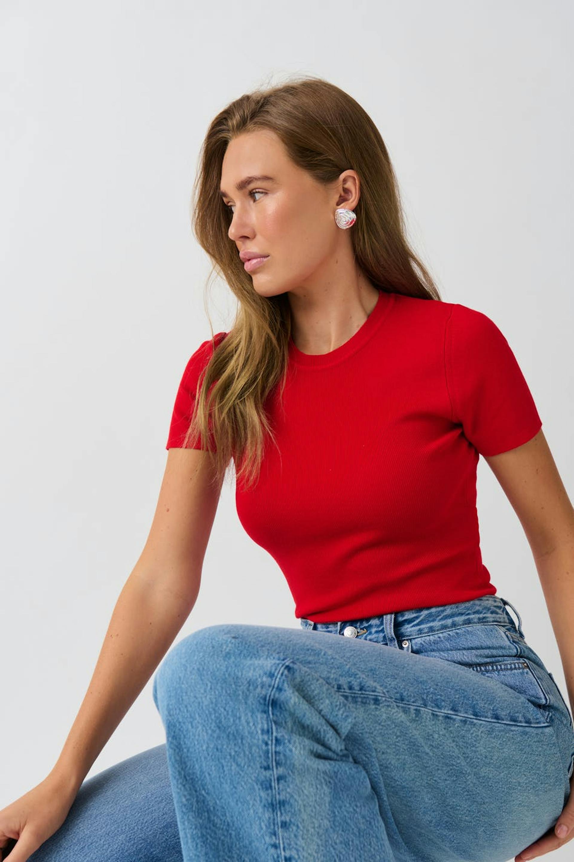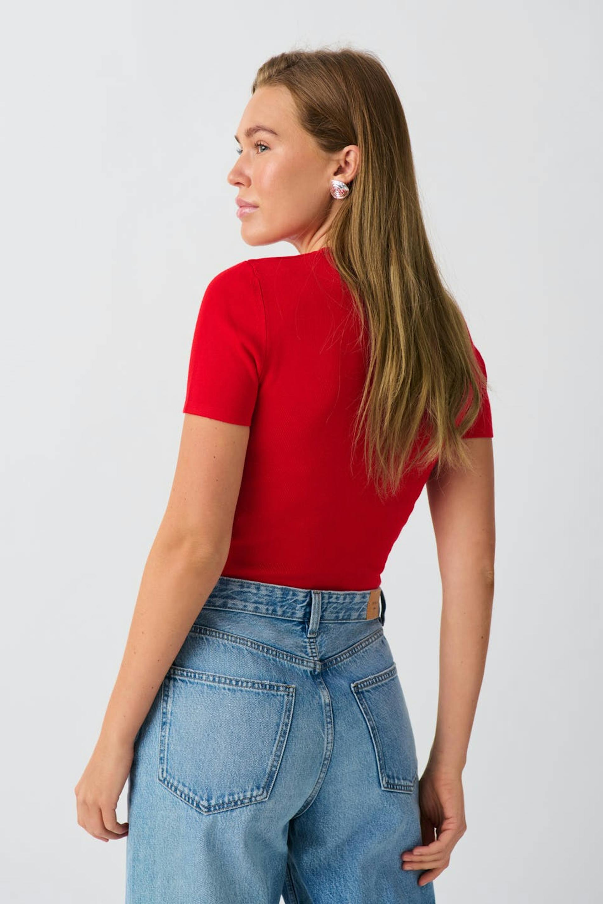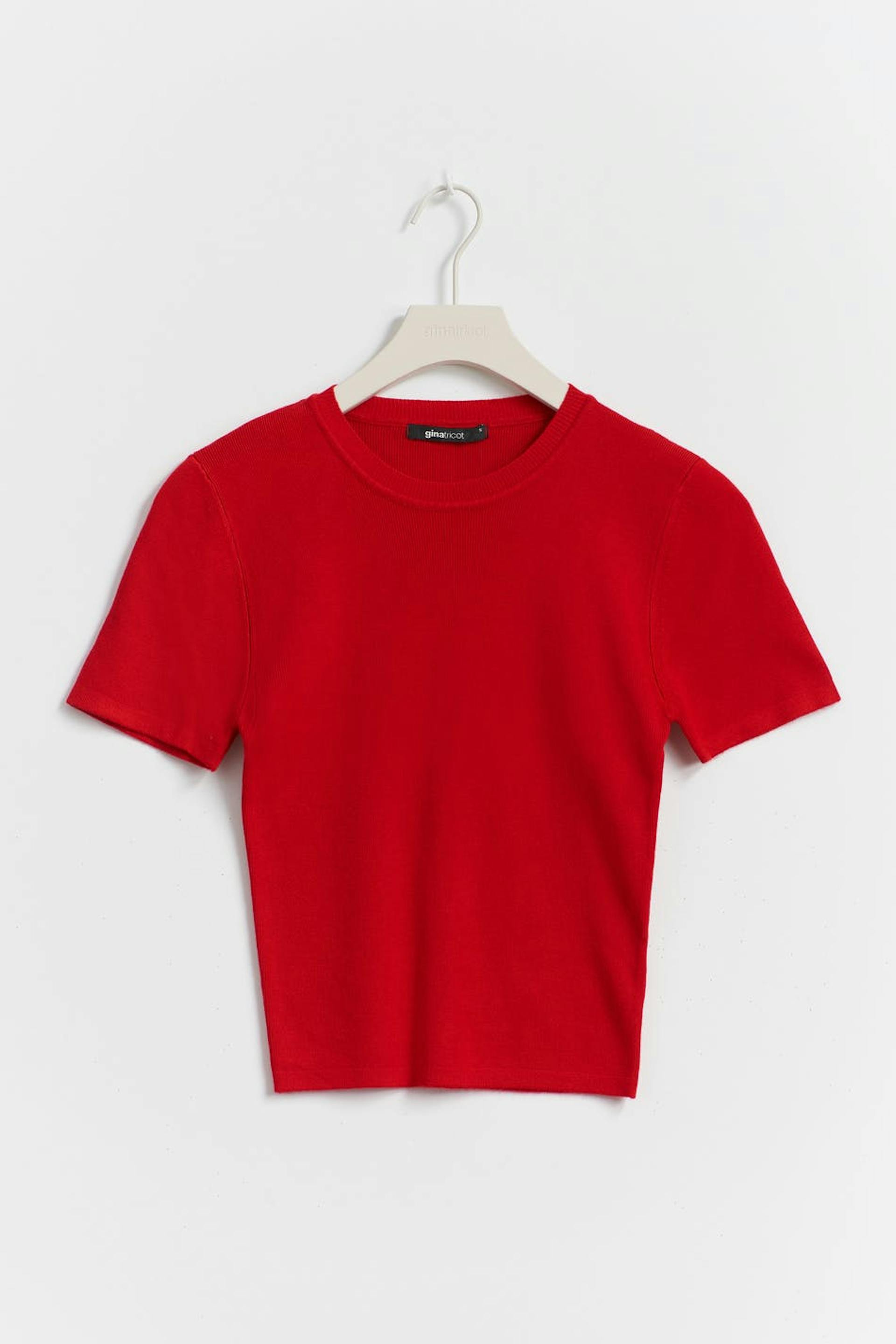 Knitted top with short sleeve. The top is red and has figure-hugging fit.