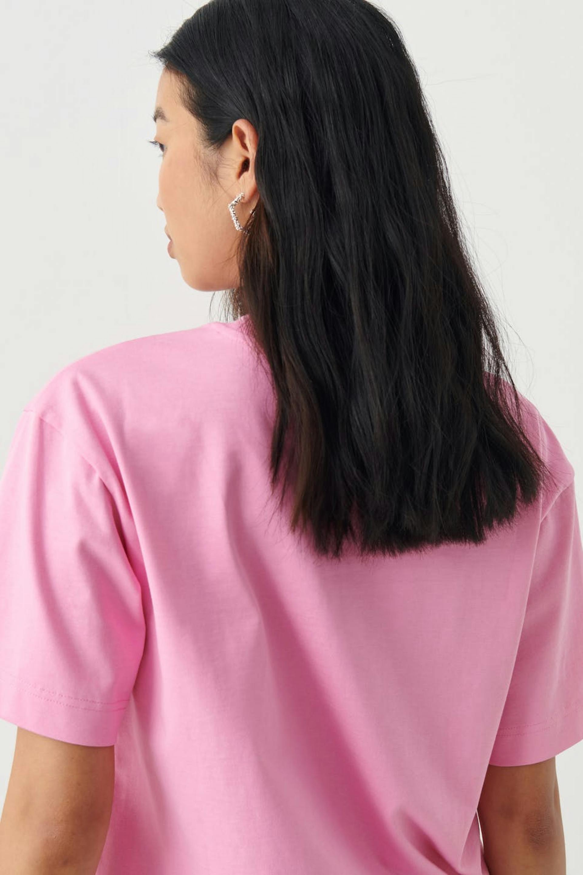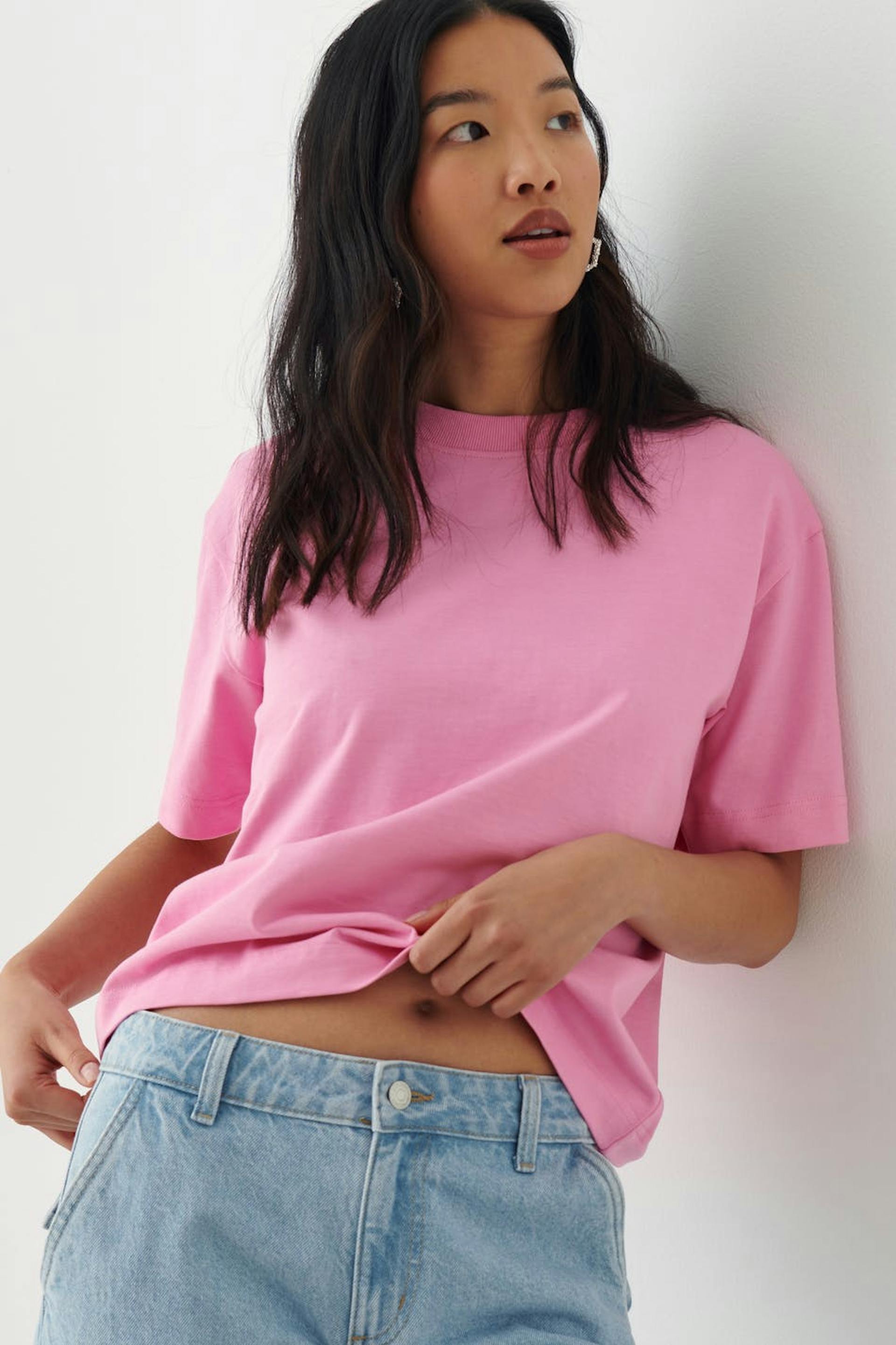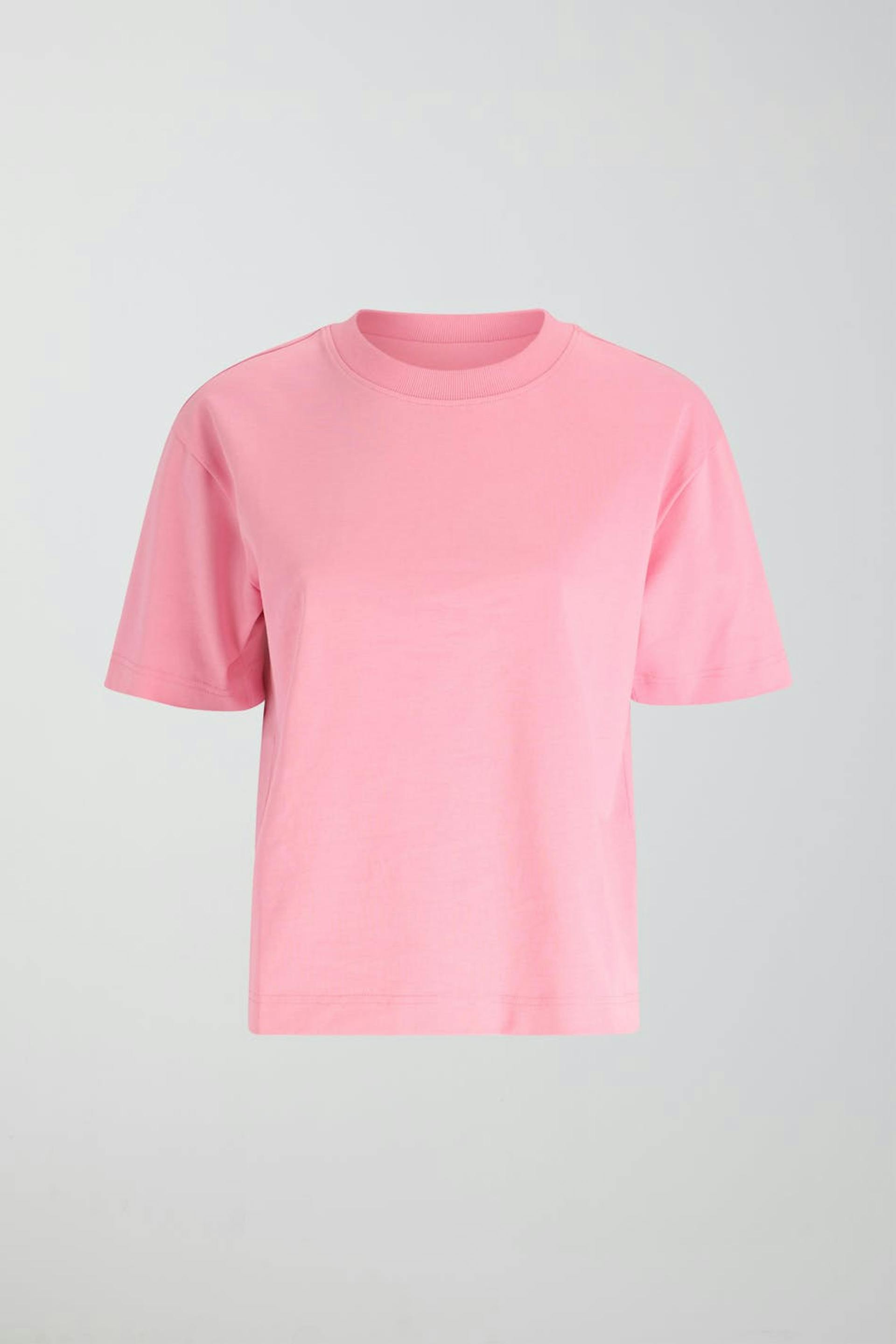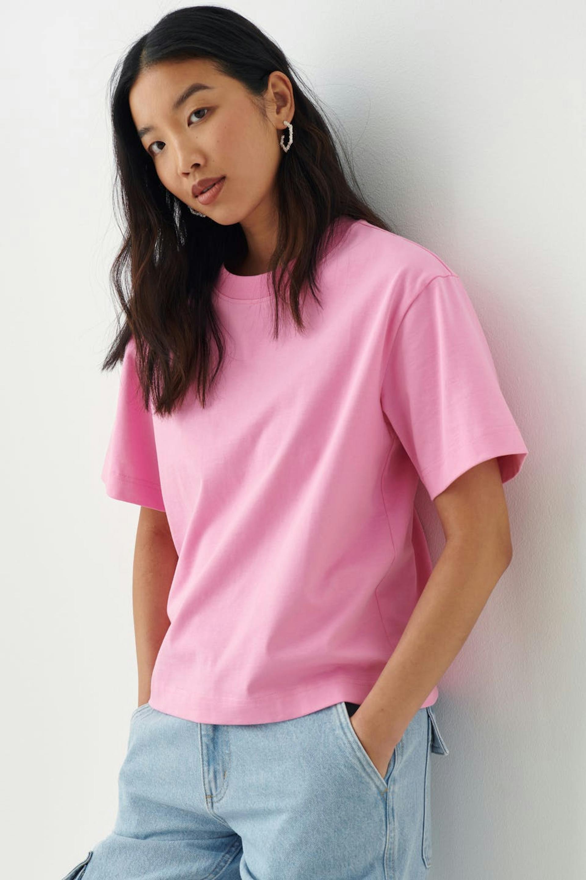 Thick top in jersey with an oversize fit. The top is pink and has a soft, heavy material in cotton. It has a ribbed cuff on the neckline.