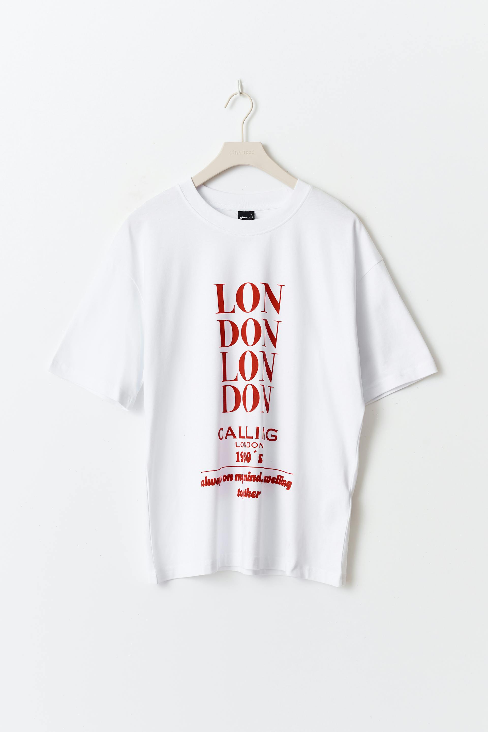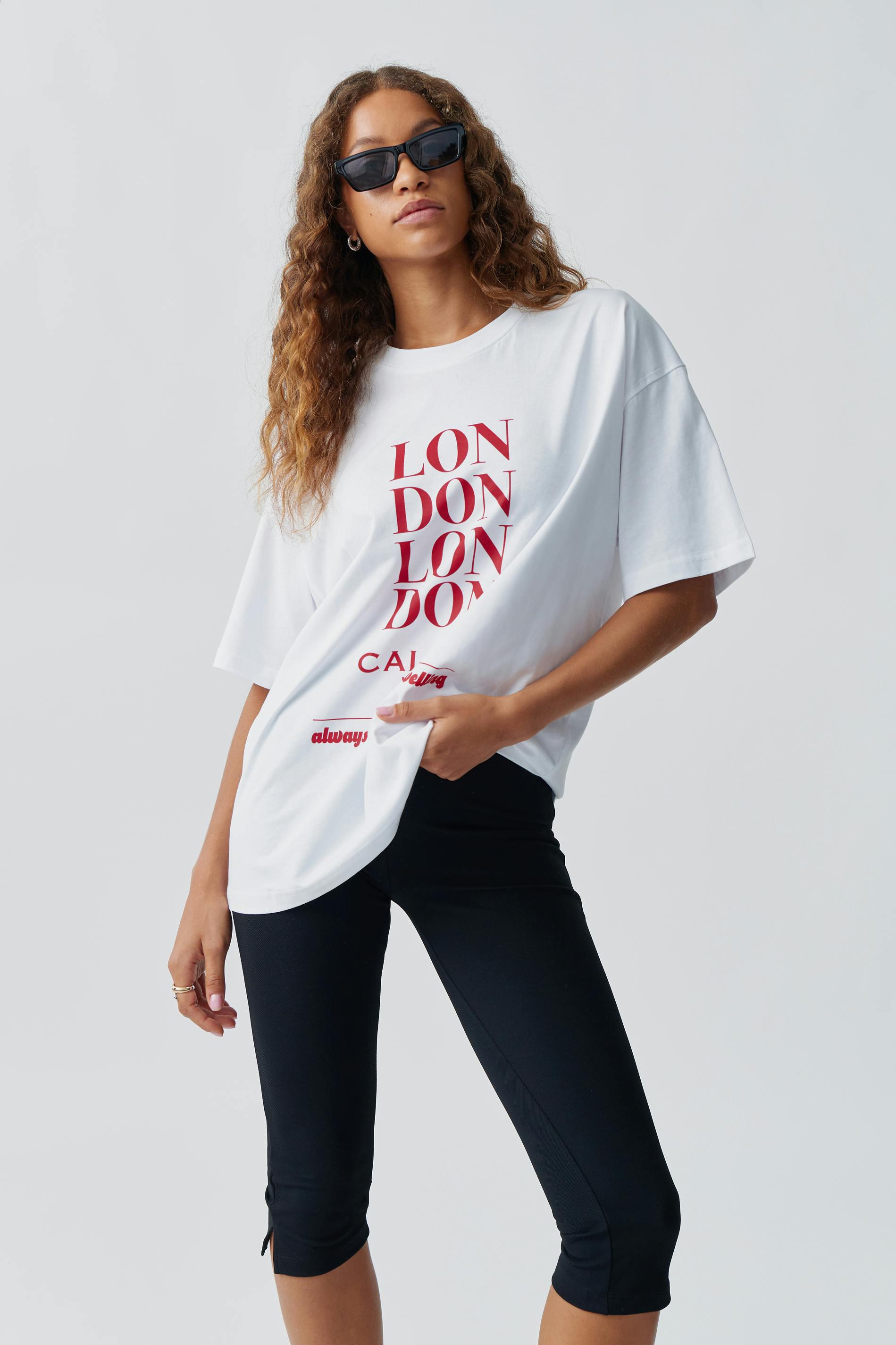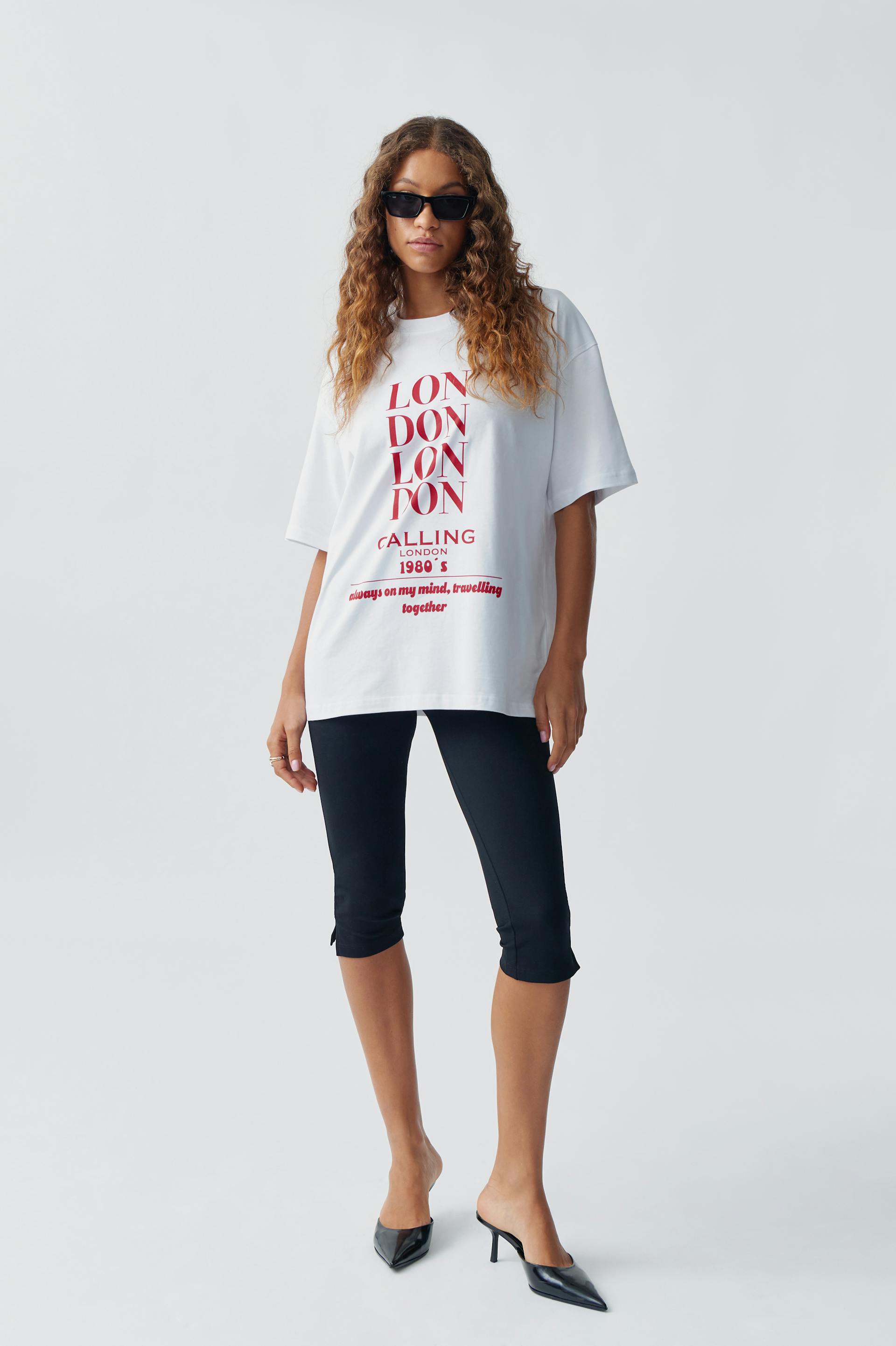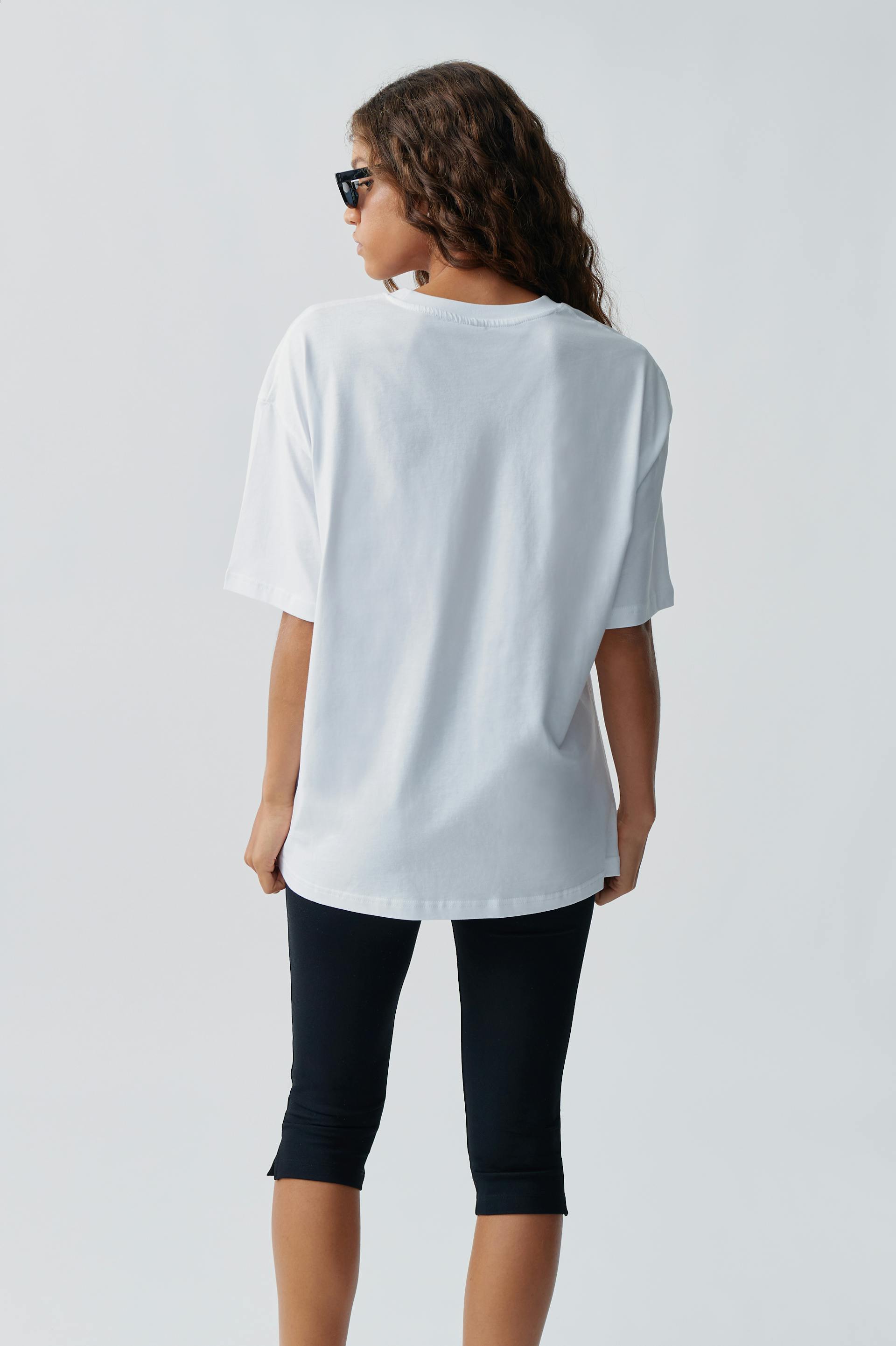 Oversized t-shirt in cotton with print at the front. The t-shirt is white and has short sleeve. It has round neckline and dropped shoulder.
