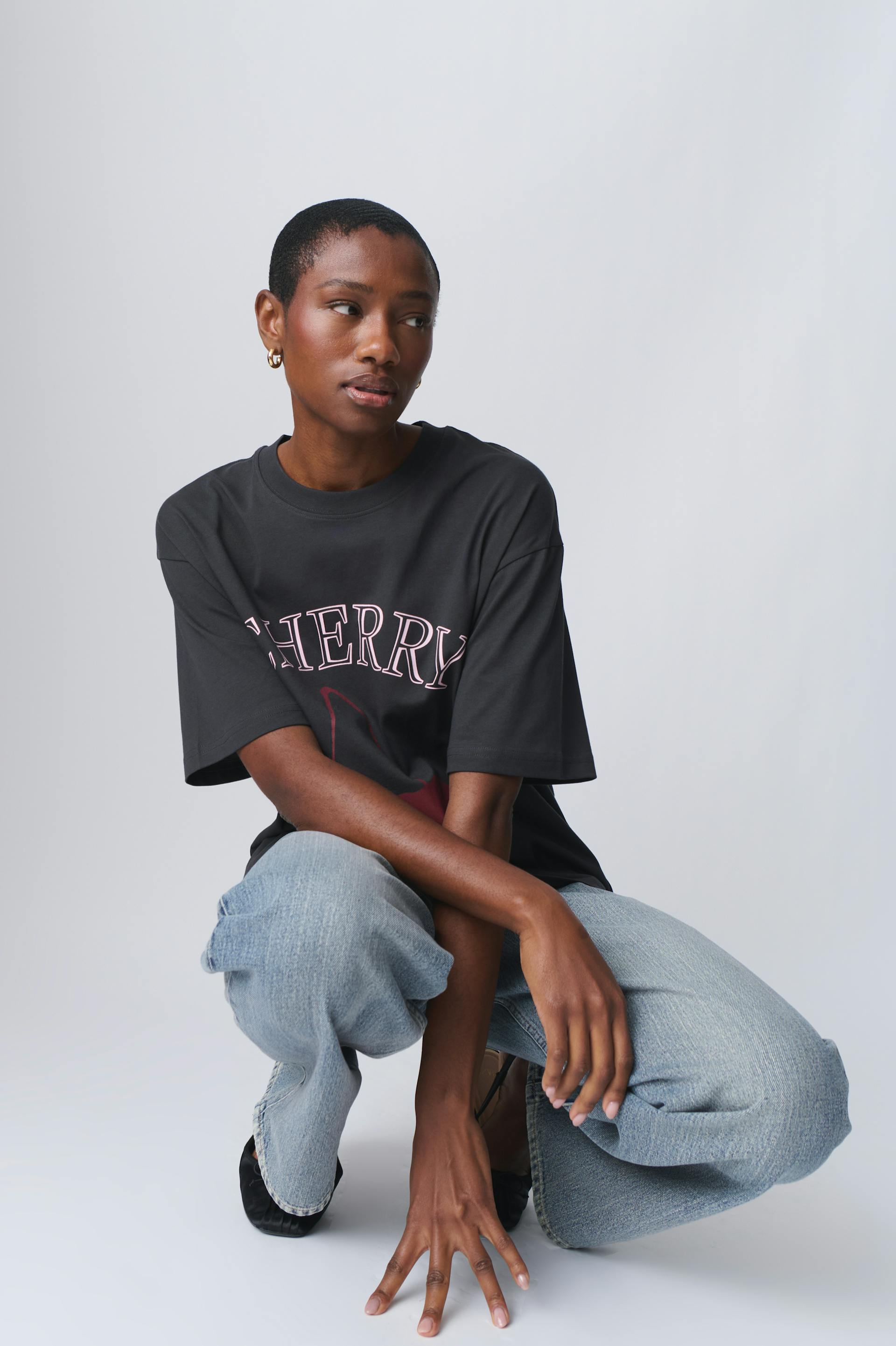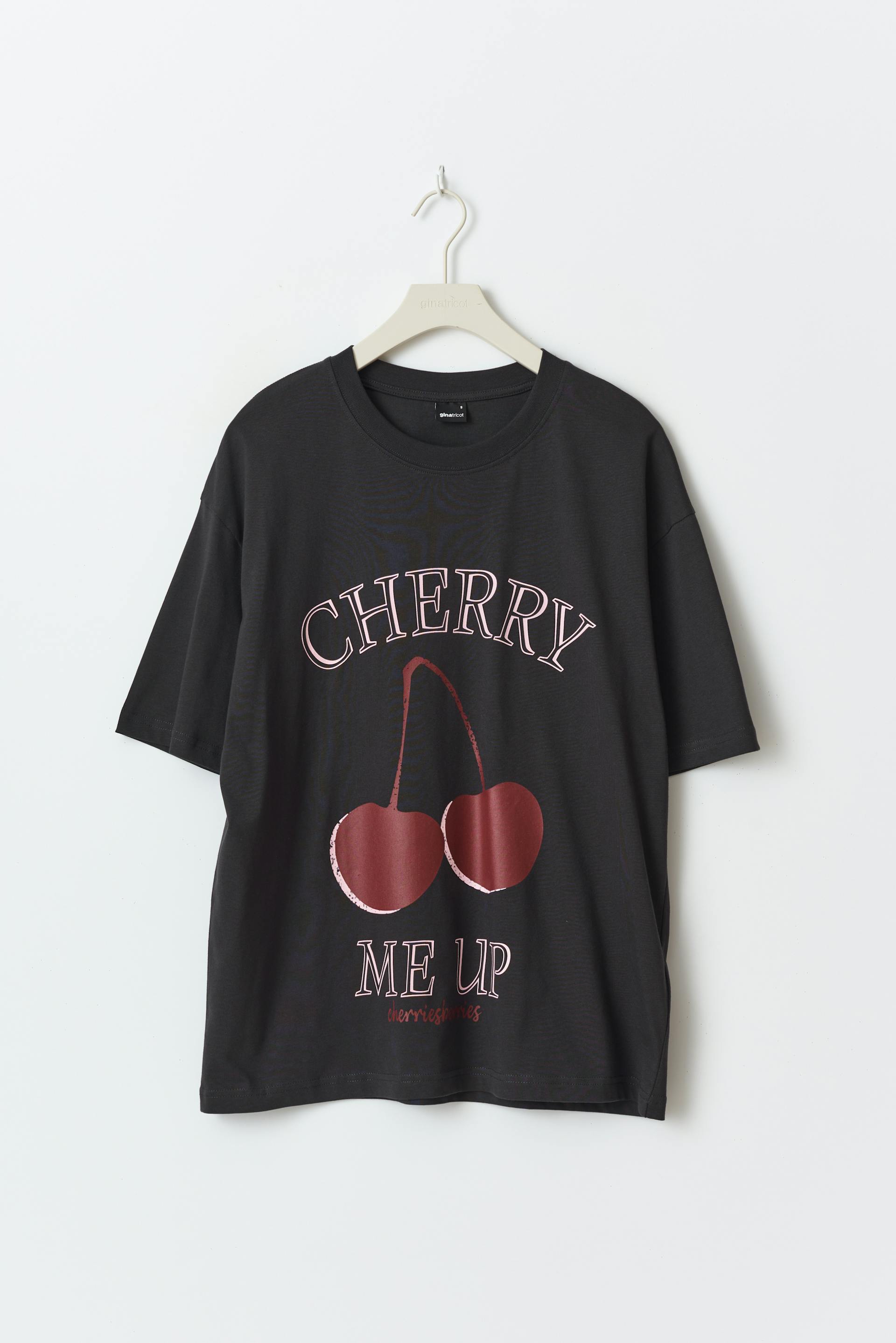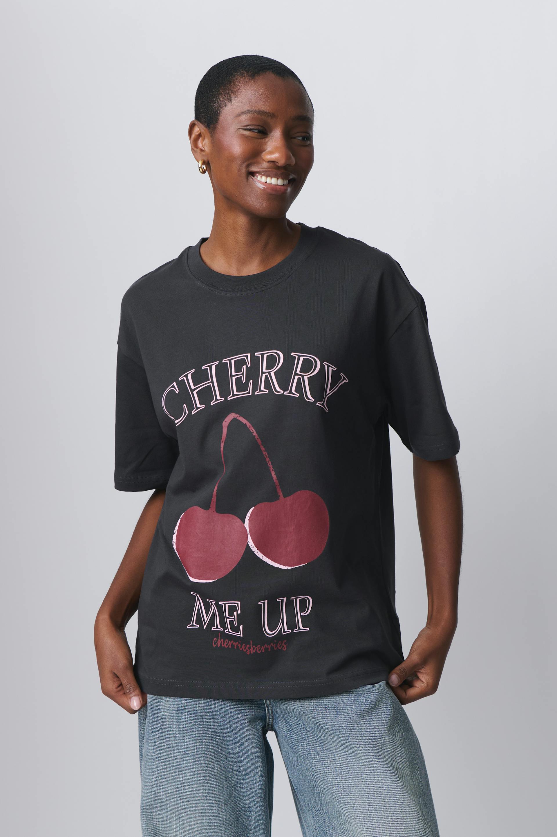 Oversized t-shirt in cotton with print at the front. The t-shirt is black and has short sleeve. It has round neckline and dropped shoulder.