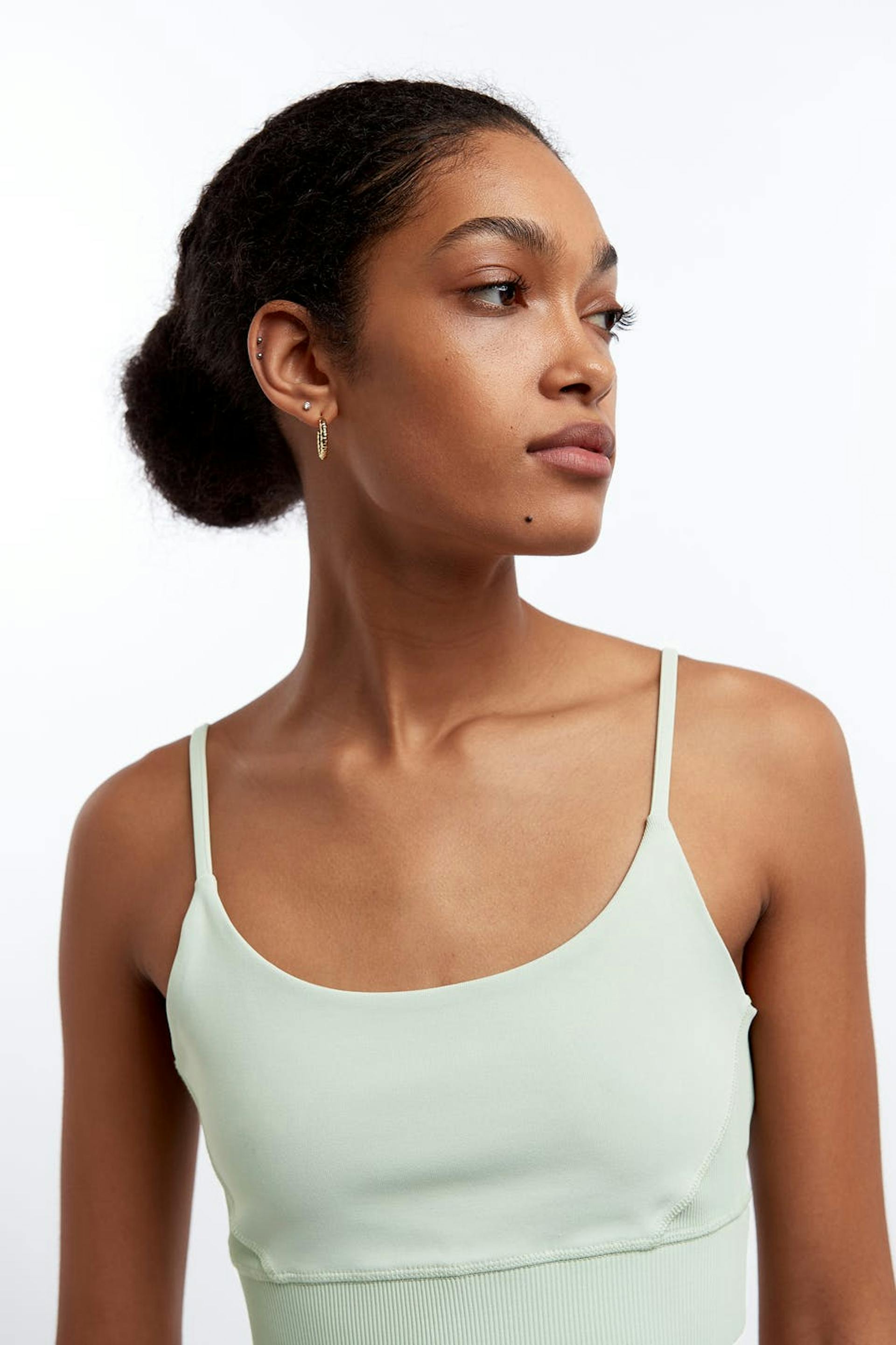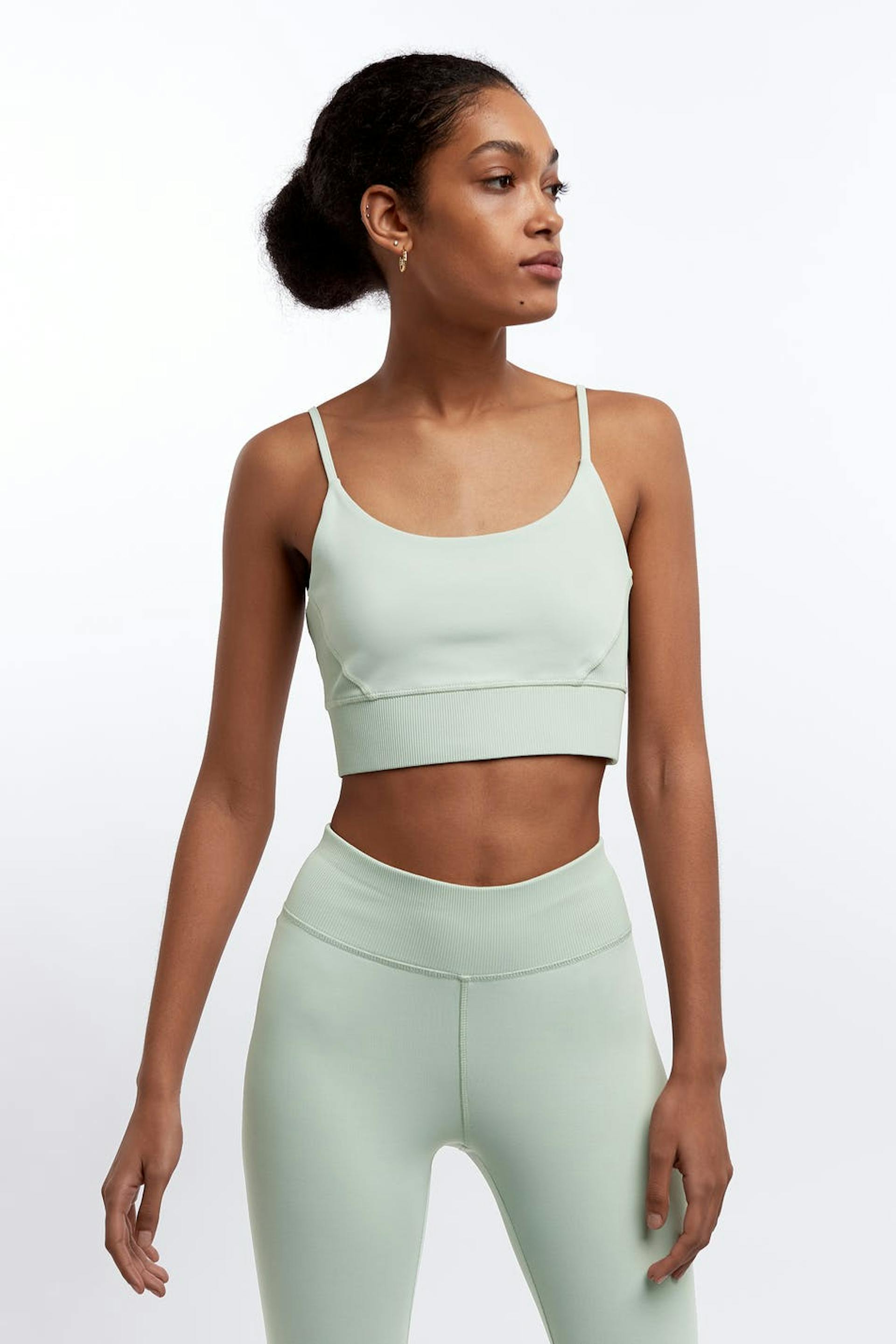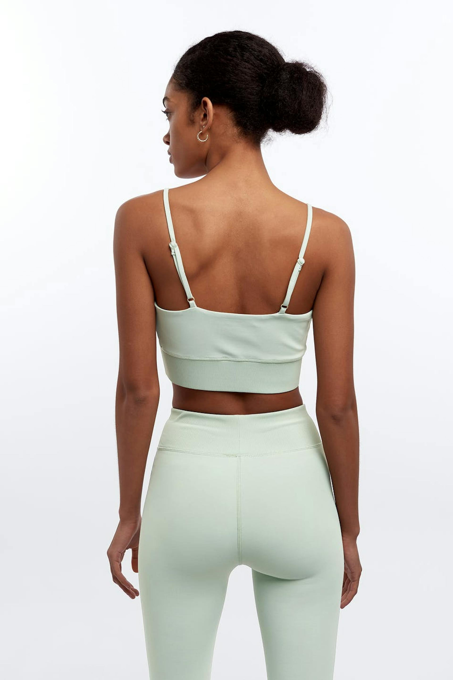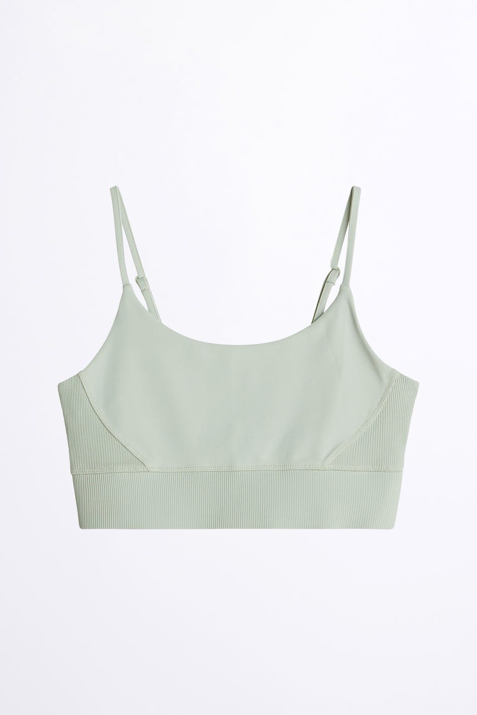 Soft tank with a fitted fit. The tank is light green and short and has adjustable, slim shoulder straps. It is made of jersey and has a ribbed cuff at the hem.