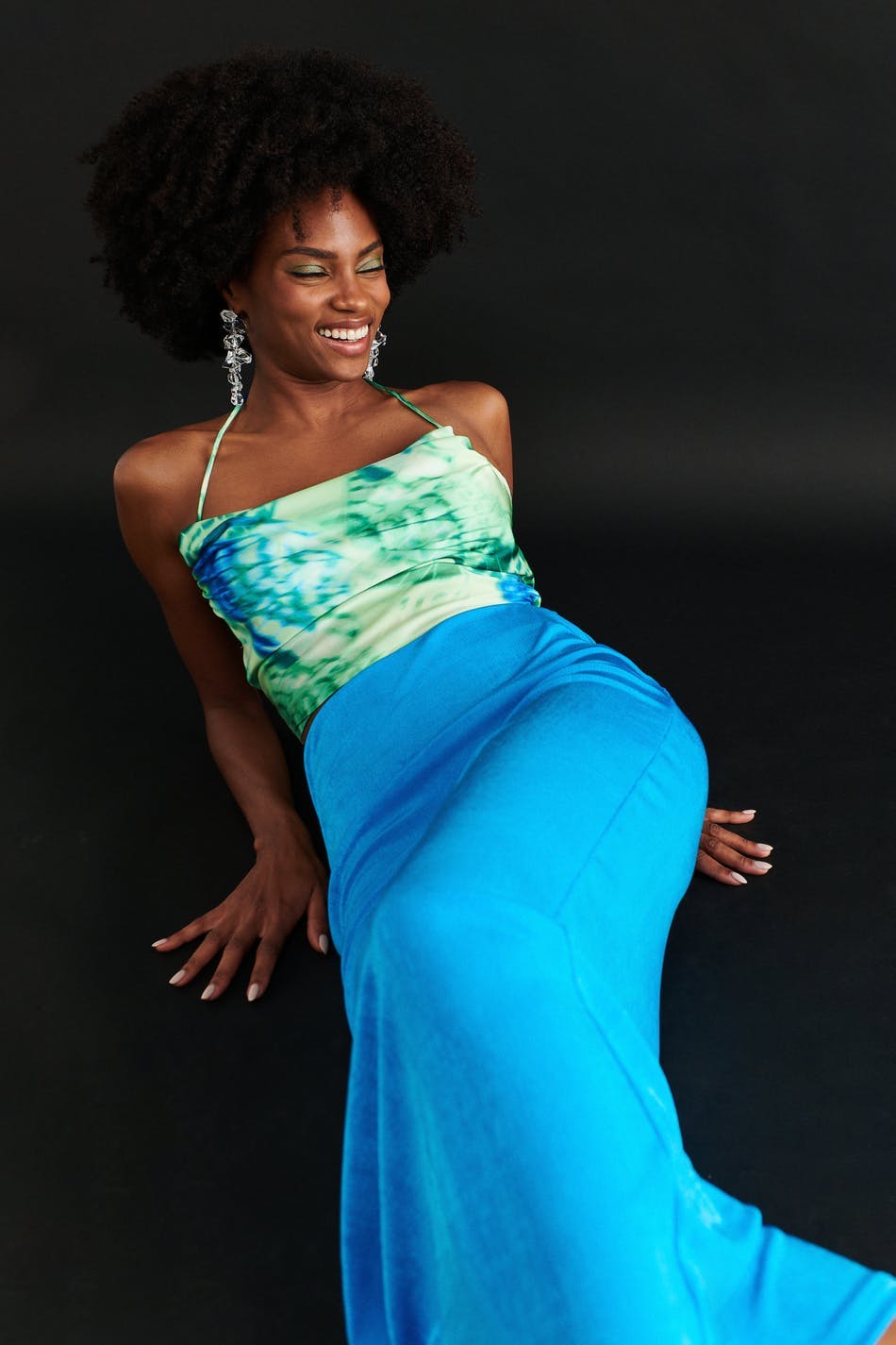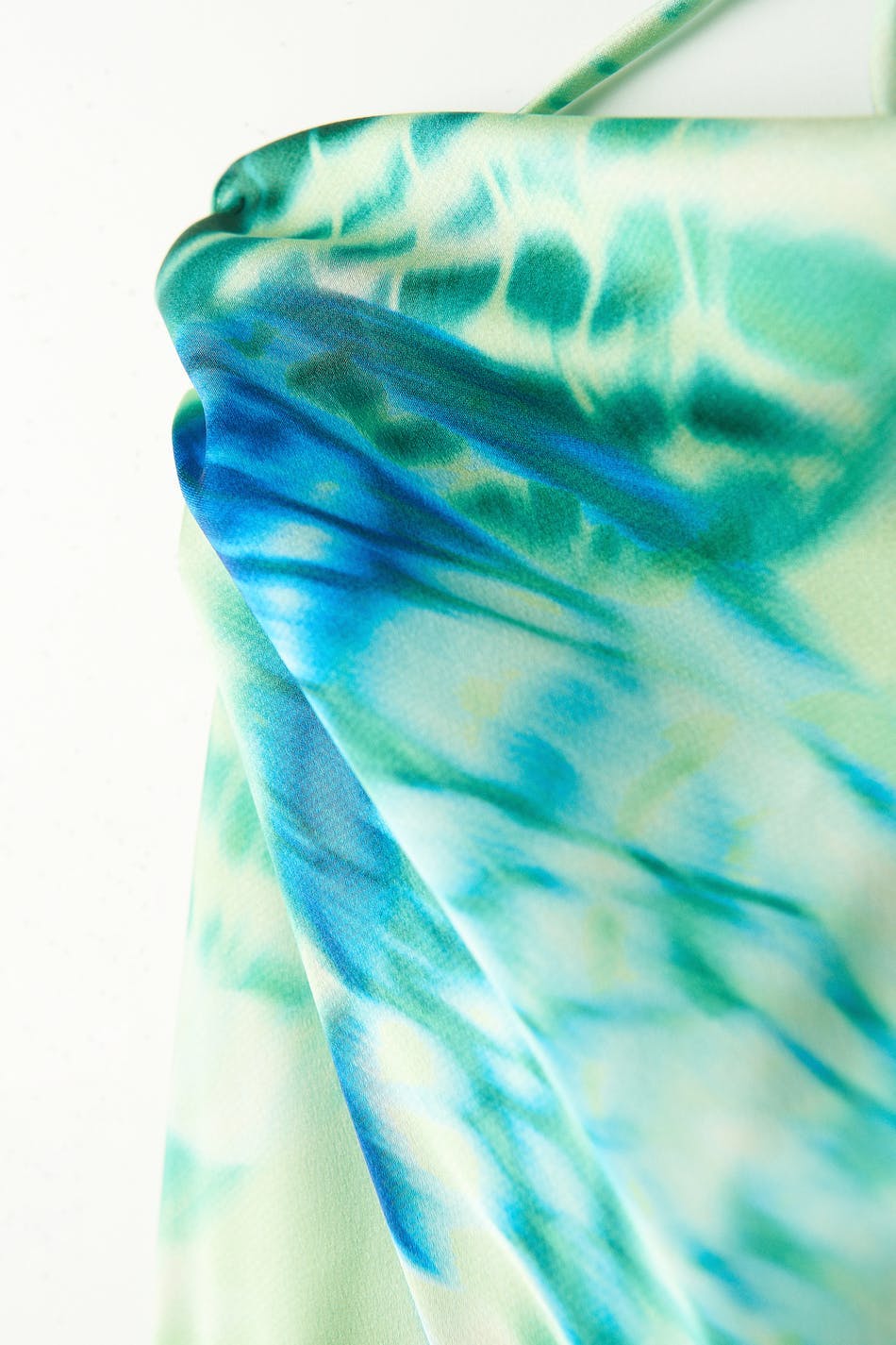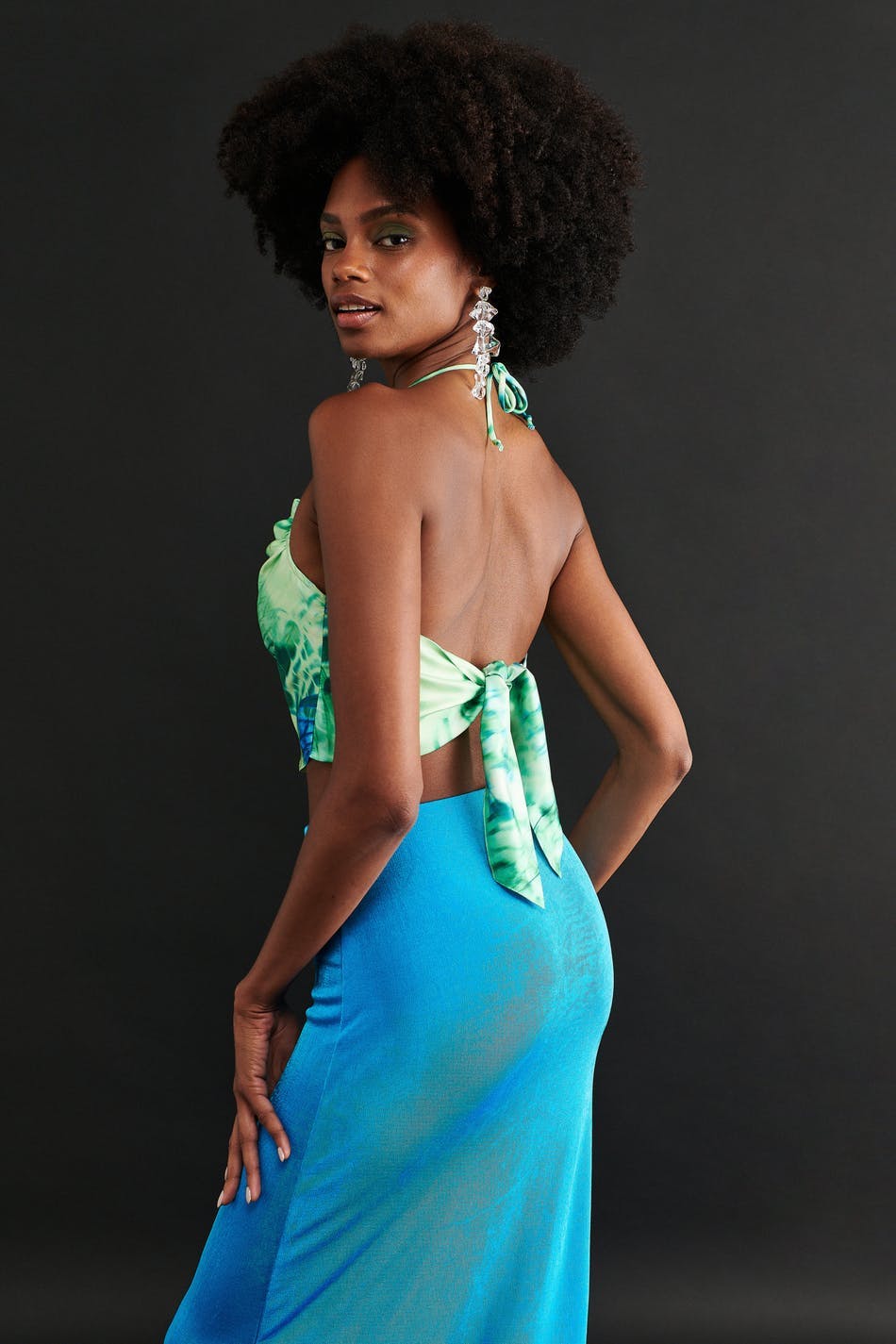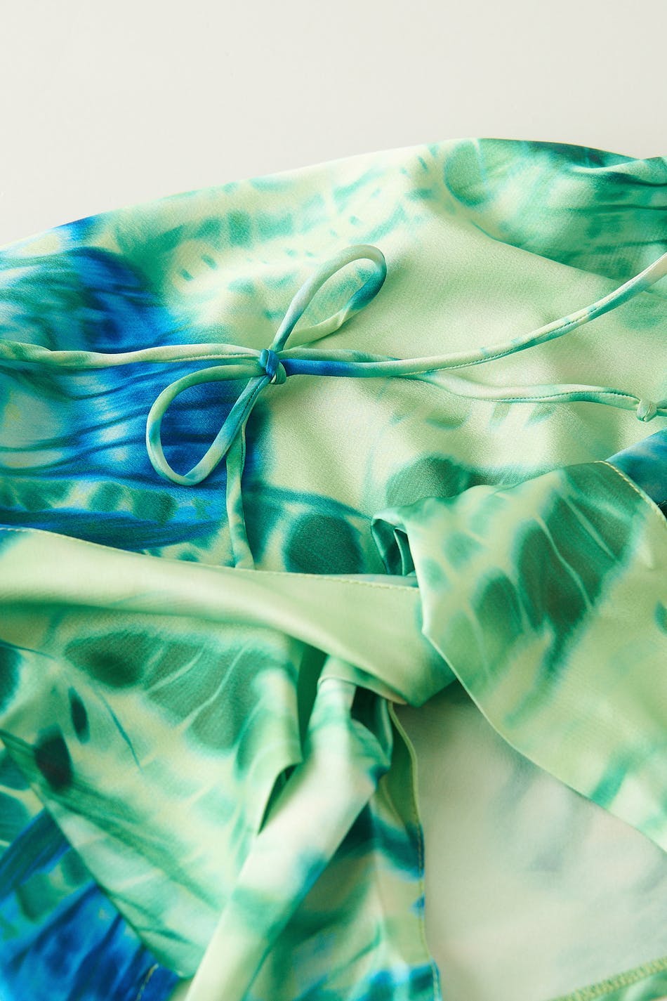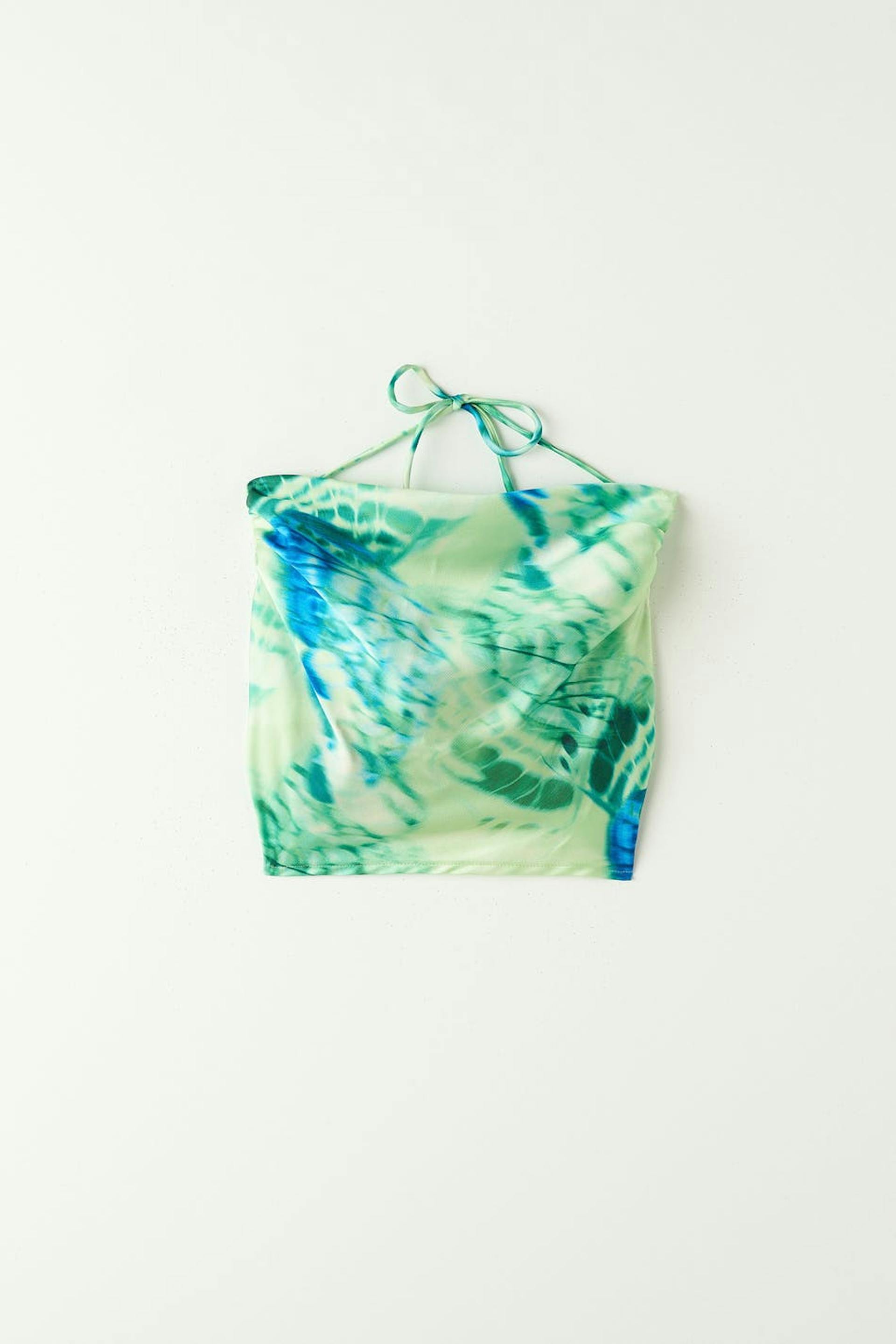 Sleeveless top with cowl neck. The top is green and has self-tie in the back. It has thin halterneck straps and cropped length.