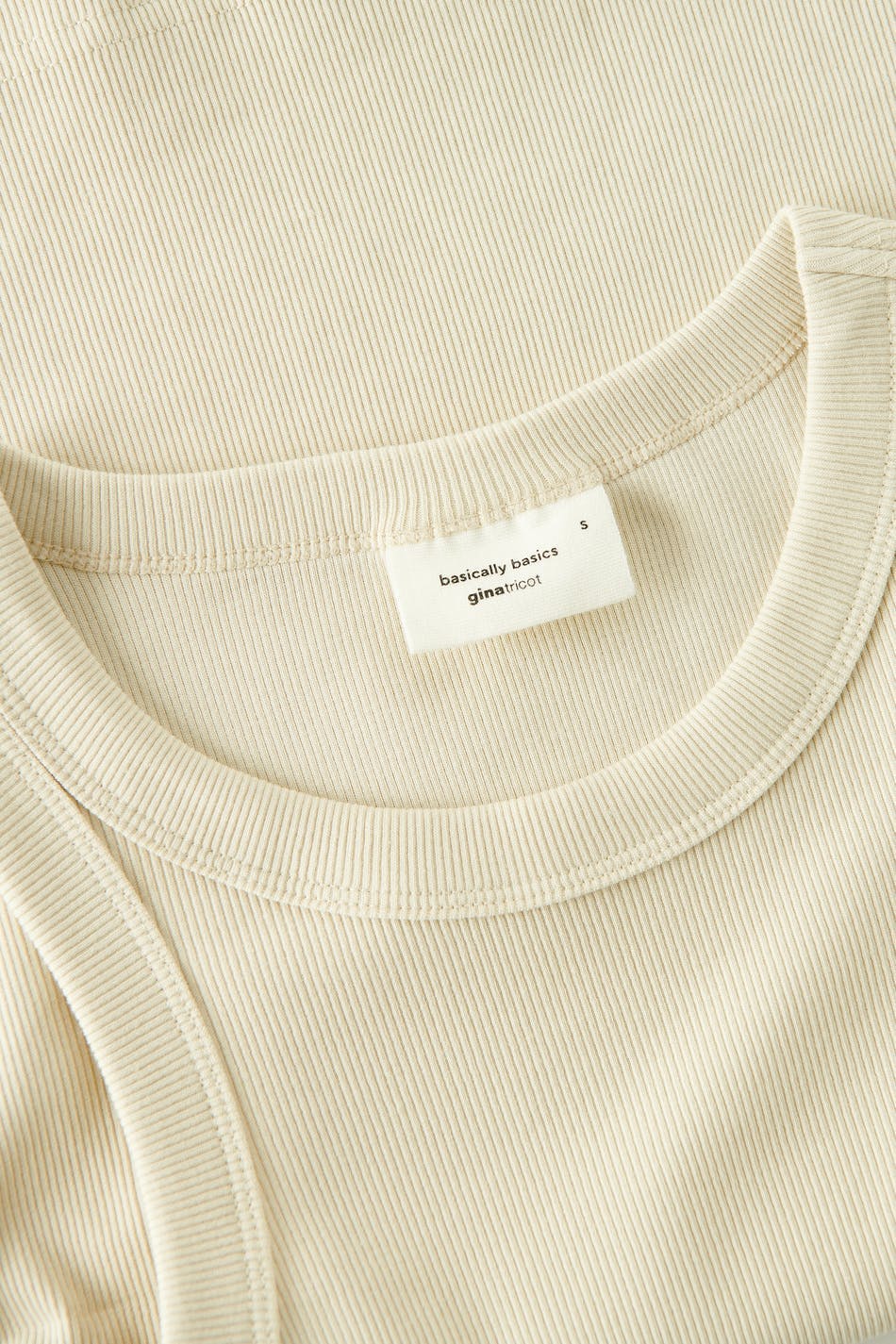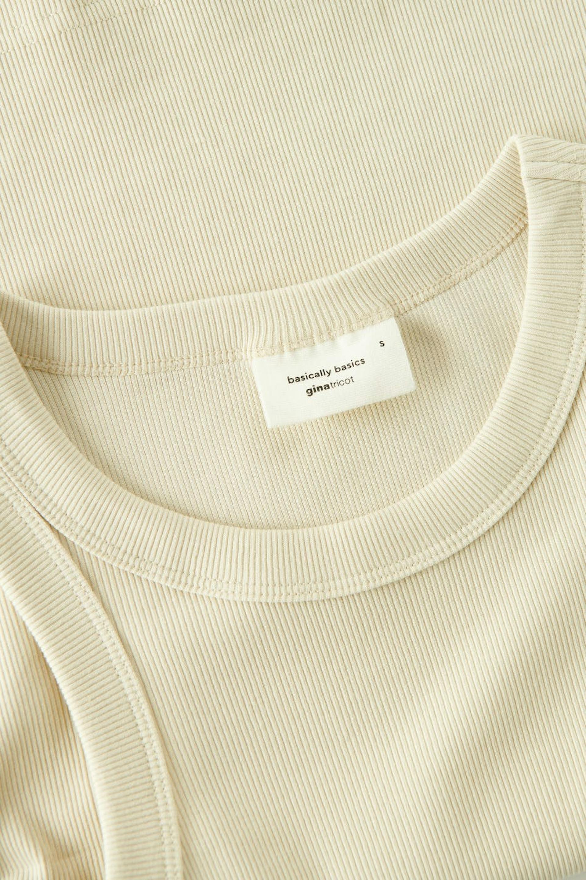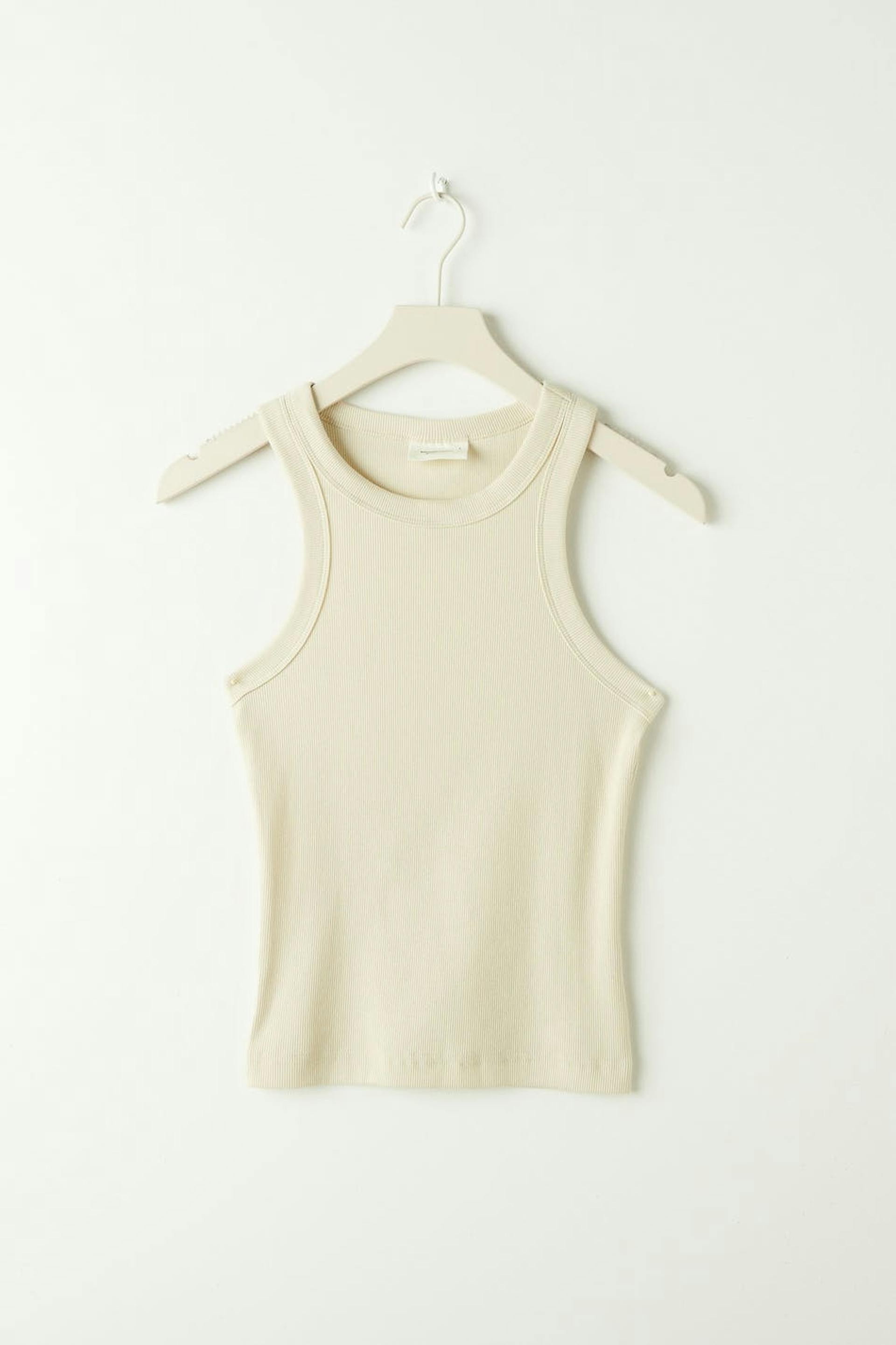 Ribbed tank with a fitted fit. The tank is beige, sleeveless and cropped. It has a stretchy quality in jersey.