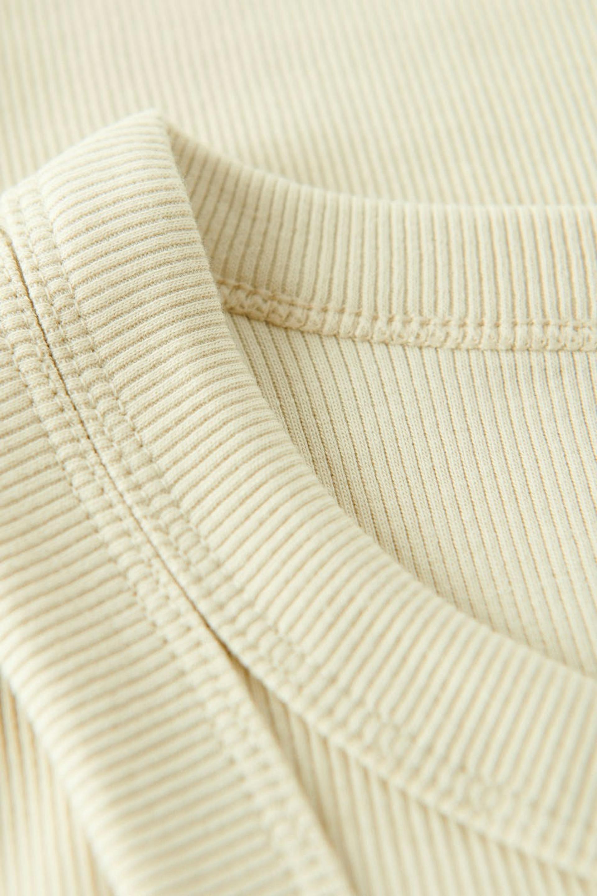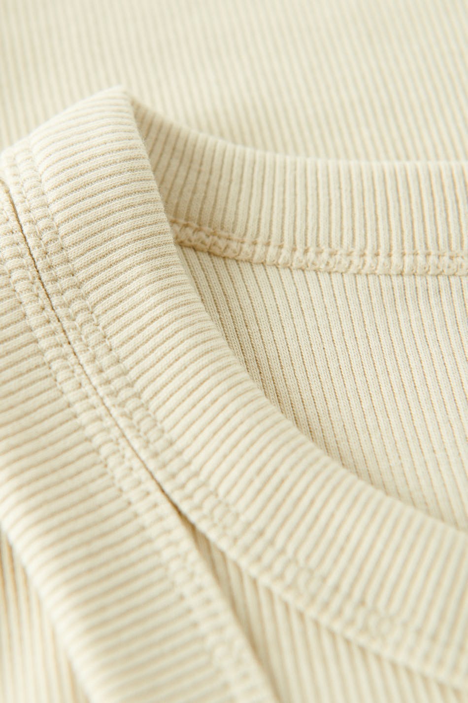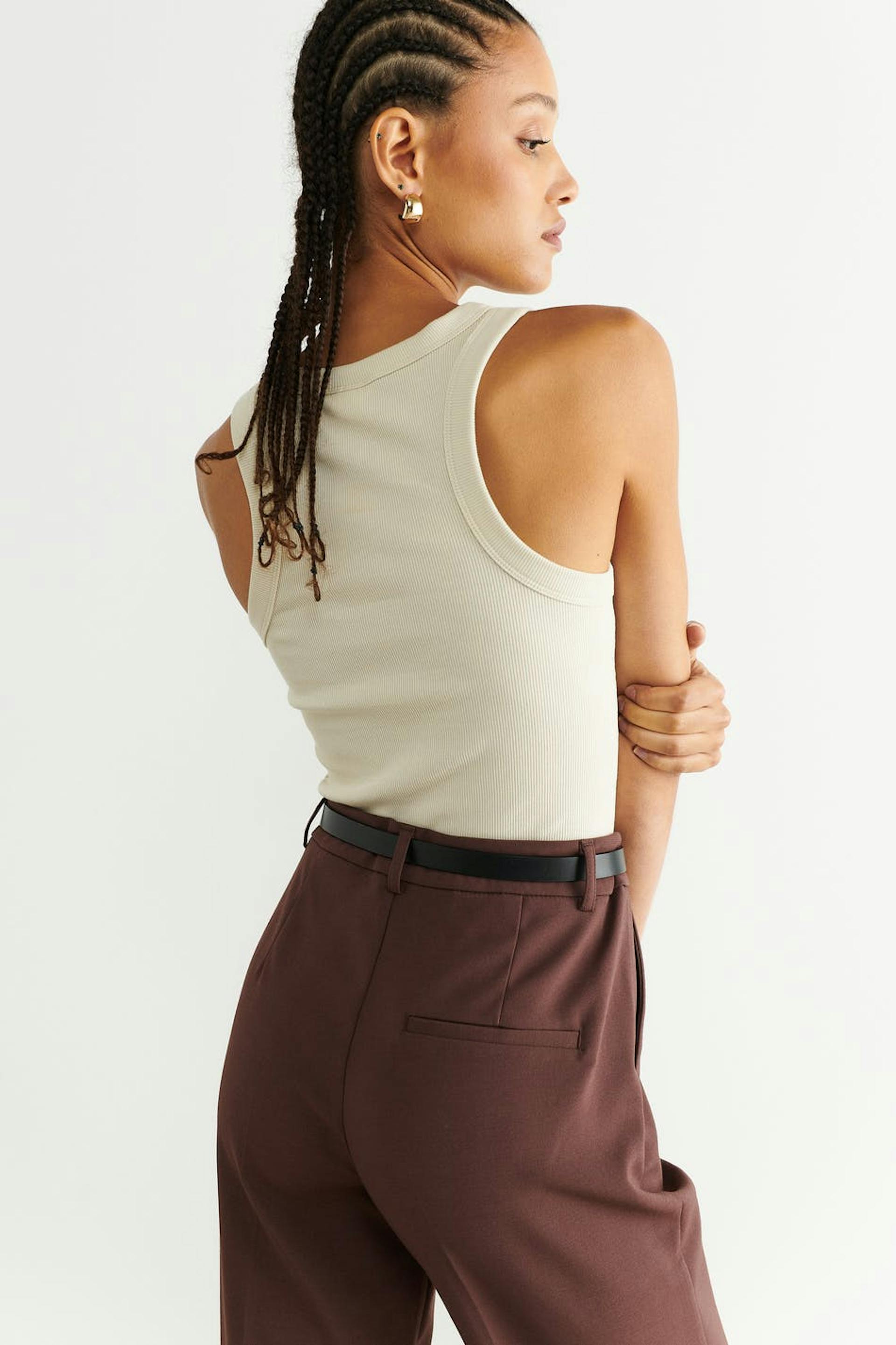 Ribbed tank with a fitted fit. The tank is beige, sleeveless and cropped. It has a stretchy quality in jersey.