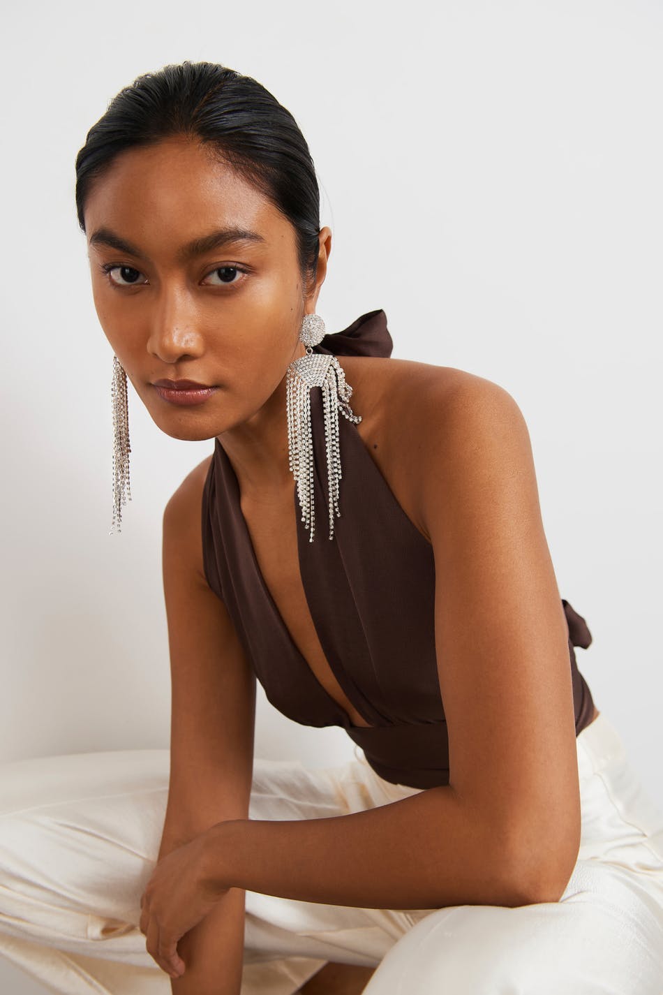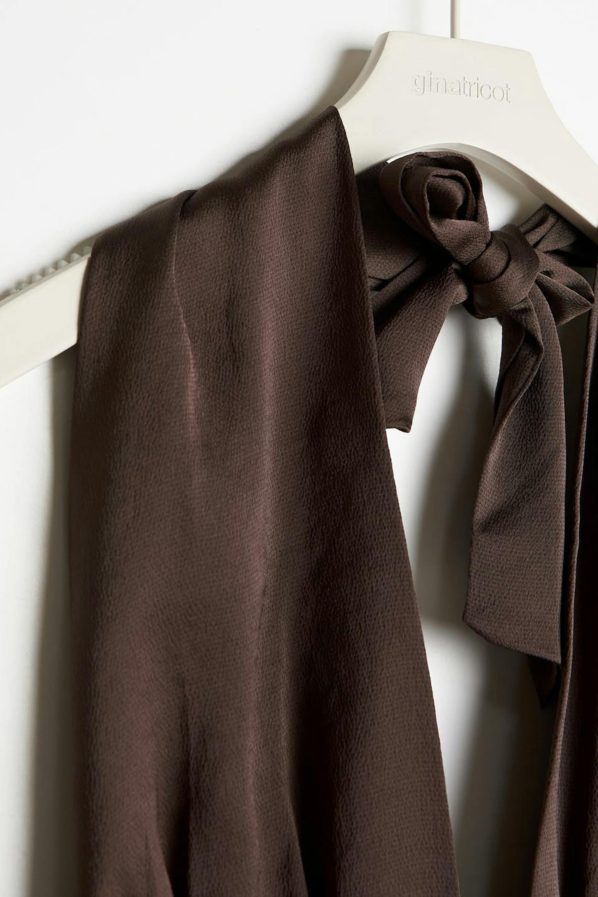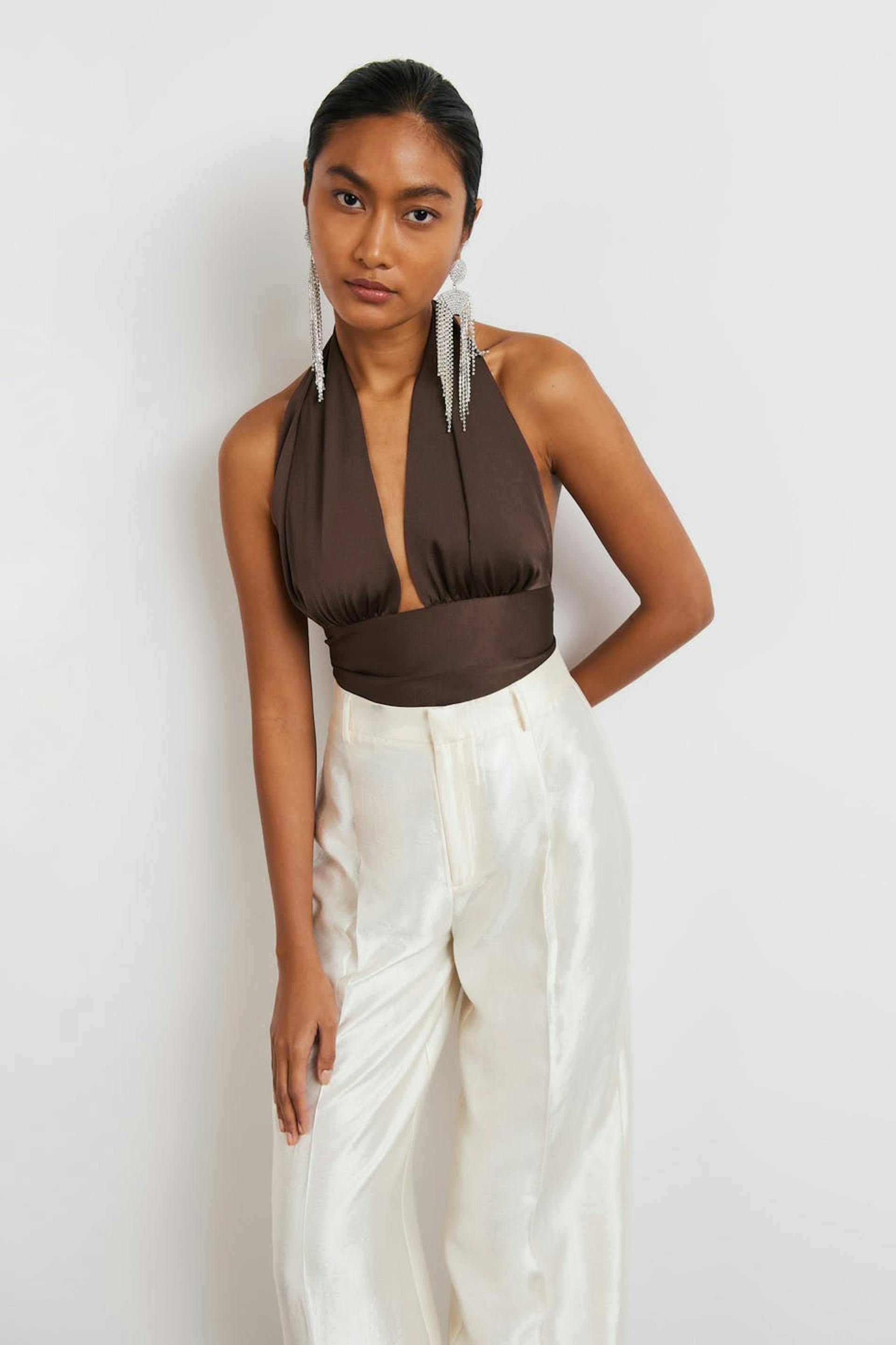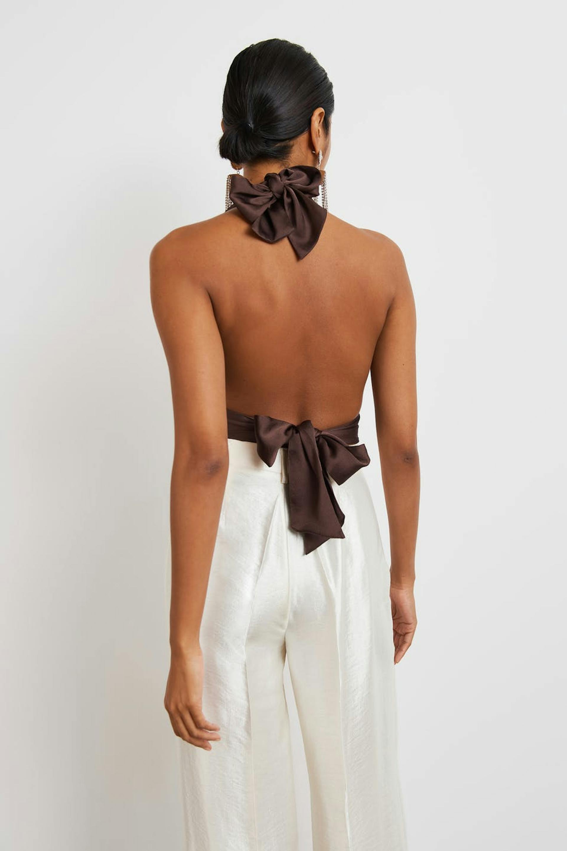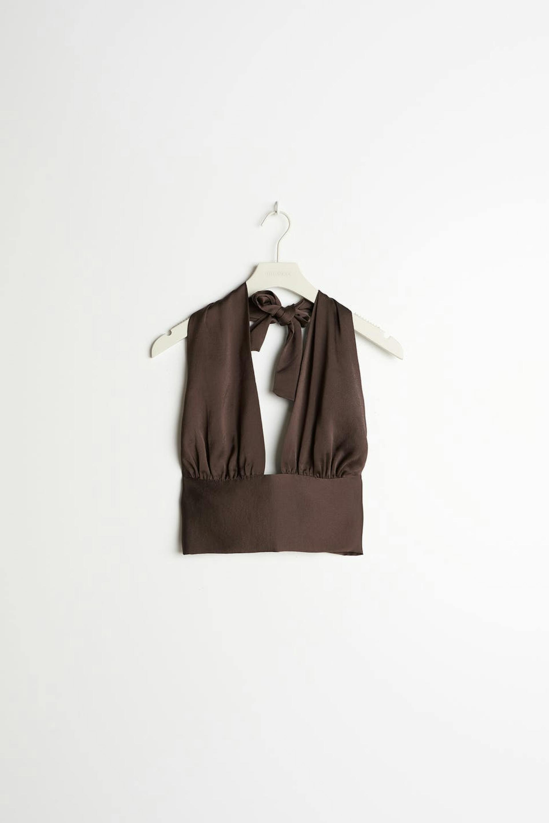 Cropped top with halterneck design. The top is perfect for the party, brown and sleeveless. It has an open back, a satin-like material and self-tie in the back. Can be tied in different ways.