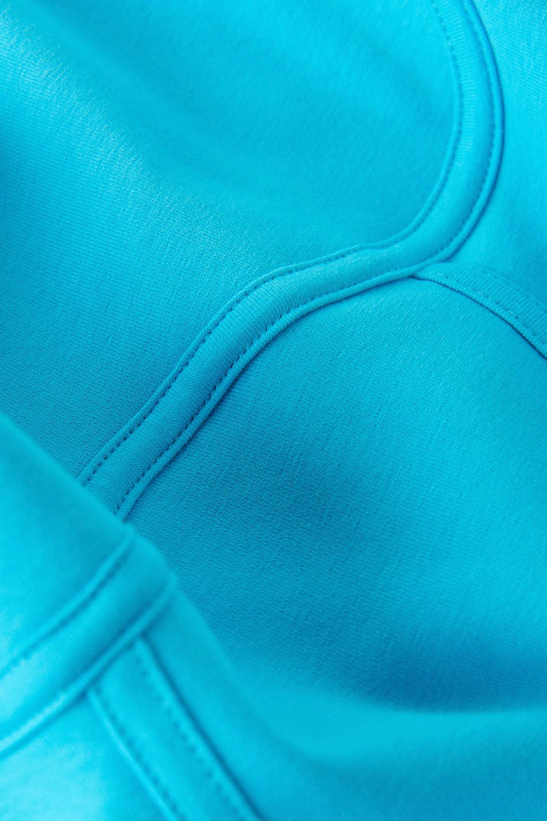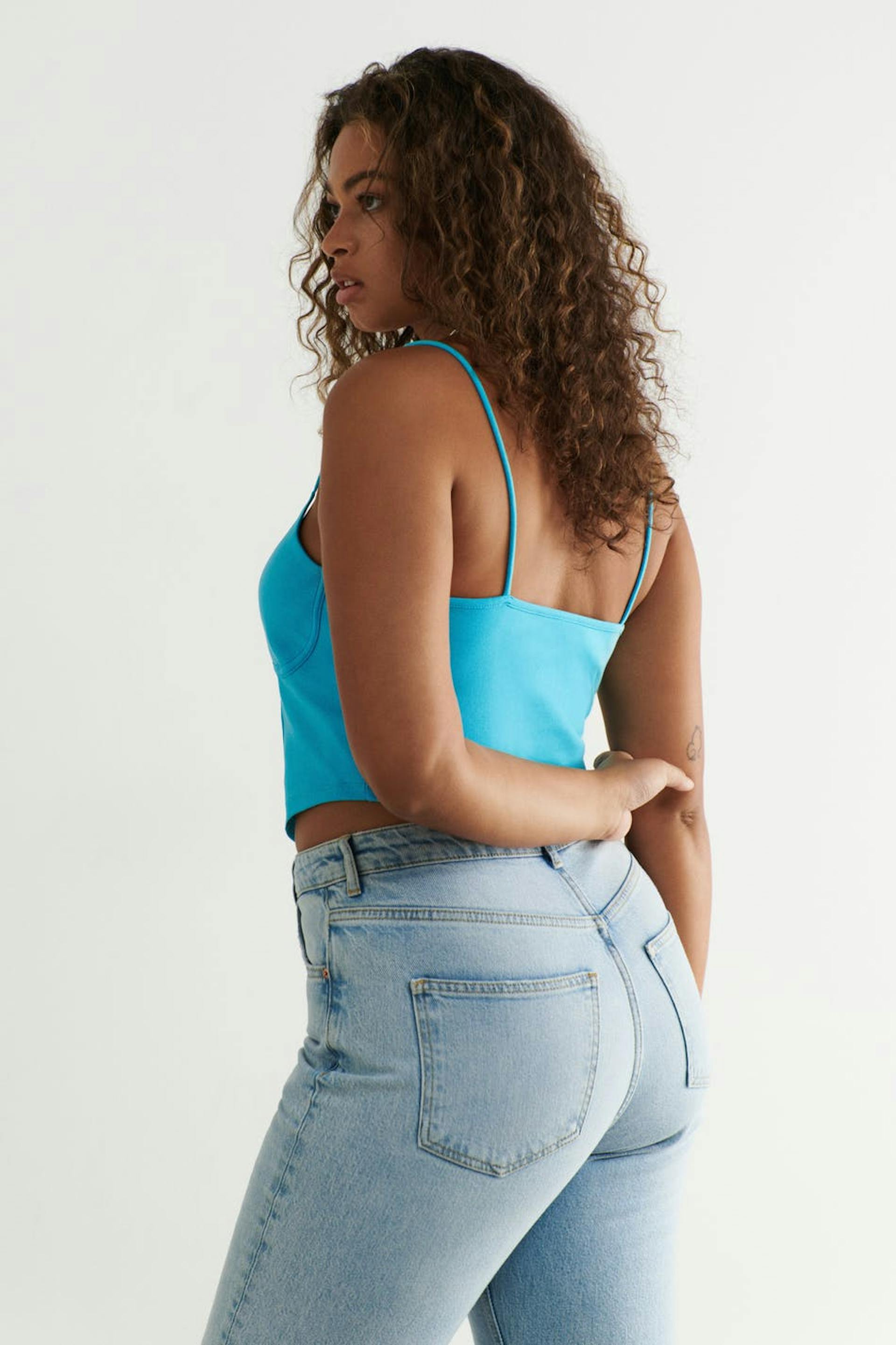 Cropped tank in jersey with fitted fit. The tank is blue and has thin shoulder straps. It has v-neck cut and a decorative seam detail below the bust.