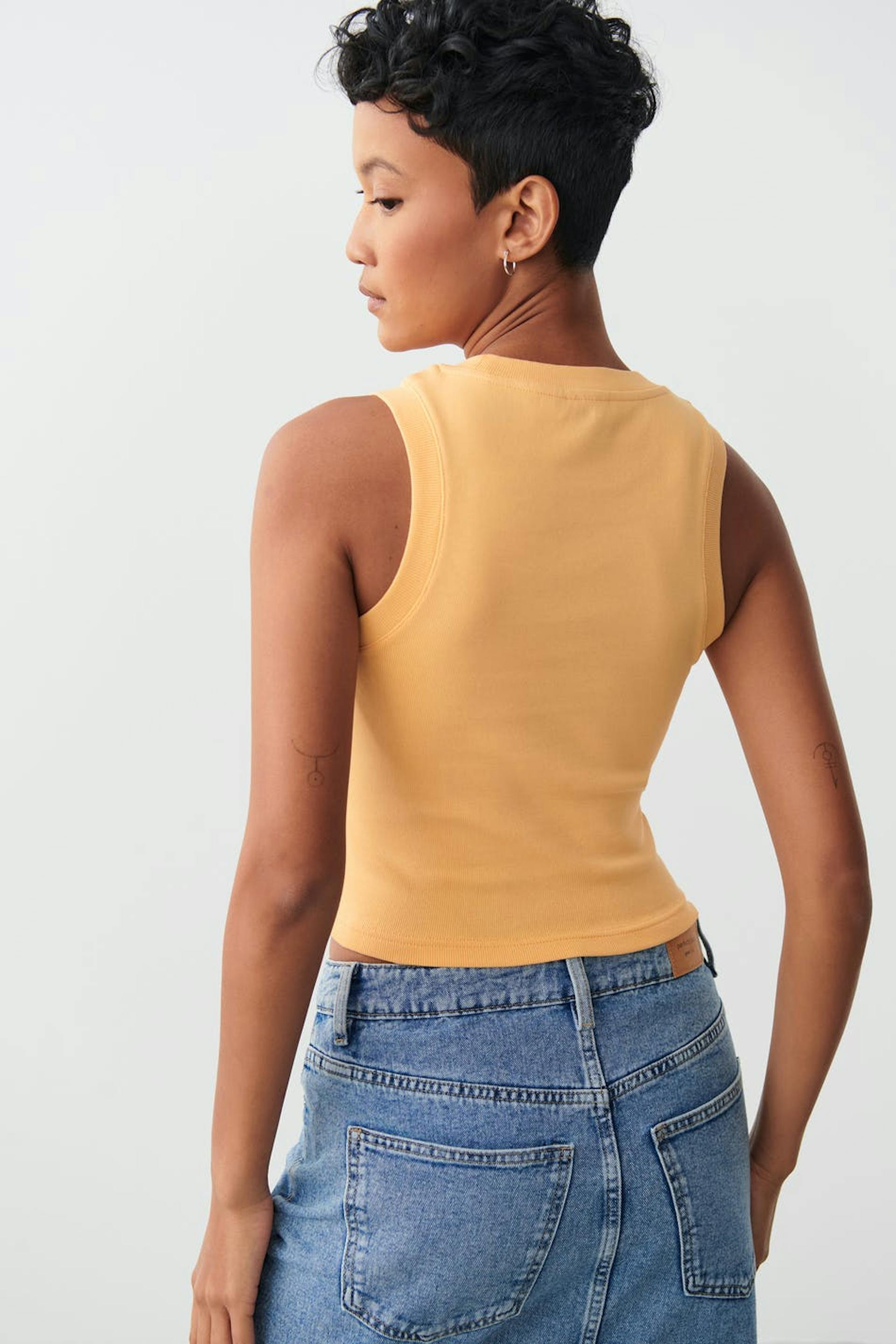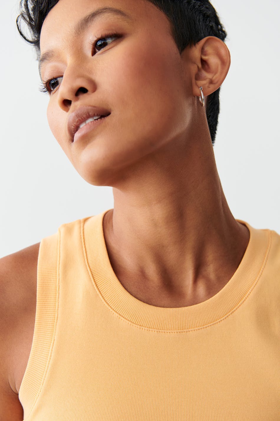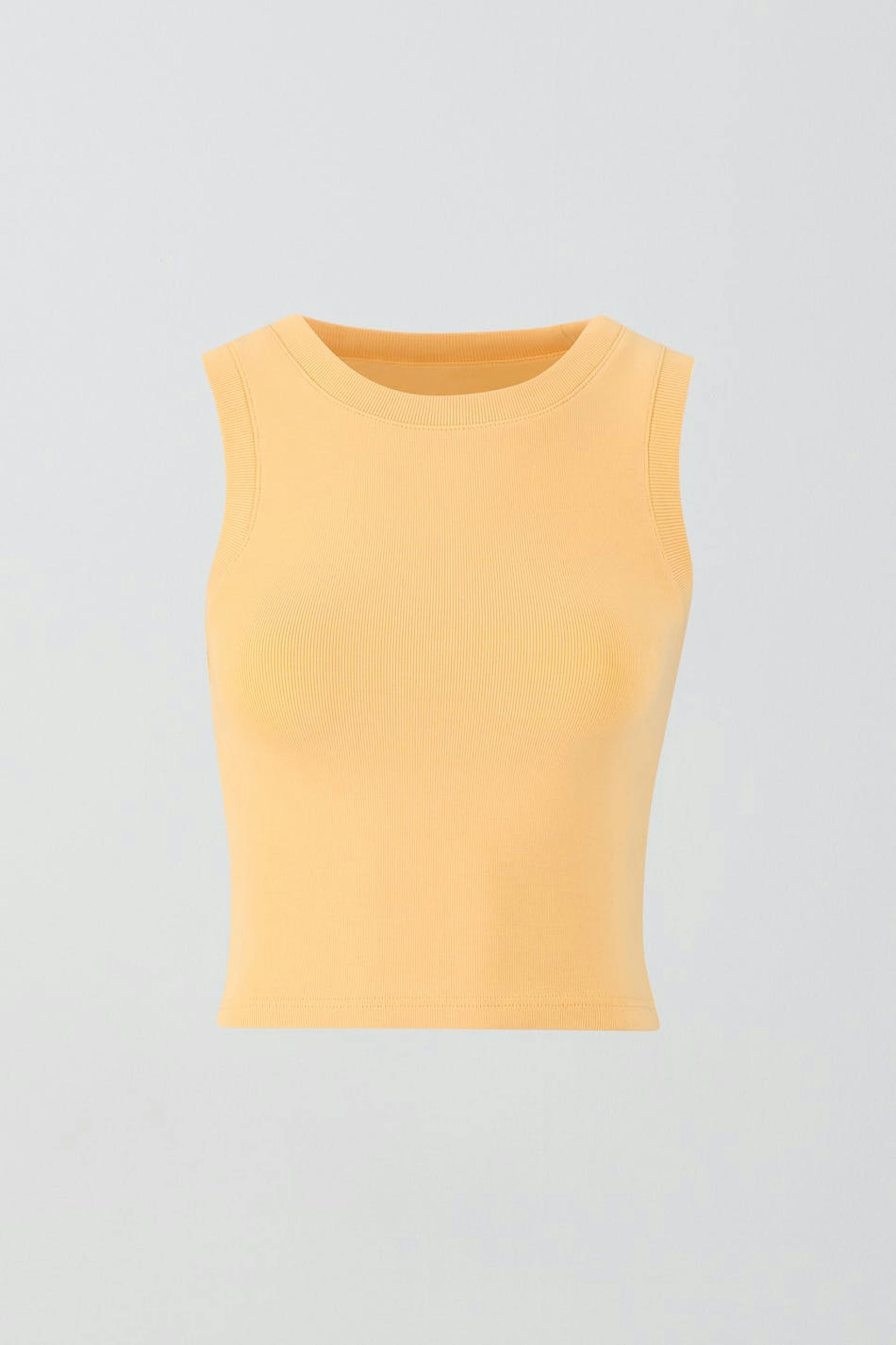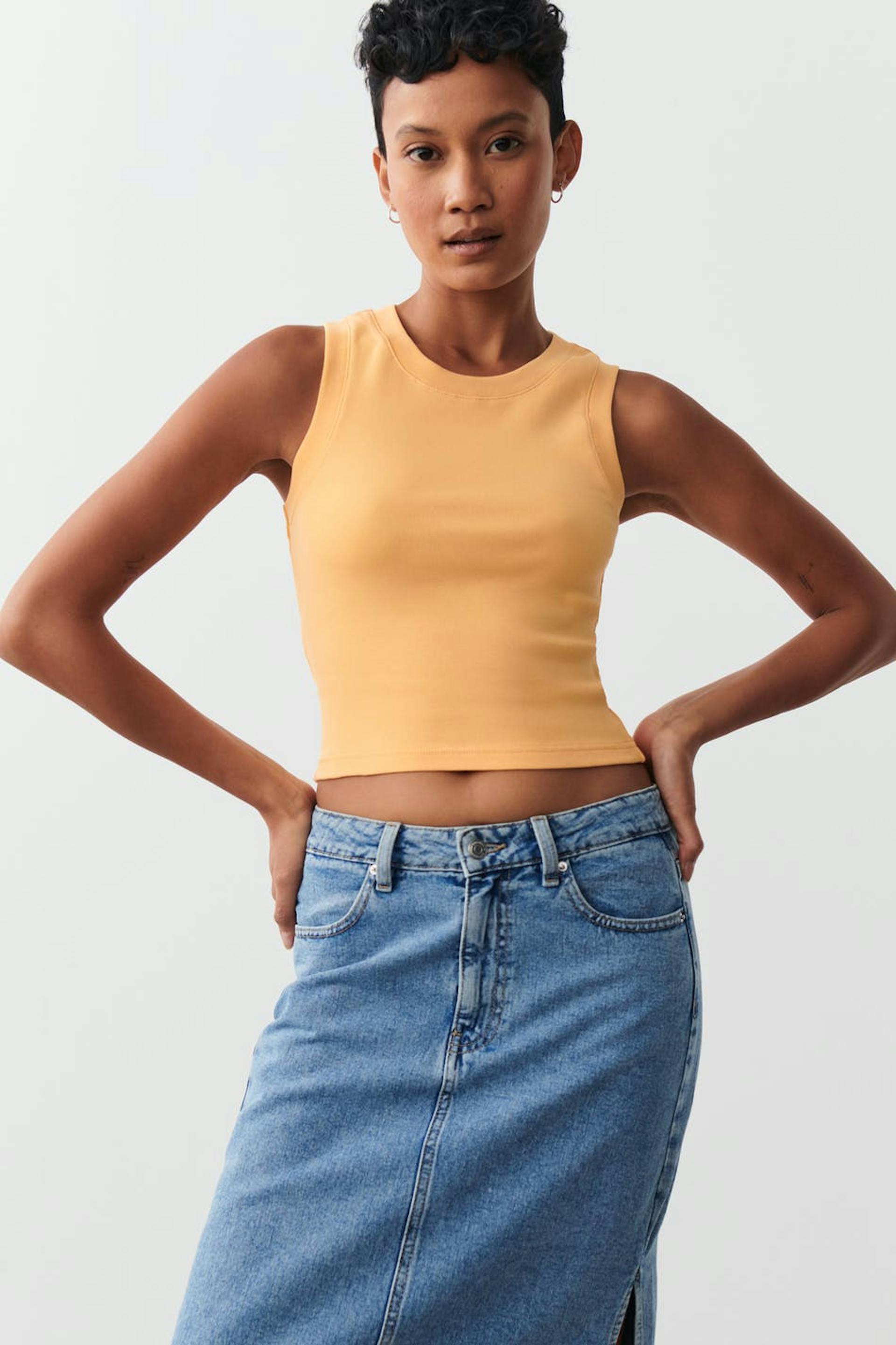 Cropped tank in jersey with figure-hugging fit. The tank is orange and has round neckline.