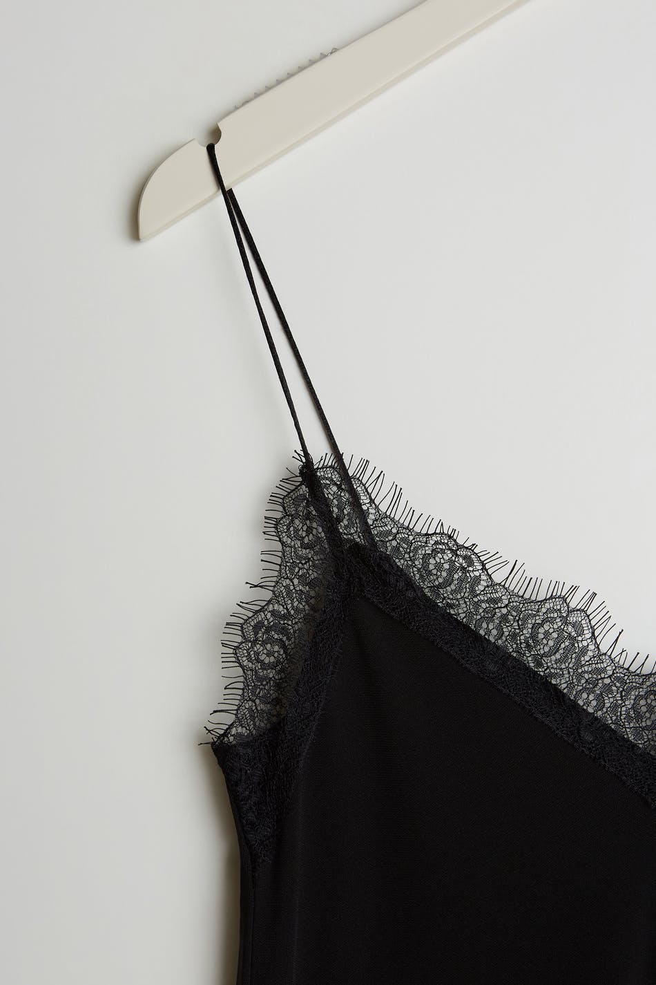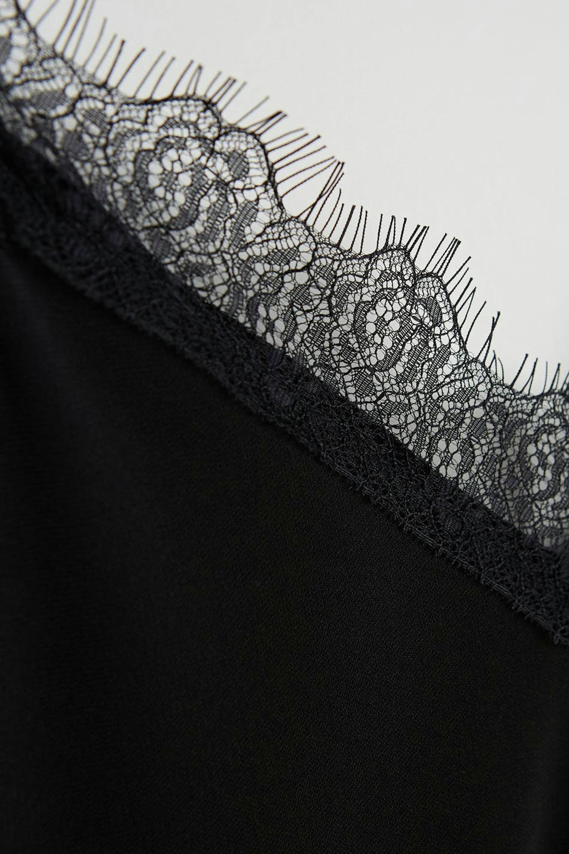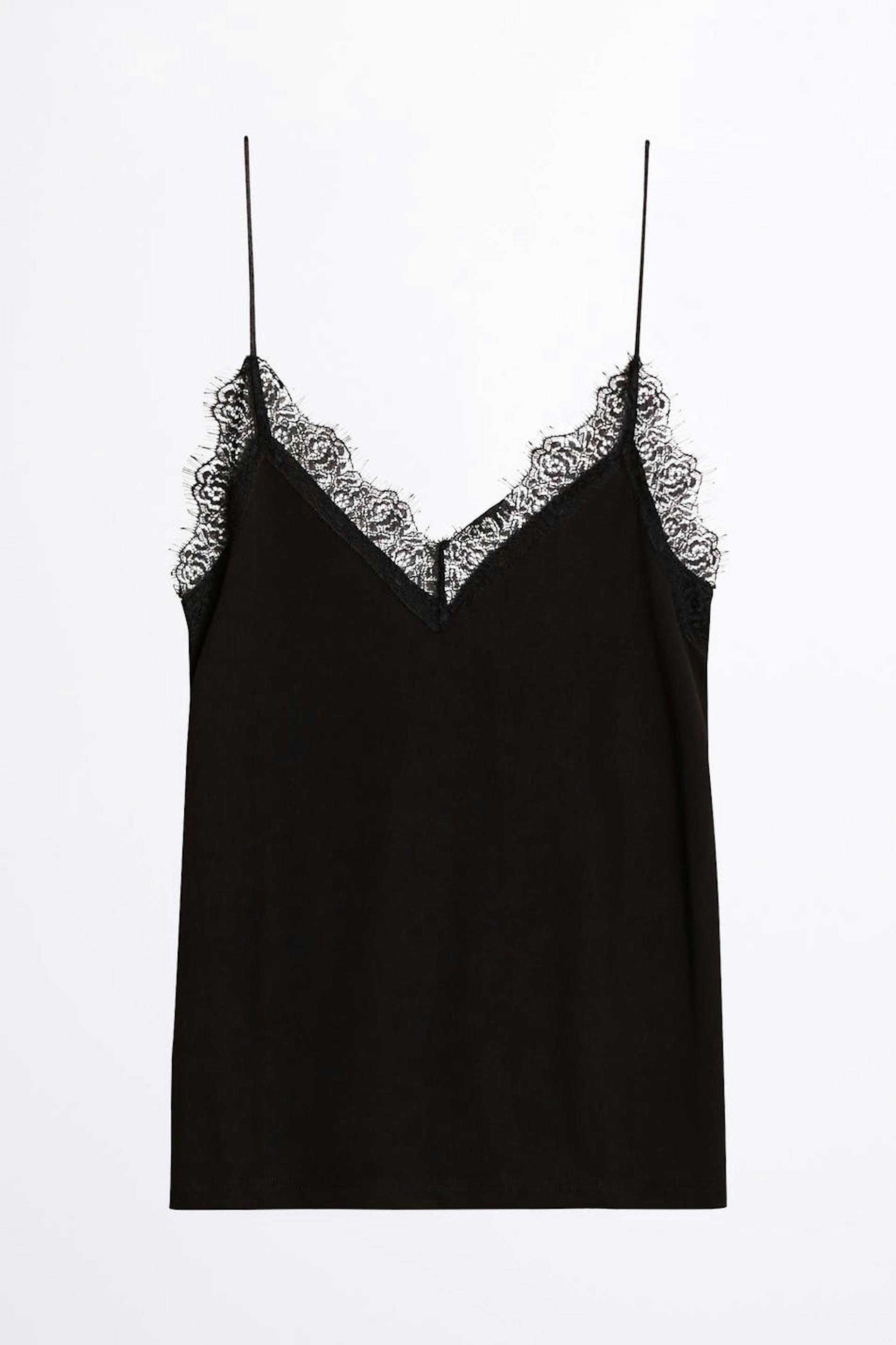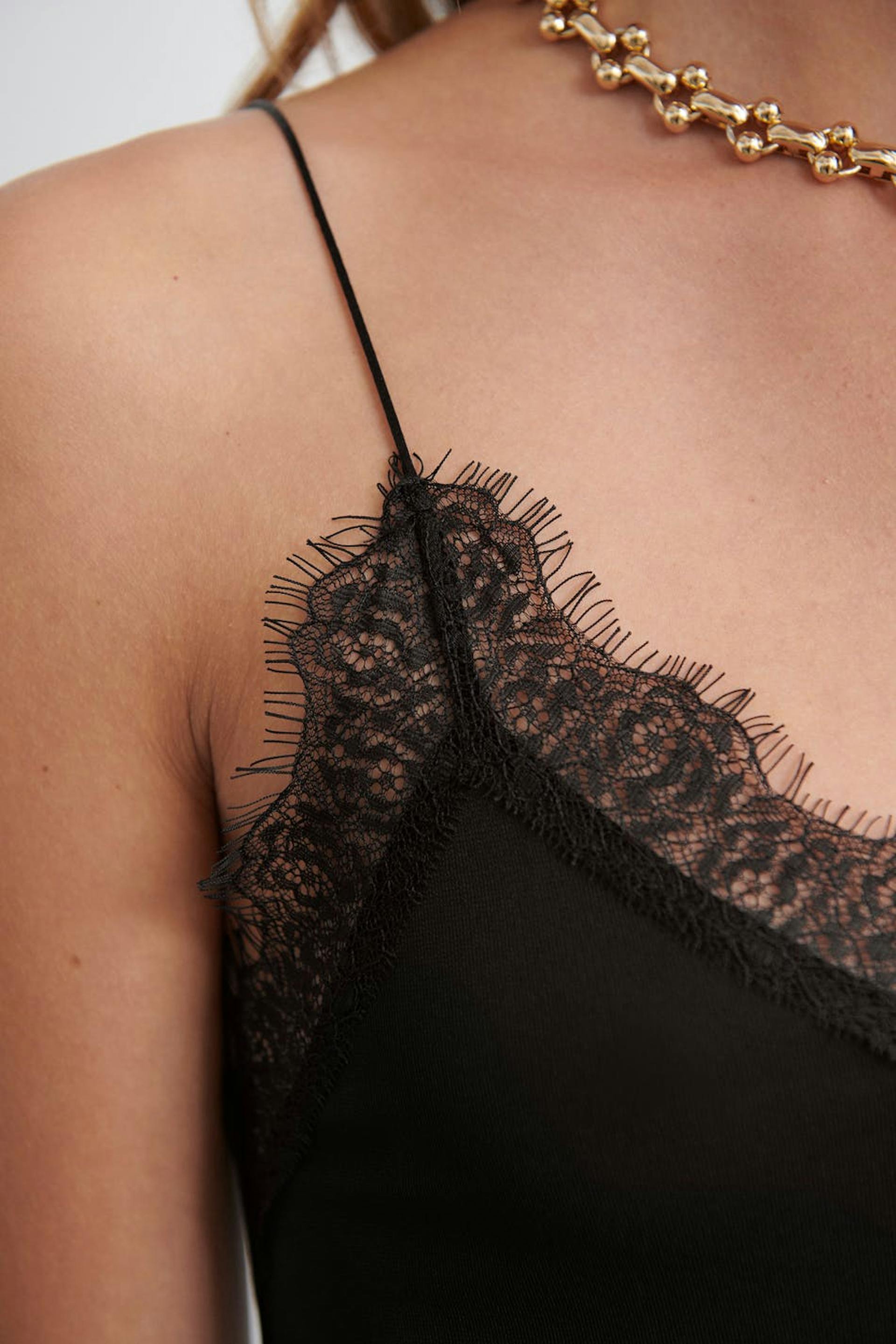 Top with lace fabric at the neckline. The top is perfect for the party and black and has thin shoulder straps.