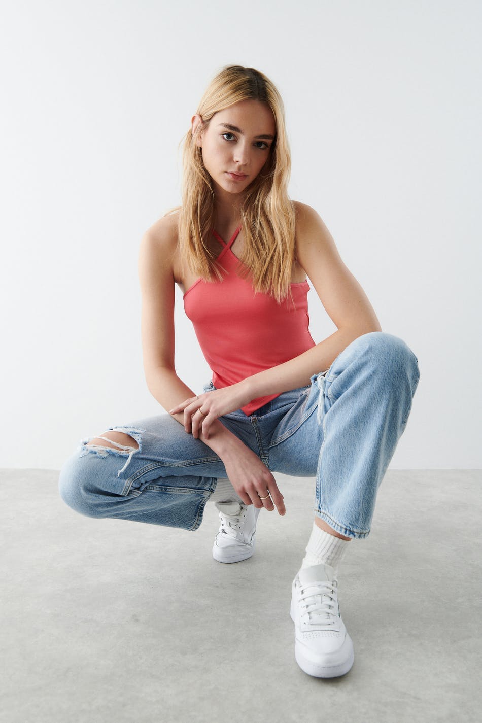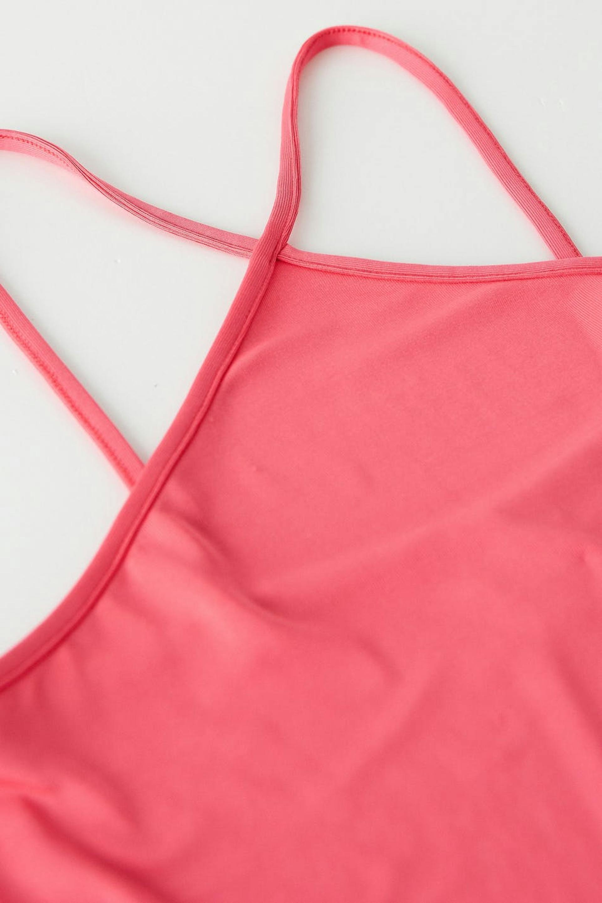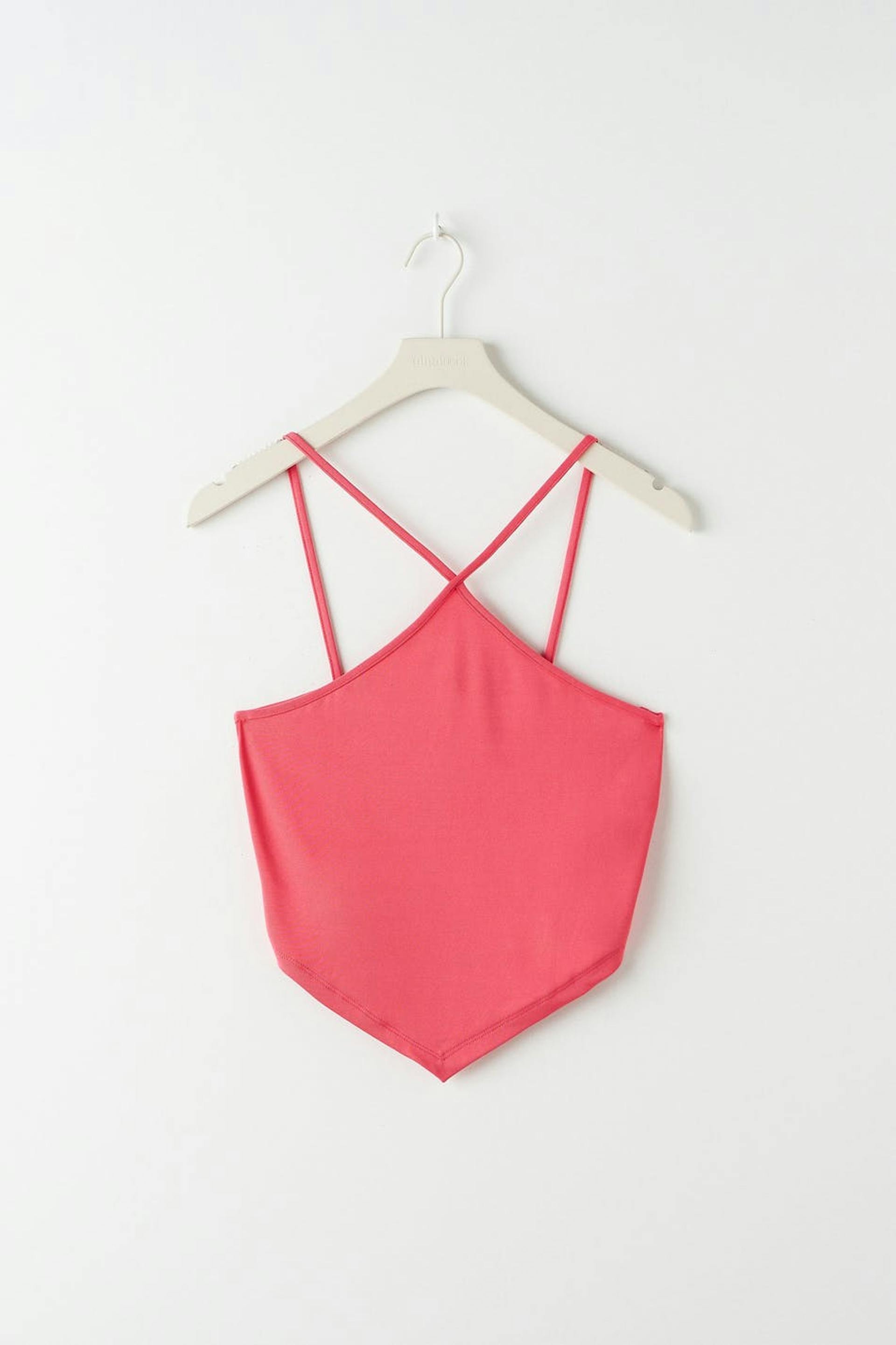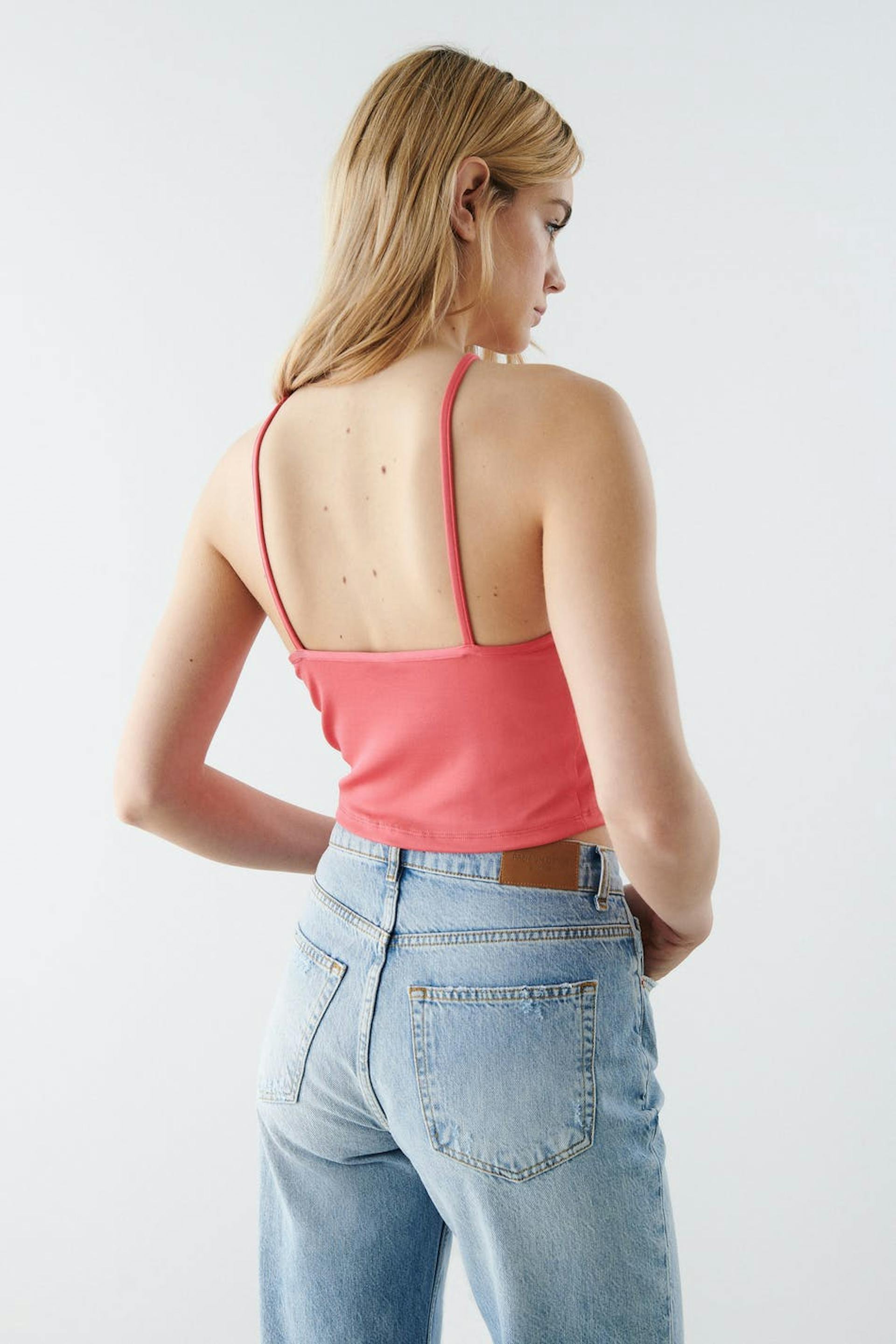 Tank in jersey with a skinny fit. The tank is pink and has thin shoulder straps. It has a triangular halter at the front.