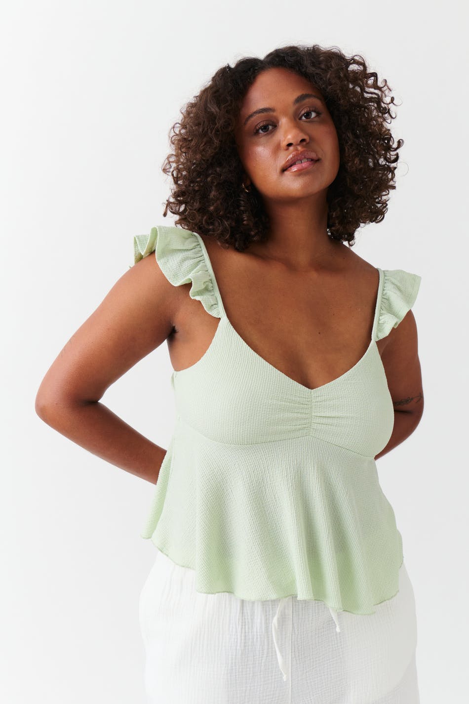 Singlet with ruched bust. The singlet is green and has shoulder straps with frills. It has decorative seam below the bust and structured material.