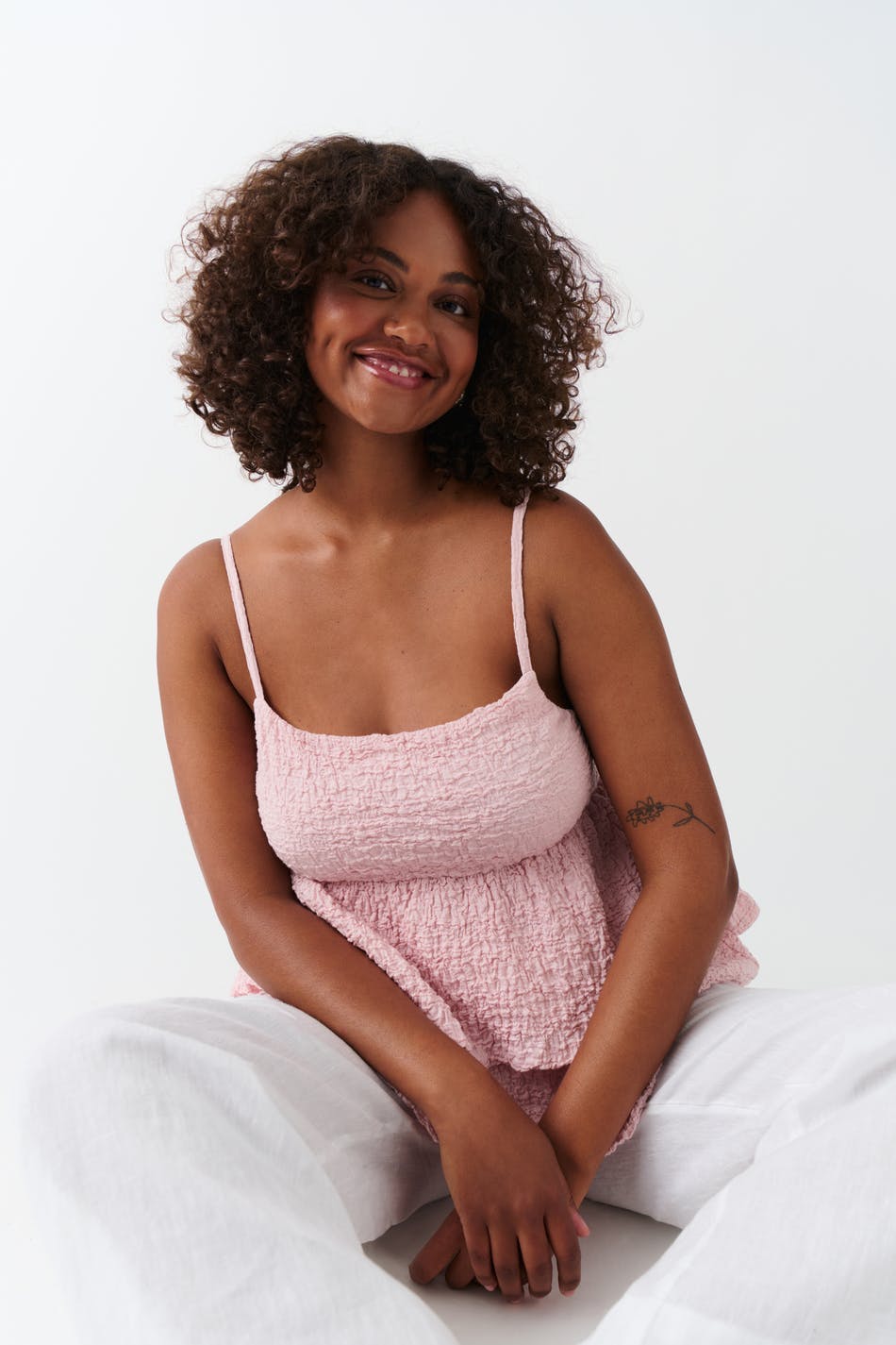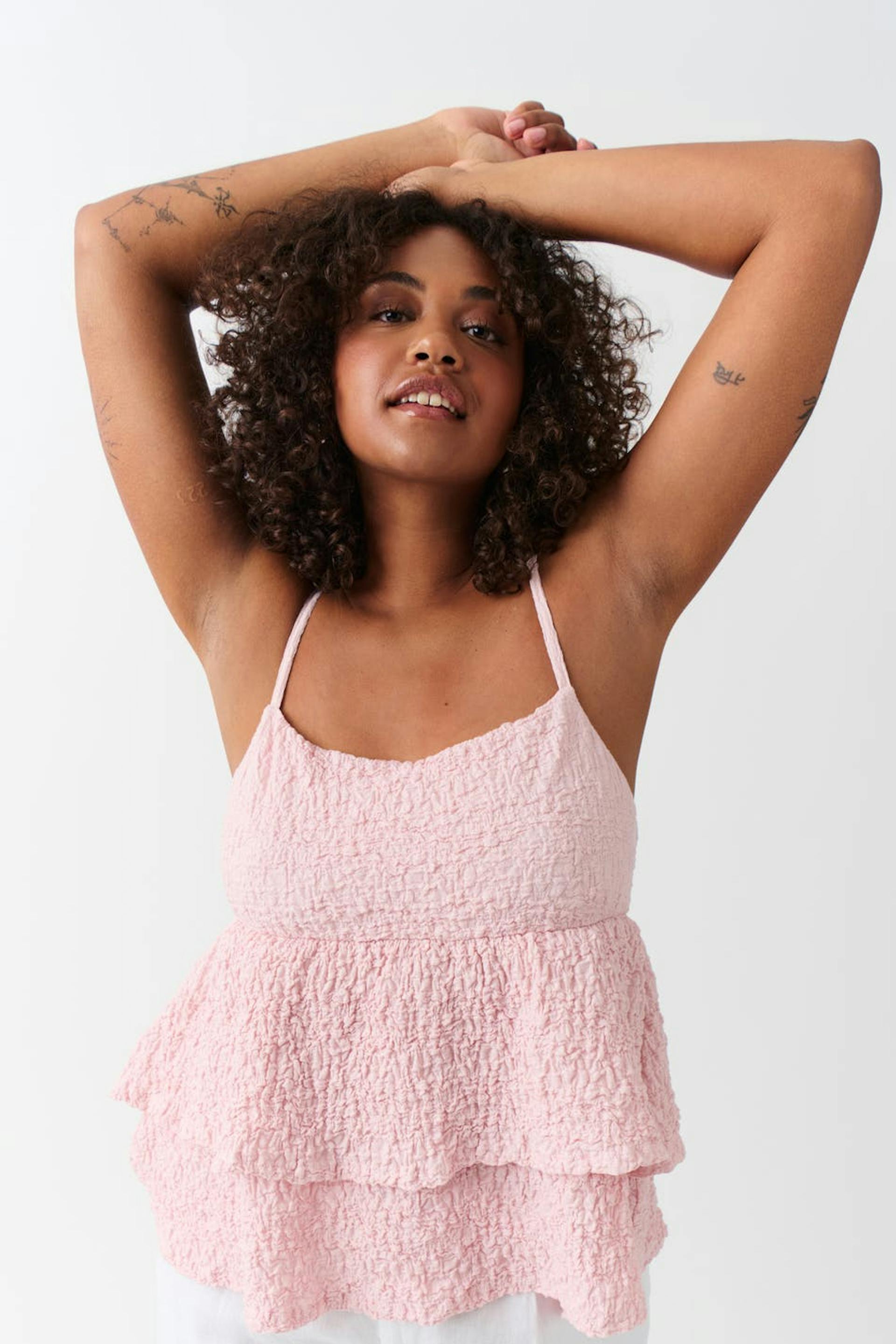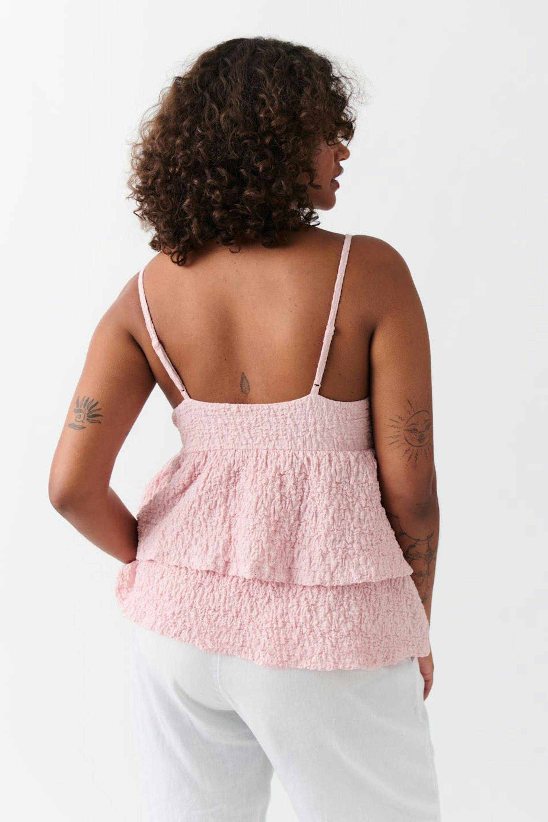 Singlet with frills. The singlet is pink and has structured material. It has regular fit, narrow, adjustable shoulder straps and lined cup.