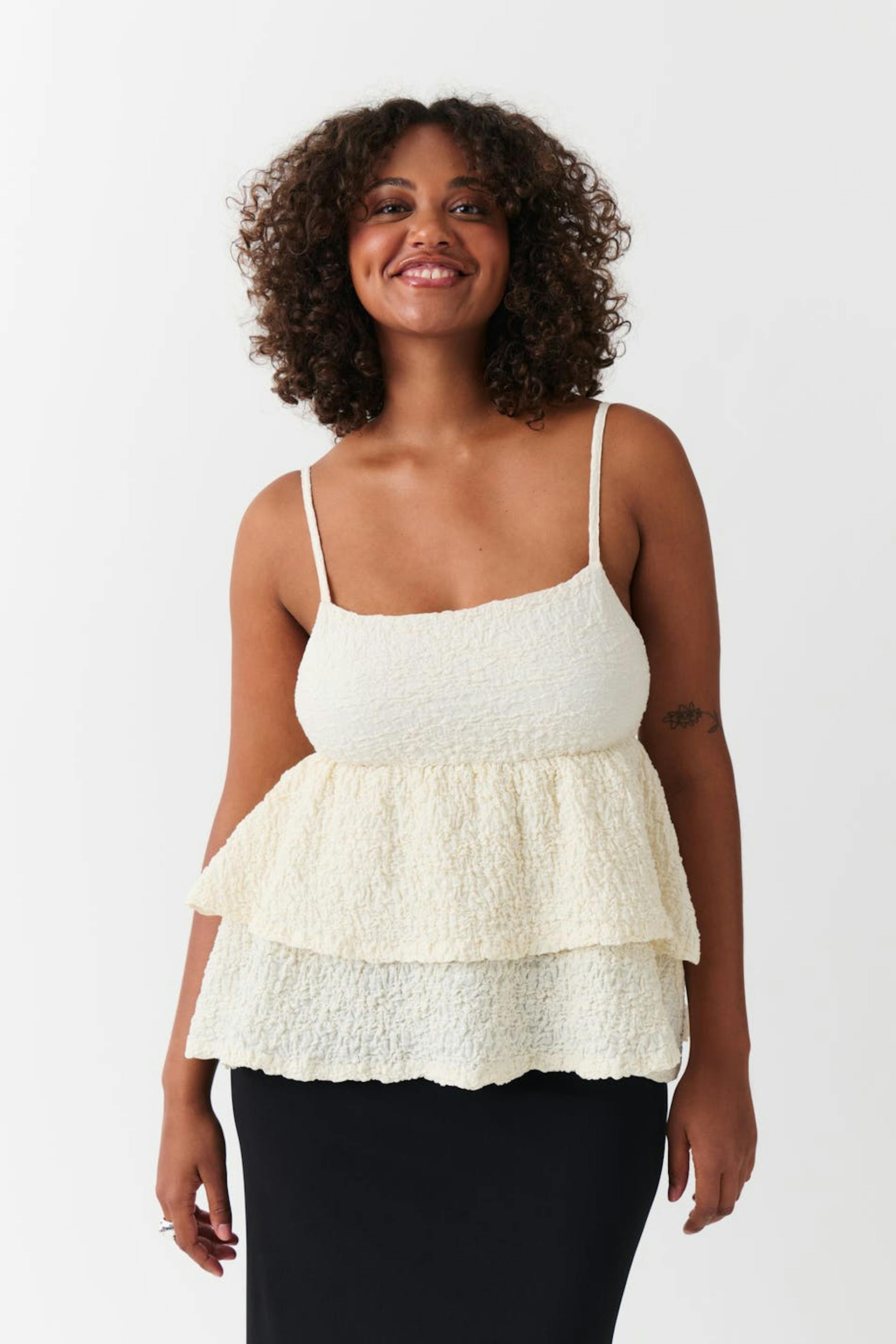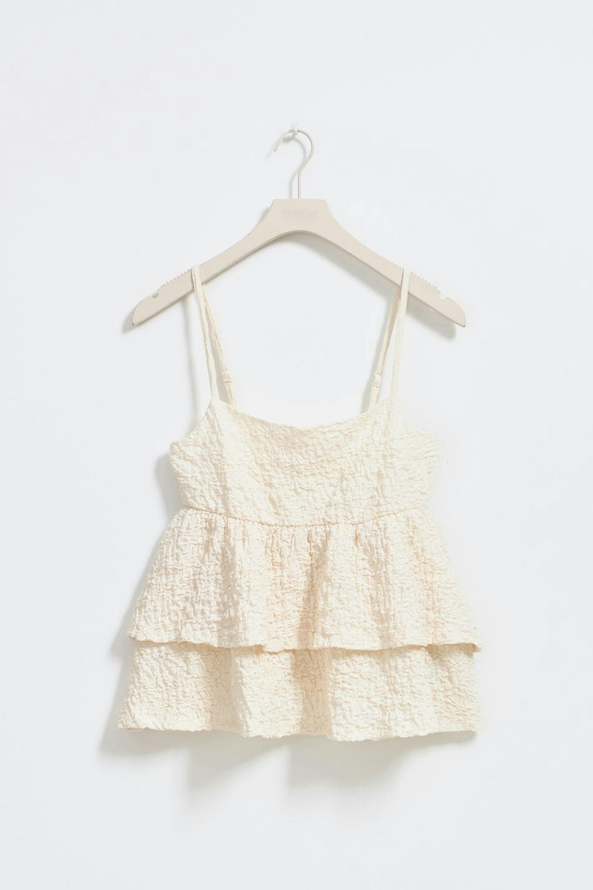 Singlet with frills. The singlet is beige and has structured material. It has regular fit, narrow, adjustable shoulder straps and lined cup.