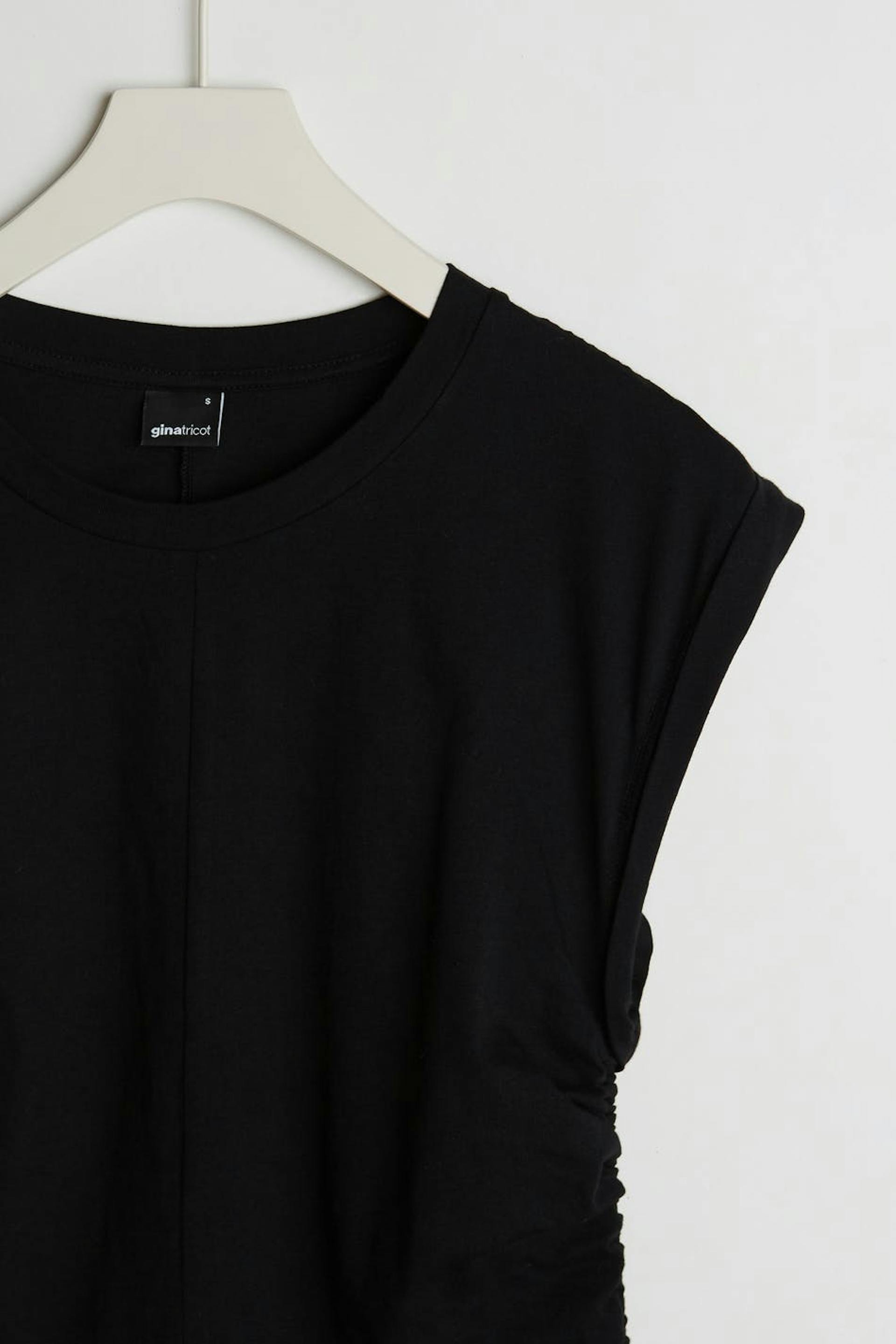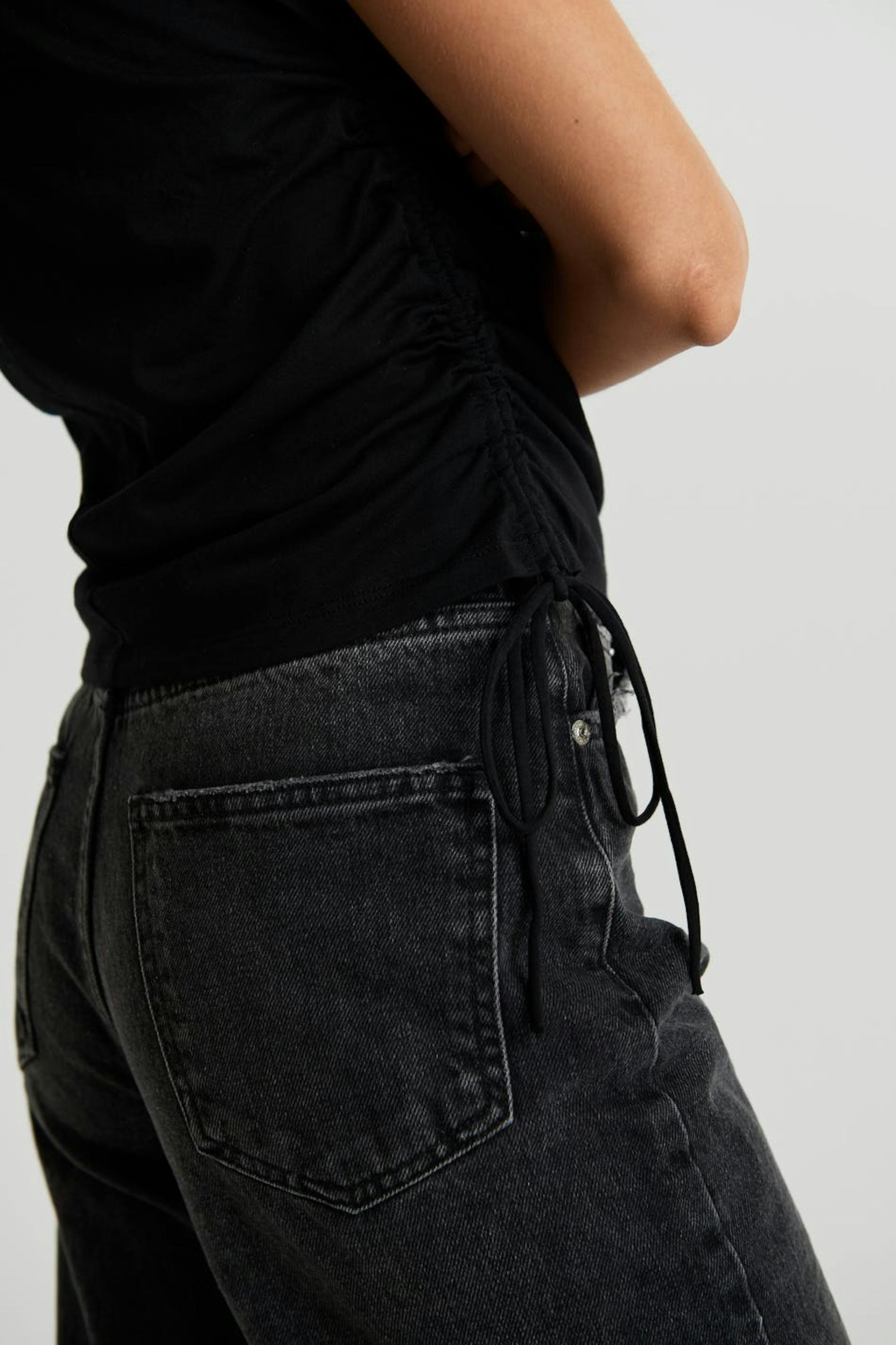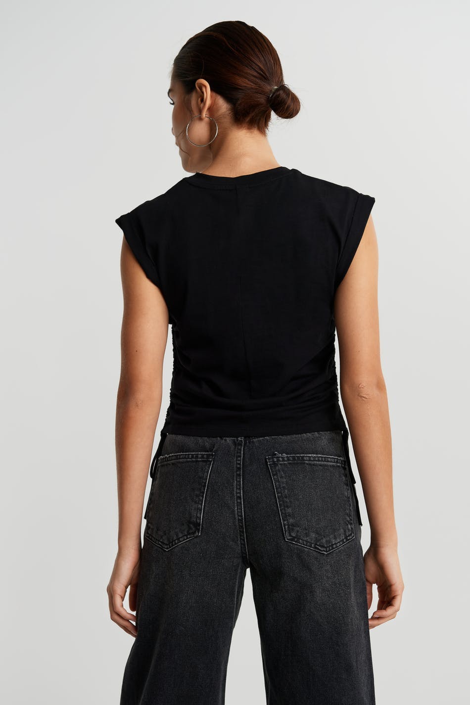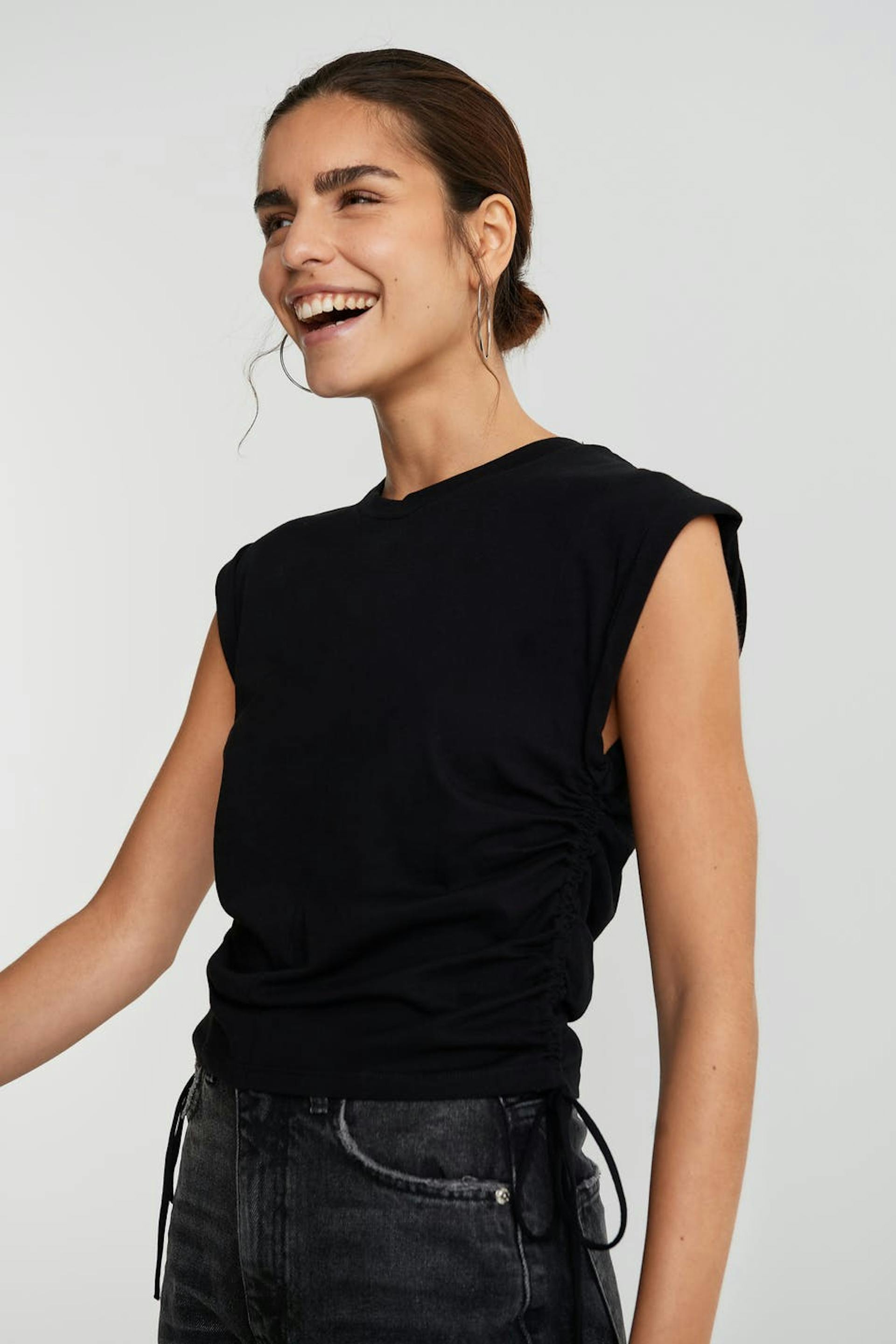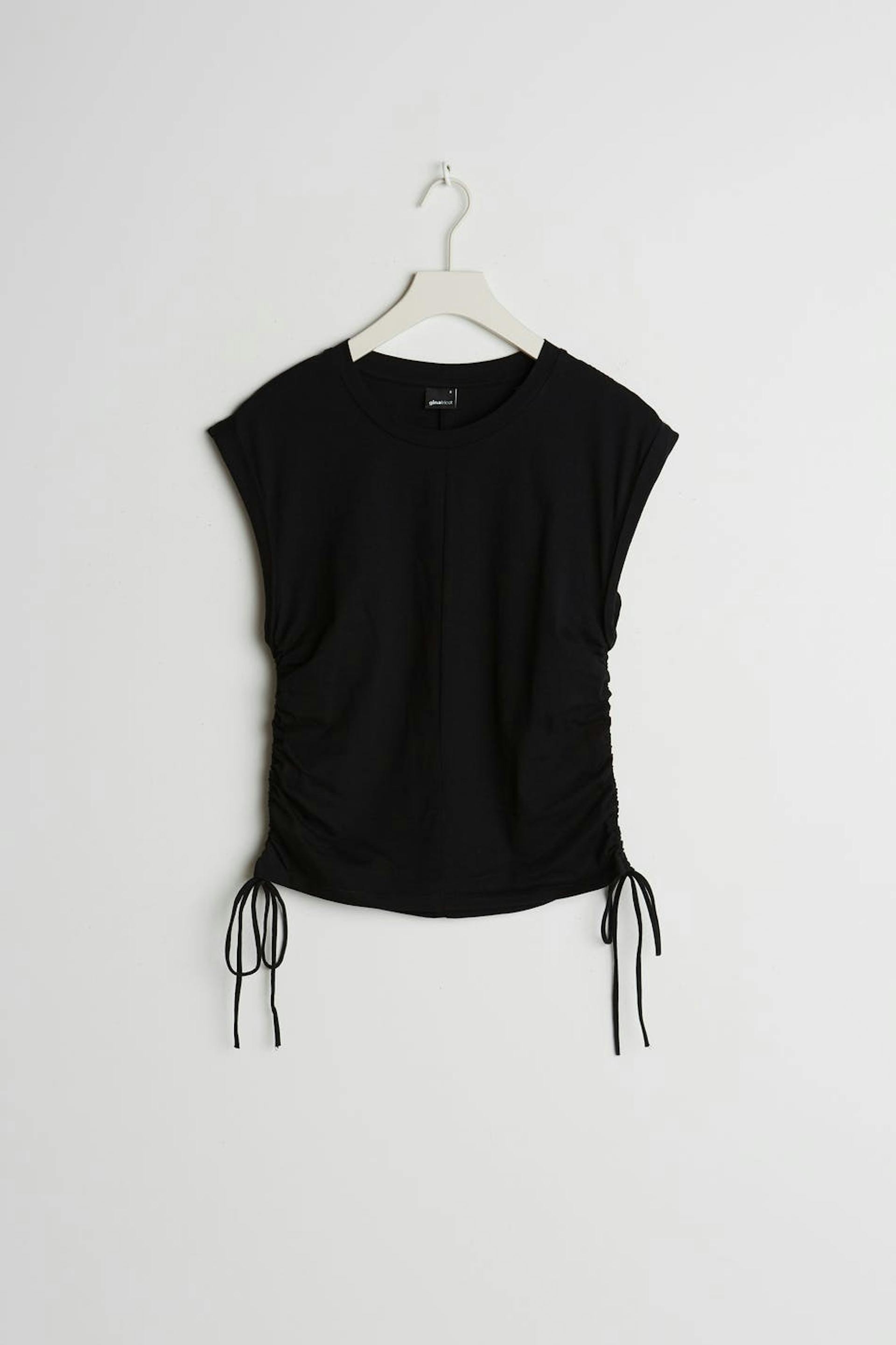 Shorter tank with a regular fit. The tank is perfect for the party and black and has detail with drawstring on the sides. It has folded edges.