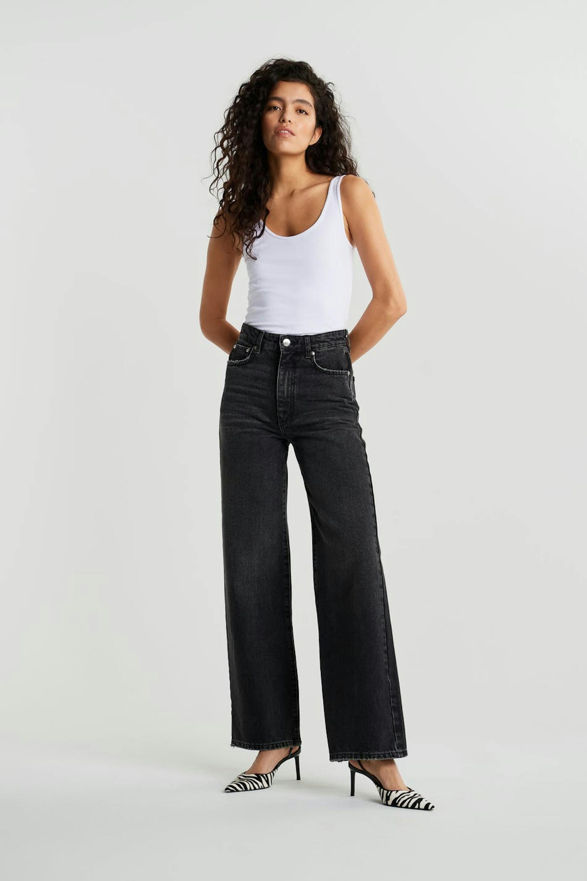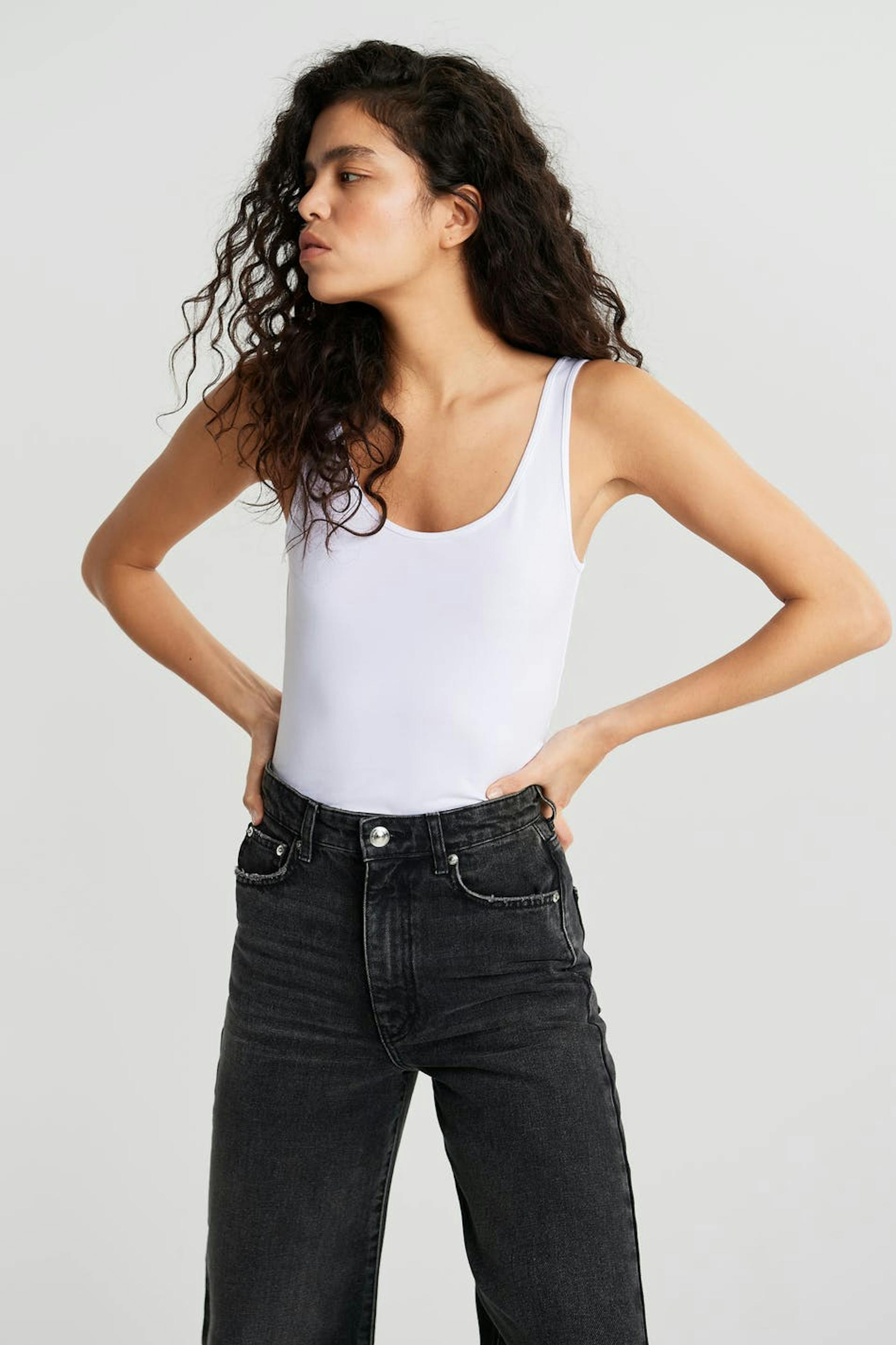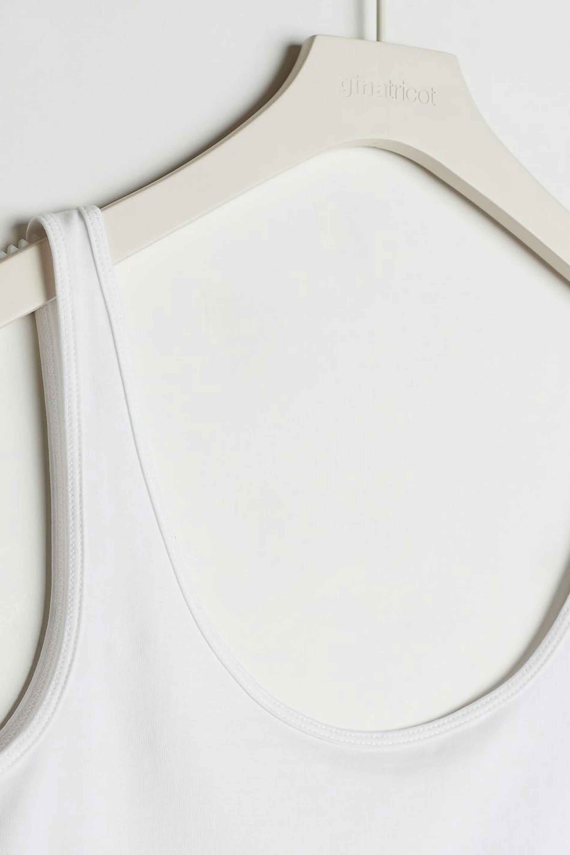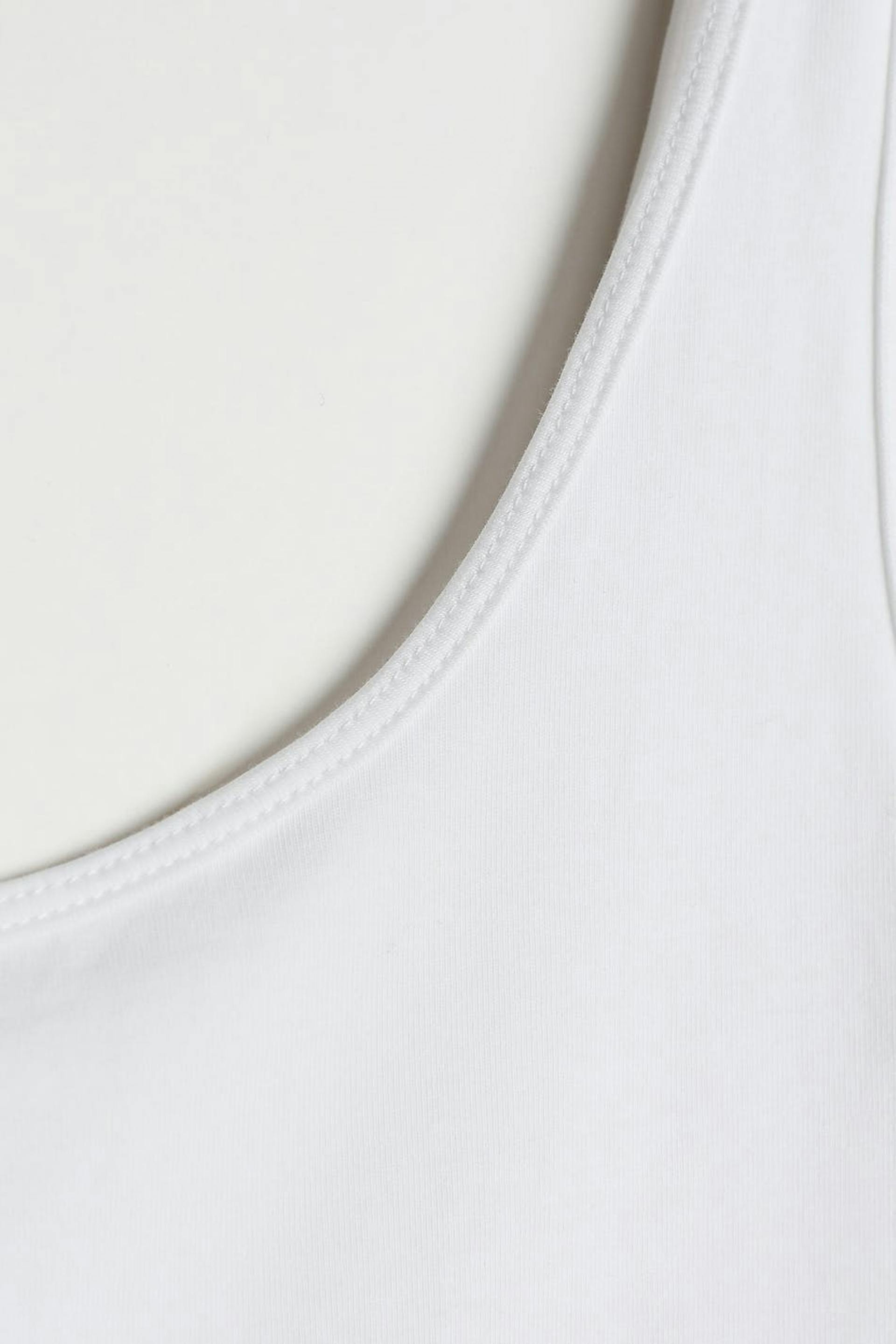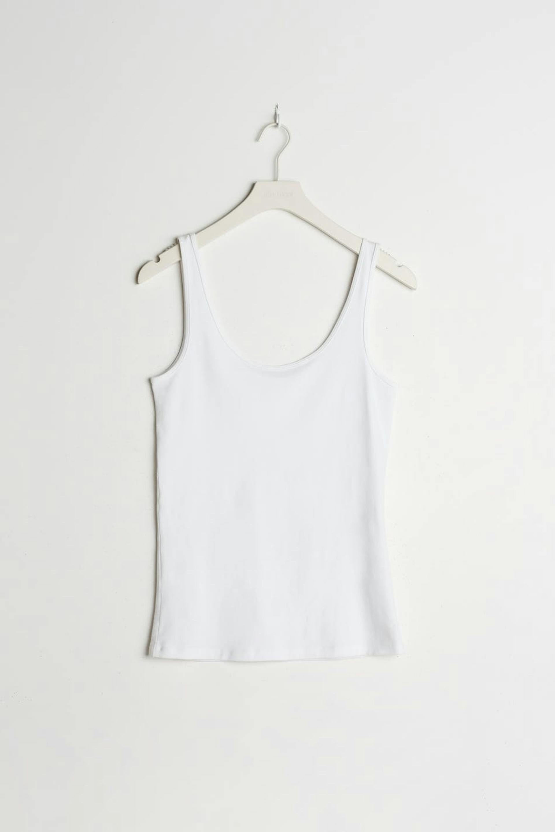 Sleeveless top with a fitted fit. The top is white and has slim bands at the edges. It is made of jersey.